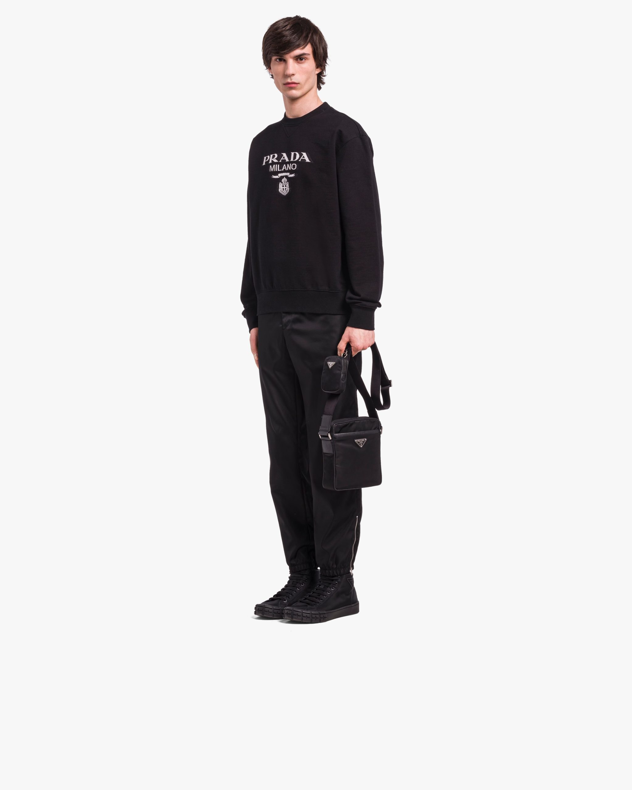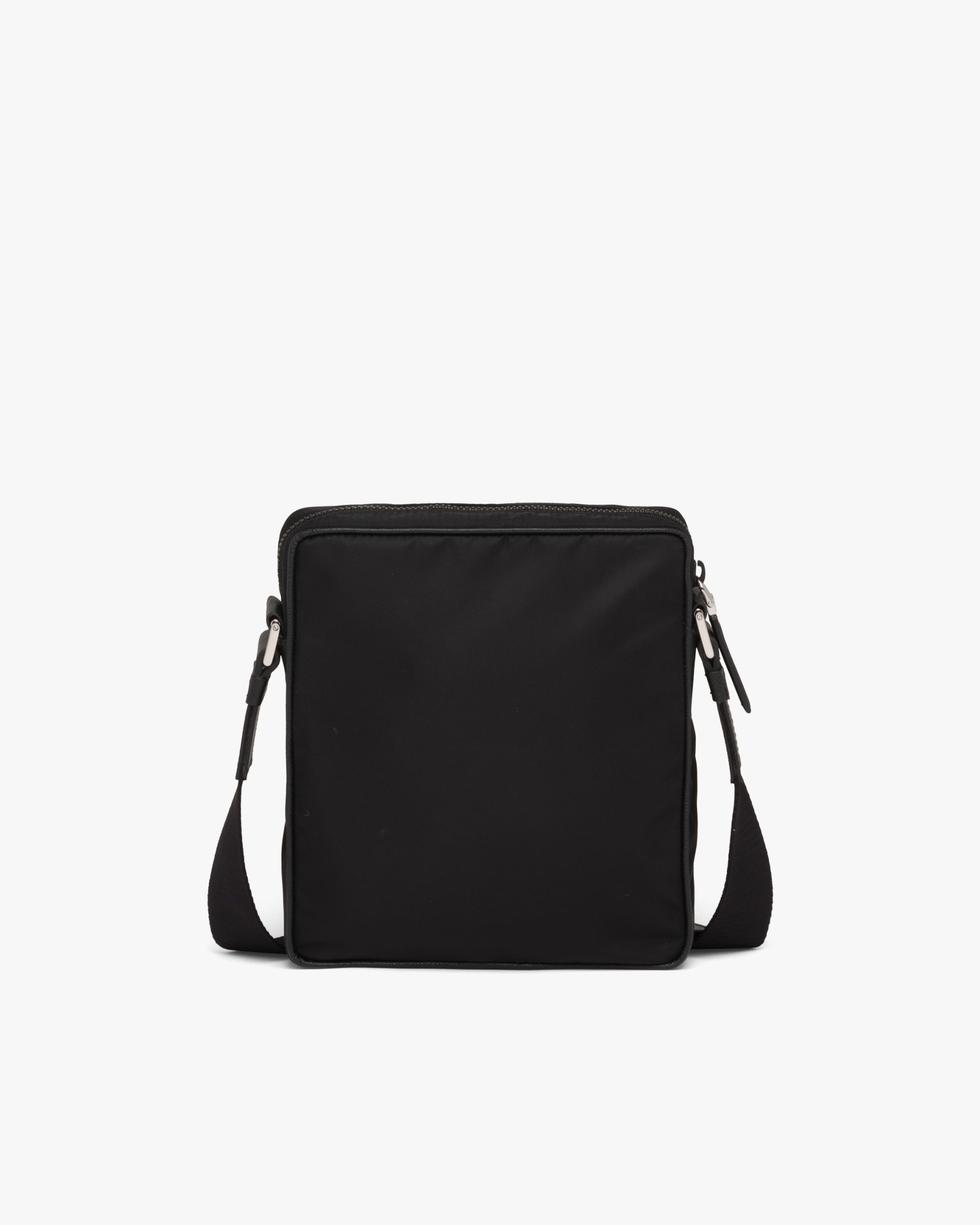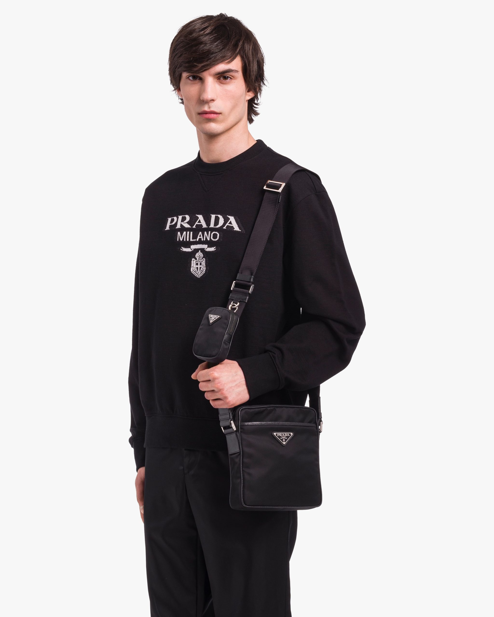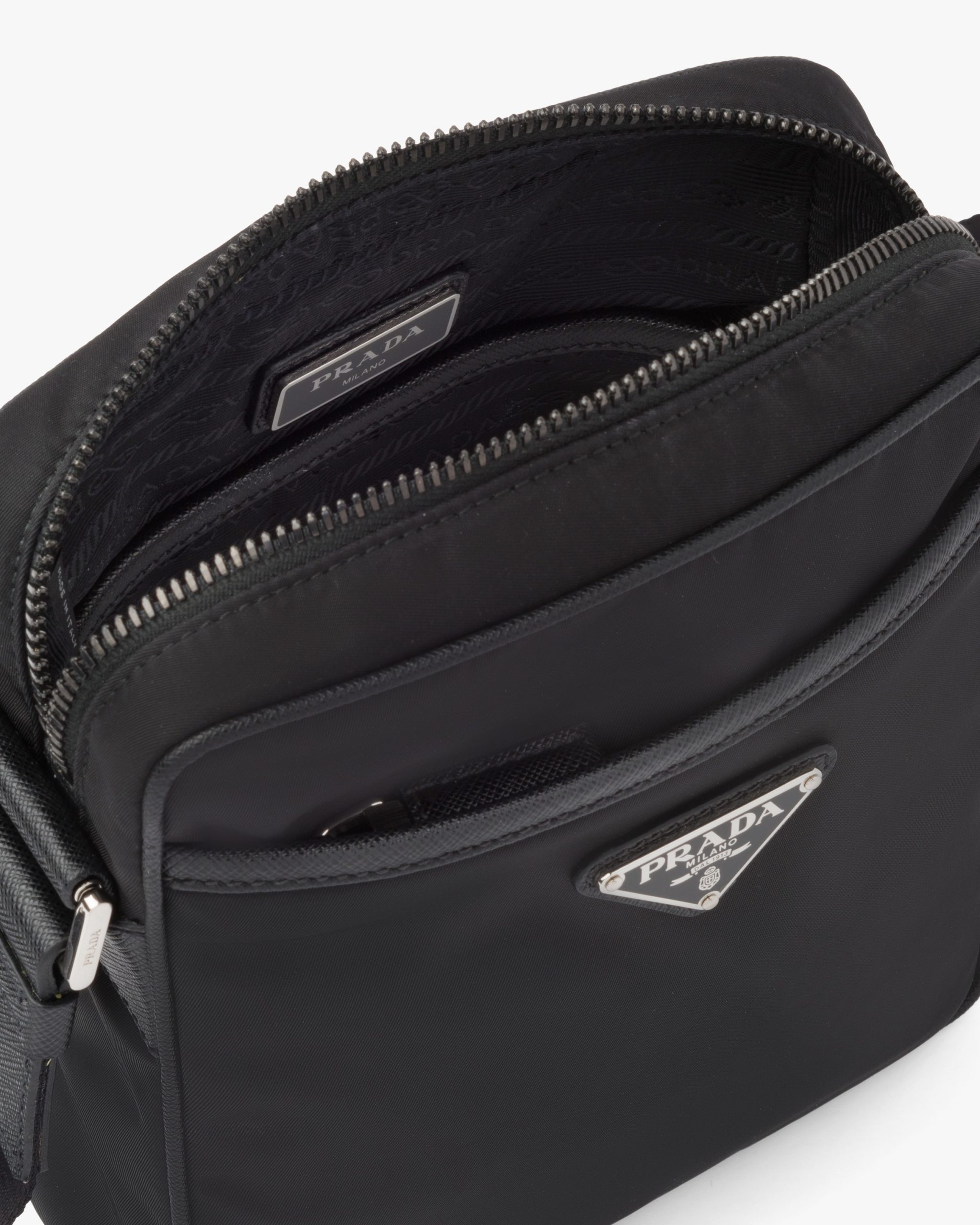 This shoulder bag with a functional, modern design made of Saffiano leather and Re-Nylon, a regenerated yarn produced from recycled plastic trash collectsed in the ocean, stands out for its removable pouch and versatile internal compartments. The accessory is decorated with the enameled metal triangle logo.