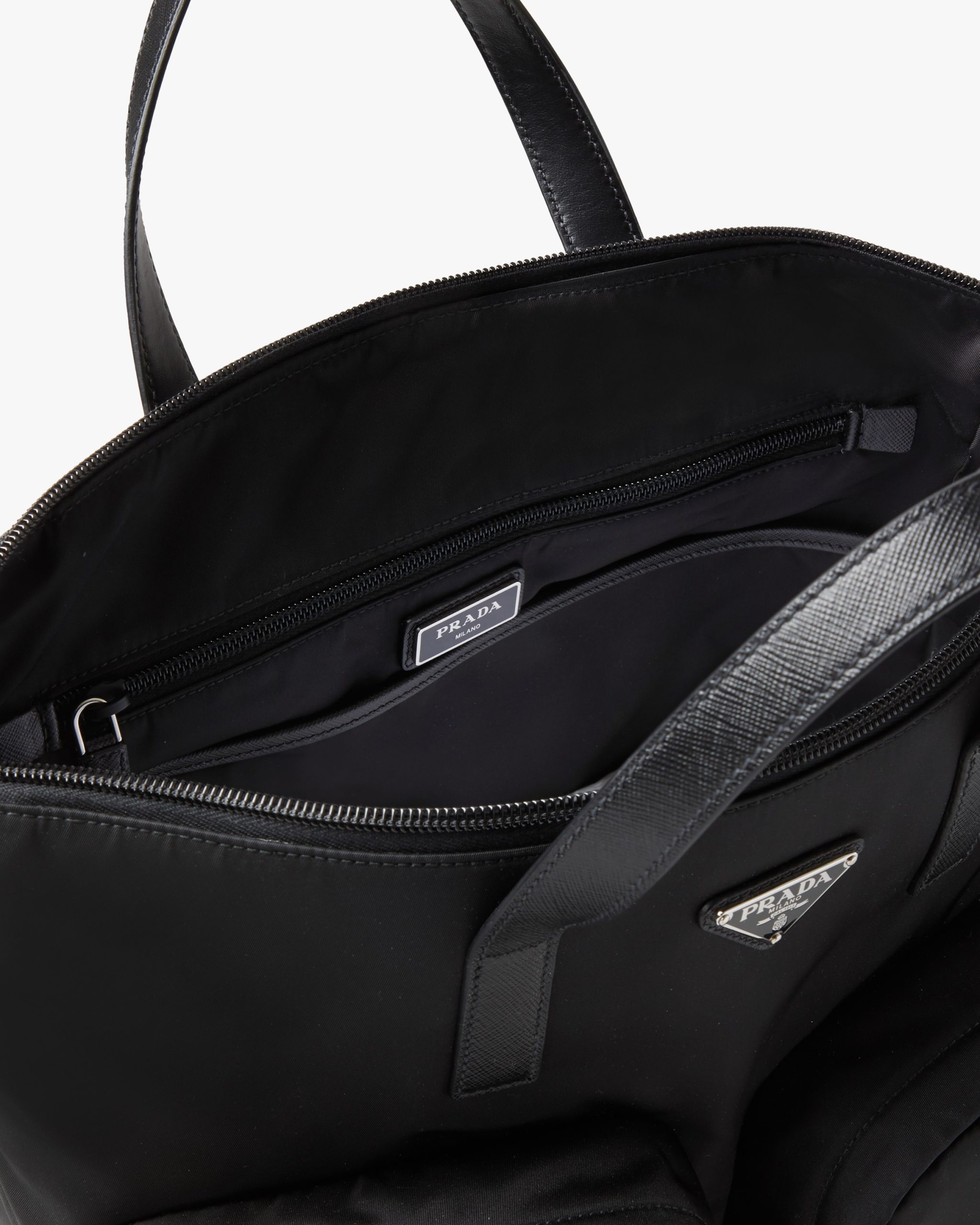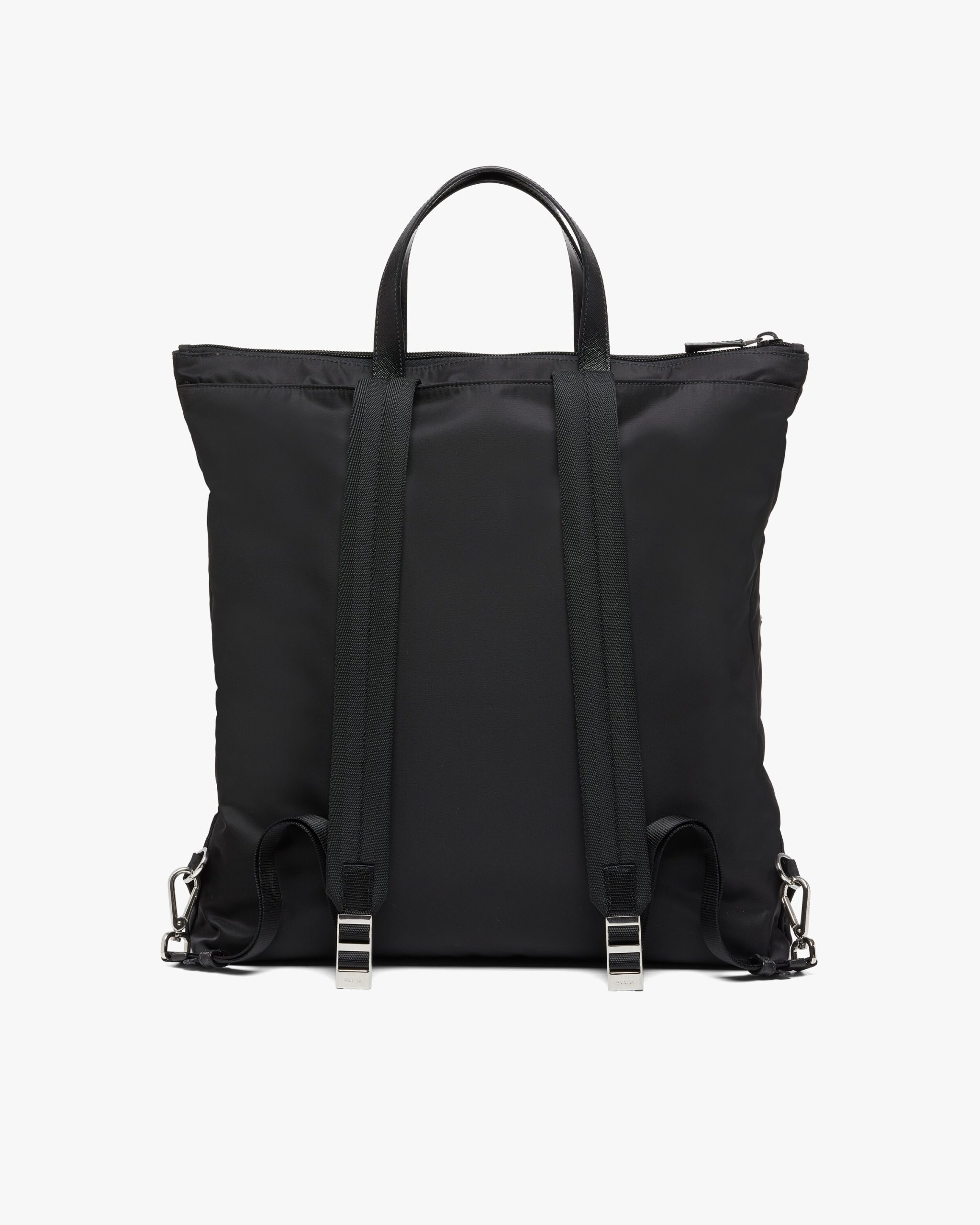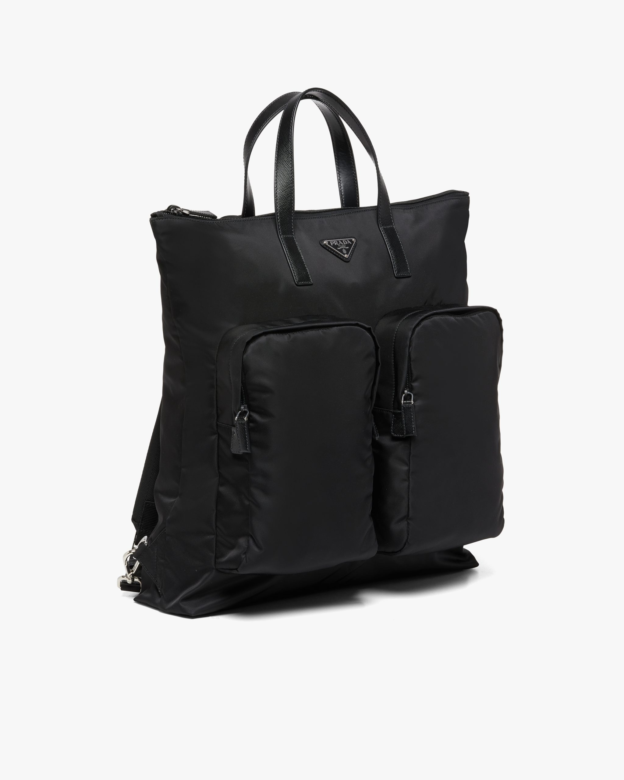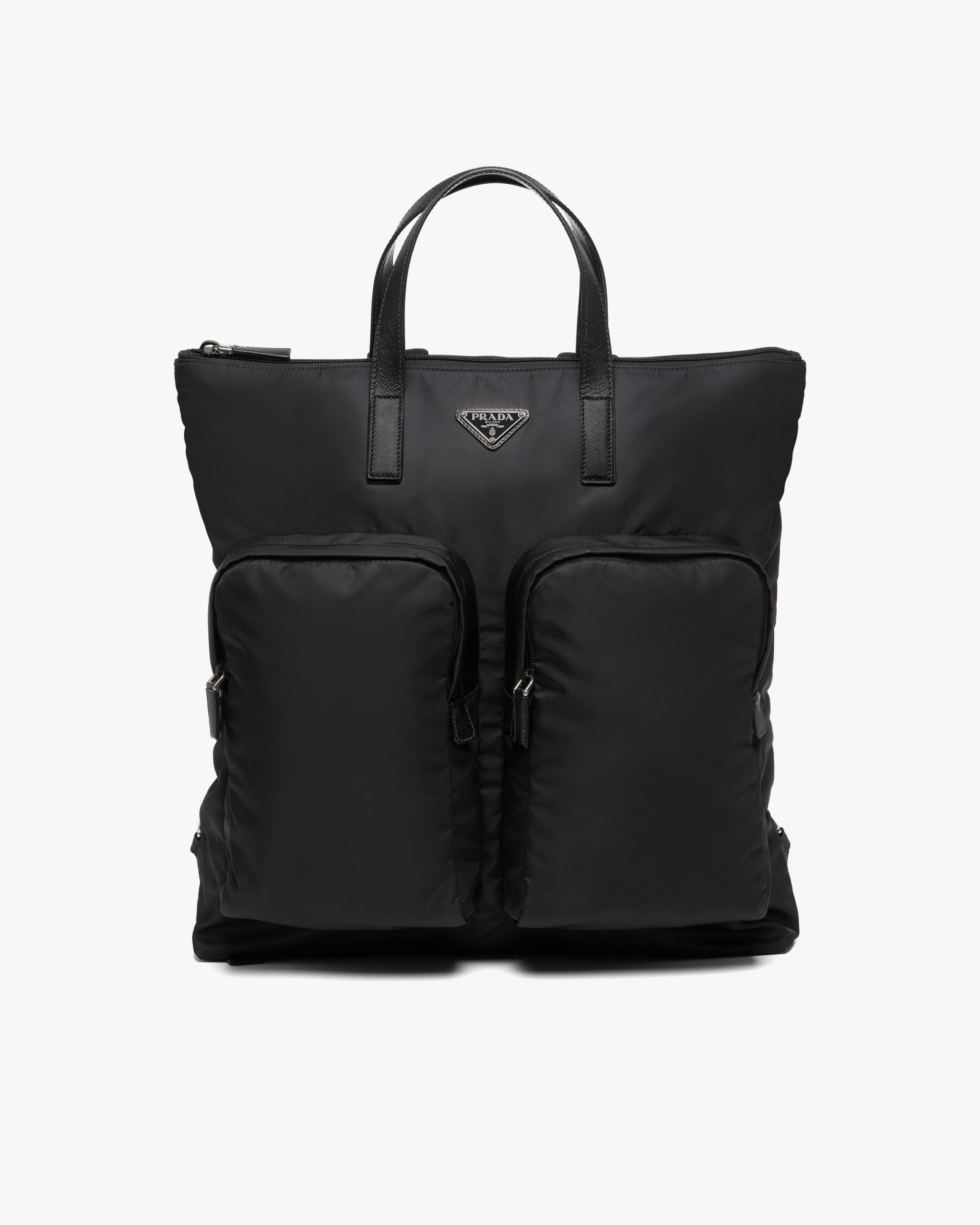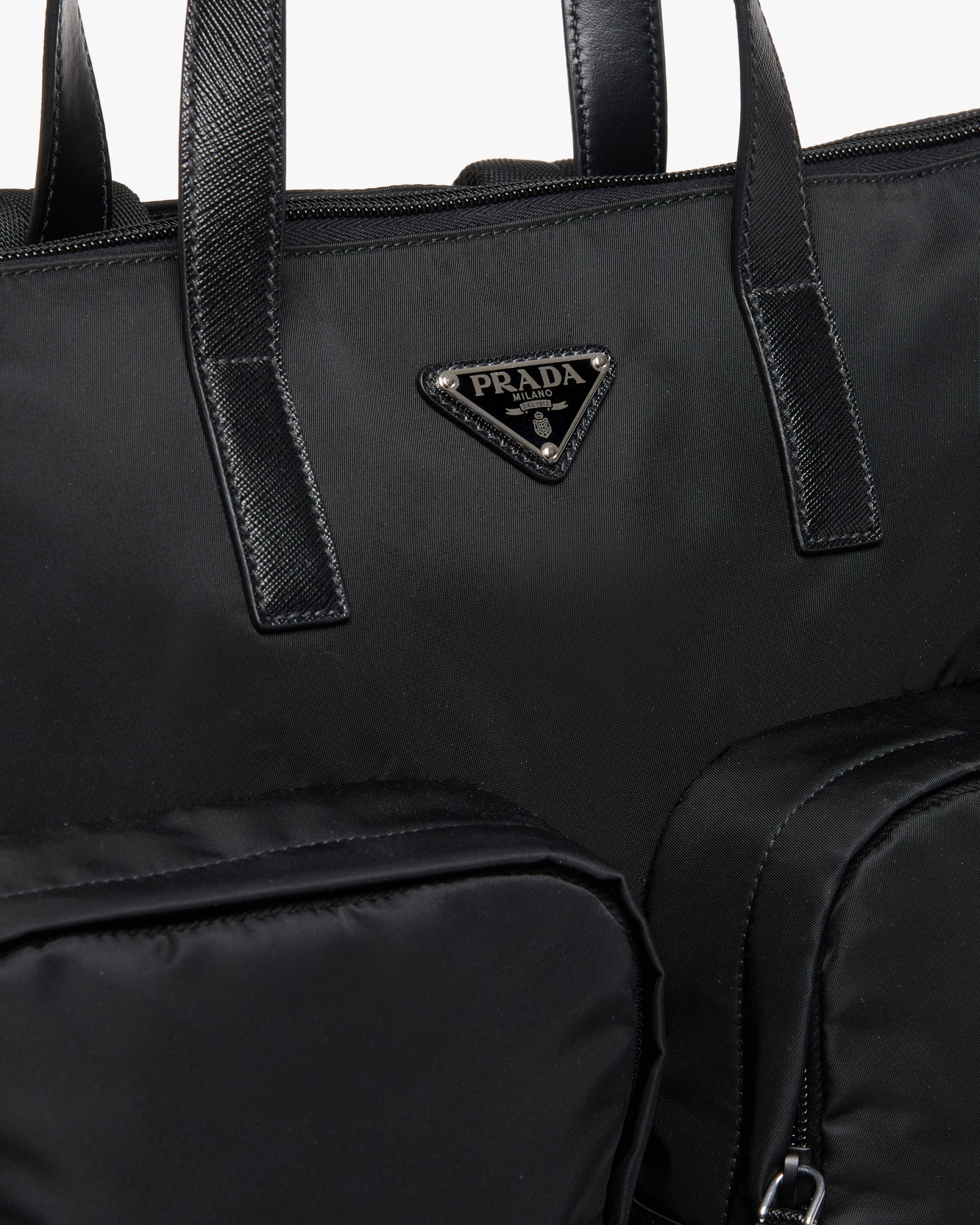 The new Prada collectsion combines traditional materials and technologically innovative recycled fibers to create hybrid designs that blend old and new, luxury and simplicity. This tote bag is made of Re-Nylon, a functional material and vehicle of experimentation produced from recycled and purified plastic collectsed from oceans, fishing nets and textile fiber waste. The accessory, with an internal compartment and two front pockets, is accented with details in Saffiano leather, calf leather of the highest quality defined by a crosshatch texture and wax finish that identifies with traditional Italian leather goods production.