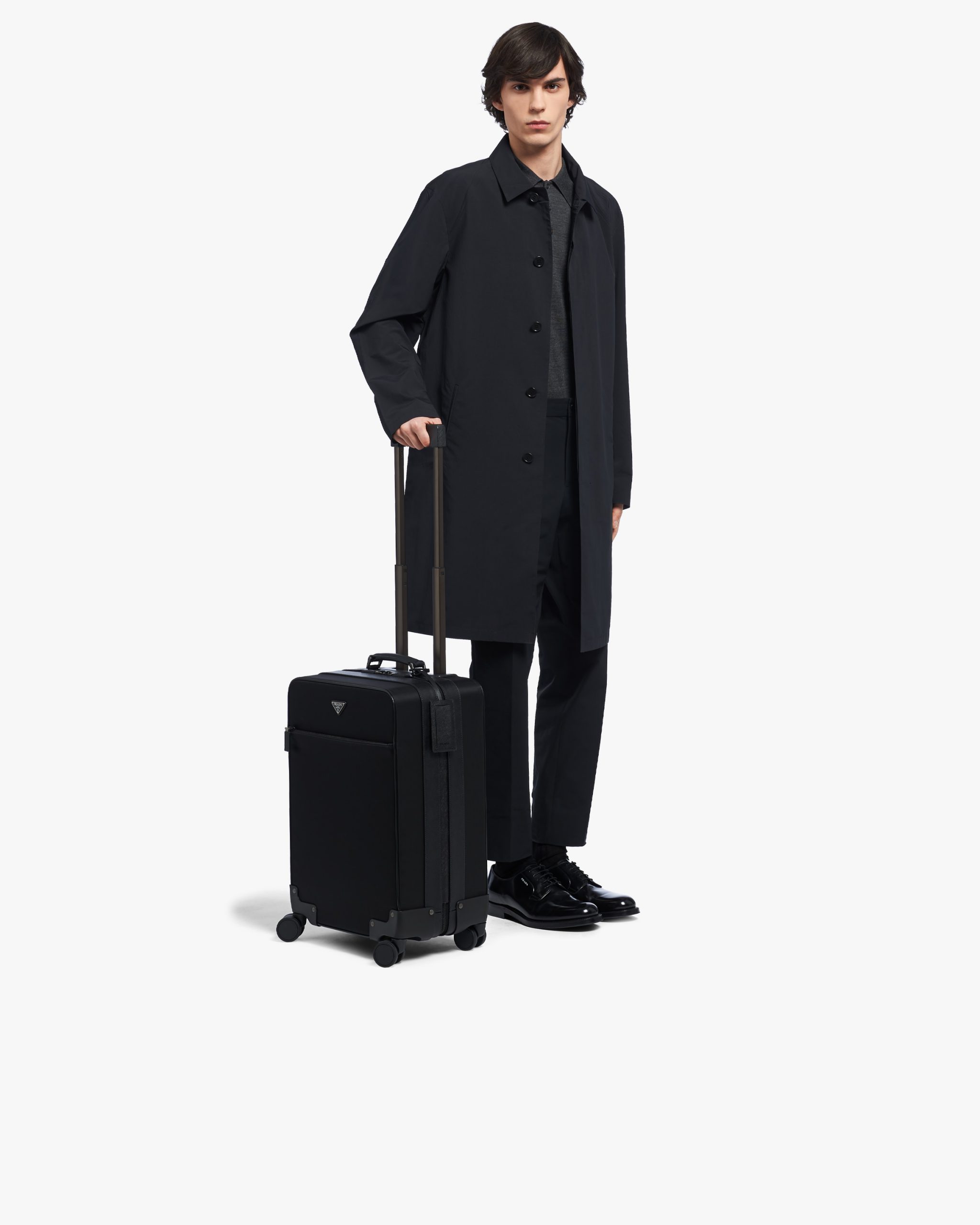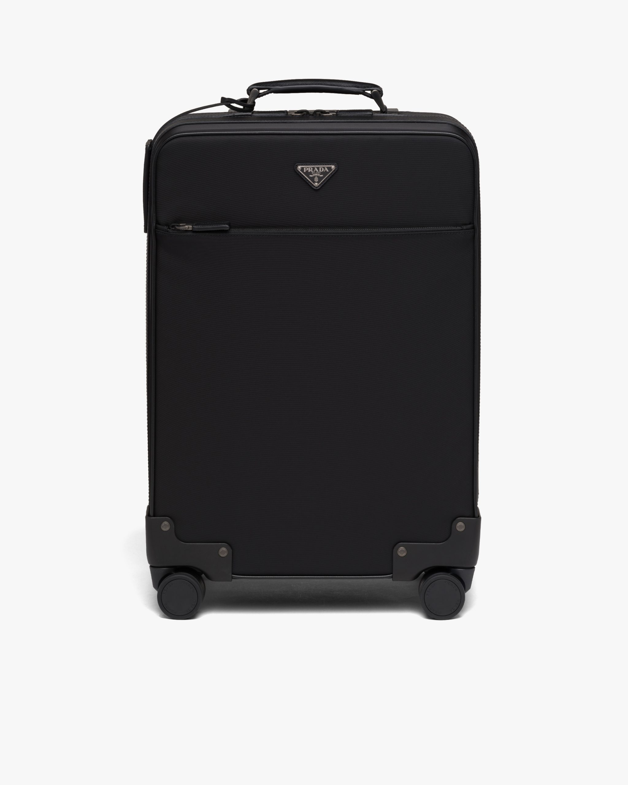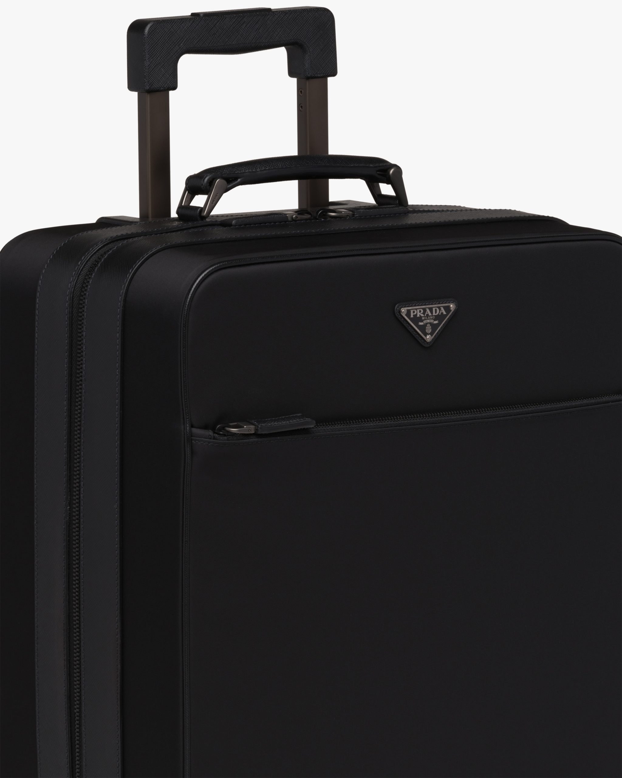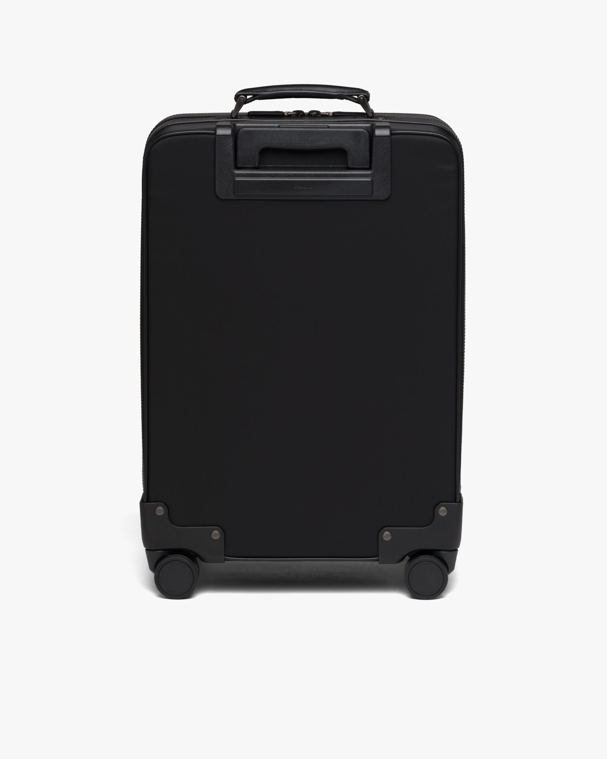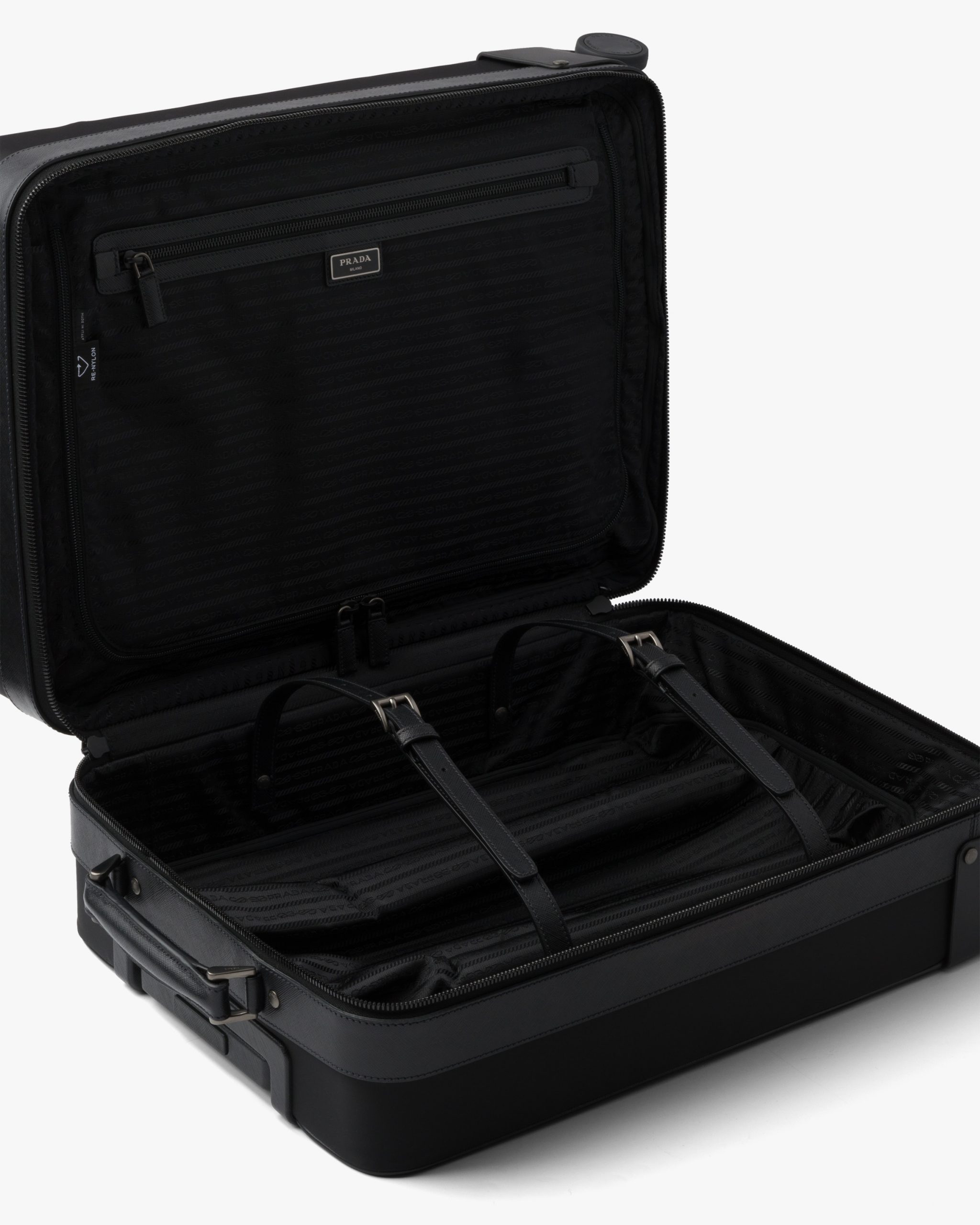 This trolley, with a combination of traditional materials and technologically innovative fibers, is made of Re-Nylon gabardine fabric and Saffiano leather. A functional material and vehicle of experimentation, Re-Nylon is a regenerated nylon yarn produced from recycled and purified plastic trash recovered in the oceans, fishing nets, and textile fiber waste. It is combined in this trolley with Saffiano leather, calf leather of the highest quality defined by a crosshatch texture and wax finish.