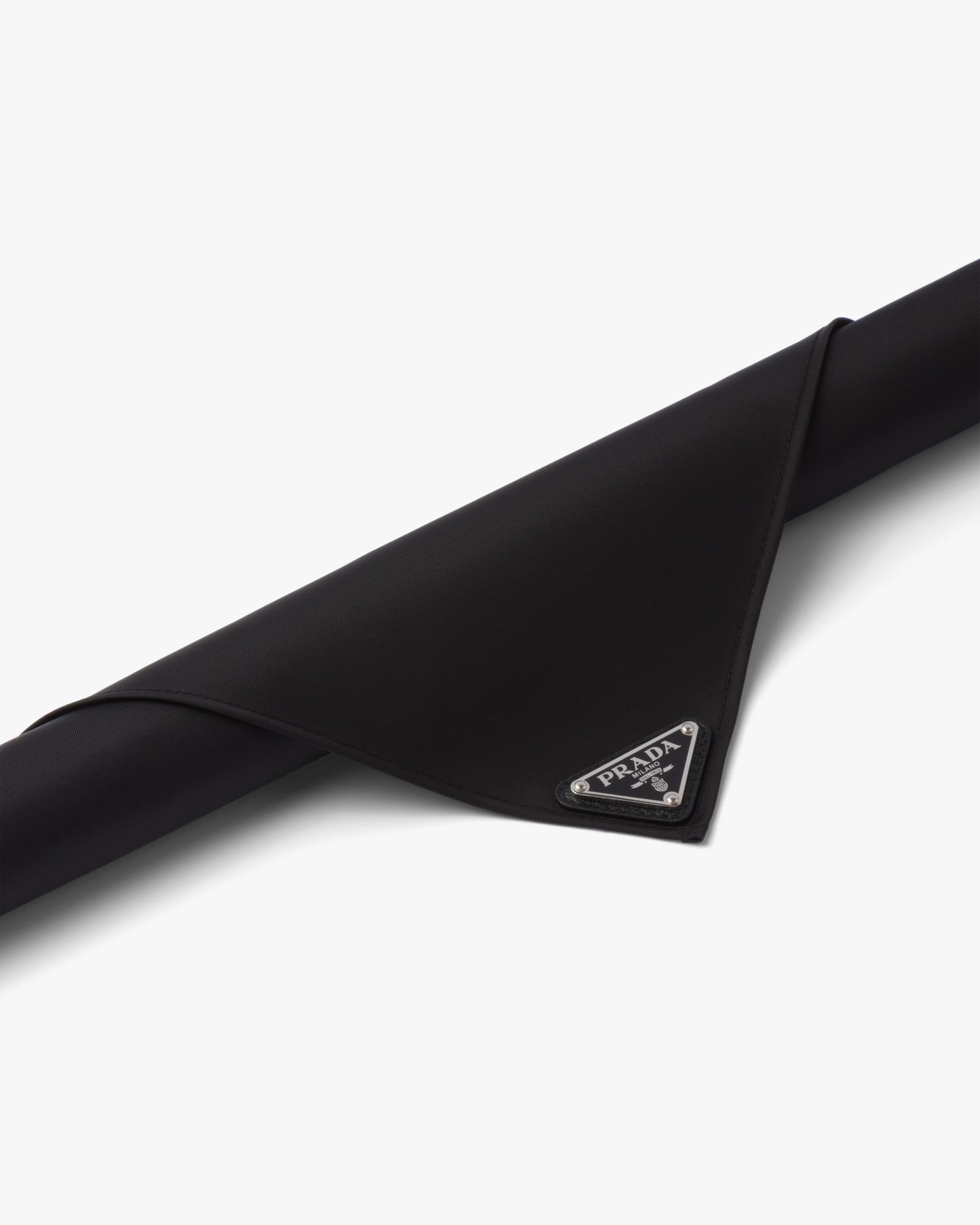Re-Nylon, a technologically innovative fabric produced from recycled, purified plastic collectsed in the ocean, adds a contemporary note to a classic accessory like this foulard decorated with Prada’s emblematic triangle logo.