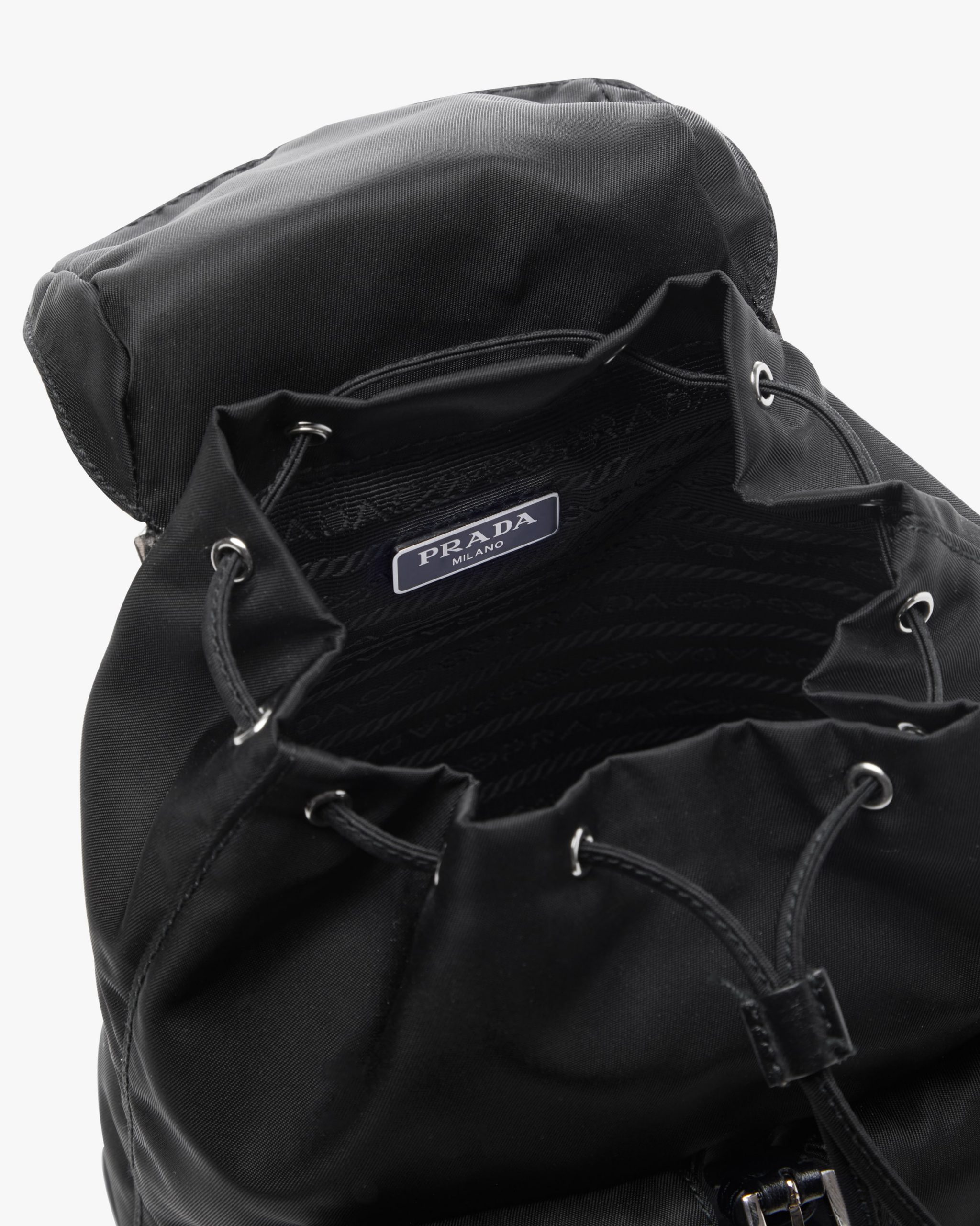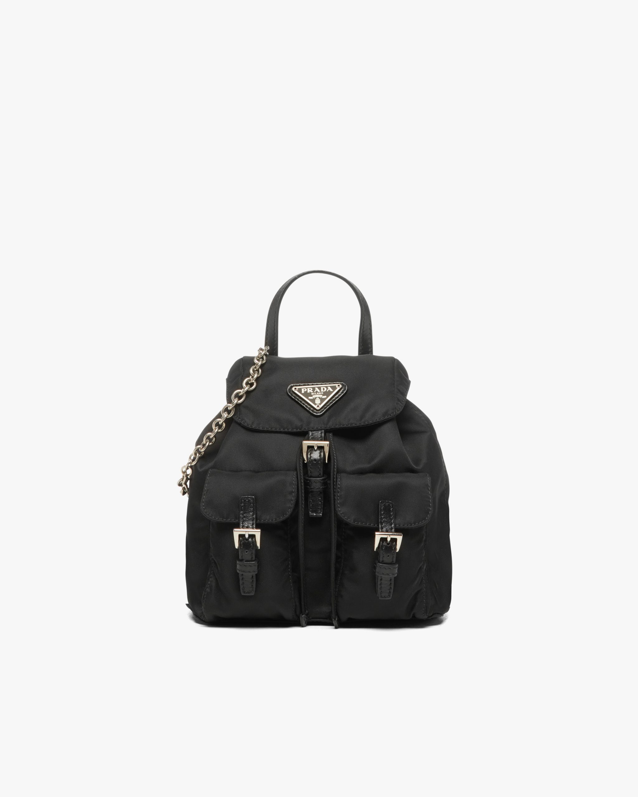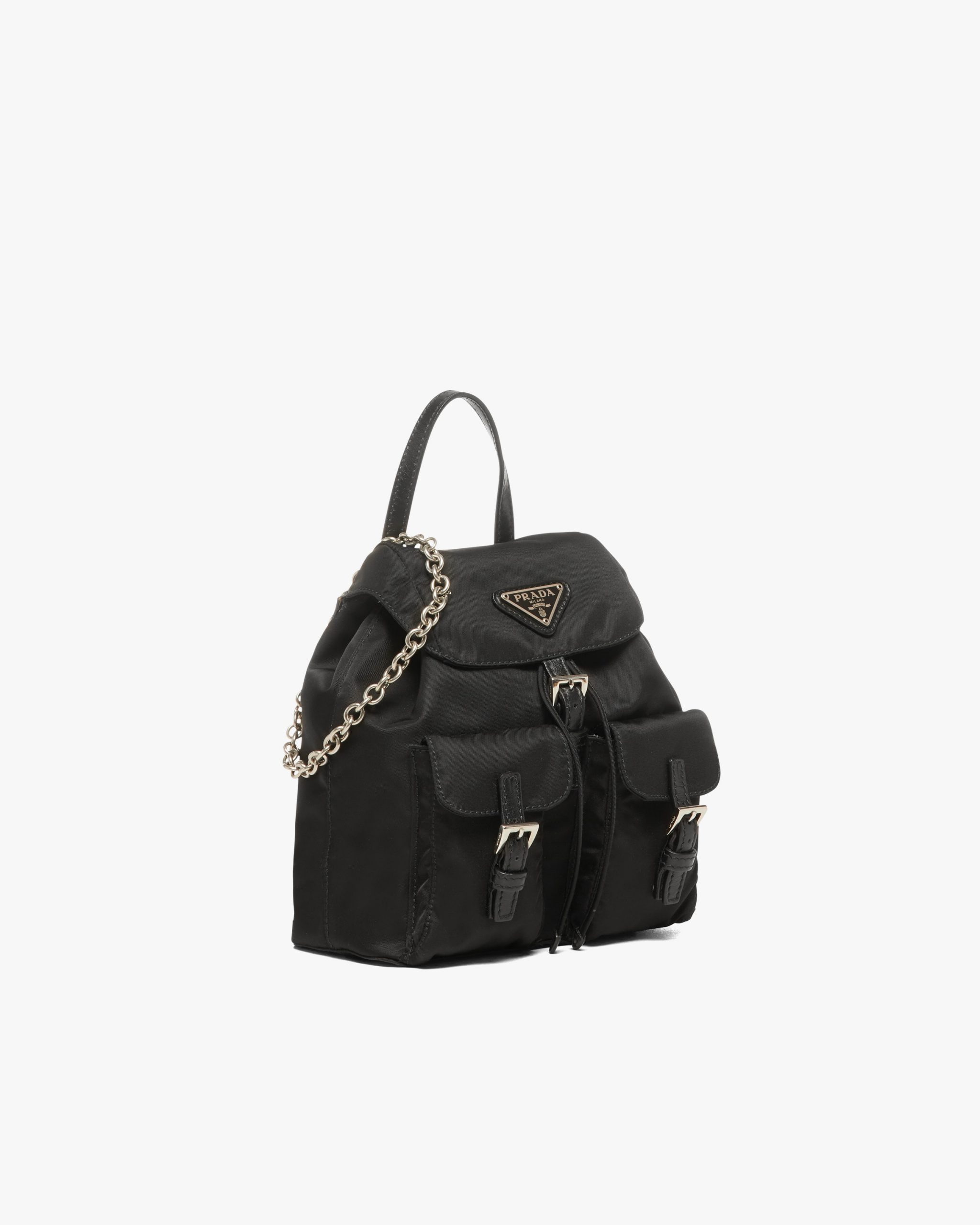 Practicality and a sleek line distinguish this all-purpose style that can be turned into a handbag thanks to its removable shoulder strap. Introduced in Prada collectsions with a minimalist design in 1984, the backpack reflects the main characteristics of the brand: innovative materials, a utilitarian approach to luxury, and a reinterpretation of the classics. The emblematic design is presented in Re-Nylon, produced from recycled, purified plastic material collectsed in the ocean.
