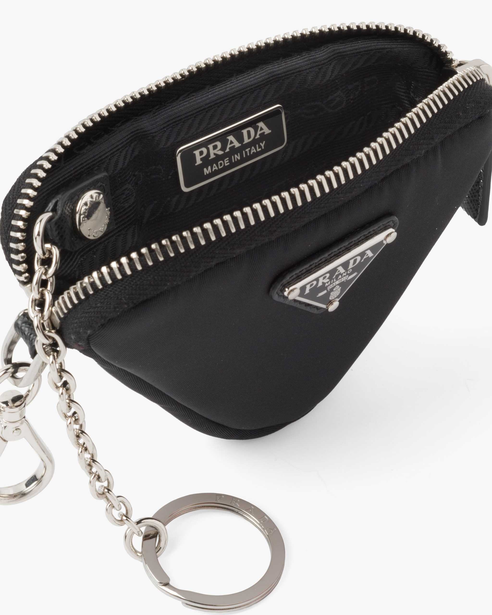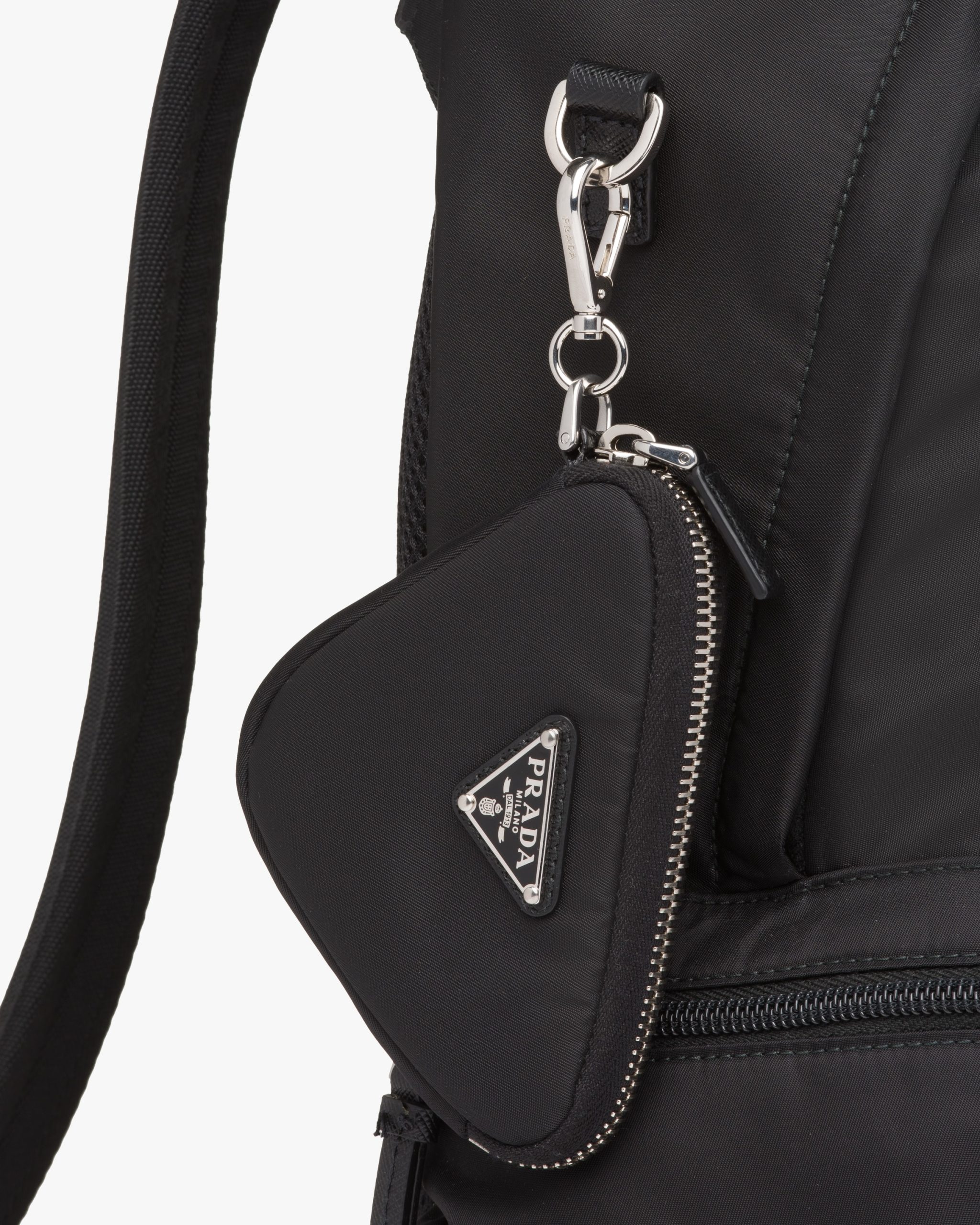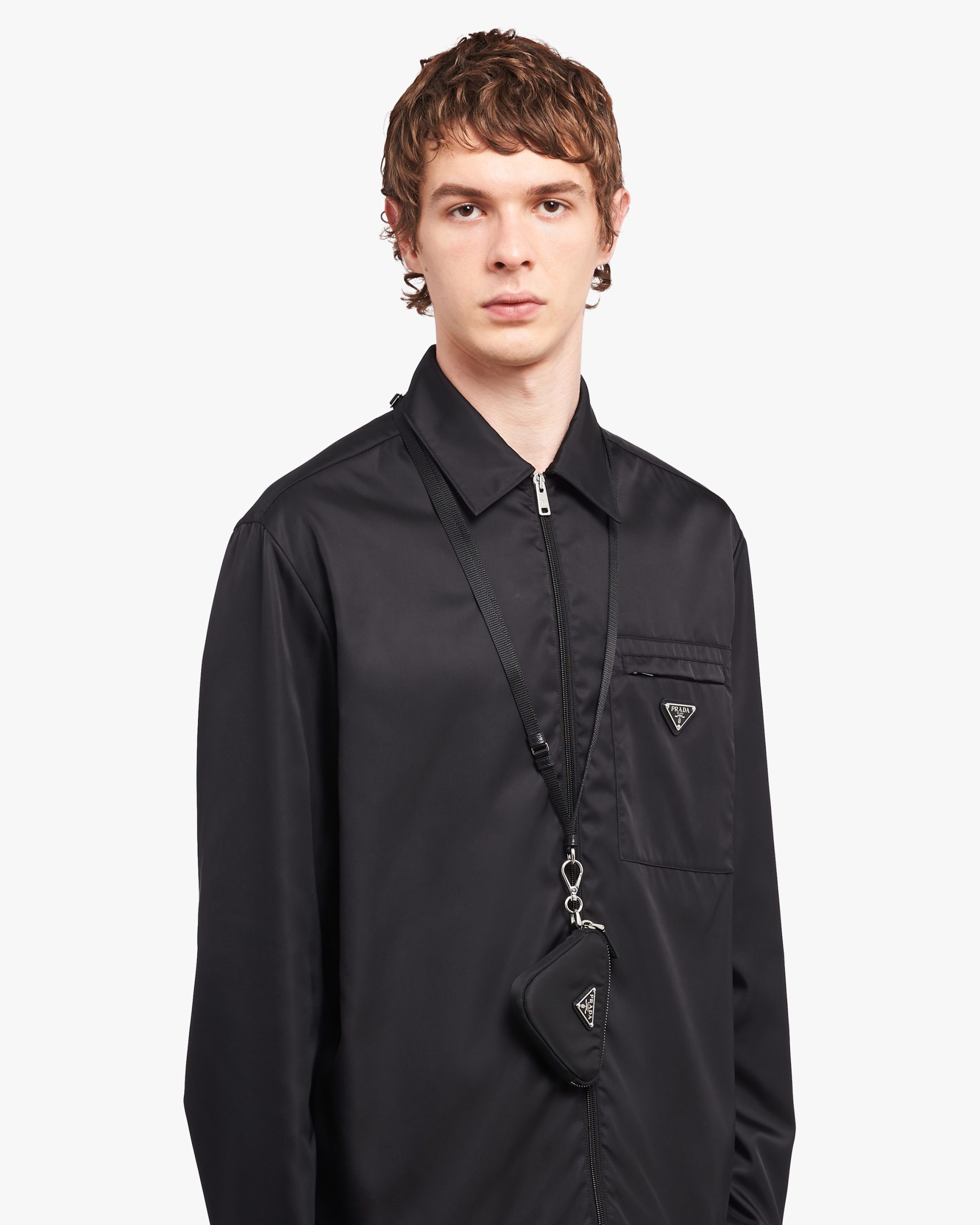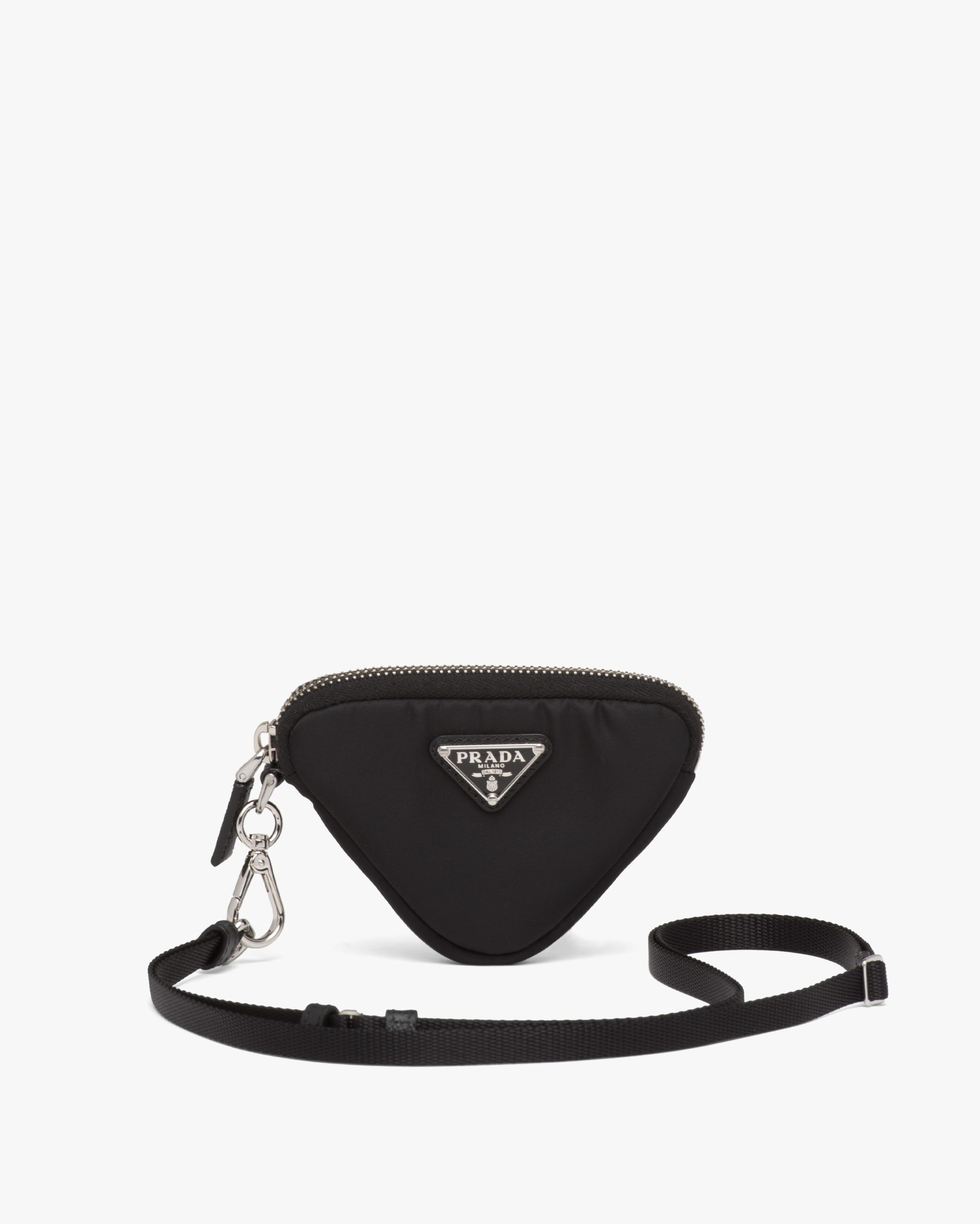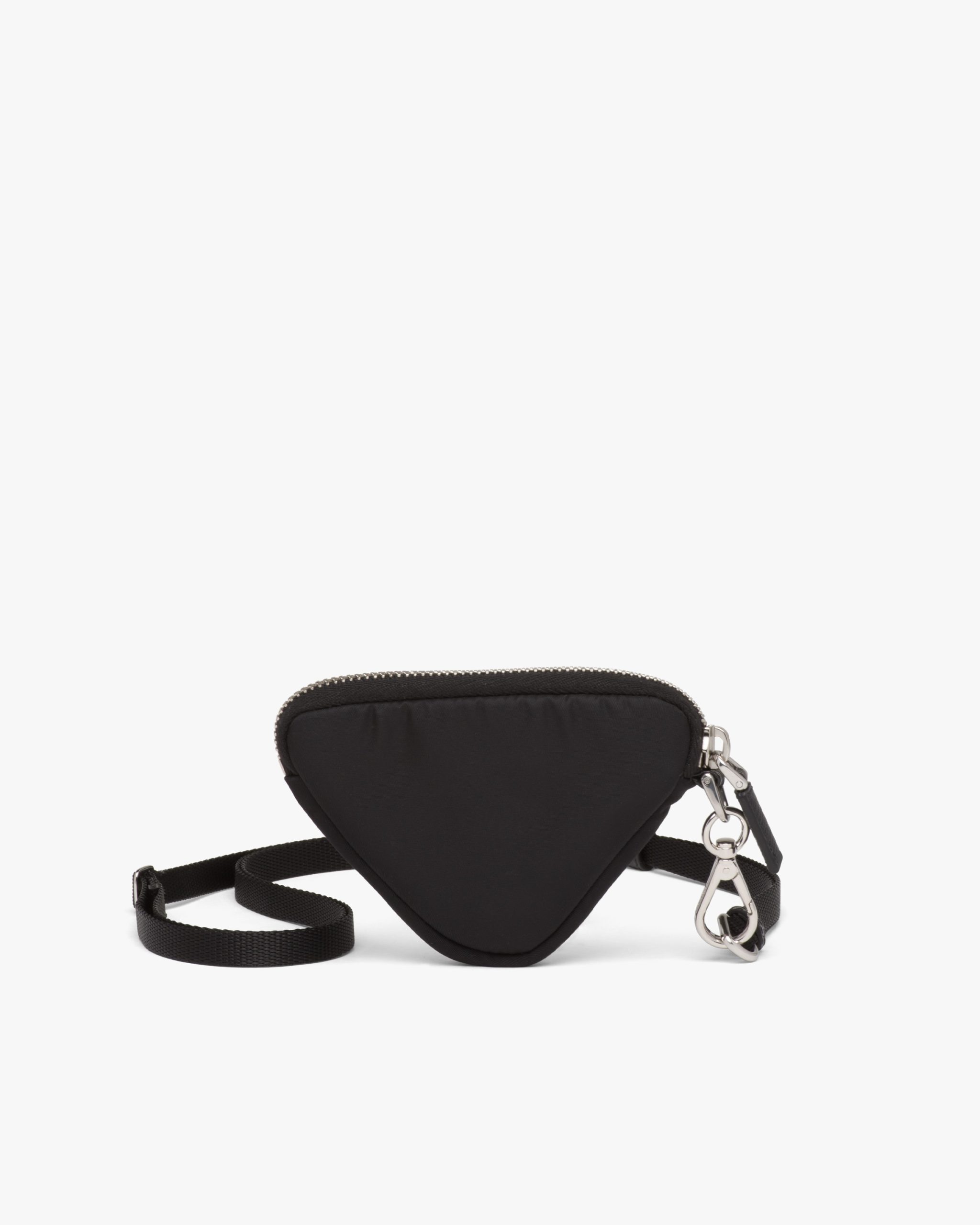 Compact in design, this padded mini pouch is made of innovative Re-Nylon, a regenerated nylon yarn produced from recycled and purified plastic trash collectsed in the ocean, fishing nets, and textile waste fibers. The accessory with zipper stands out for its adjustable neck strap and the enameled metal triangle logo.
