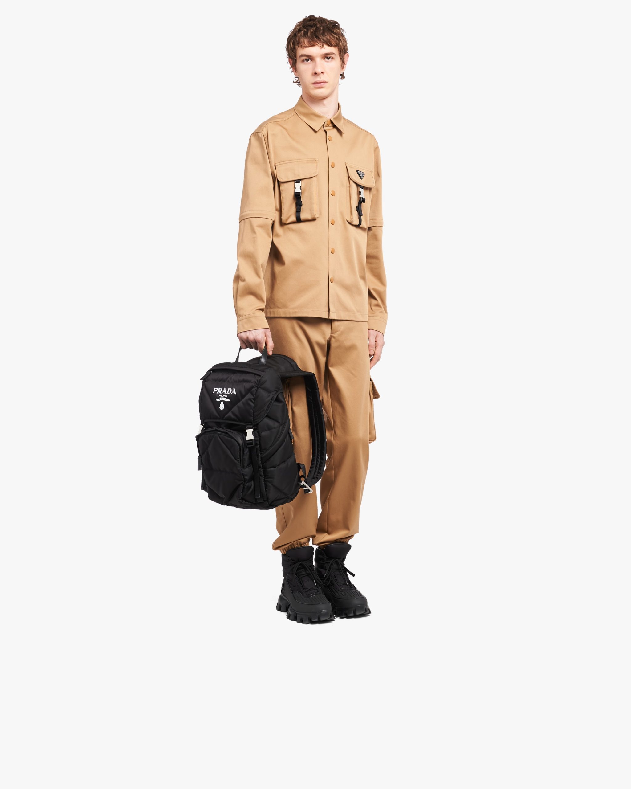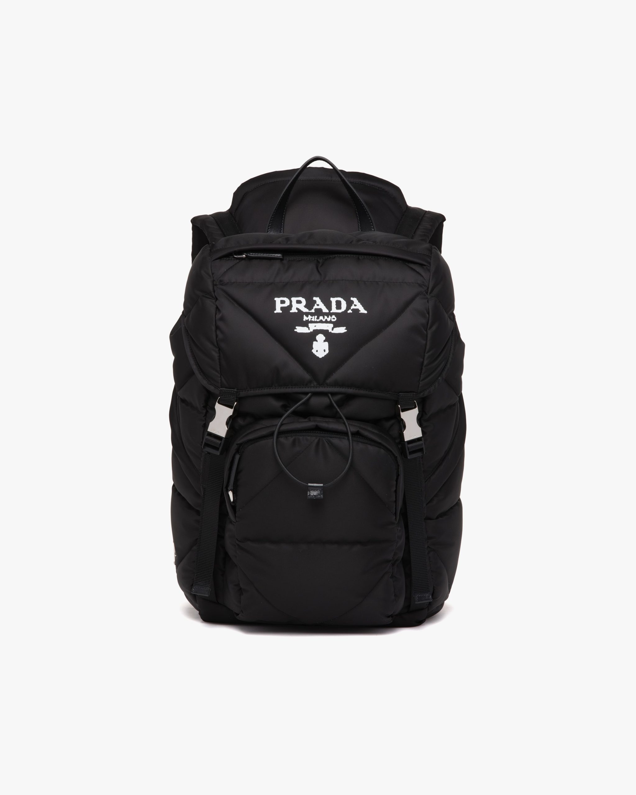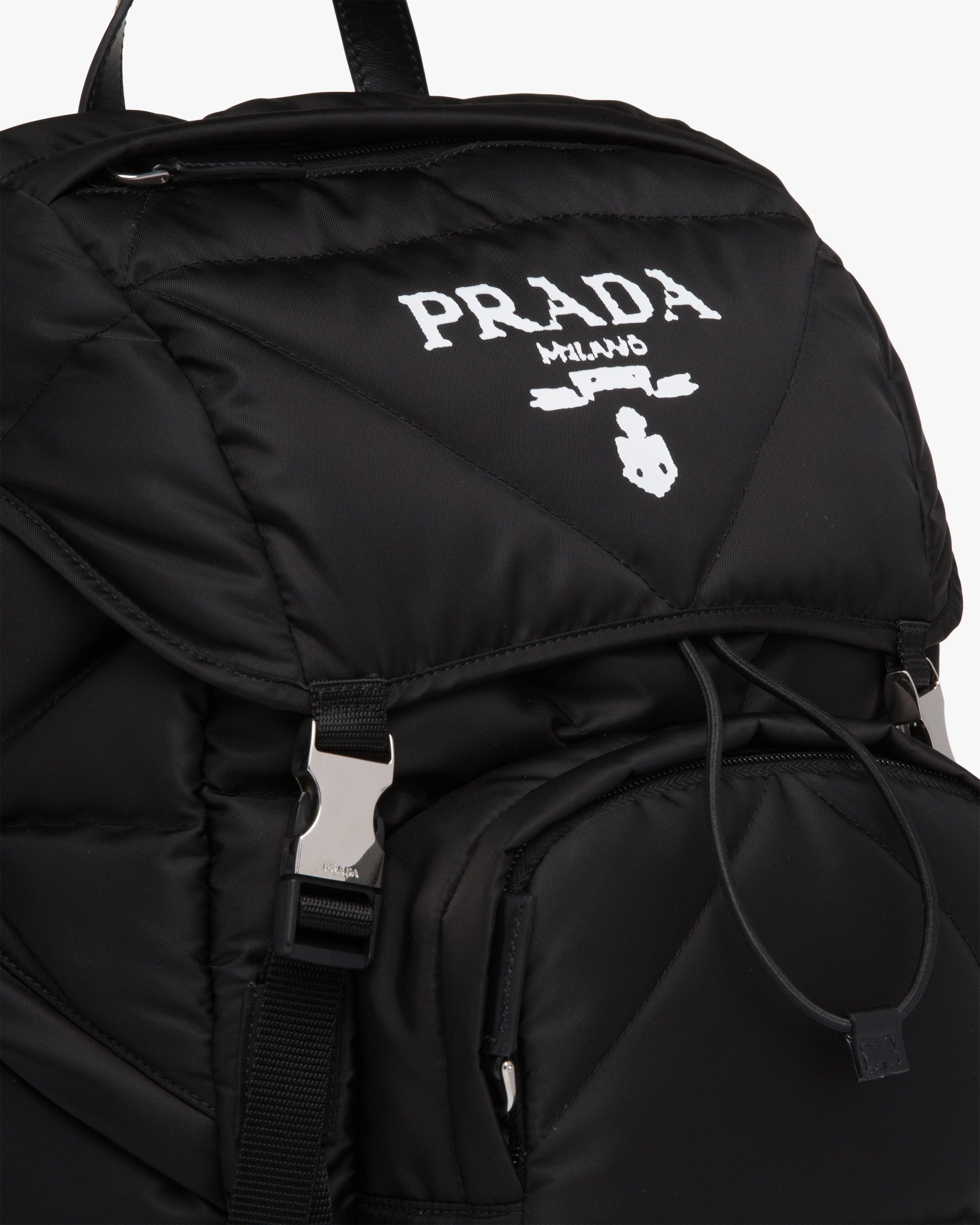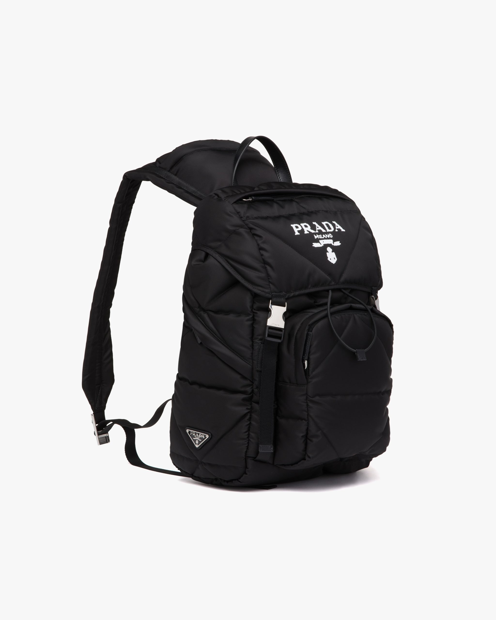 The hybrid concept pervades the Prada narrative and is translated into innovative designs with an interesting and unusual mix of materials, shapes and functions. This padded backpack with a compact, minimalist design conceals an extractable fabric hood that reveals its versatile, multifunctional spirit.