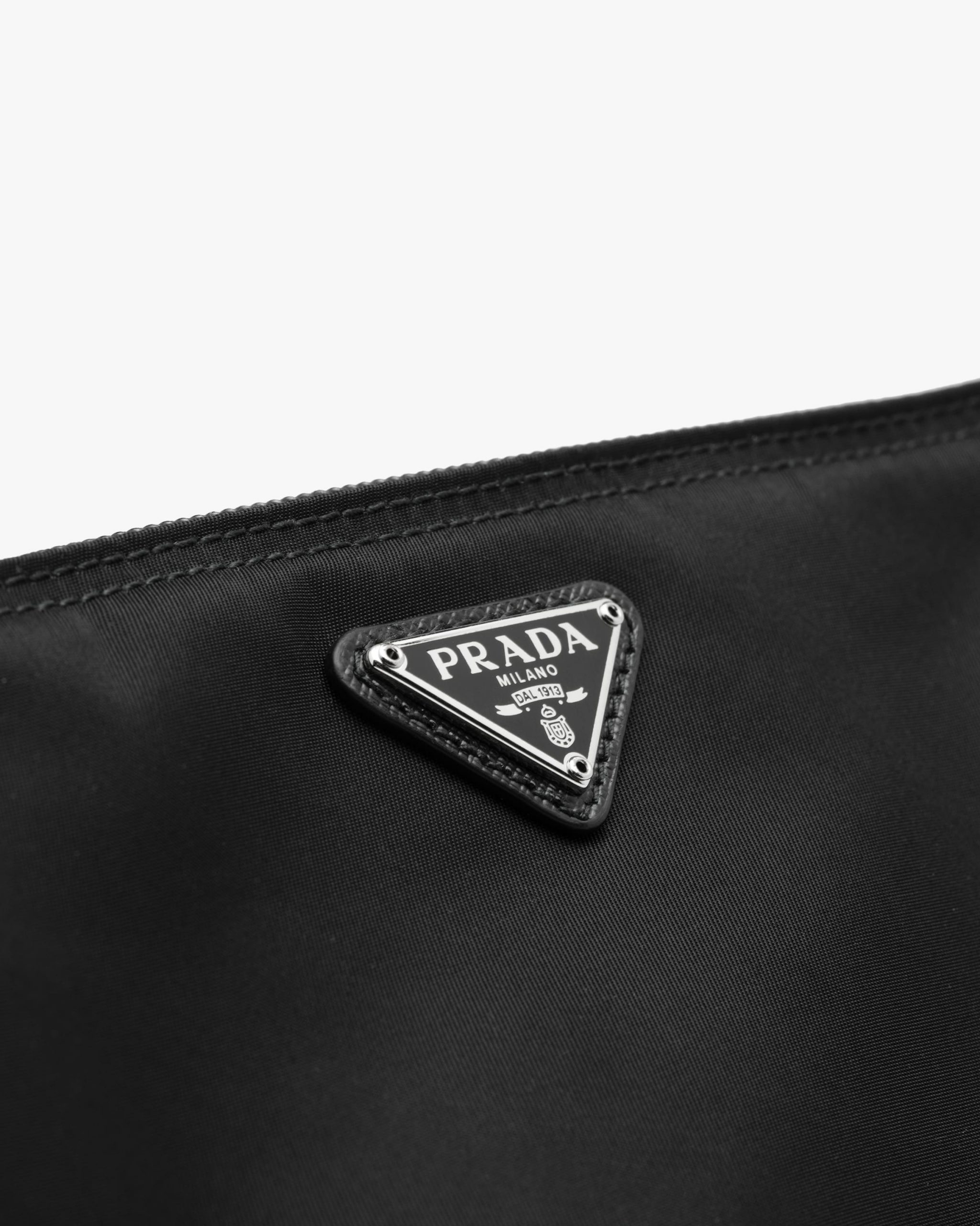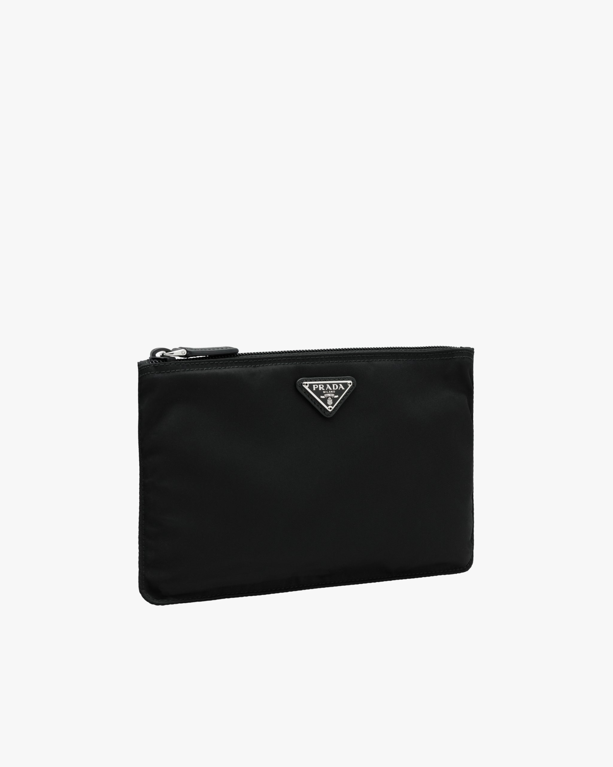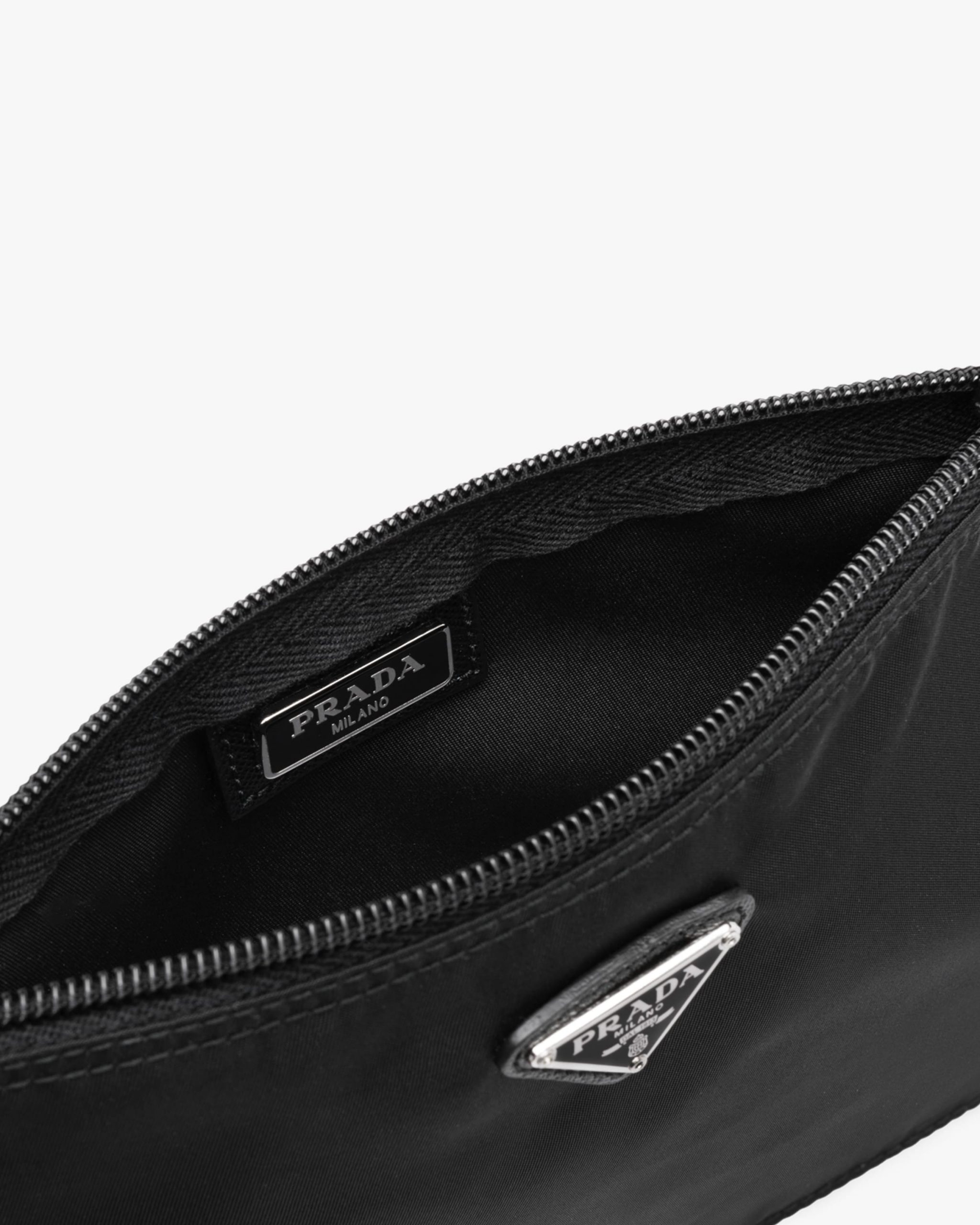 Characterized by a sleek line and emphasized by the iconic enameled metal triangle logo, this pouch is made of Prada’s innovative Re-Nylon fabric produced from recycled plastic materials collectsed in the ocean.