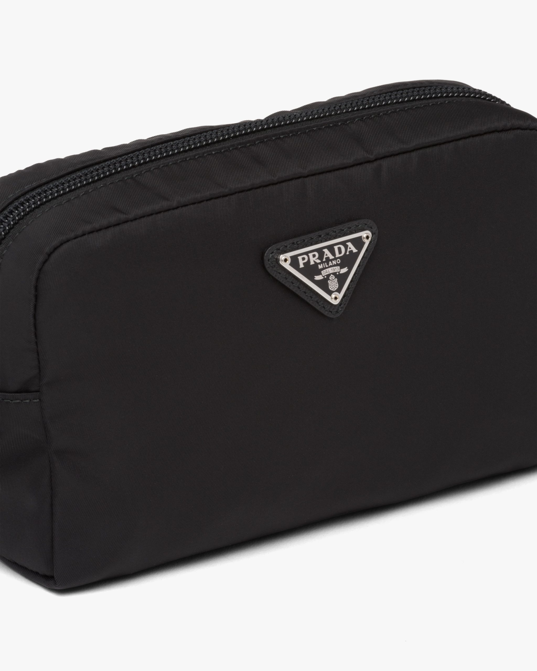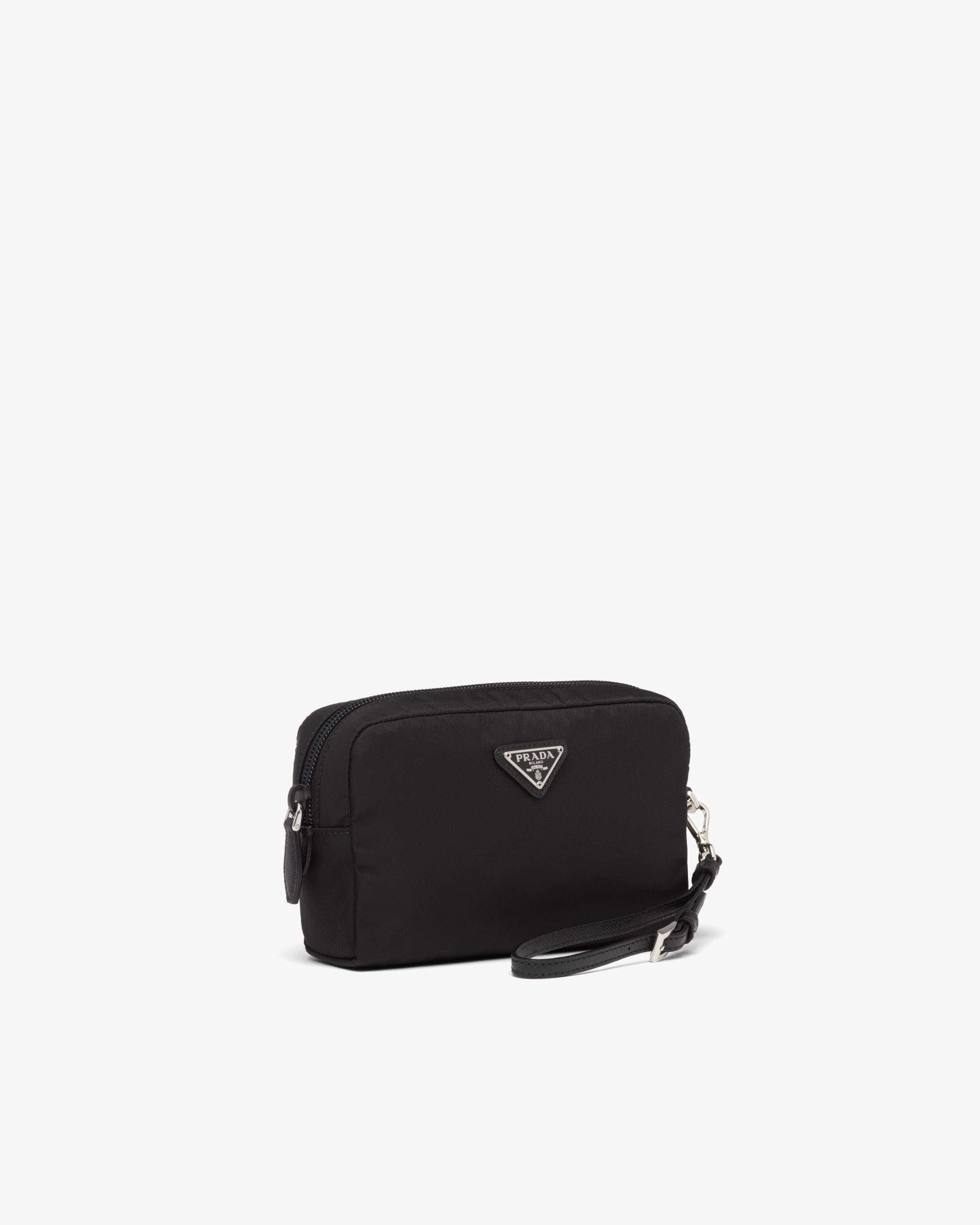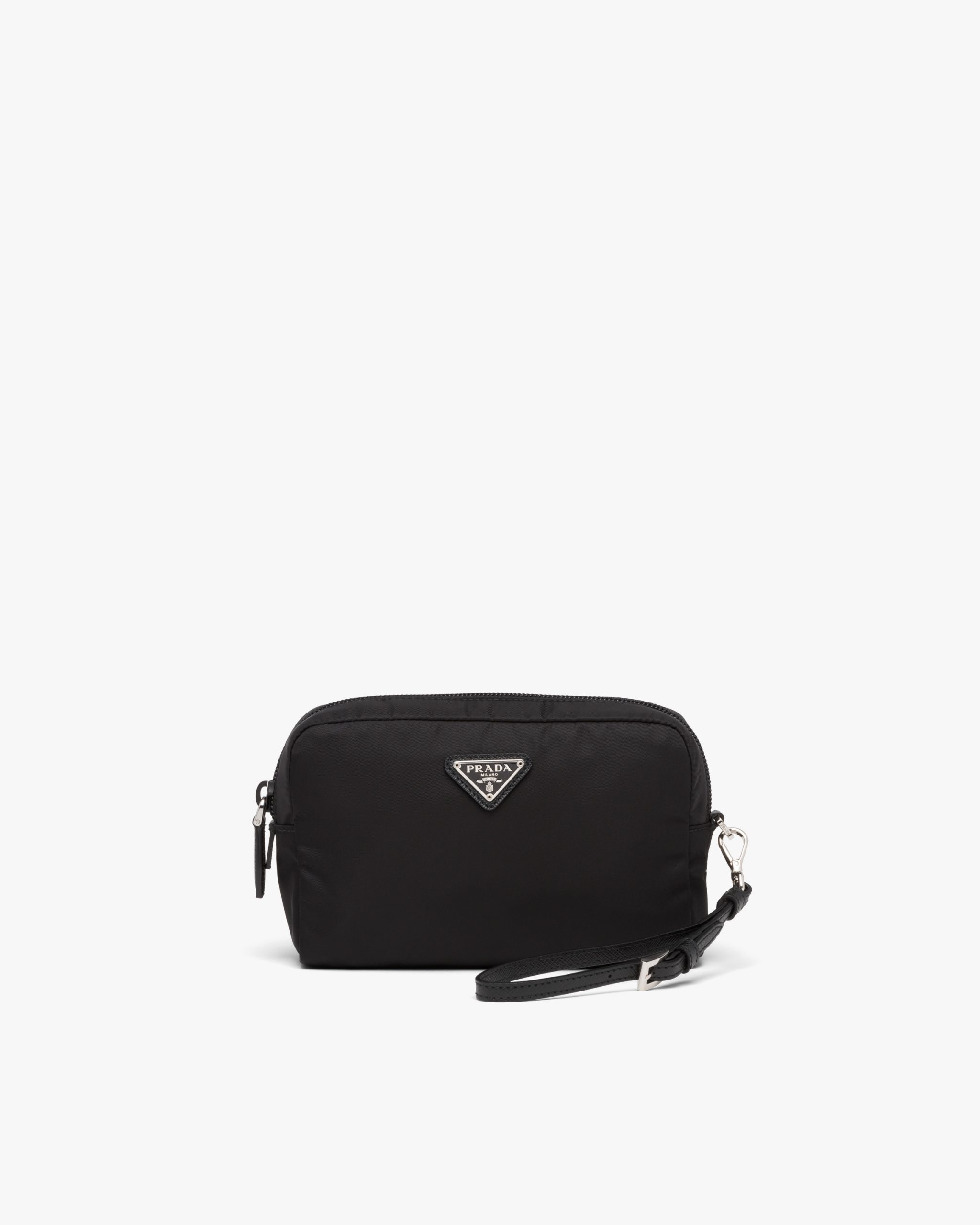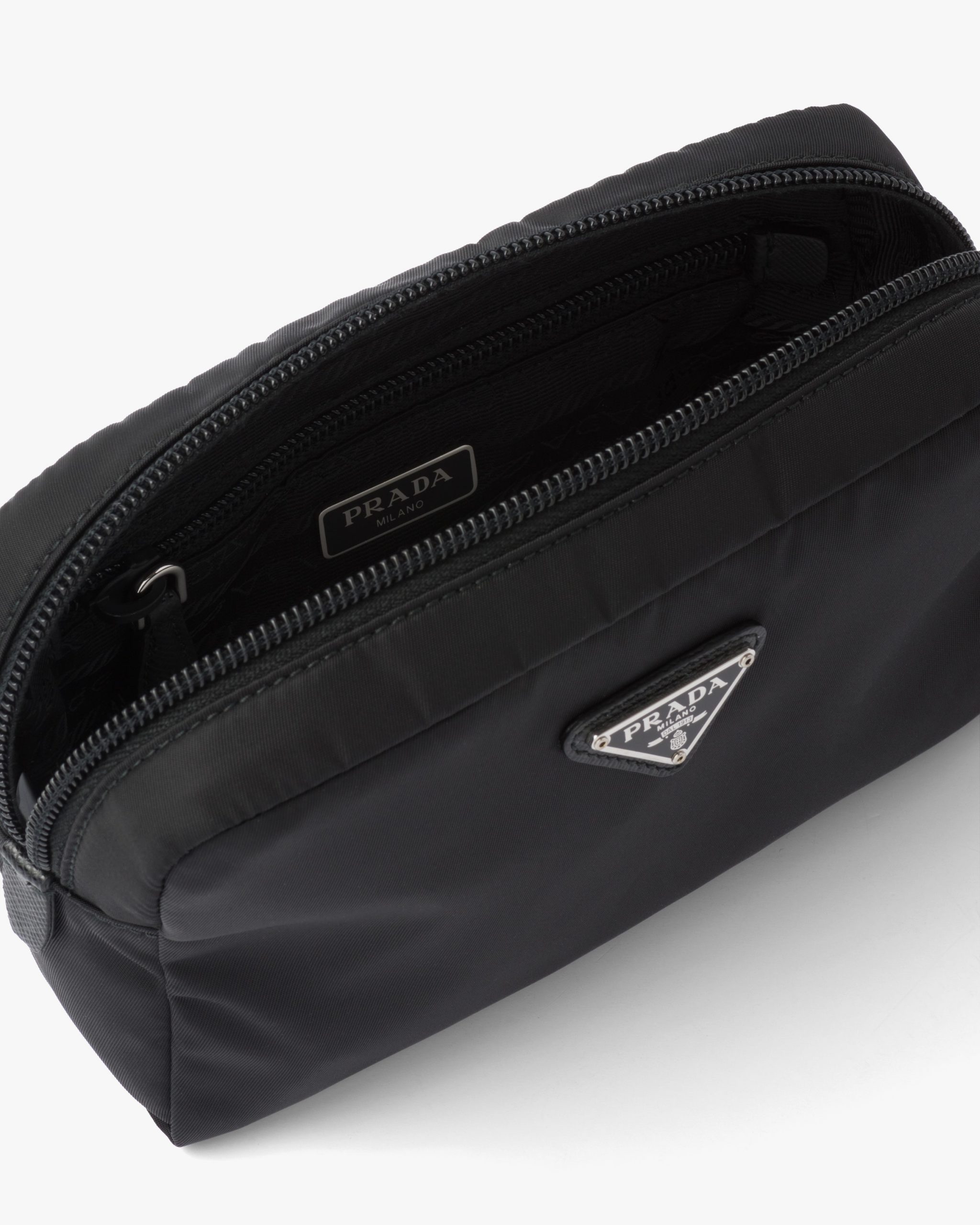 Made of Prada’s innovative Re-Nylon fabric produced from recycled plastic materials collectsed in the ocean, this pouch stands out for its practical attitude expressed by the removable strap on the side. The zipper closure has a metal zipper pull, while the interior has logo-print fabric lining.