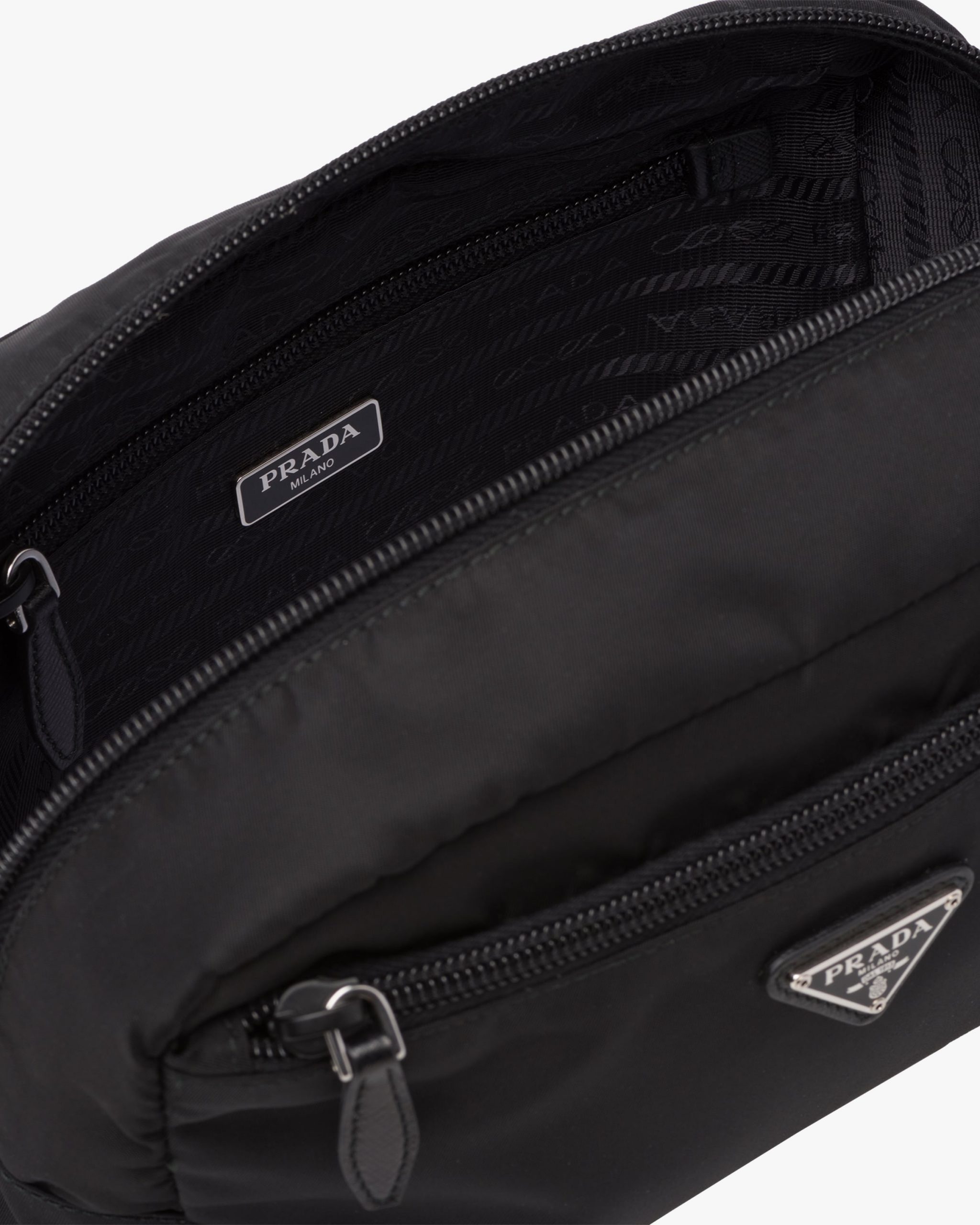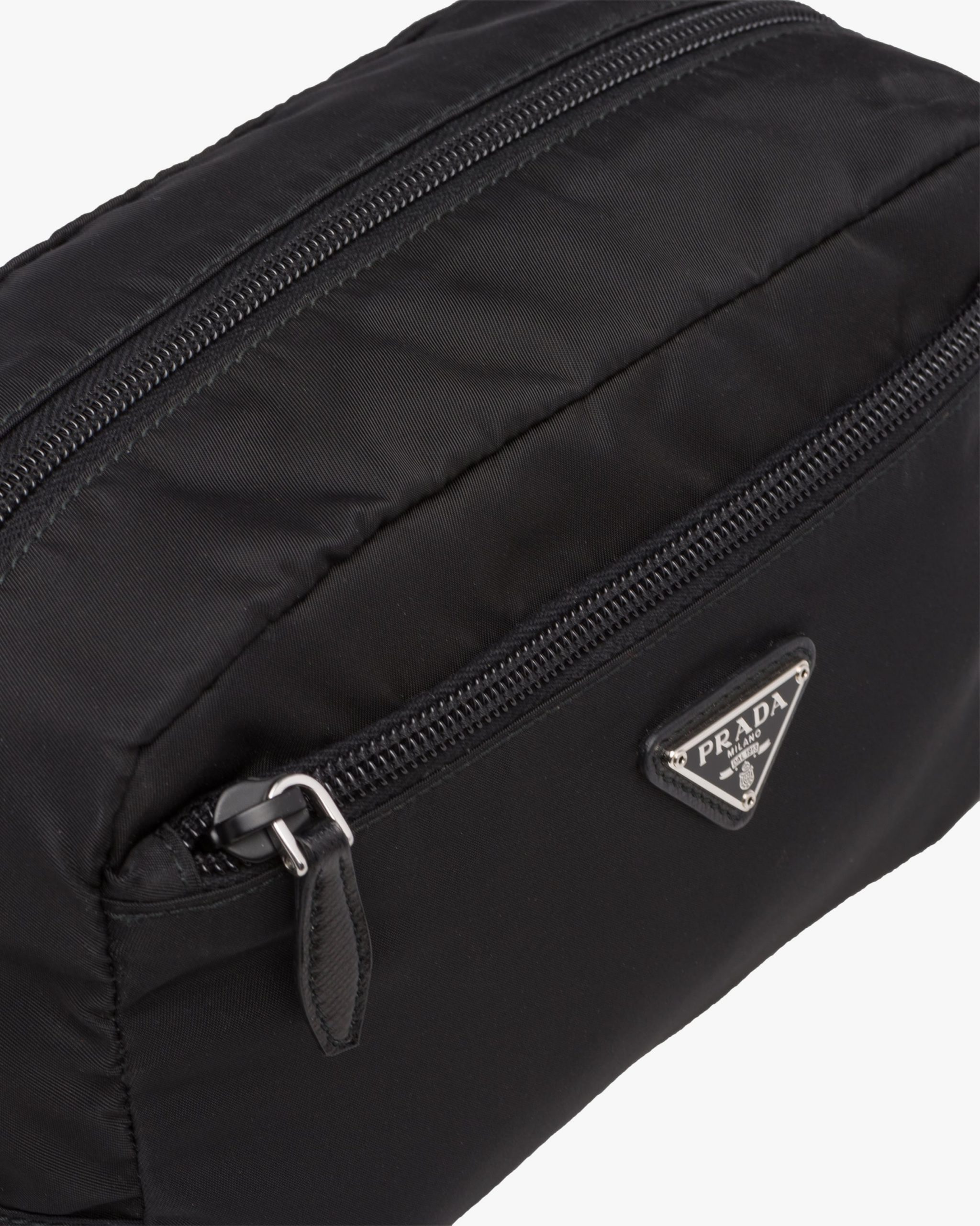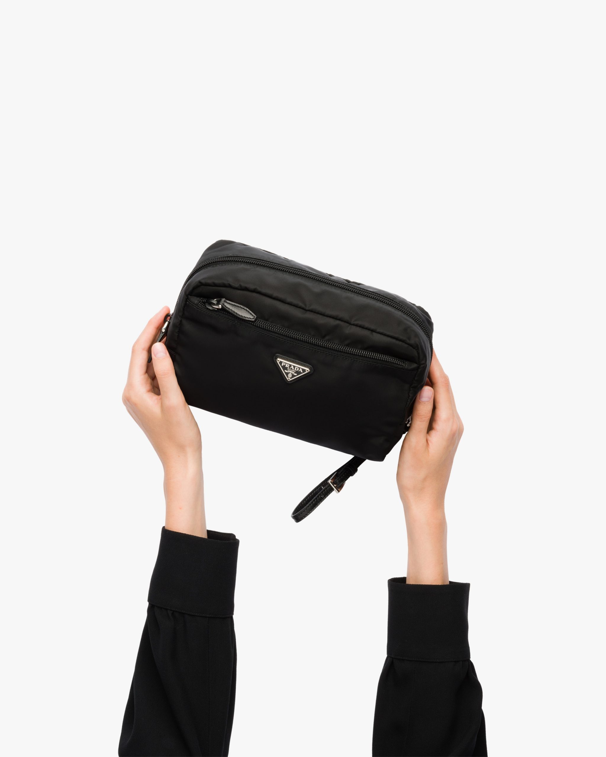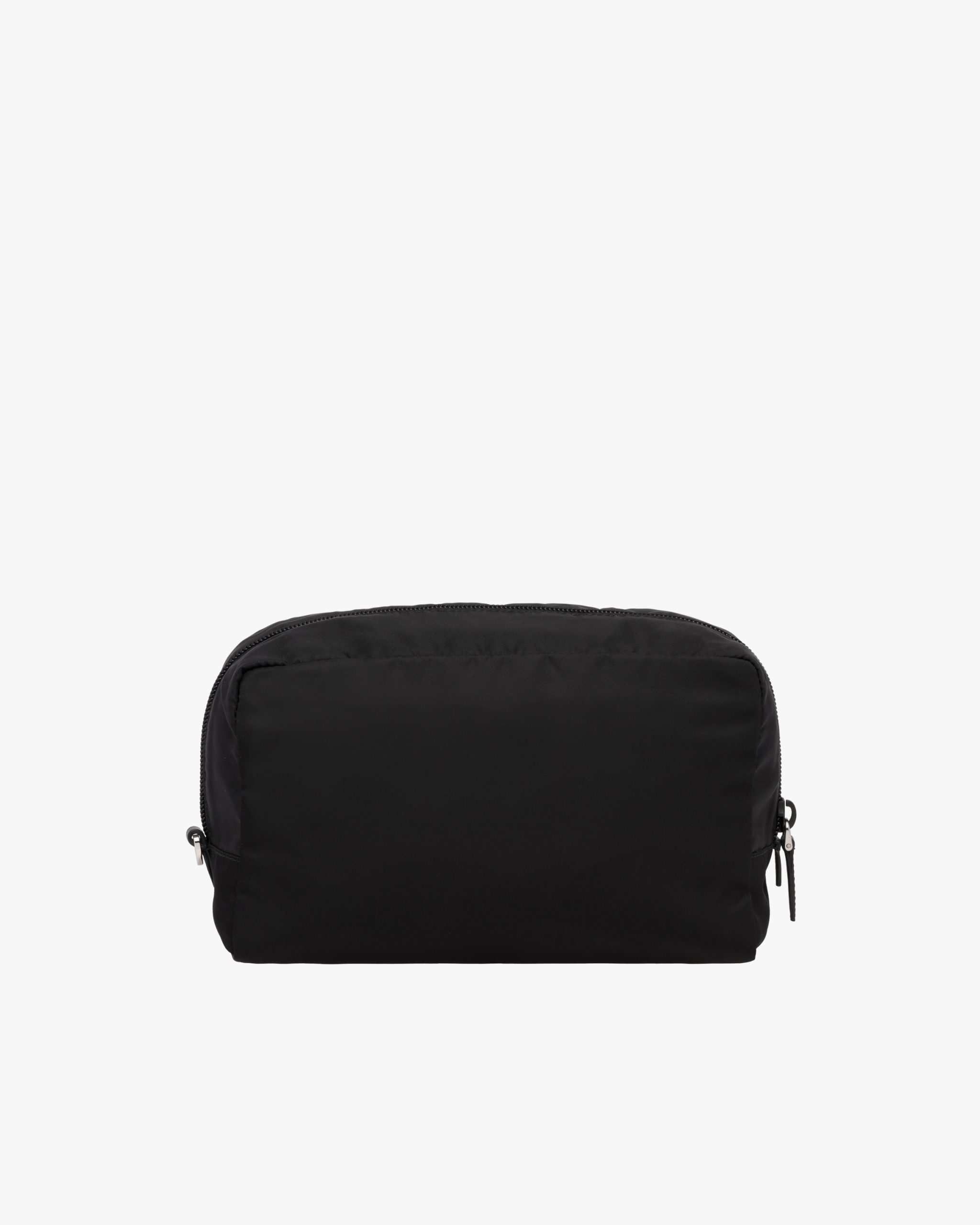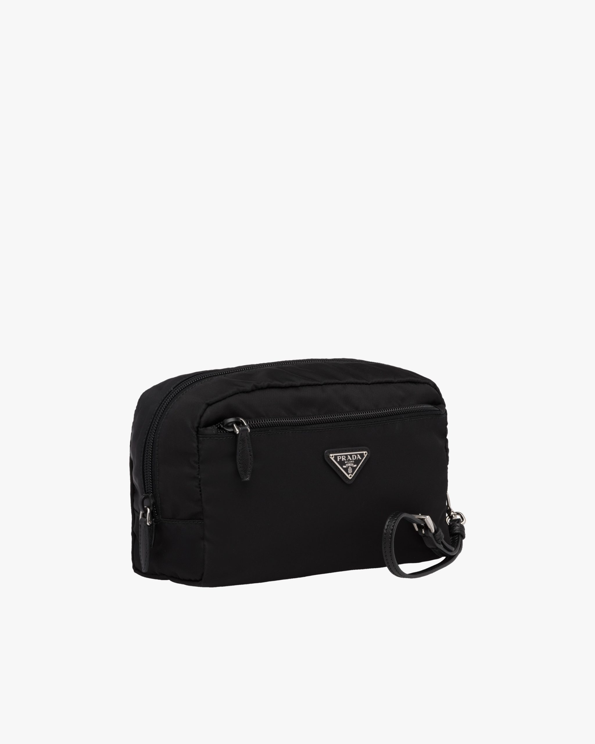 Made of Prada’s innovative Re-Nylon fabric produced from recycled plastic materials collectsed in the ocean, this pouch with external pocket has a zipper closure and detachable leather strap. The iconic enameled metal triangle logo decorates the design.
