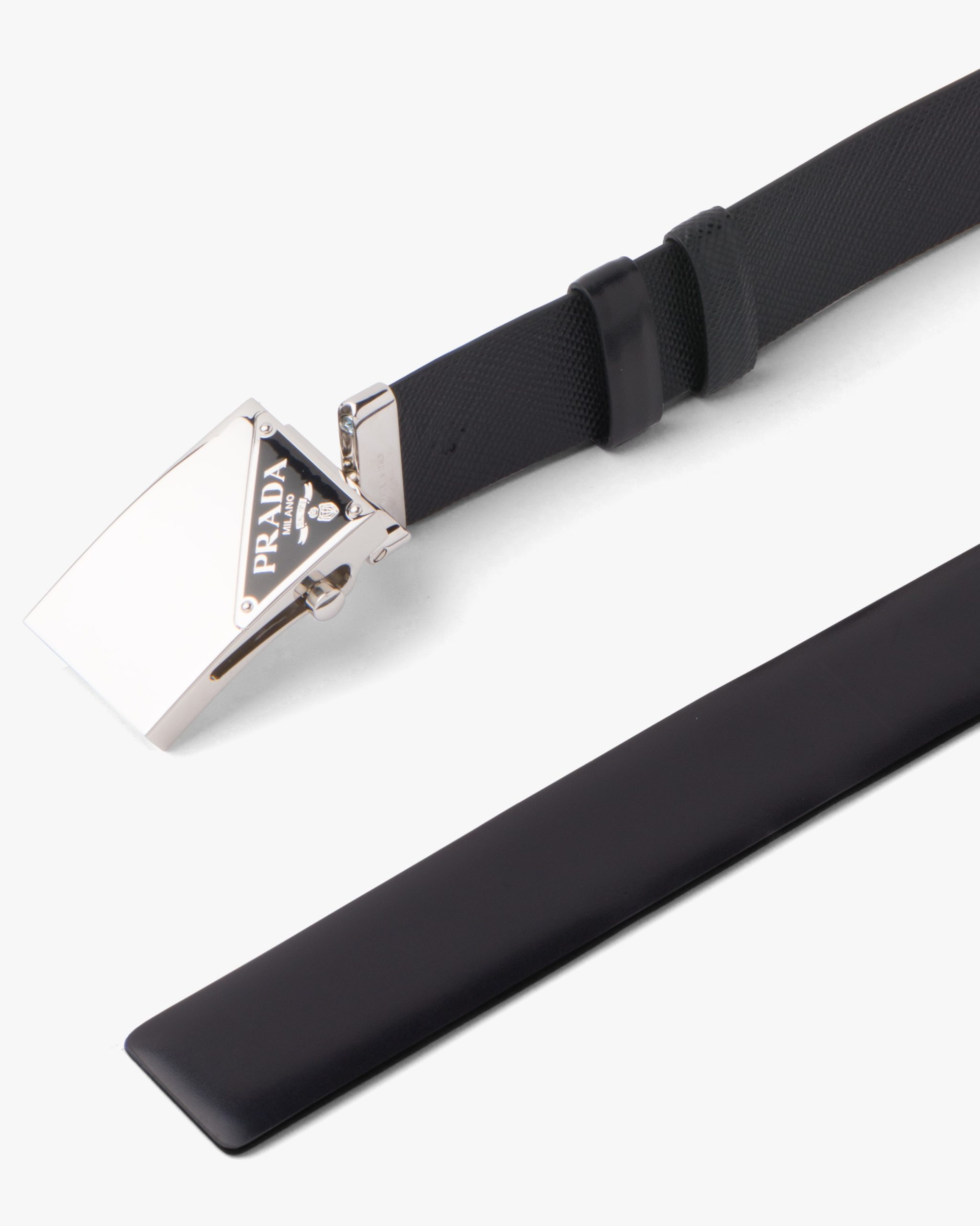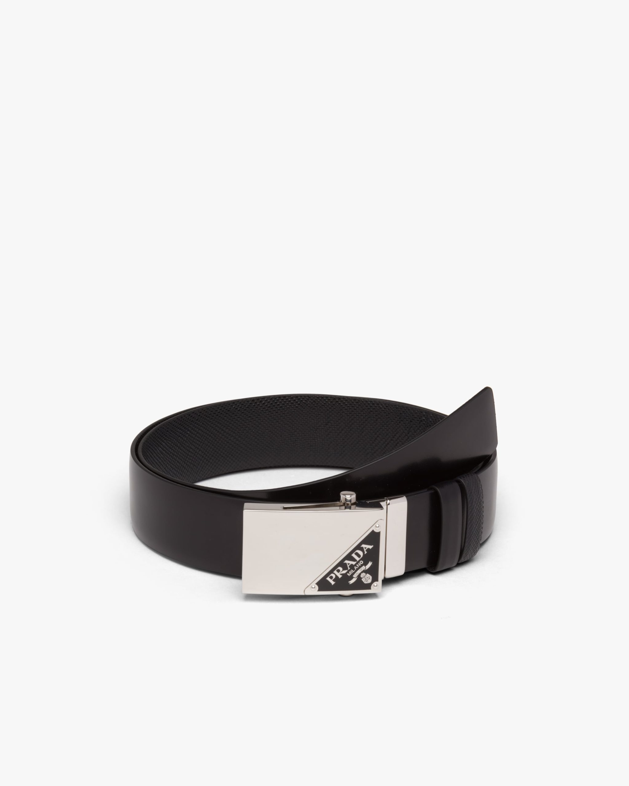 This belt crafted from leather and Saffiano is characterized by the logo engraved on the buckle.