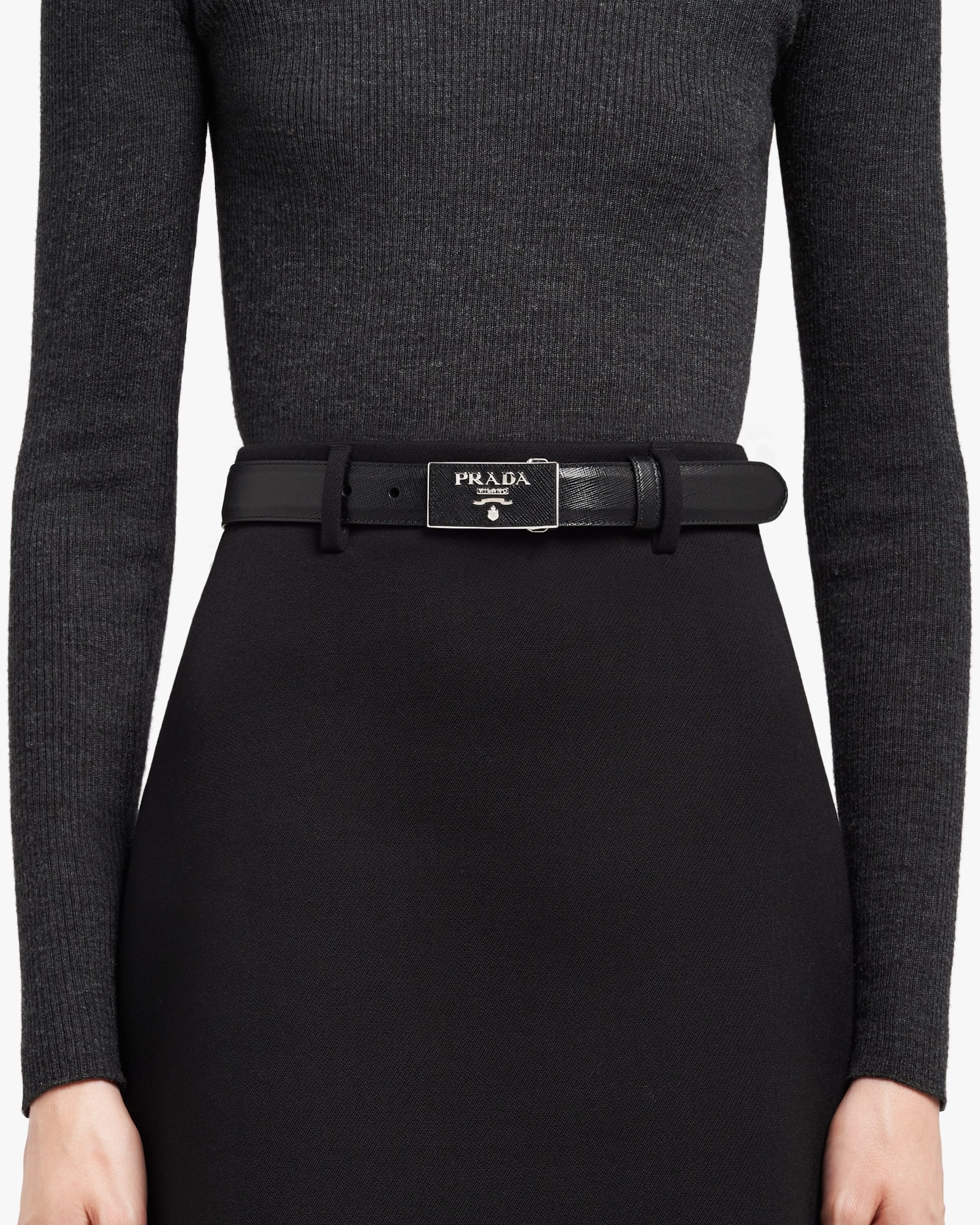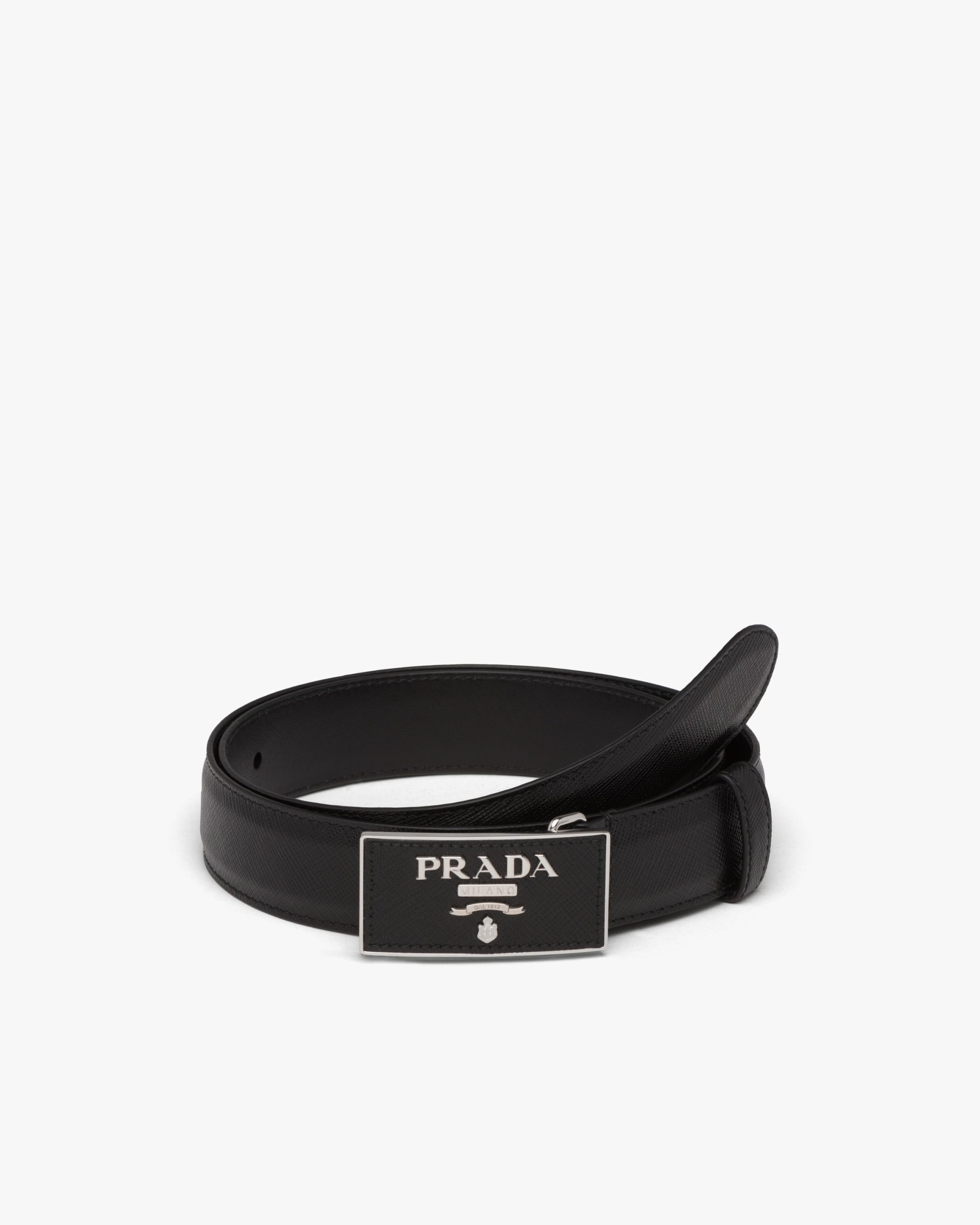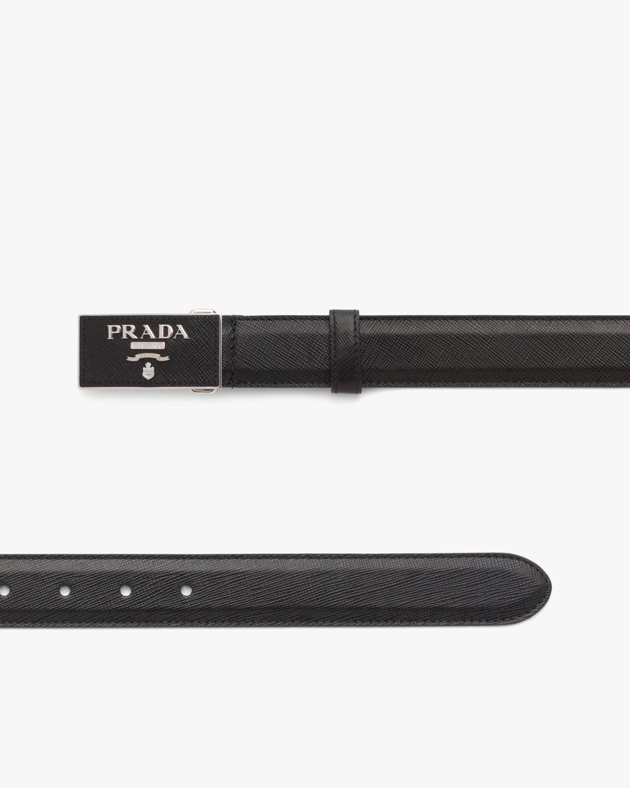This Saffiano leather belt is characterized by the metal buckle with logo.