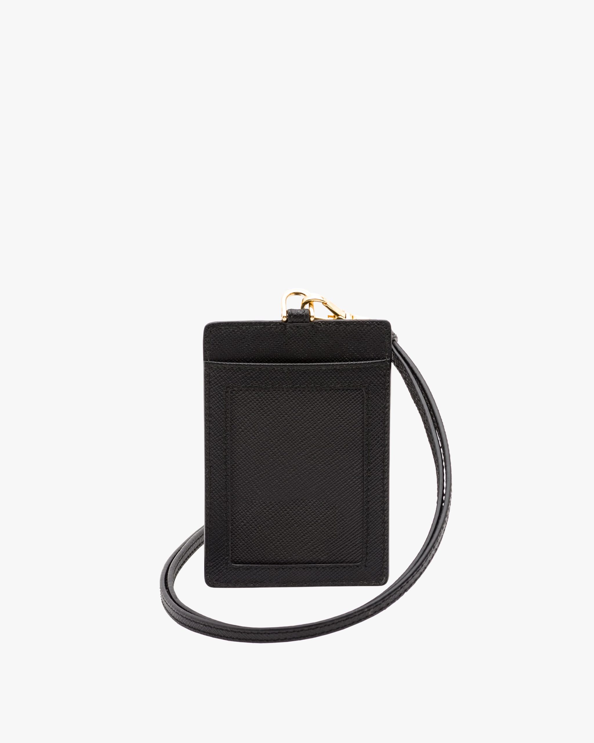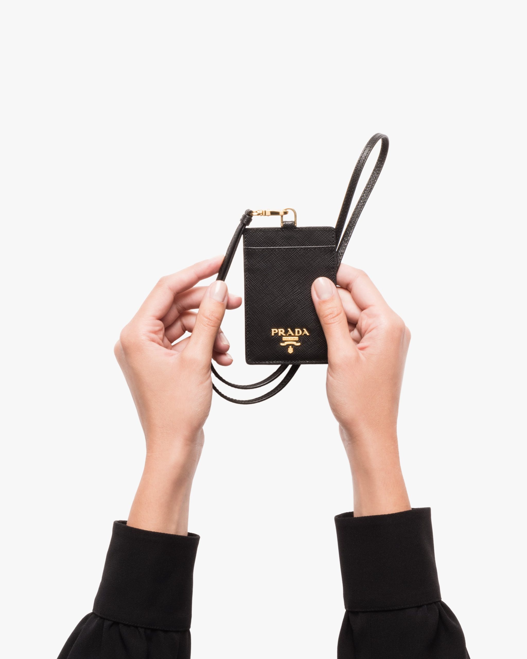 A Saffiano leather badge holder with additional slots for credit cards. The Prada logo and metal hardware is gold-toned.