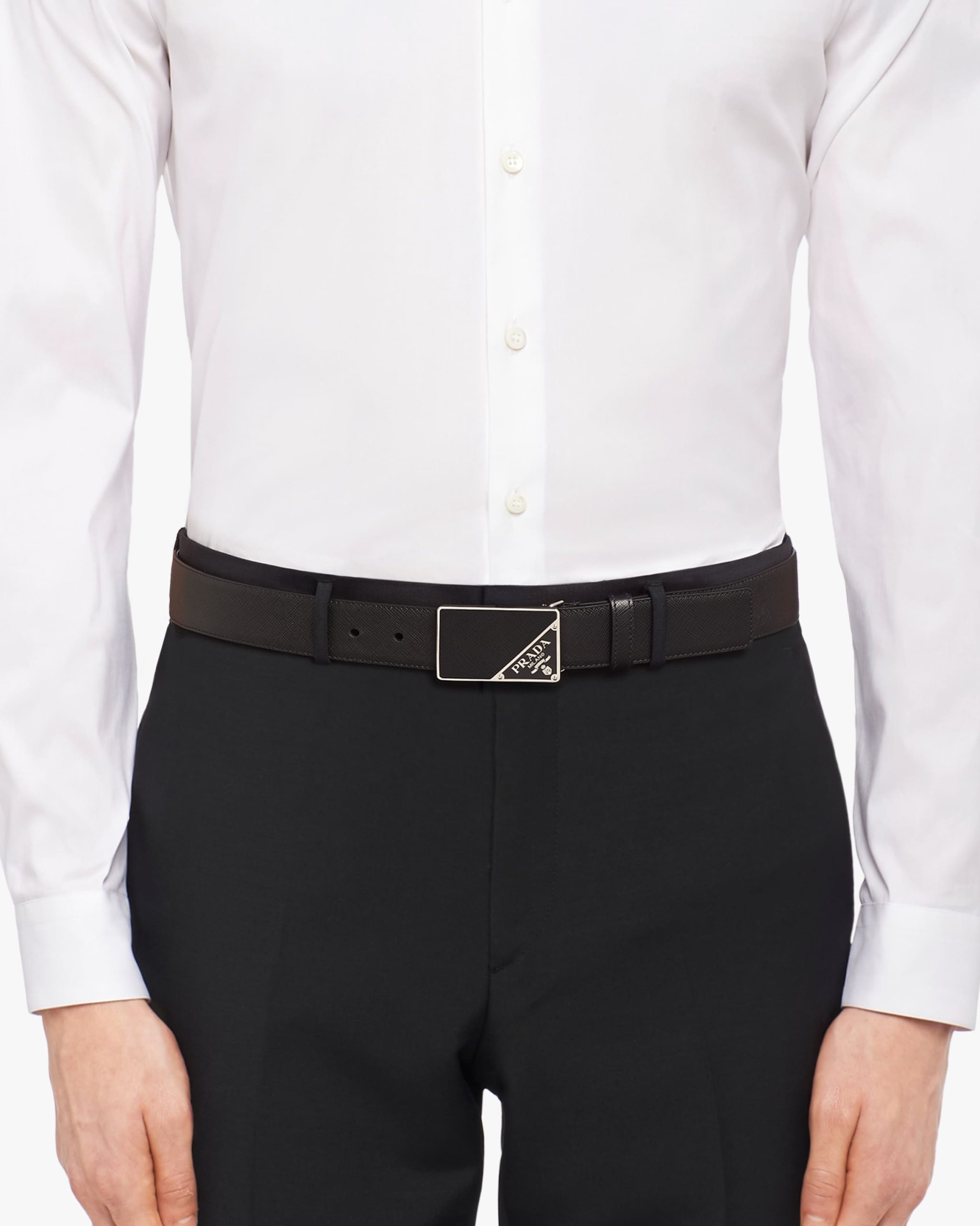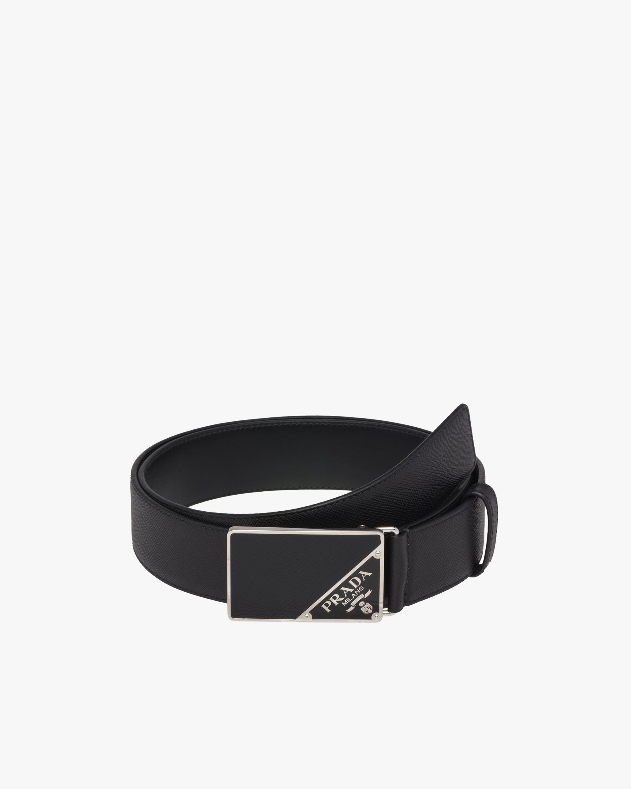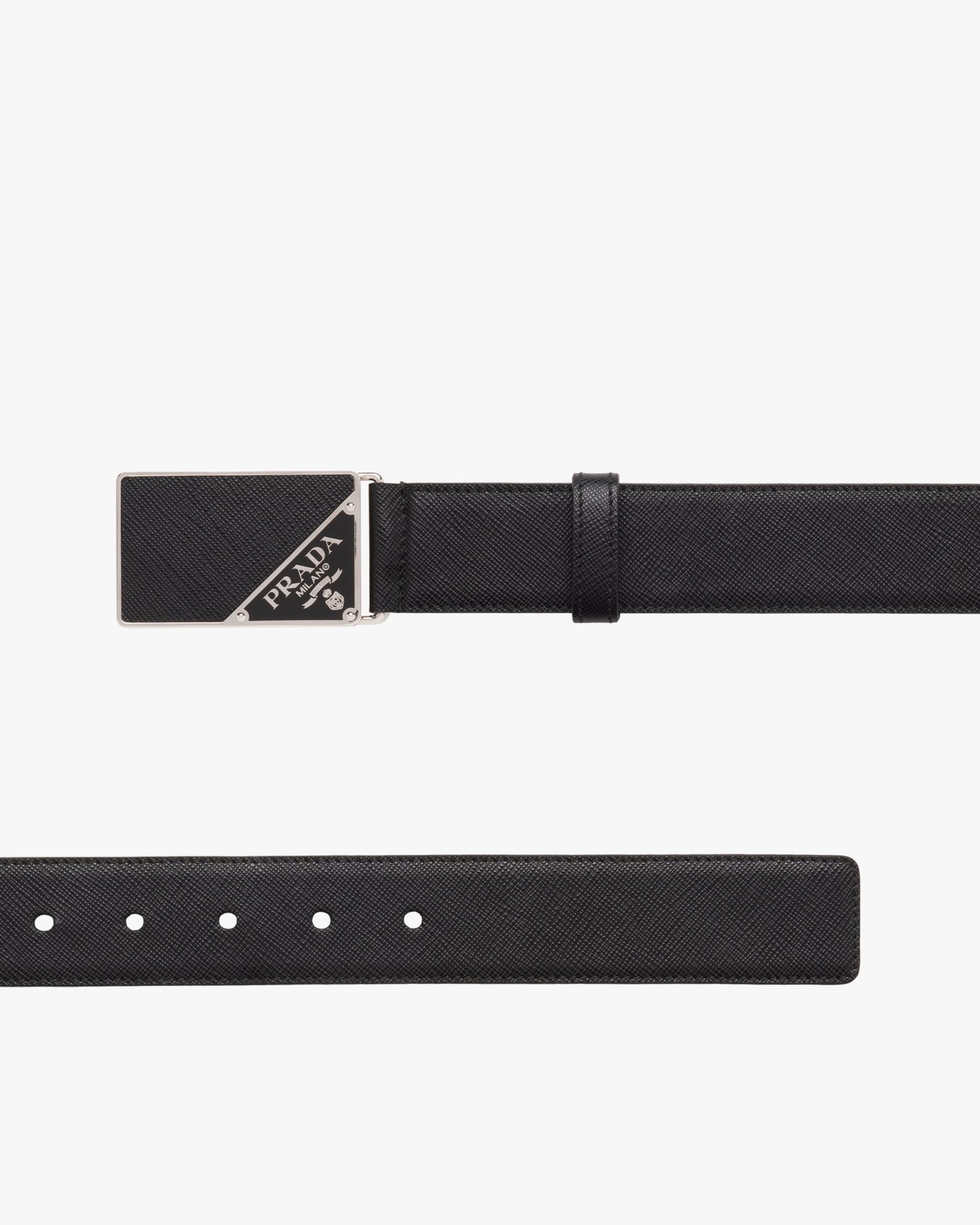 The buckle with Saffiano leather and metal details, decorated with the enameled metal triangle logo, characterizes this iconic Saffiano leather belt.