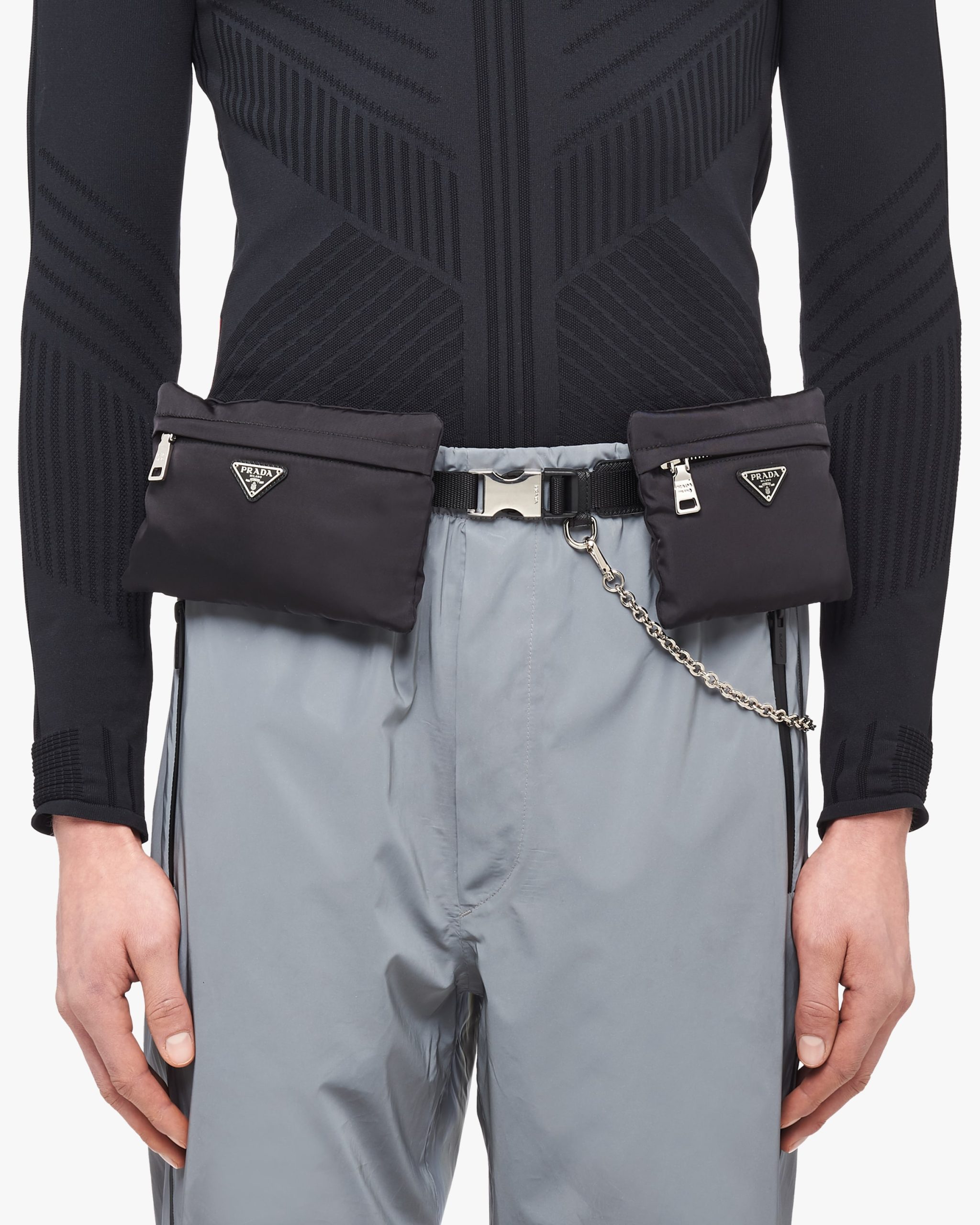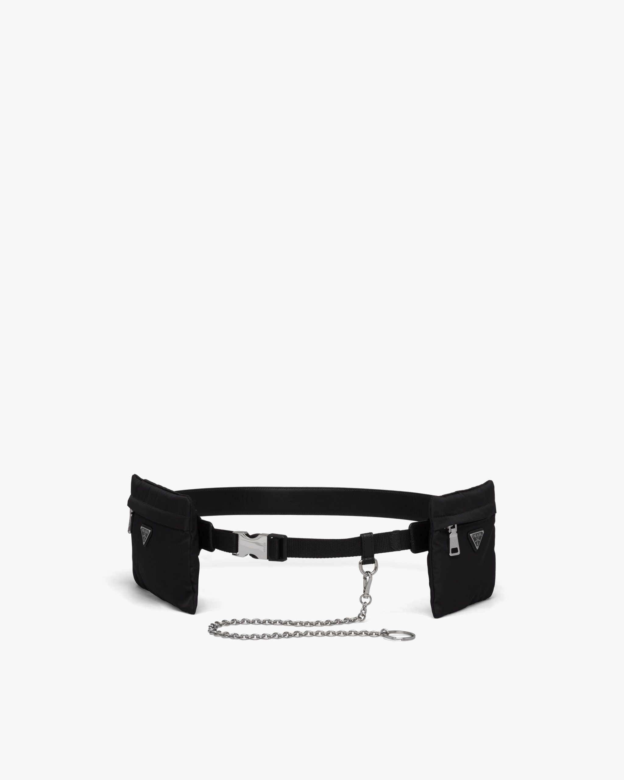 This multi-purpose Saffiano belt with a modern design has nylon pouches decorated with the triangle logo.