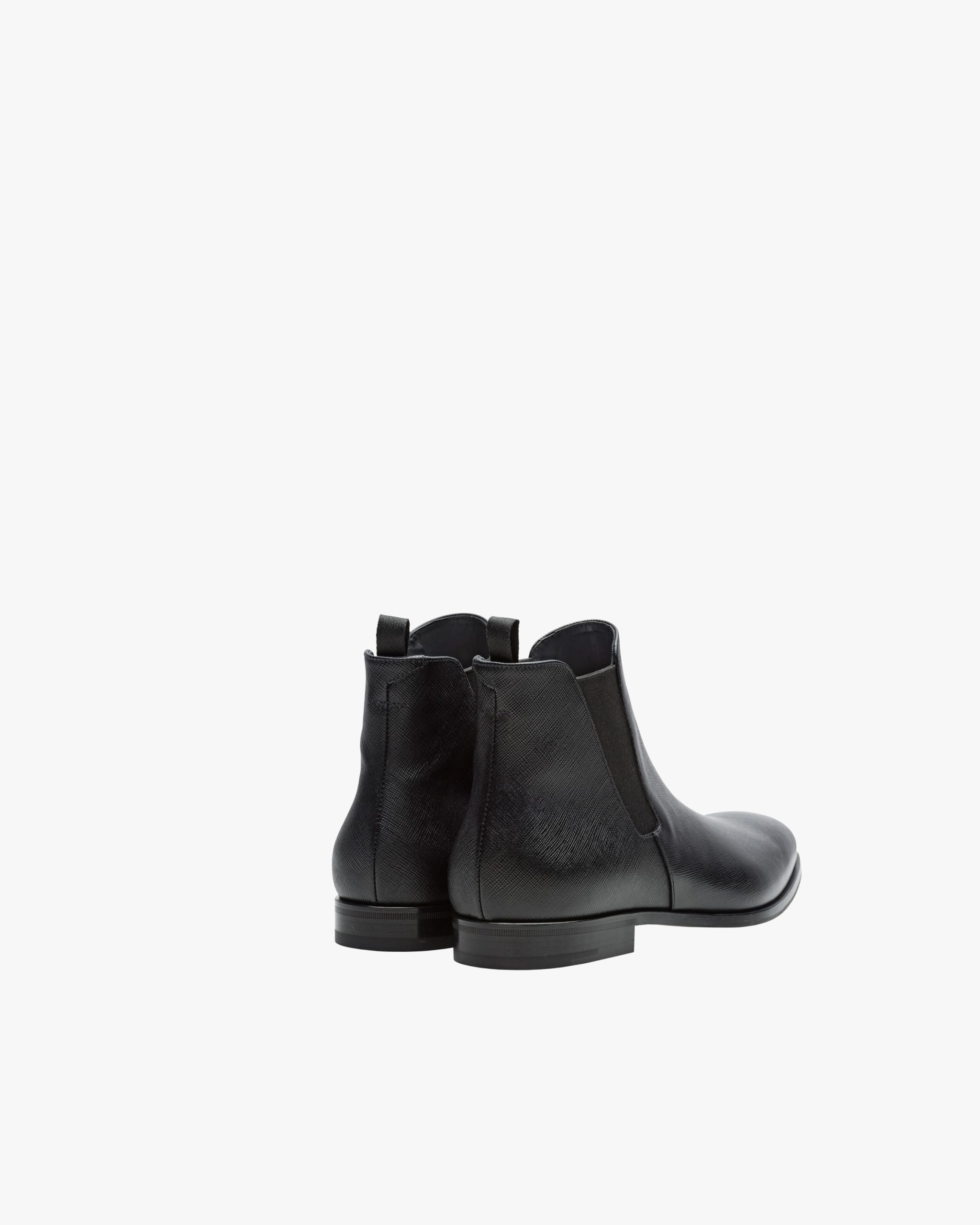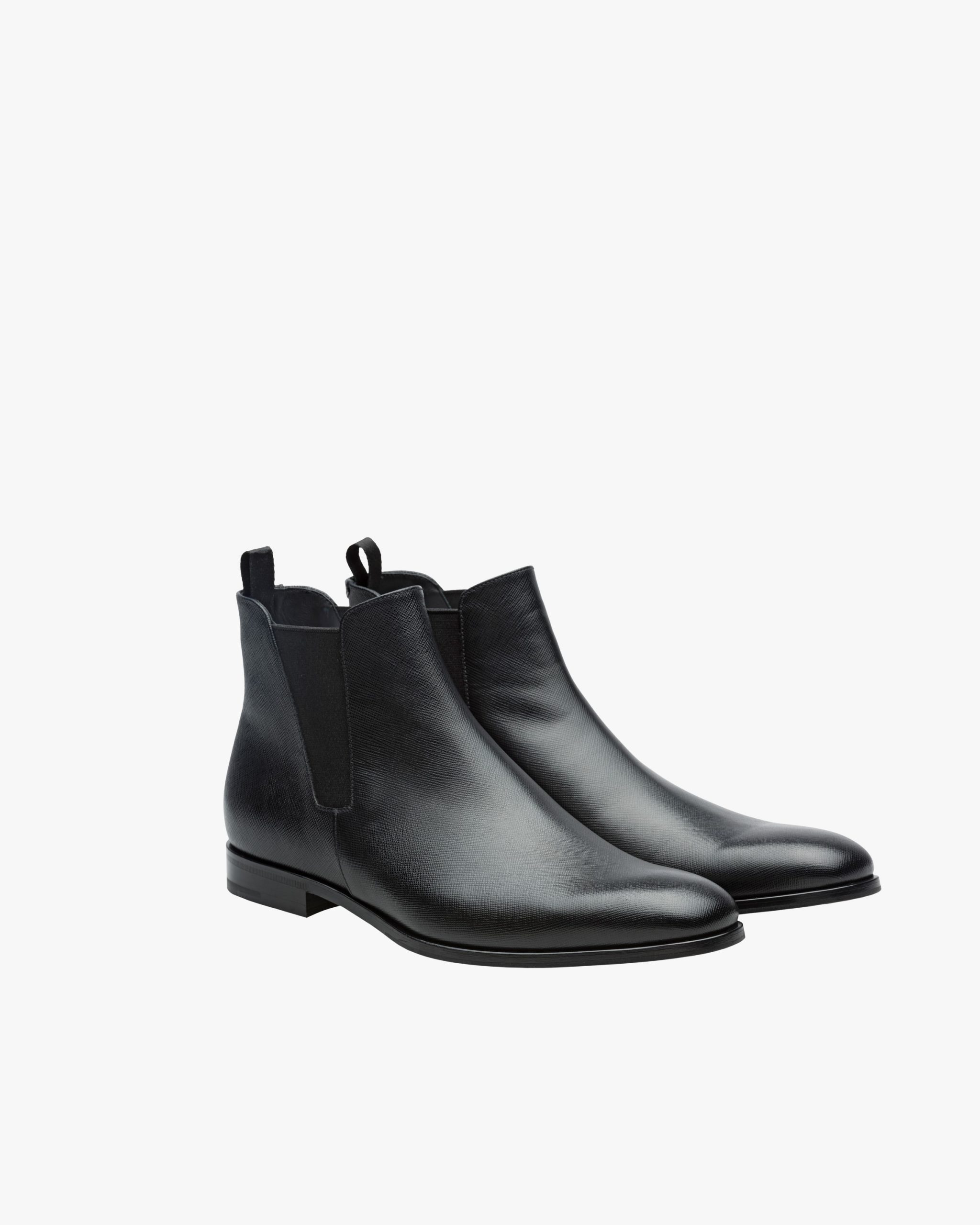 These sophisticated Saffiano leather Chelsea boots have a tapered silhouette and distinctive elasticized side gussets. The leather sole has a non-slip rubber half-sole.