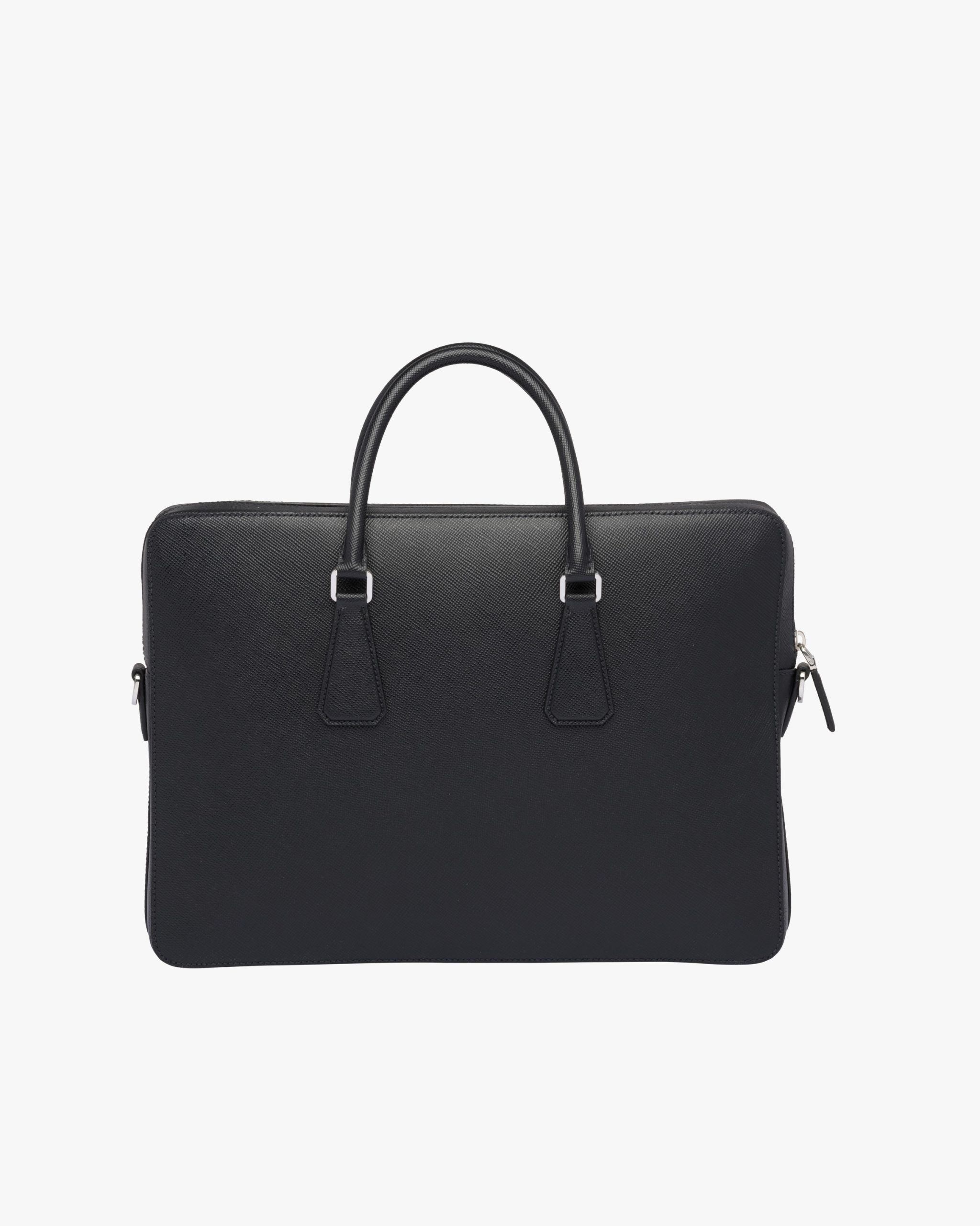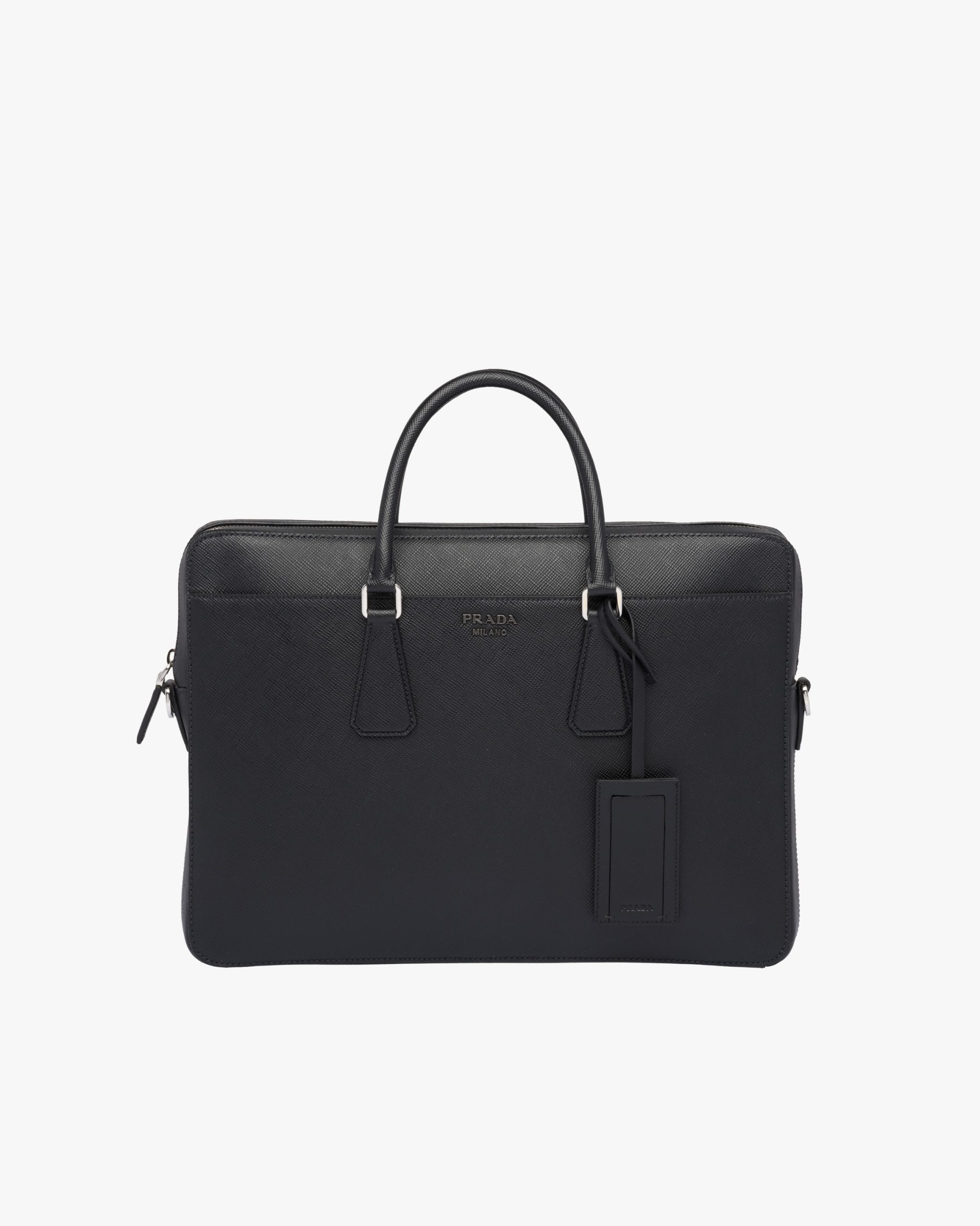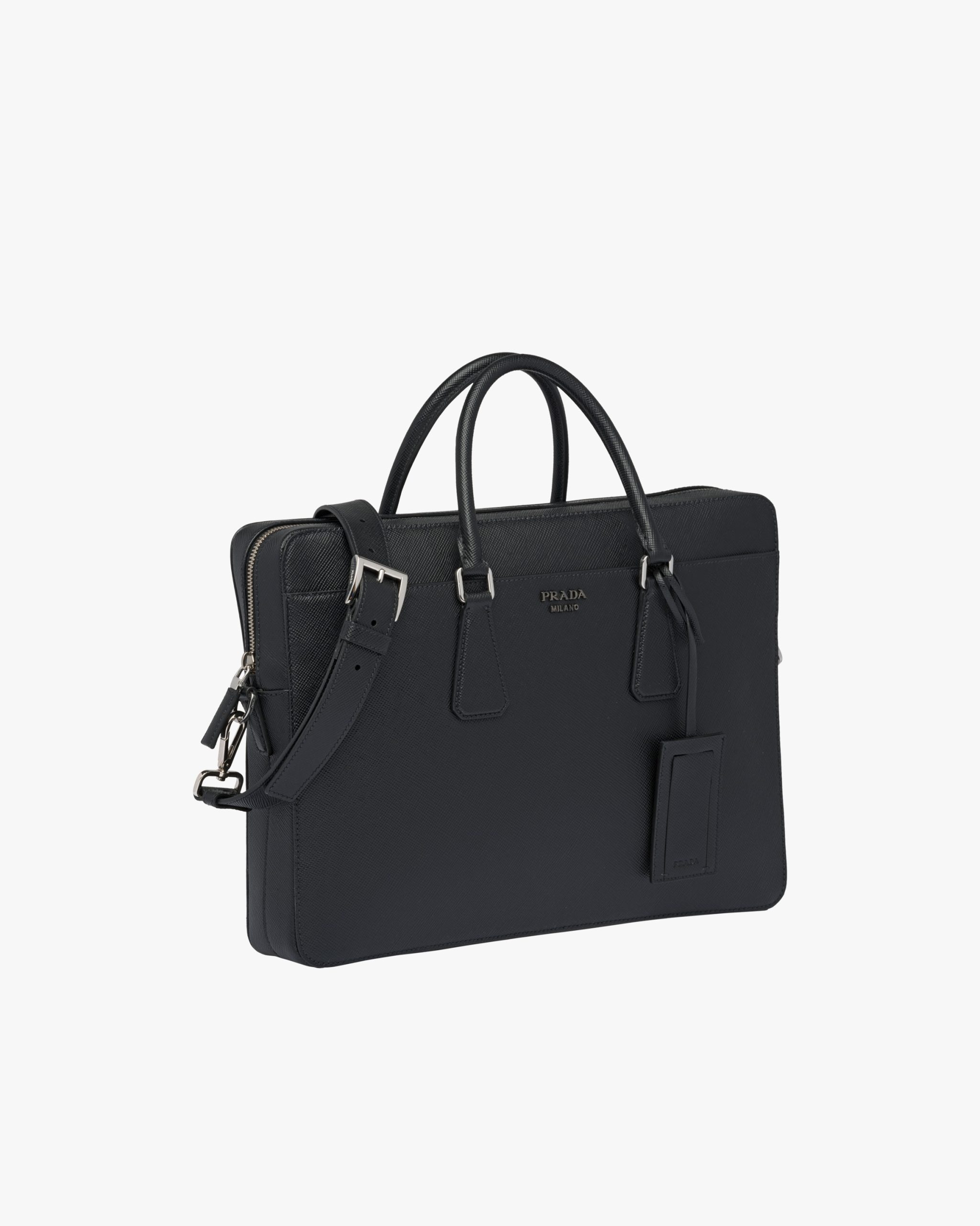 The iconic texture of Saffiano Cuir leather defines this elegant briefcase with metal hardware. Its refined lines are completed by the front pocket. The shoulder strap is detachable.