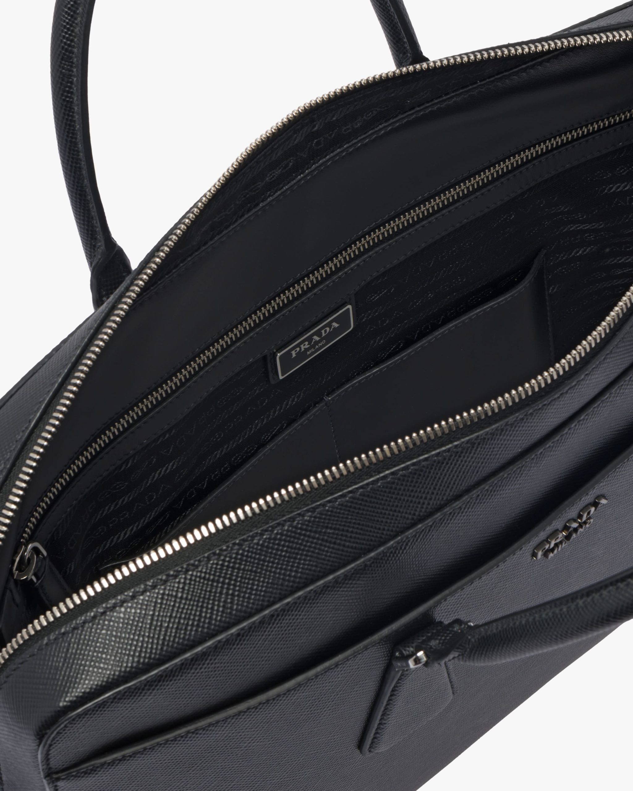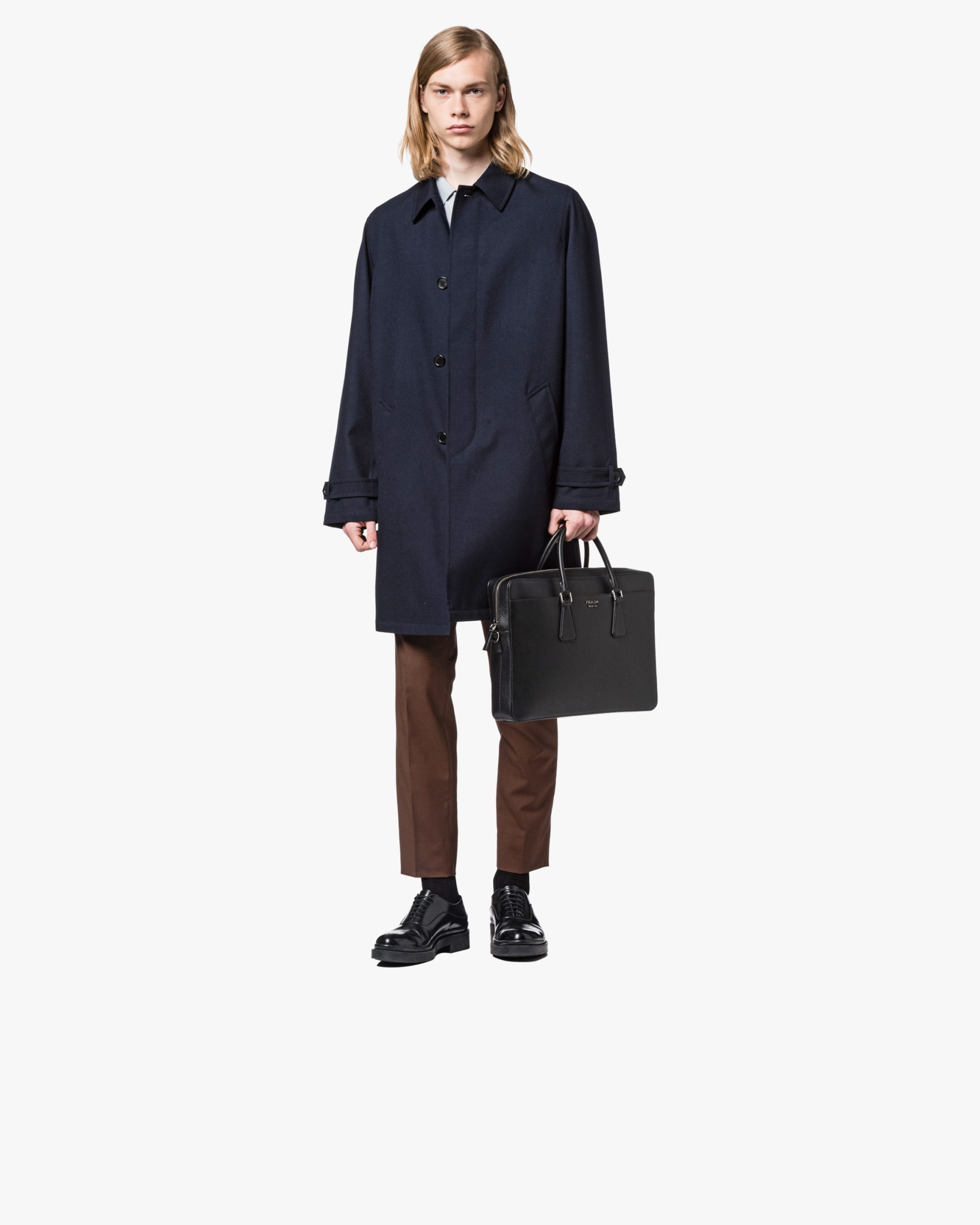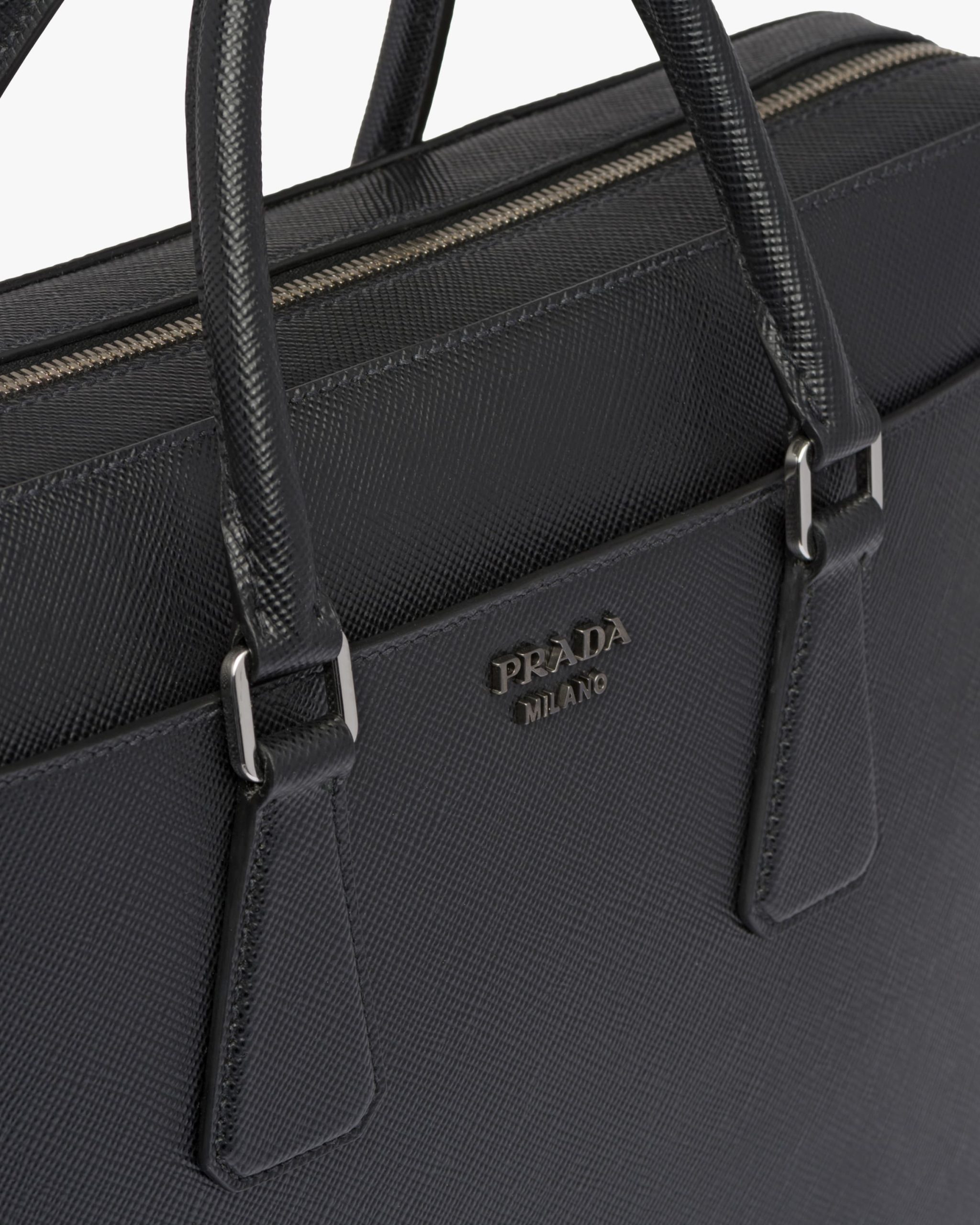 The iconic texture of Saffiano Cuir leather defines this elegant briefcase with metal hardware. Its refined lines are completed by the front pocket. The shoulder strap is detachable.