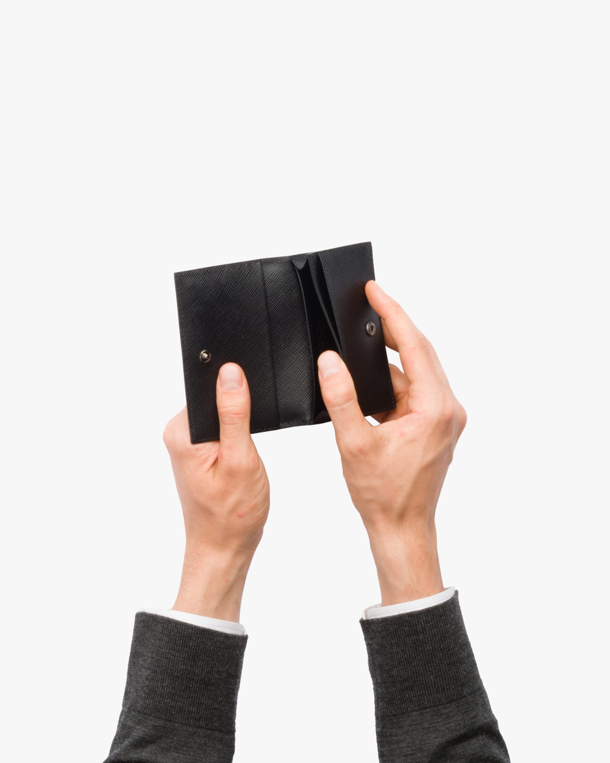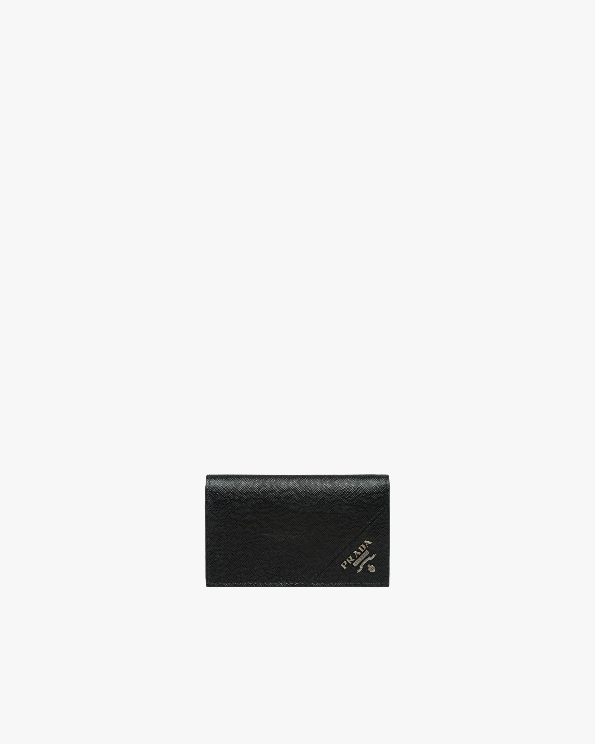 This Saffiano leather credit card holder is detailed with a Prada logo in the bottom corner. One main compartment with bellow and three compartments are revealed by the snap closure.