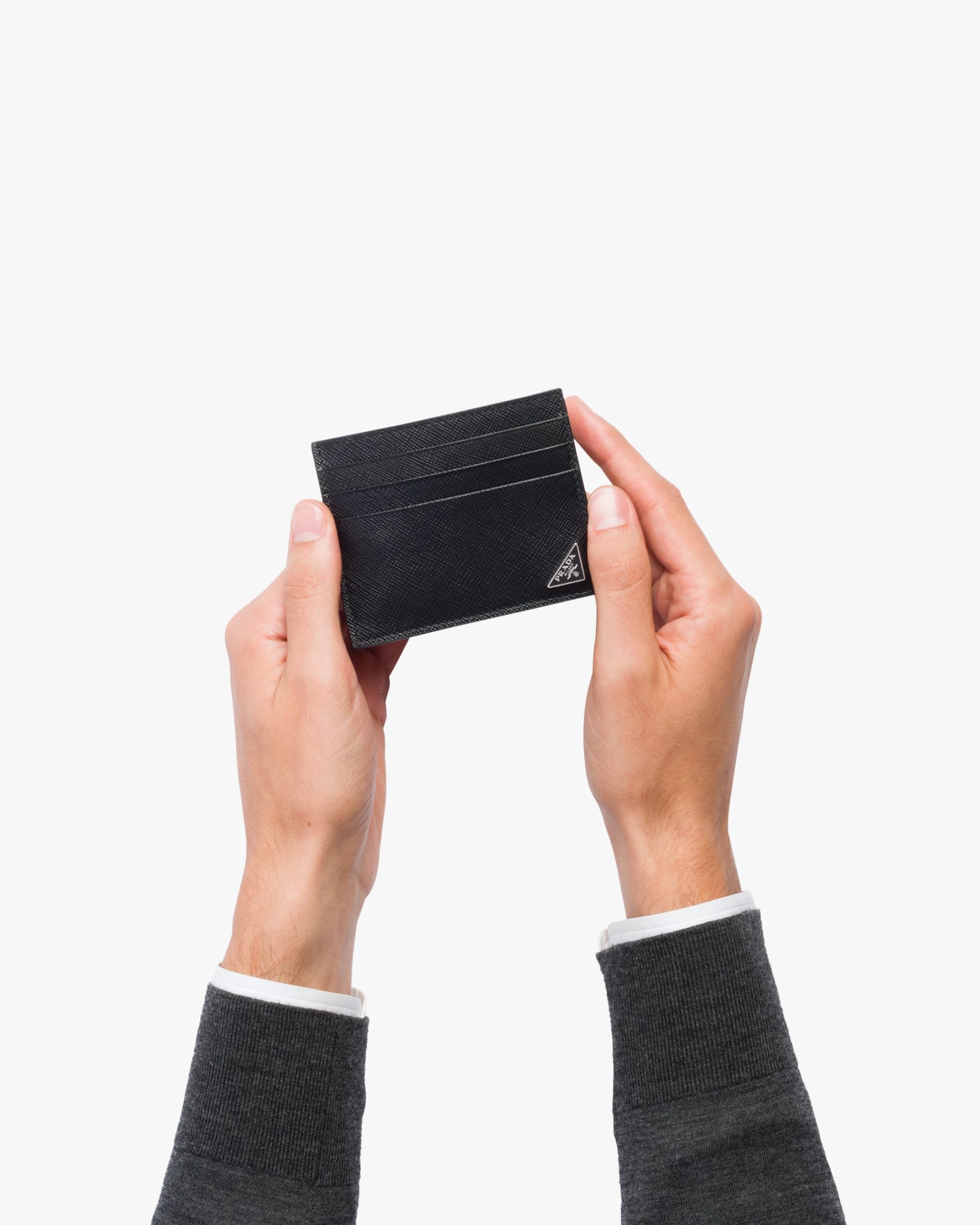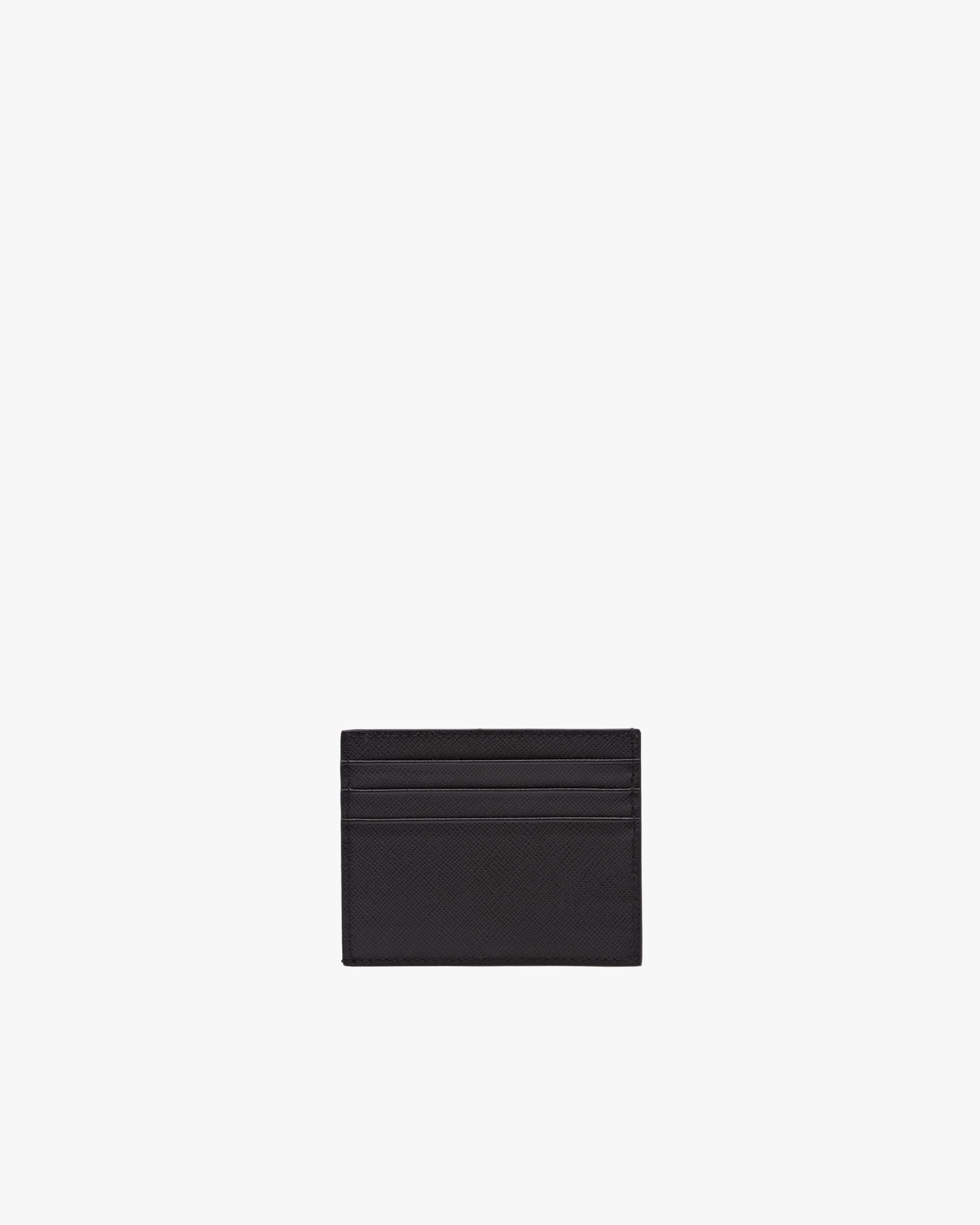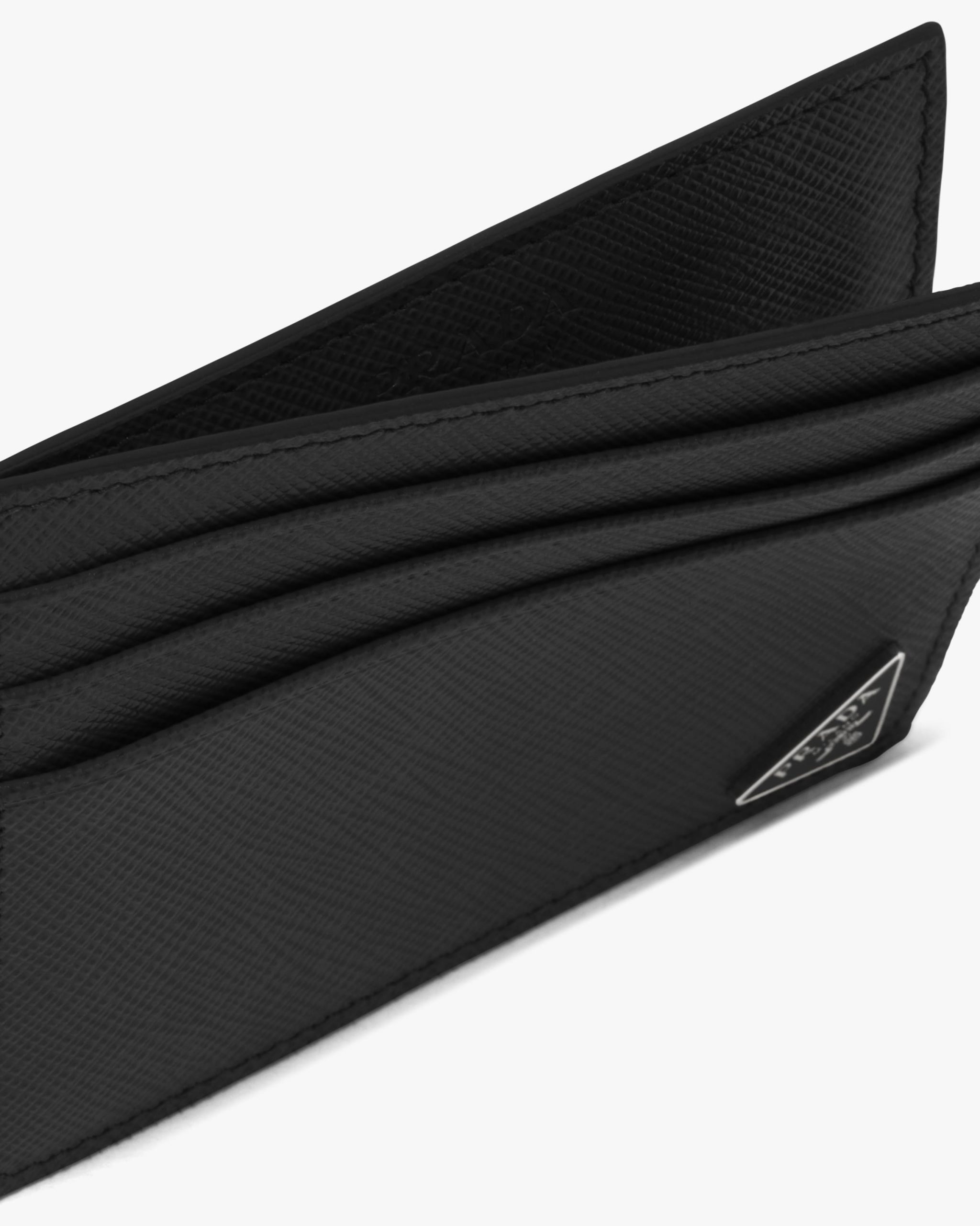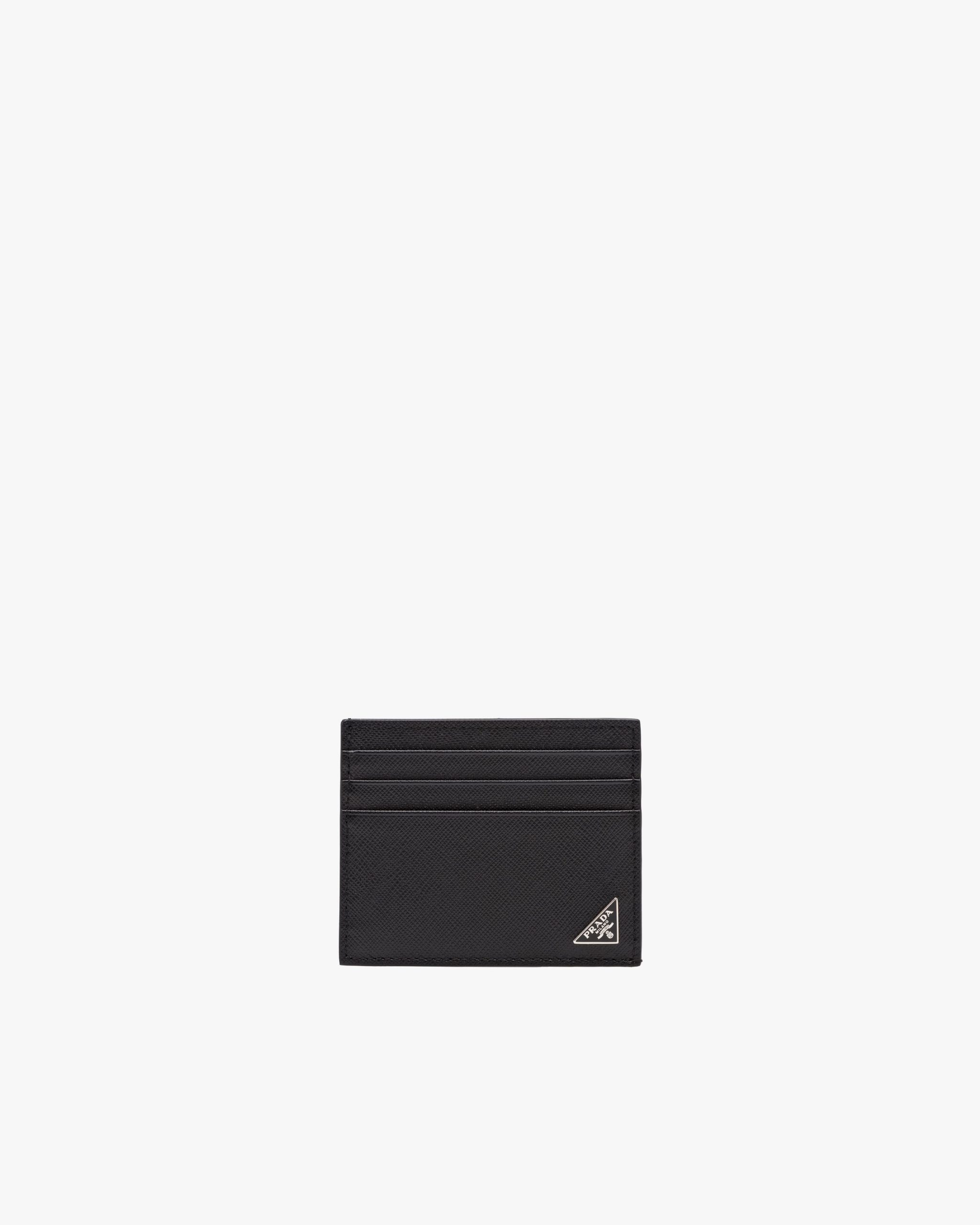 A Saffiano leather credit card holder with slots for six cards. It also has a center pocket, fabric lining and is set off by the Prada triangle logo in enamel on the bottom corner.