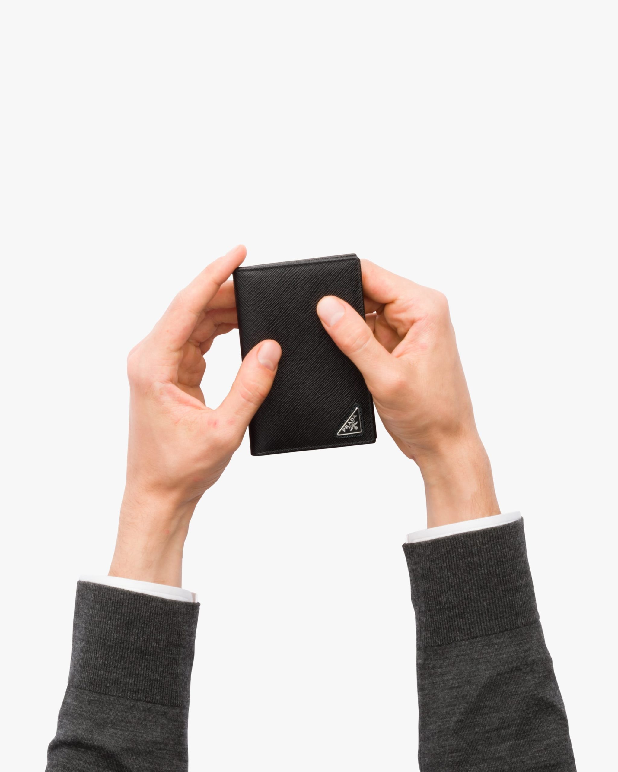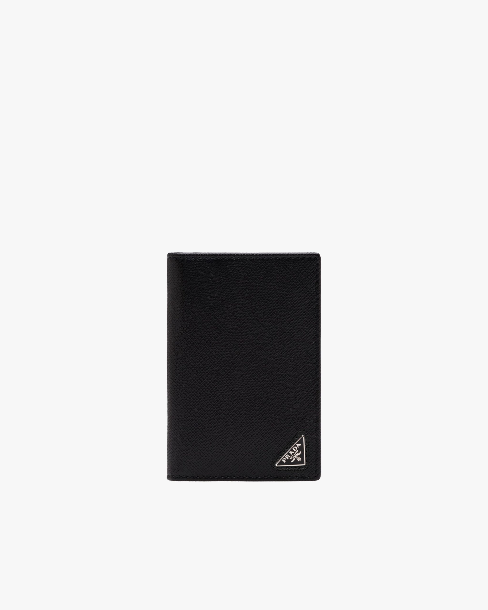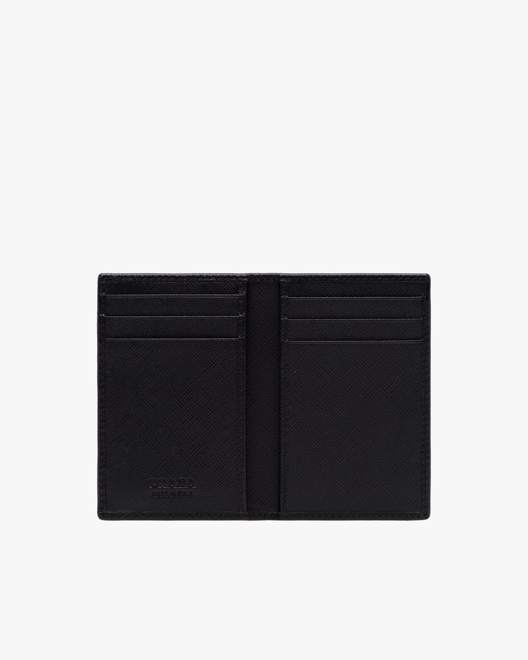 A monotone Saffiano leather credit card holder with triangular Prada logo in the corner. Inside contains six credit card slots, two pockets and a heat-embossed Prada logo.