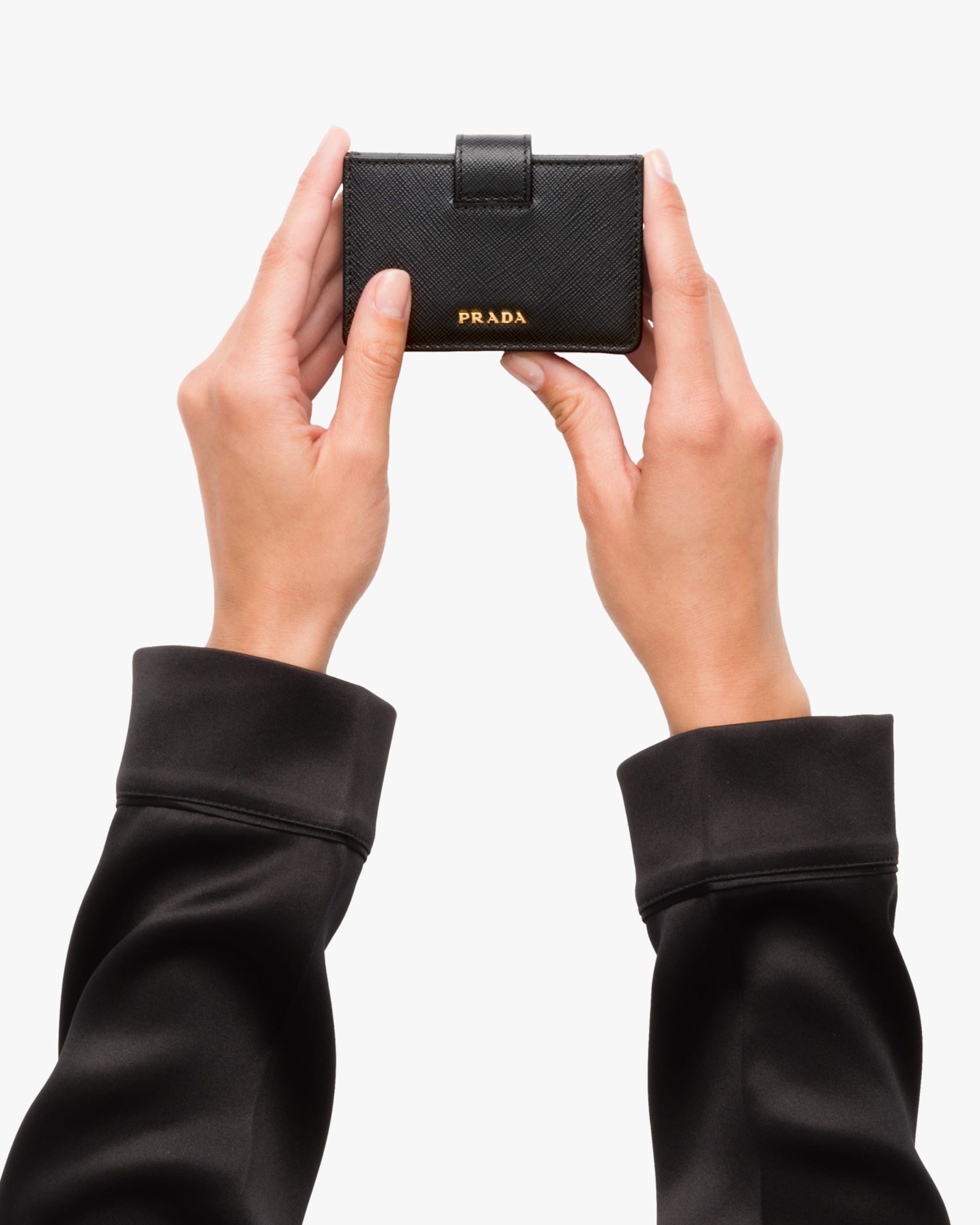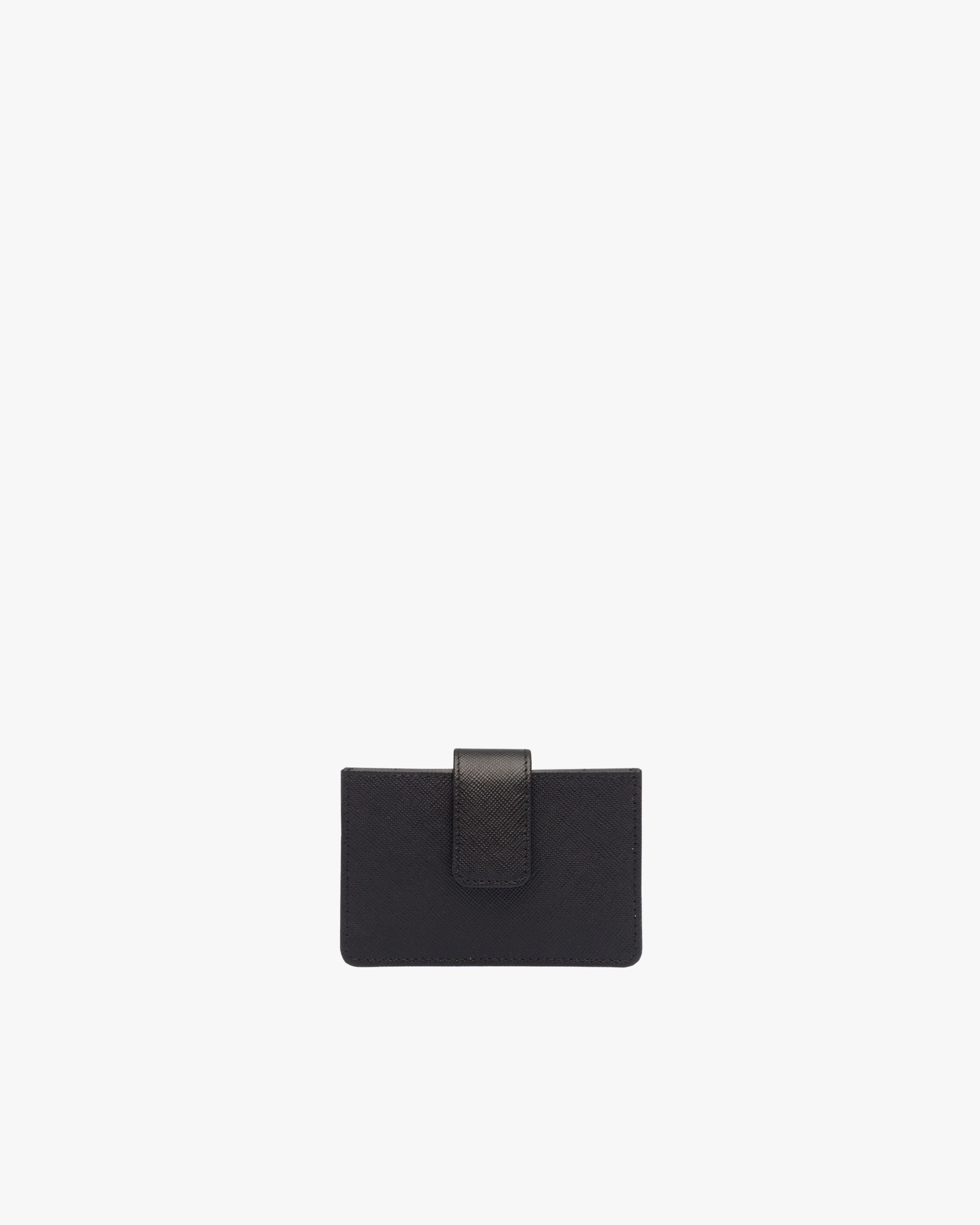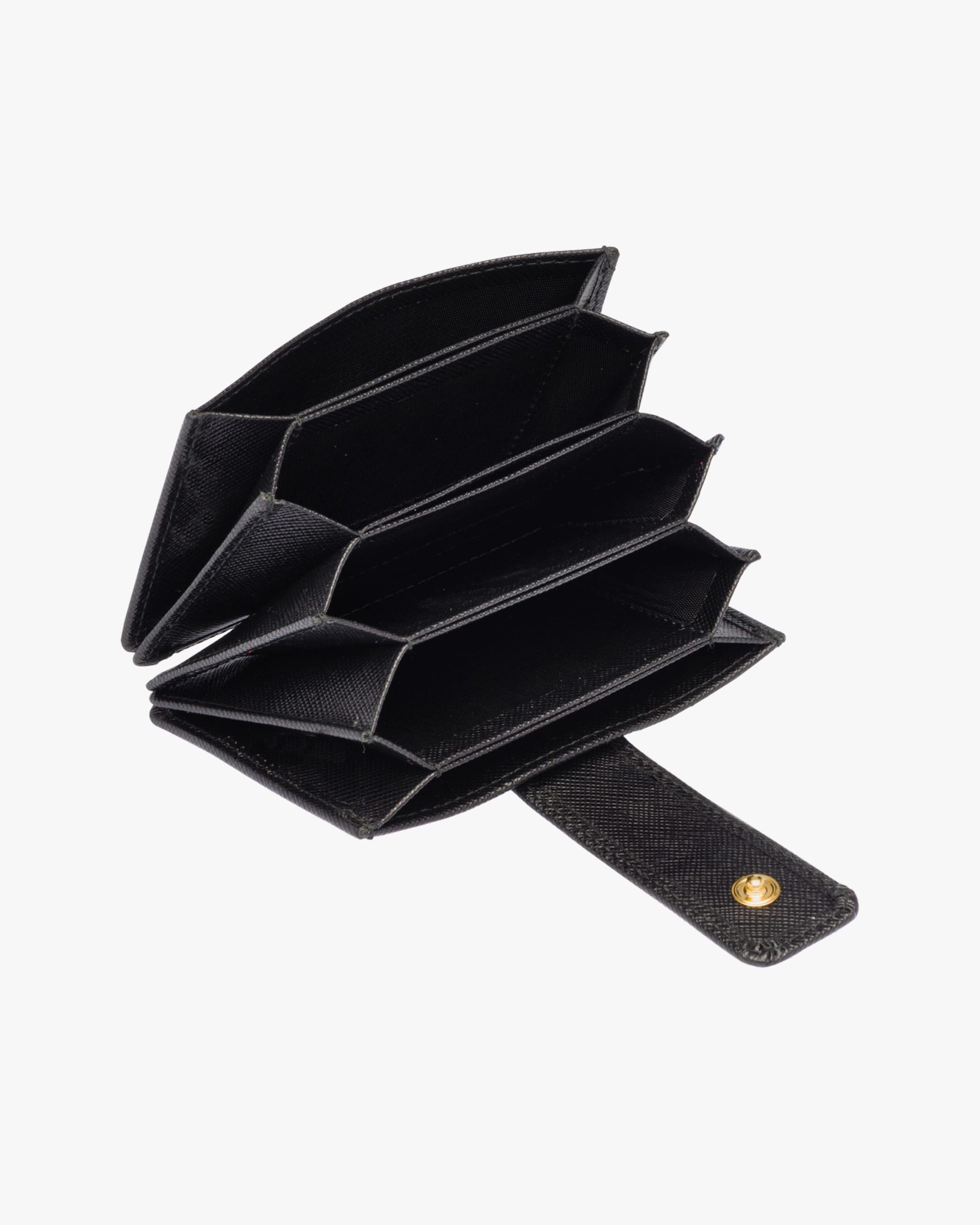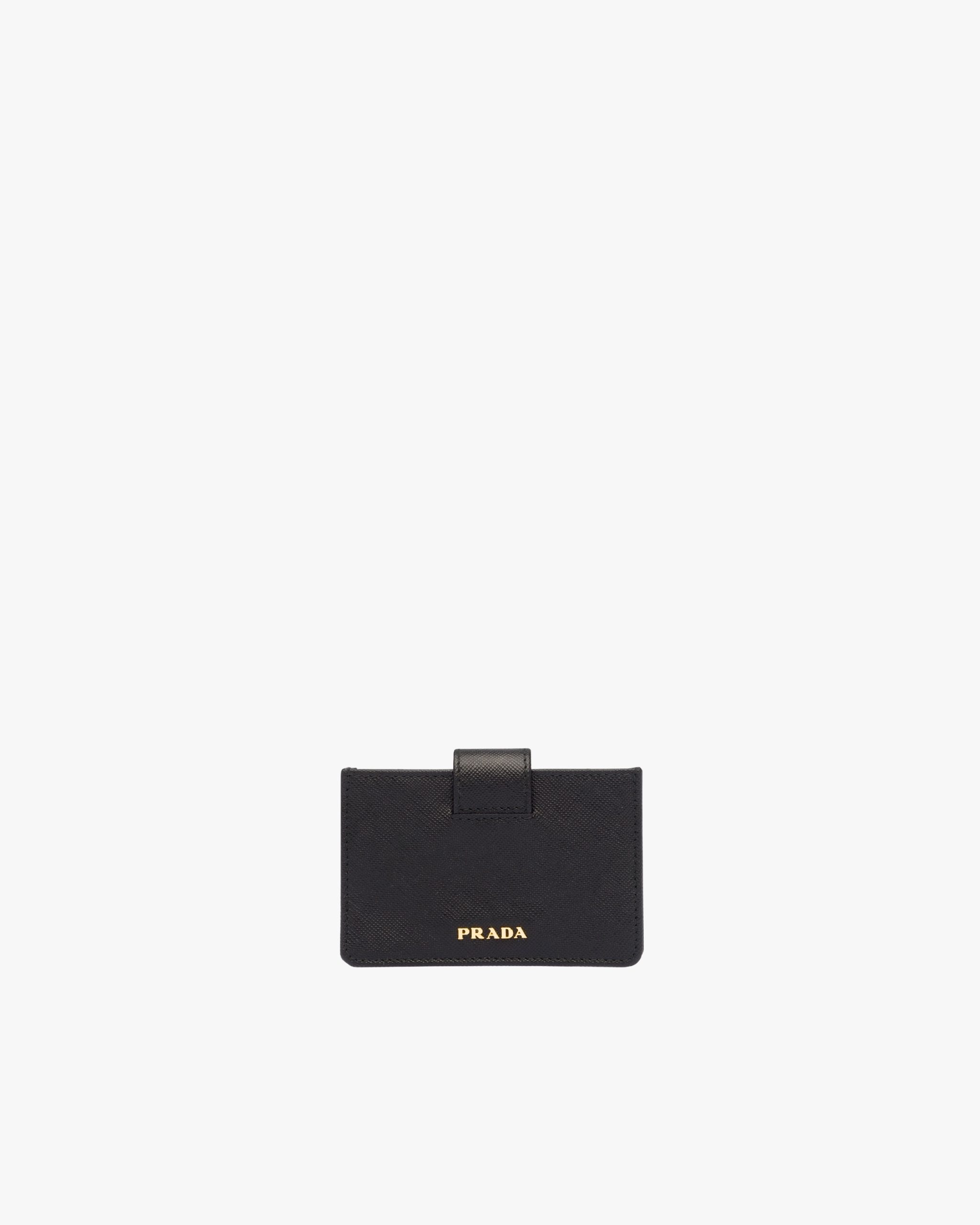 A Saffiano leather wallet with gold-finish Prada lettering. The snap closure releases from the back, giving way to five slots with bellow sides for credit cards or tickets.