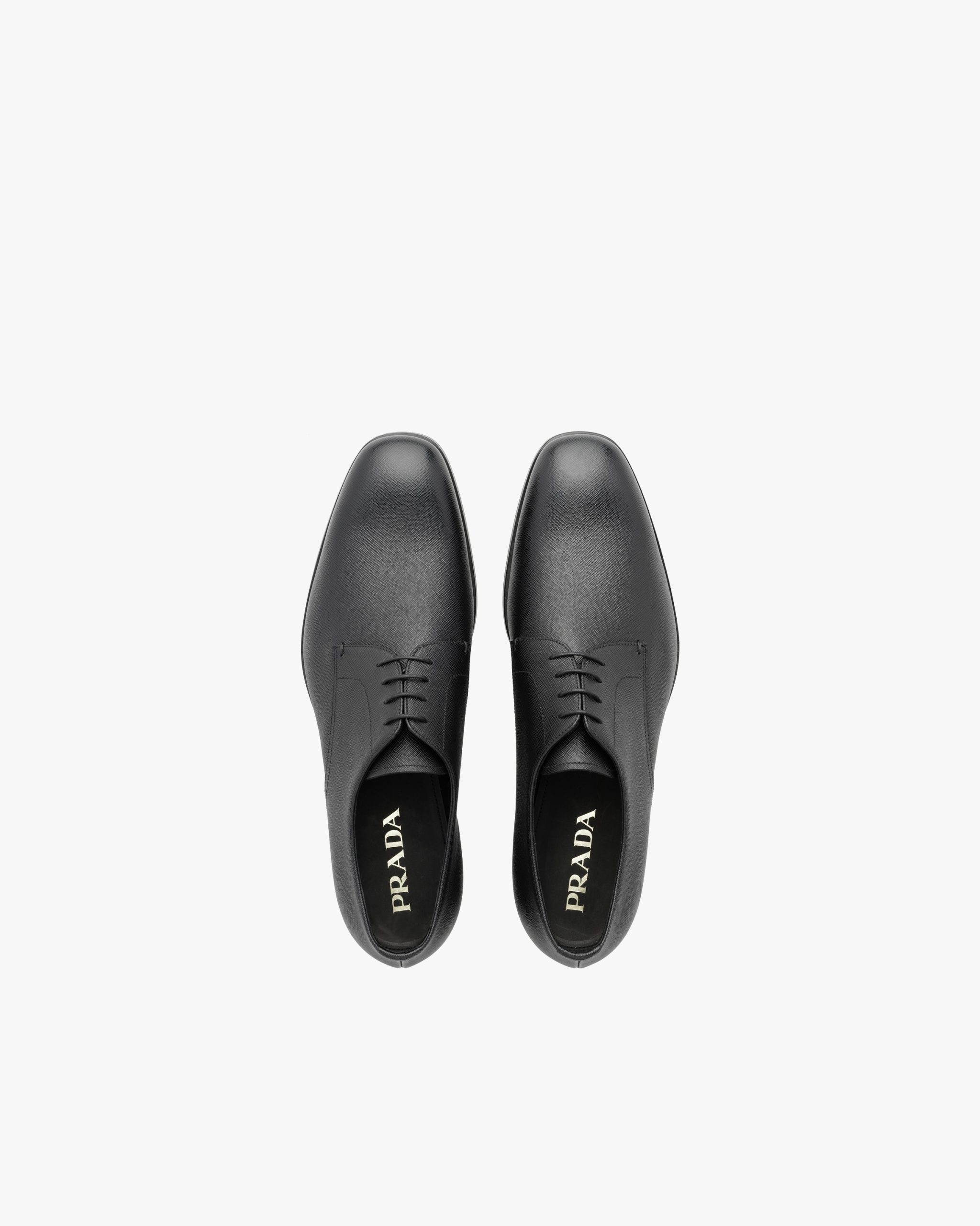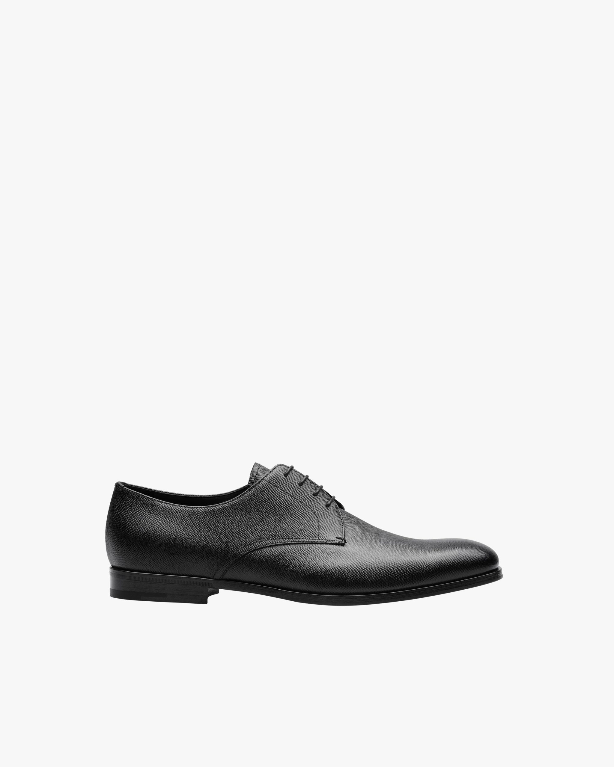 These Saffiano leather derby shoes with their sleek, clean design stand out for their unique texture. They have a leather sole with non-slip rubber half-sole.