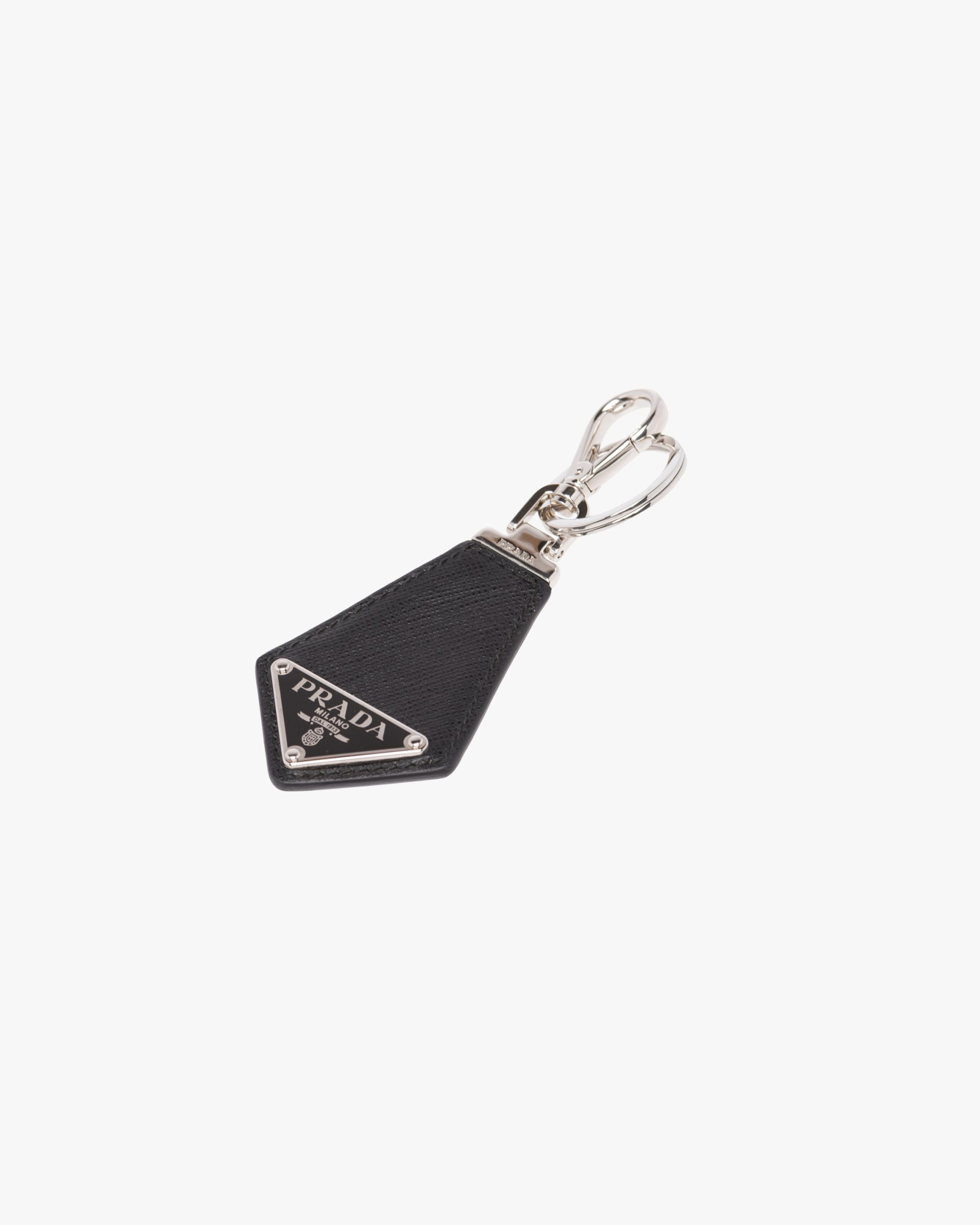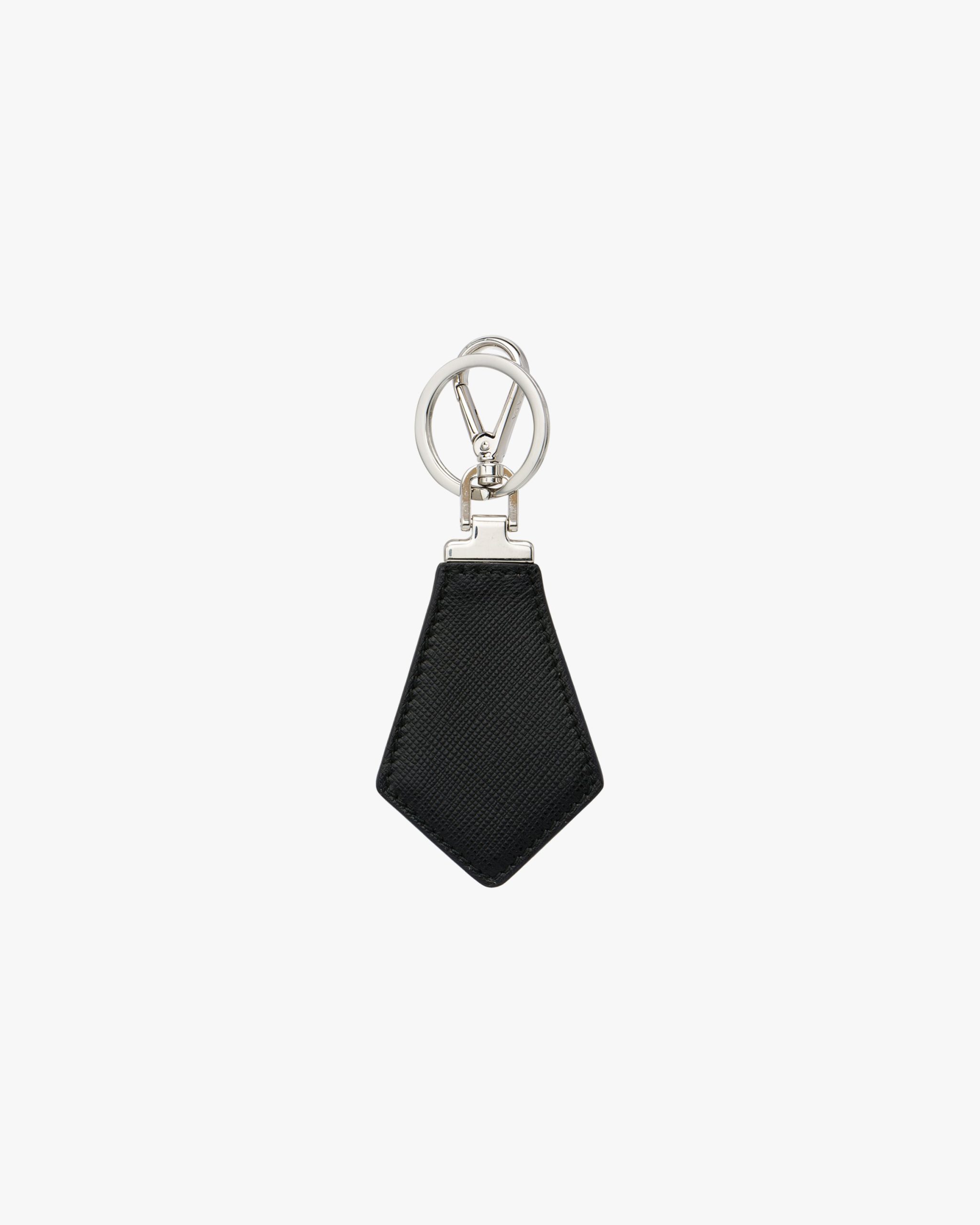 This elegant keychain is built from Saffiano leather in the shape of a tie. Embellished with the triangular Prada logo, it offers a hook and split ring for attaching keys.