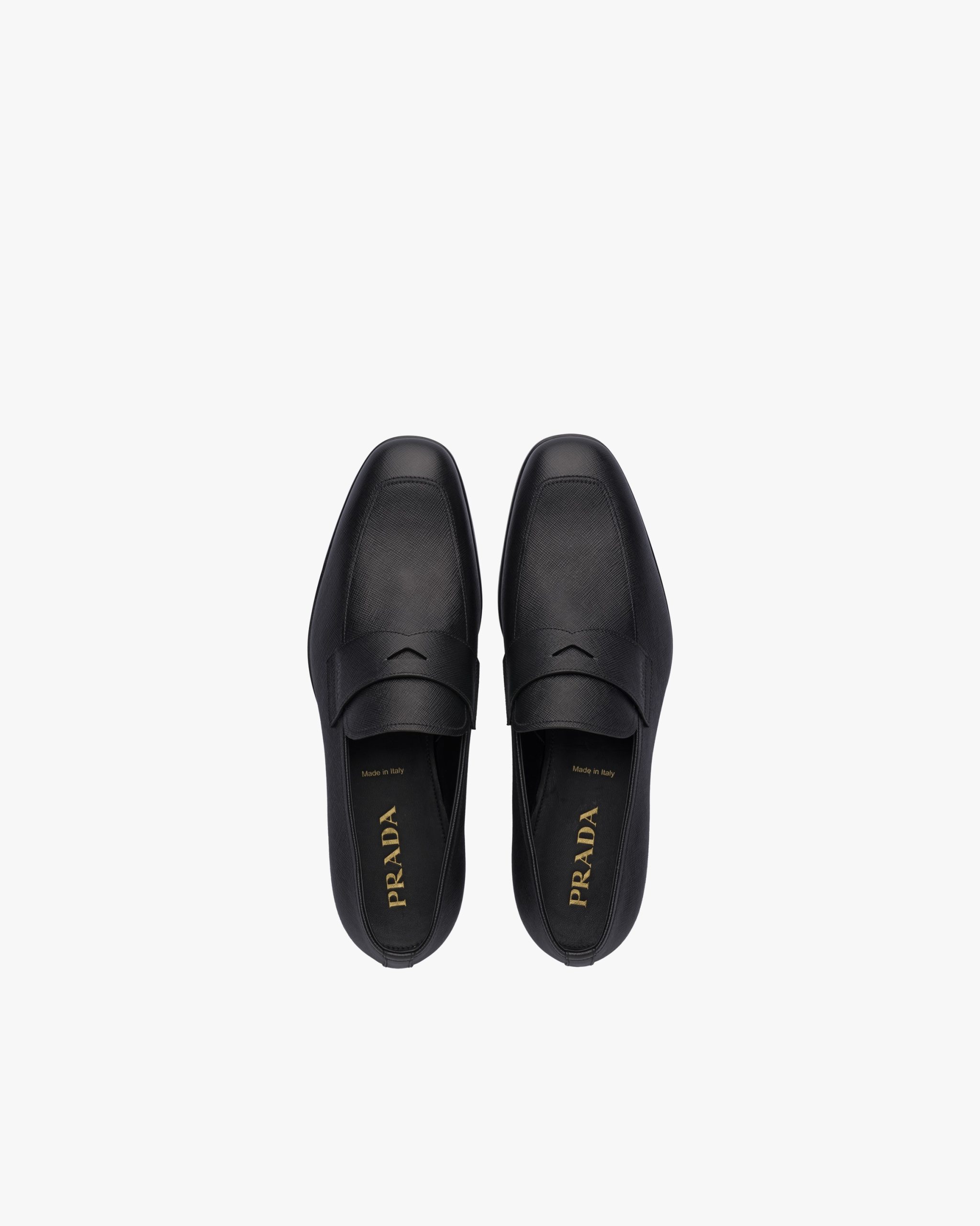 The Saffiano motif gives the most classic men’s shoe style contemporary allure. The loafers are decorated with the Prada logo hot-stamped on the apron.
