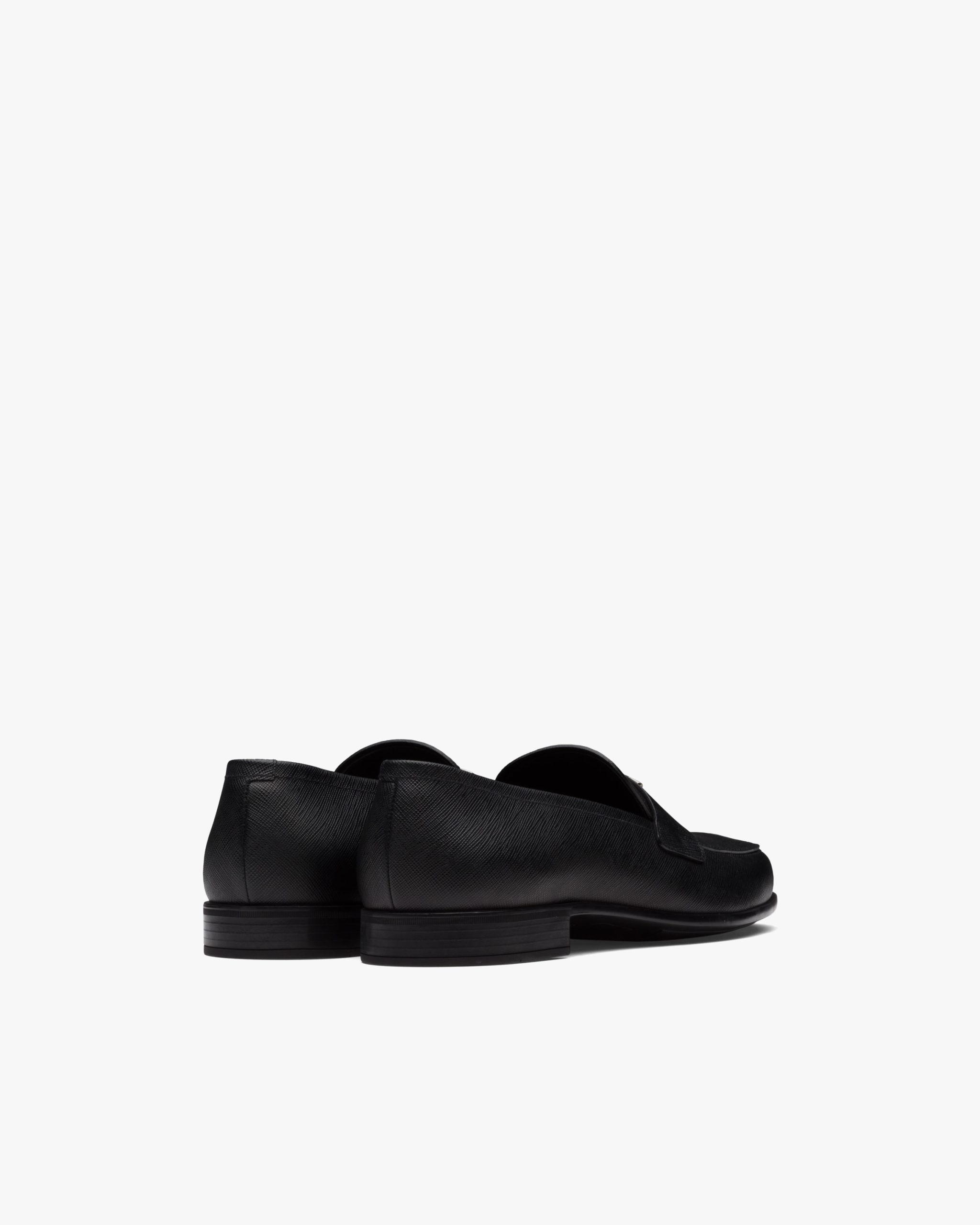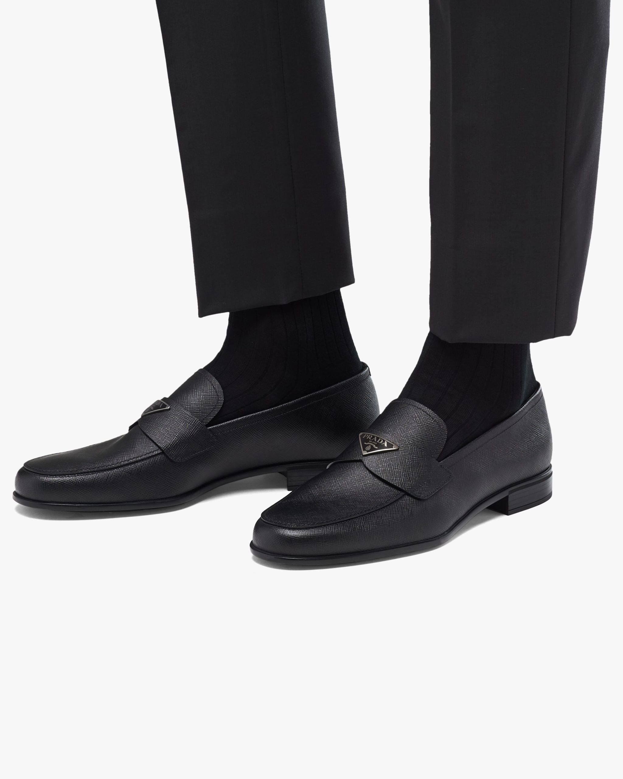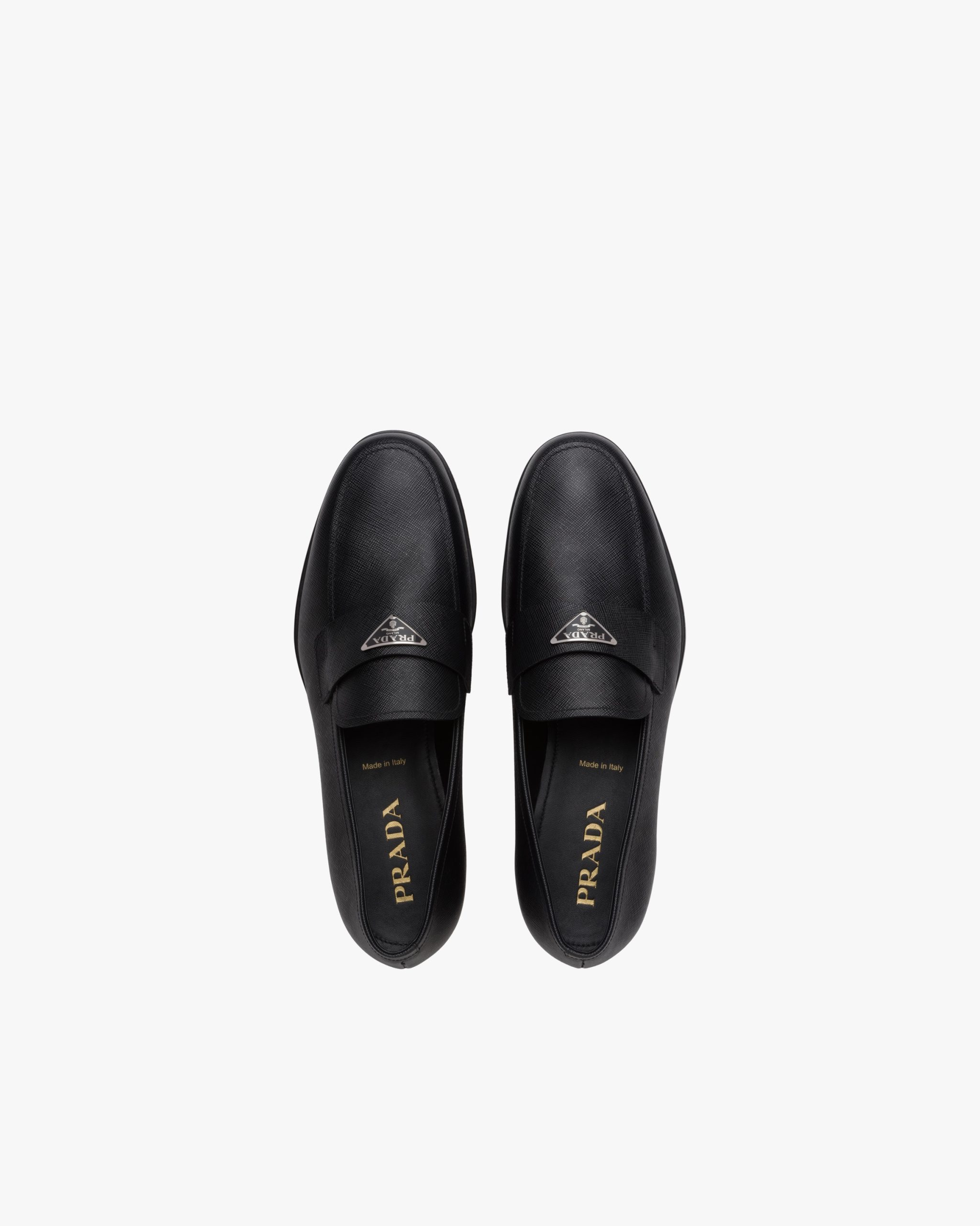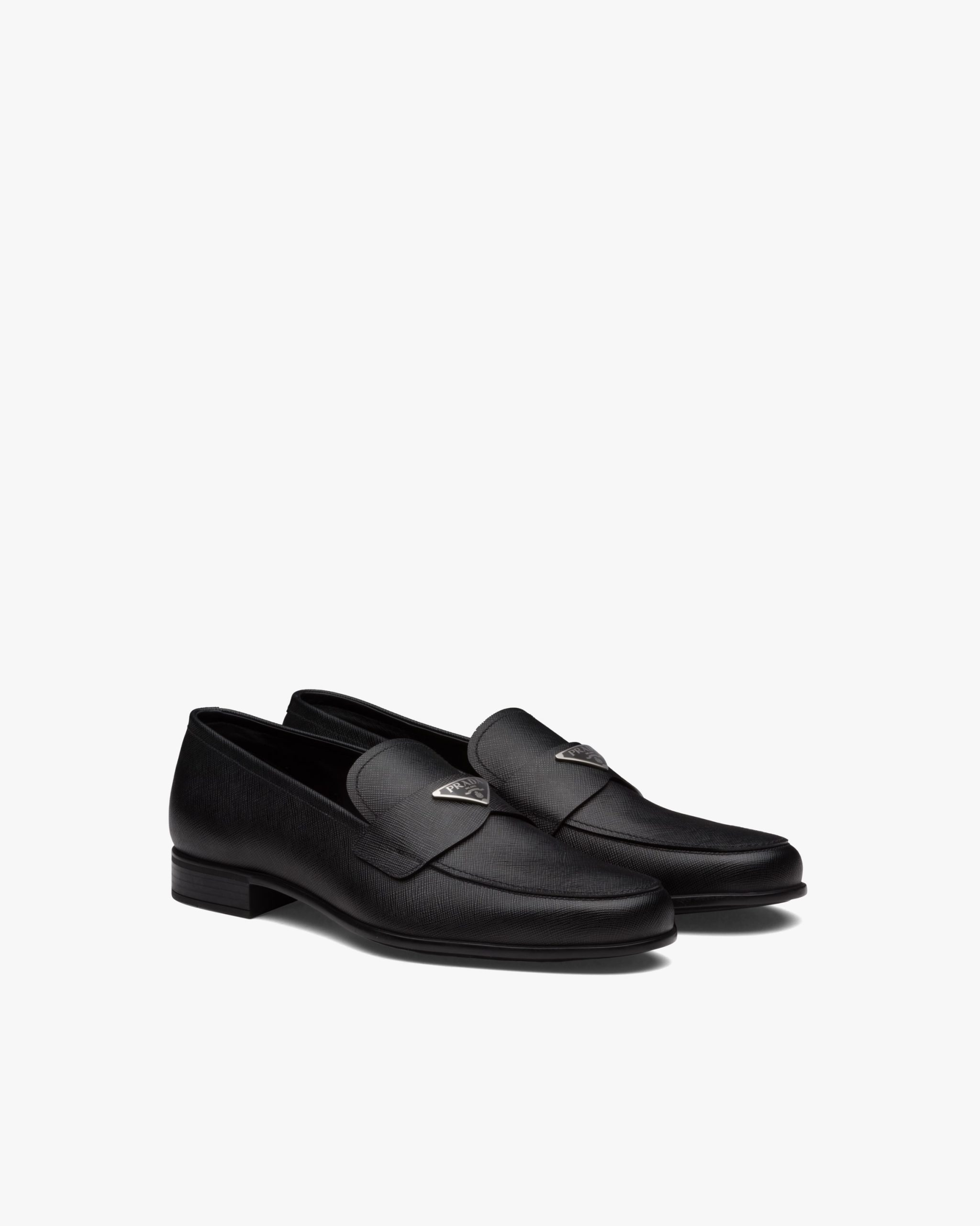These loafers made of iconic Saffiano leather are characterized by the triangle logo on the saddle strap.