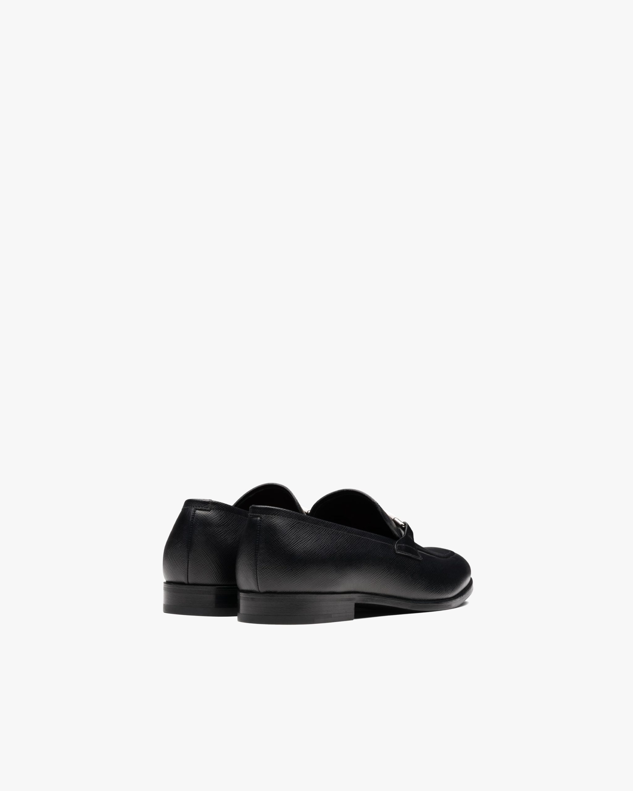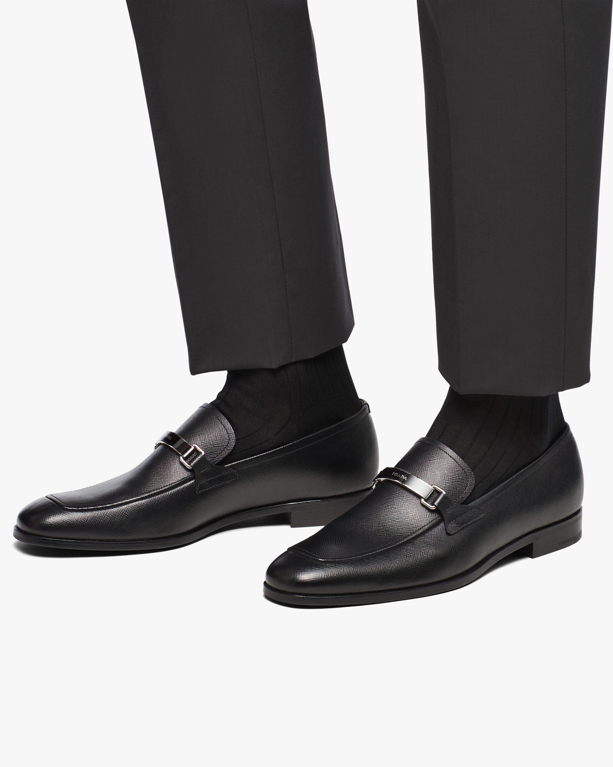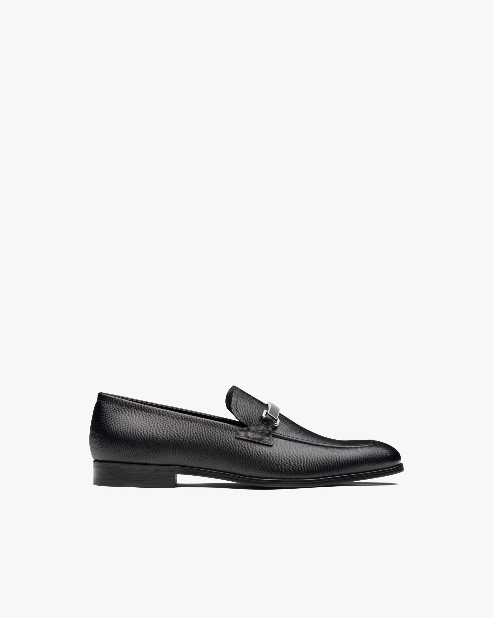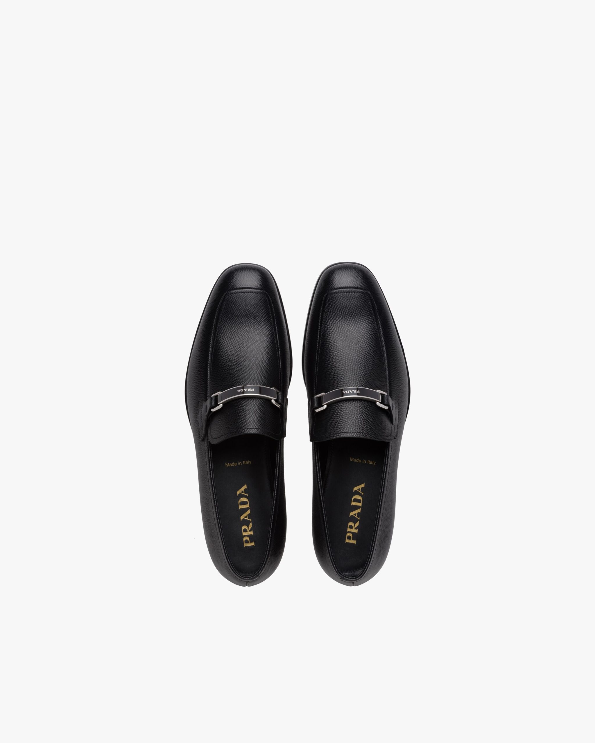Made of iconic Saffiano leather, these loafers are characterized by the logo on the front metal tag.