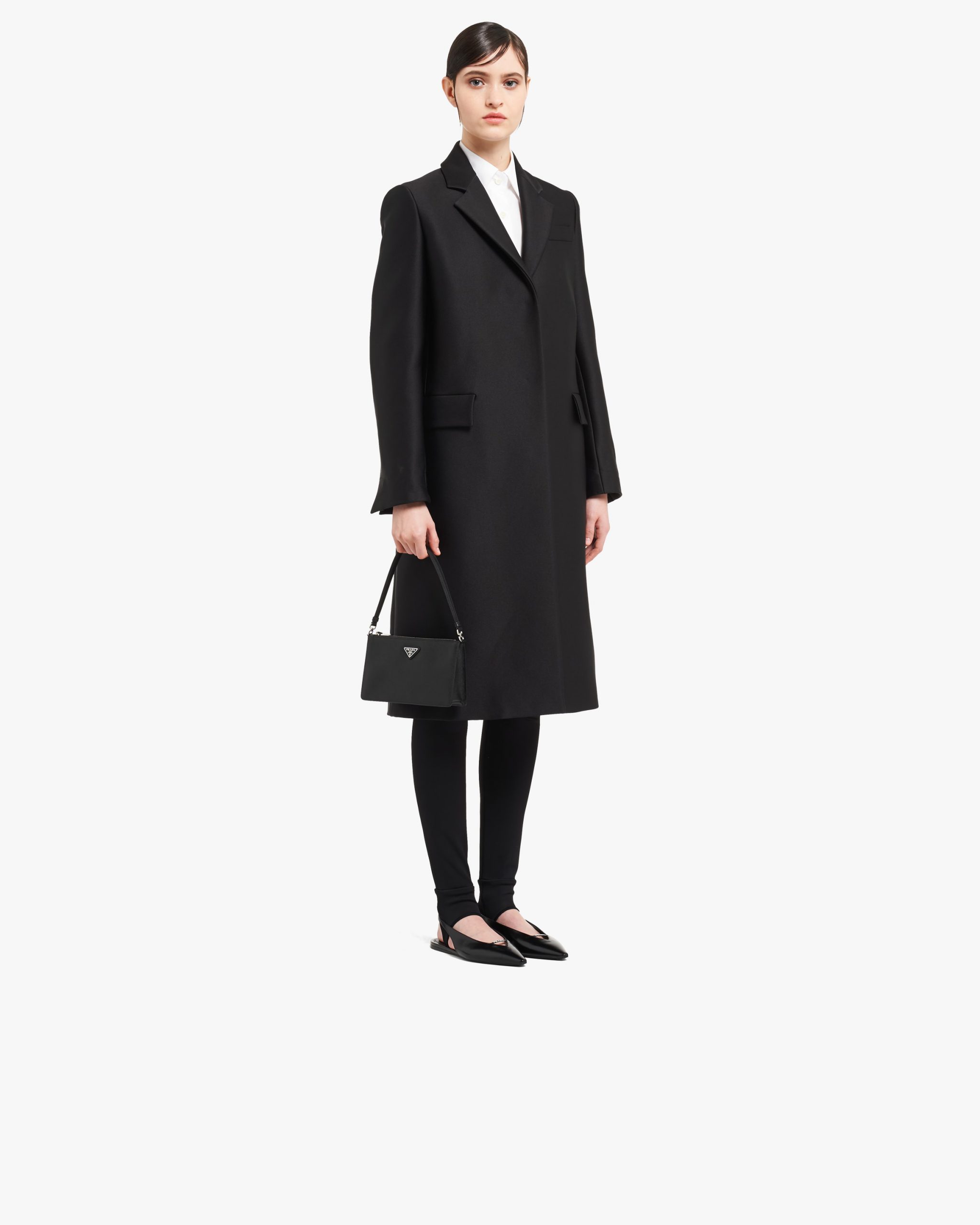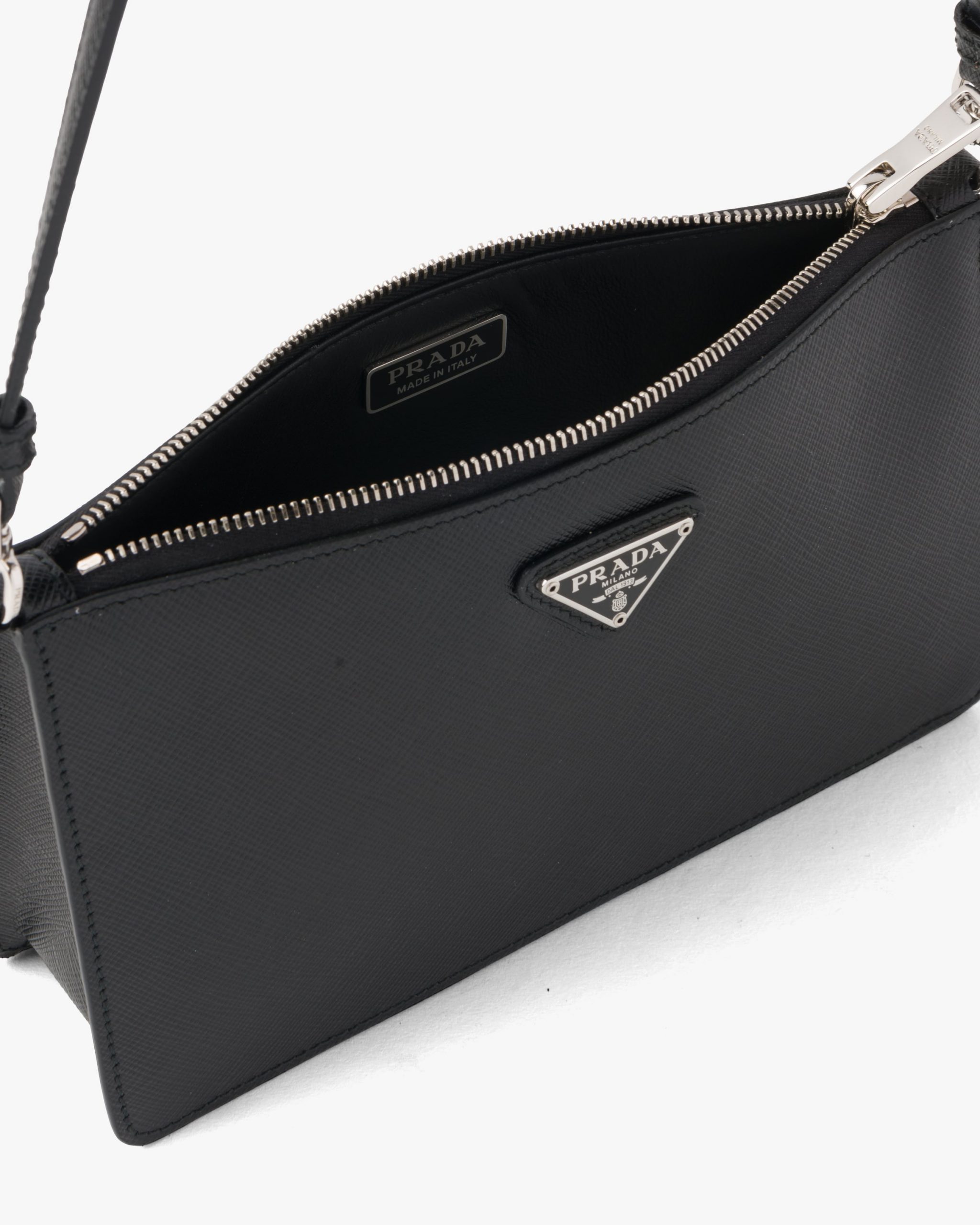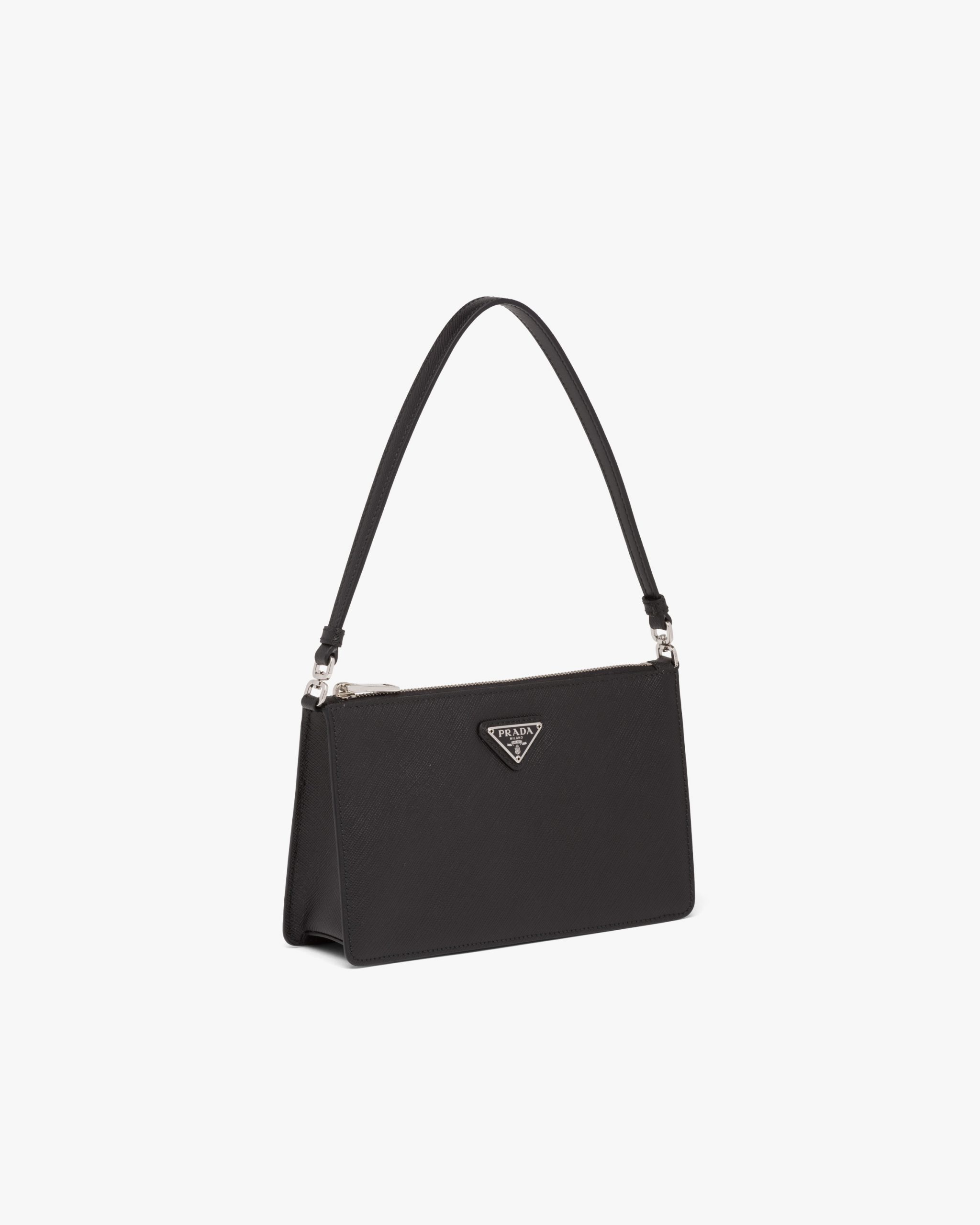 Defined by a structured design, this mini bag comes in Saffiano, an iconic Prada material: calf leather of the highest quality, defined by a crosshatch pattern and waxed finish. The enameled metal triangle logo adorns the accessory.