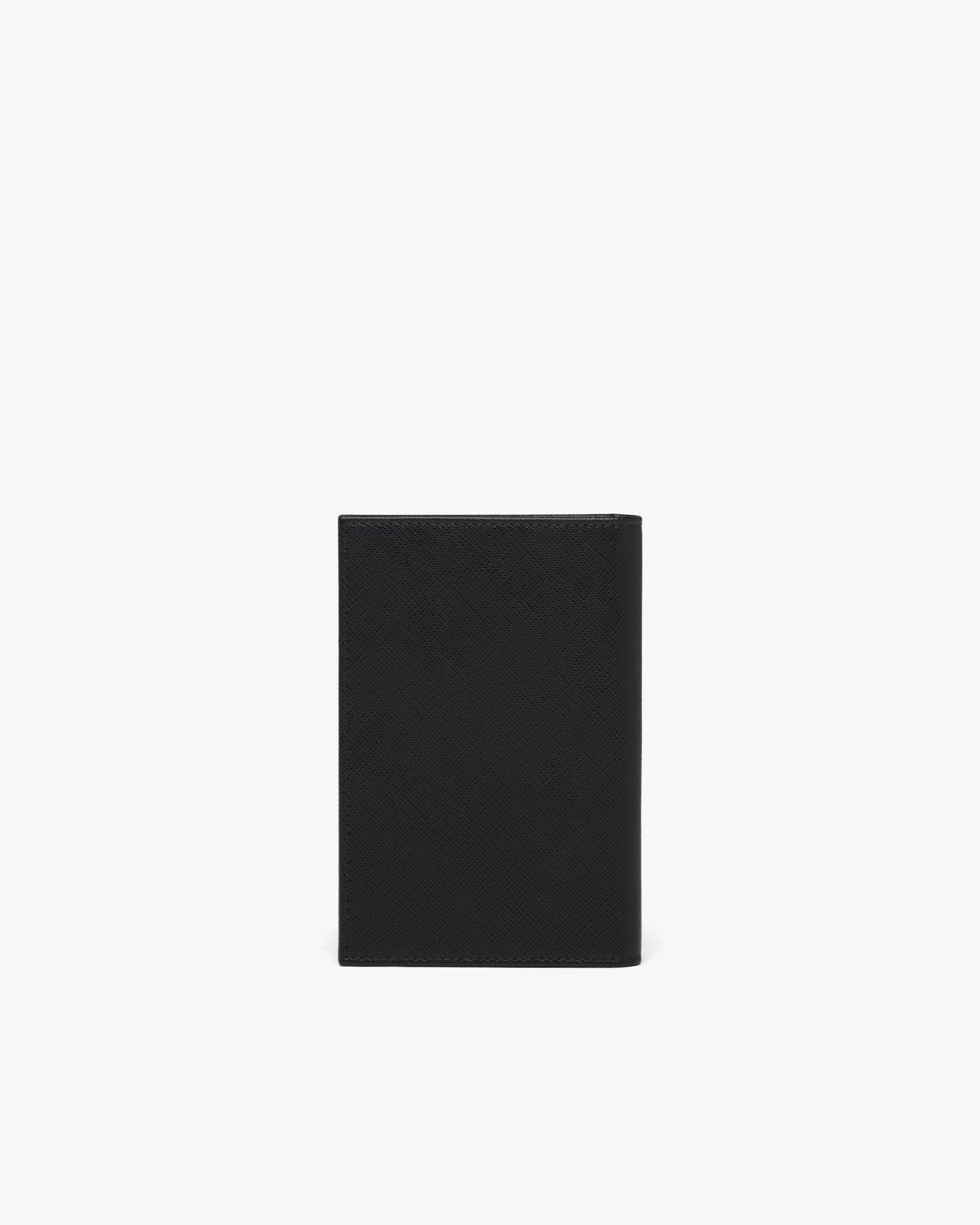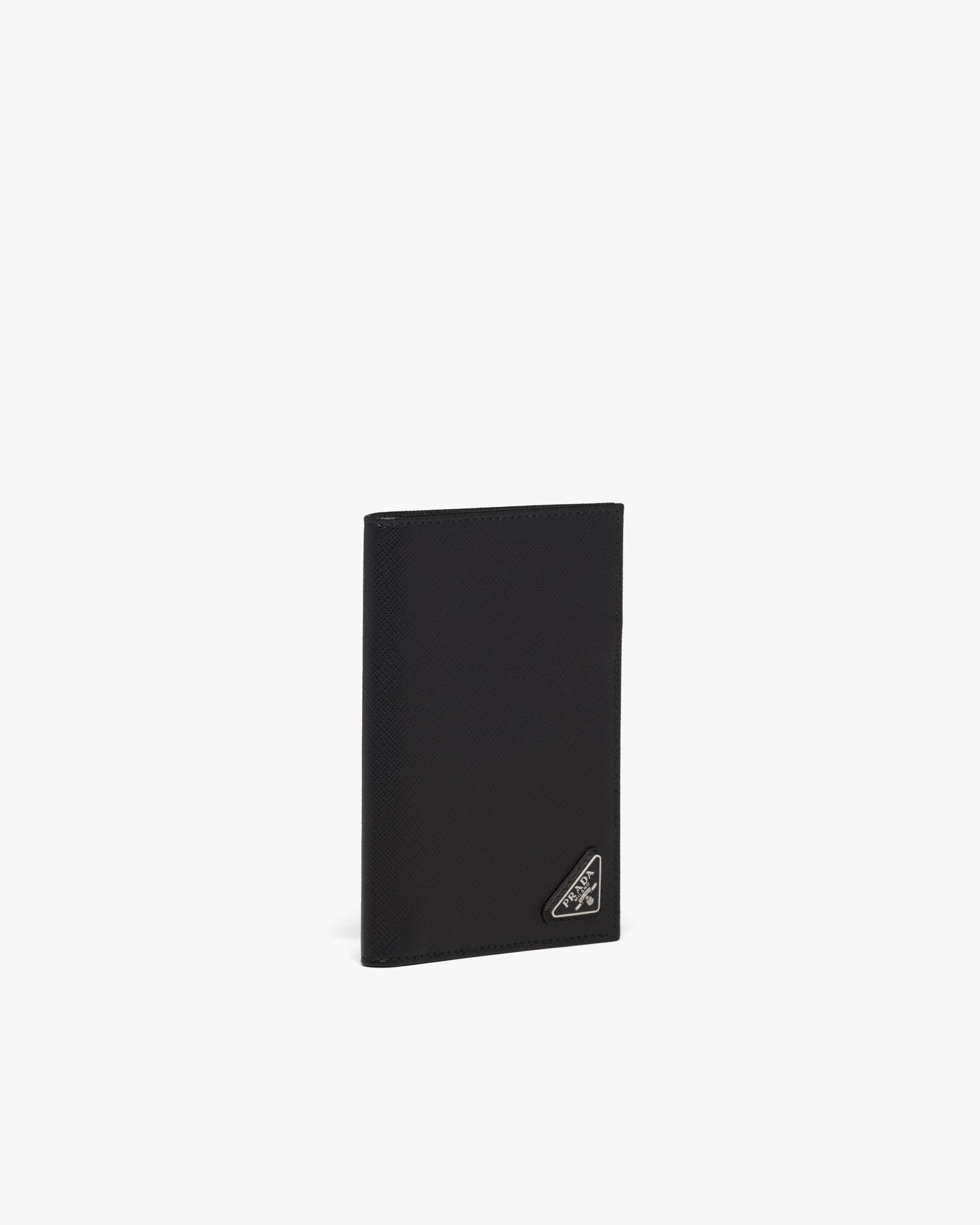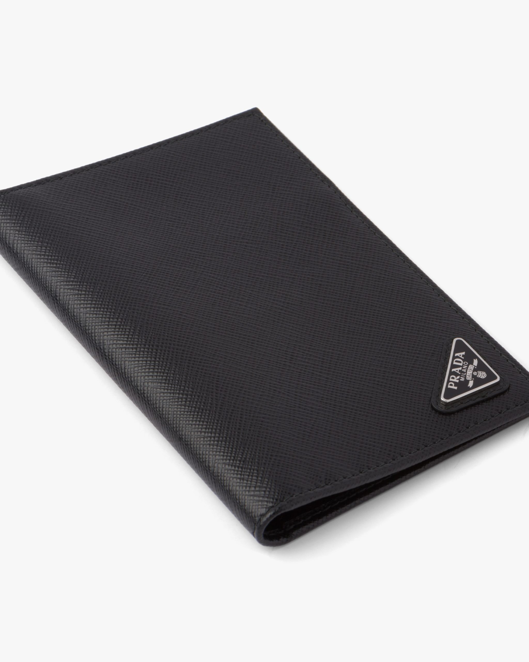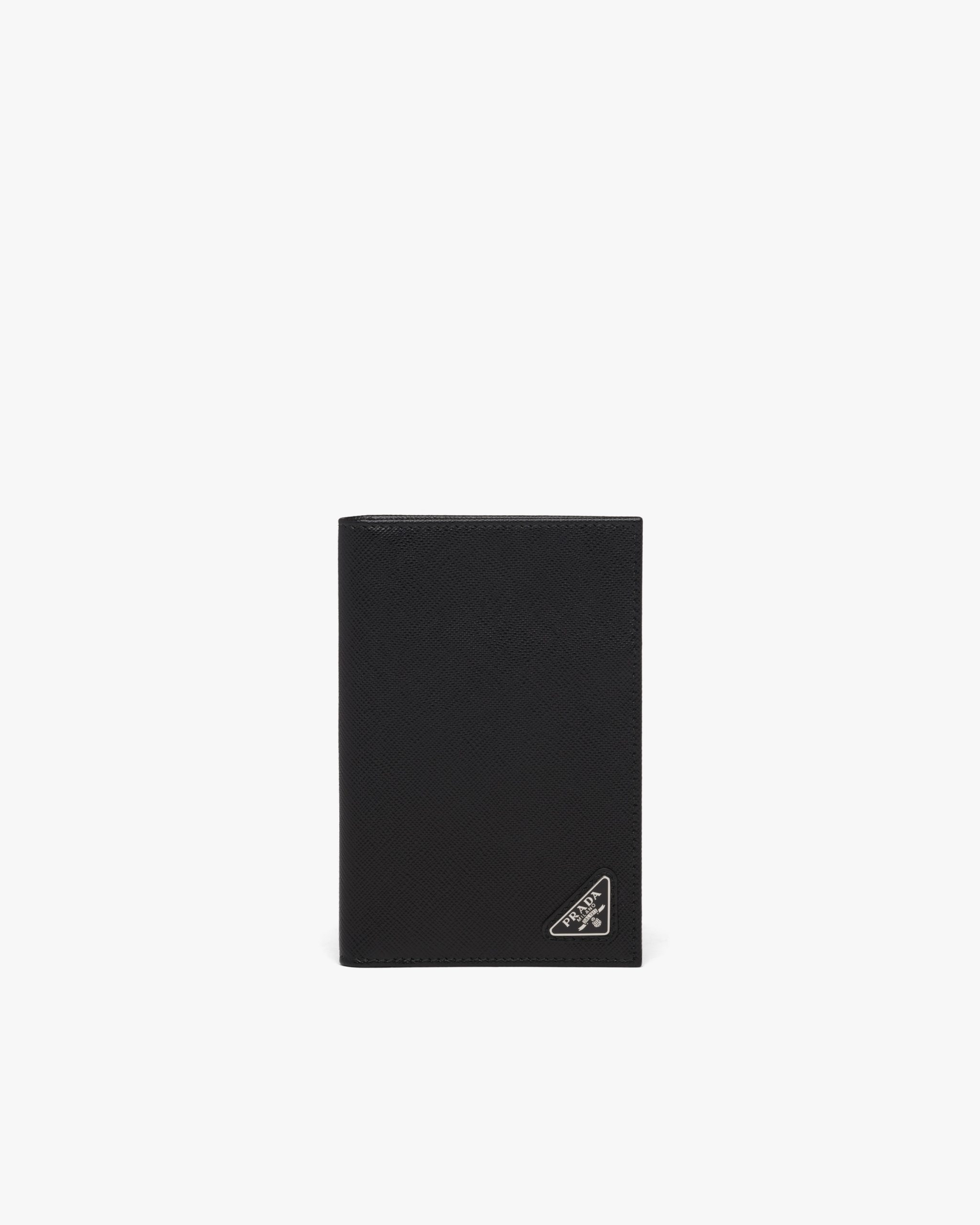 The triangle logo first introduced on trunks designed by Mario Prada decorates this passport holder, an accessory that blends modernity and tradition. Saffiano leather, an iconic Prada material with a crosshatch pattern and wax finish, is synonymous with luxury and identifies with traditional Italian leather goods production.
