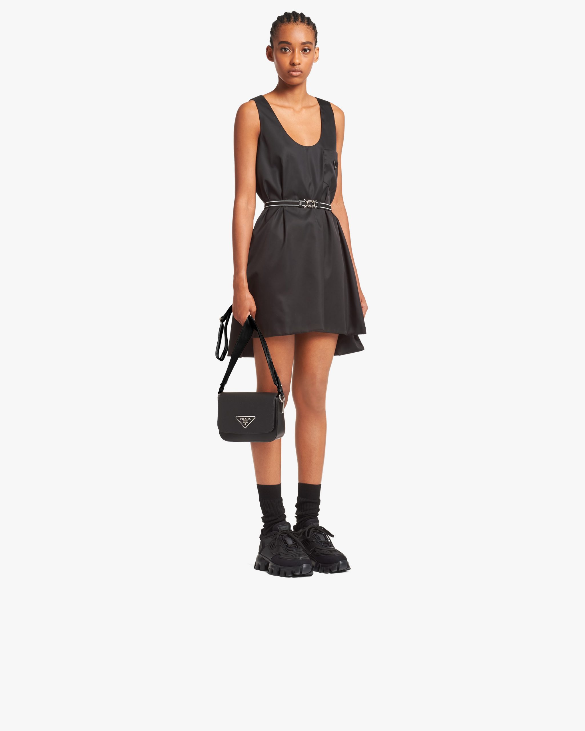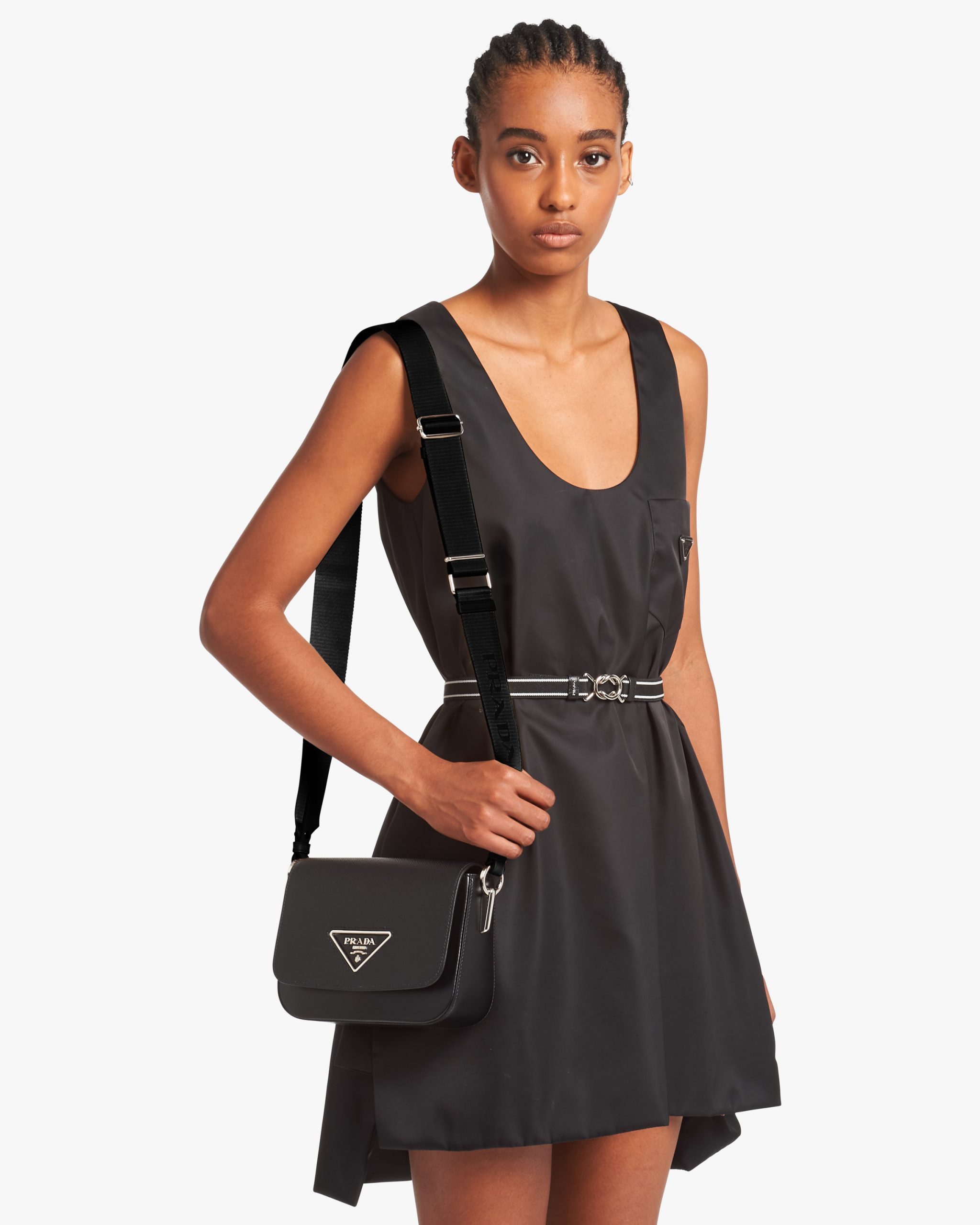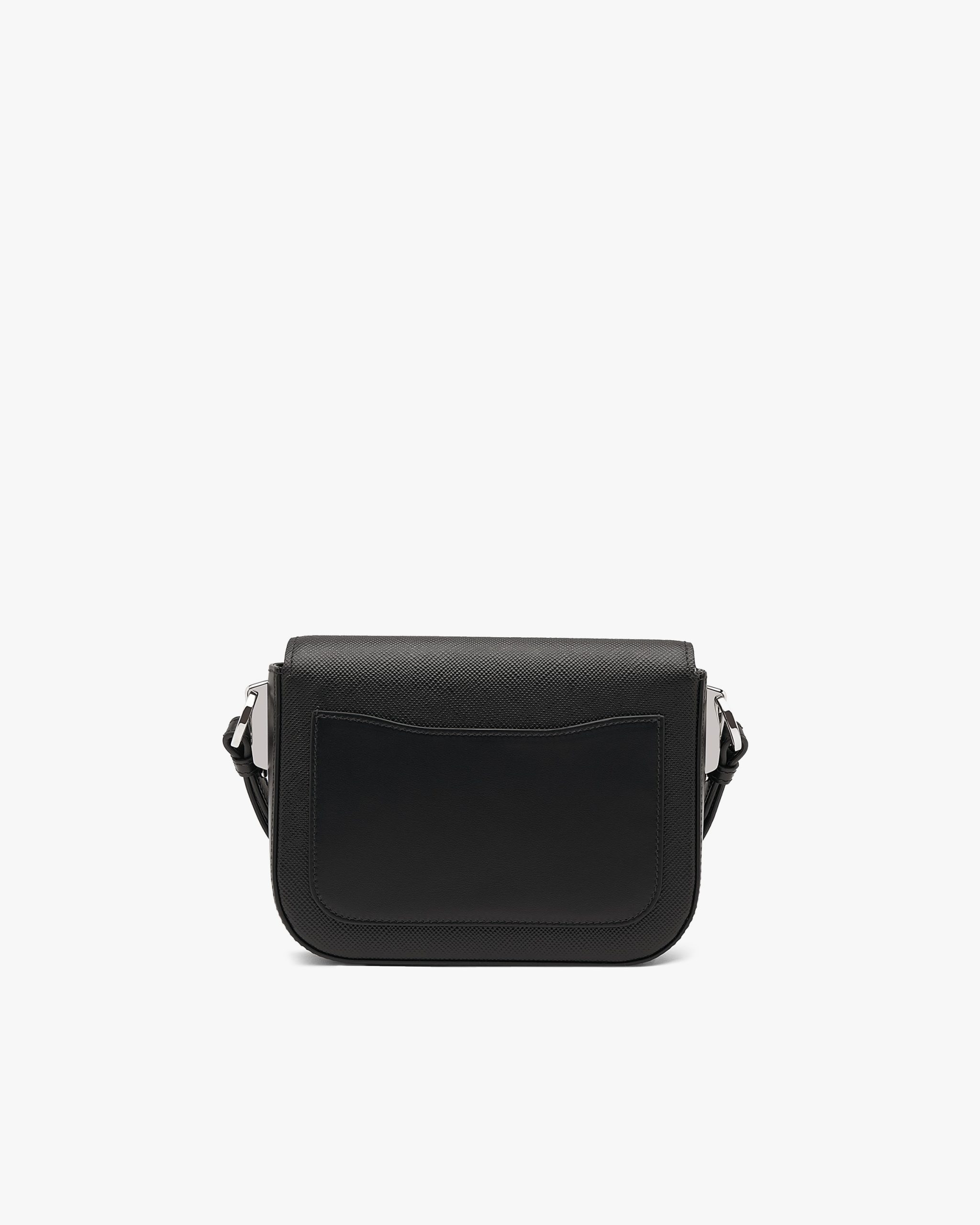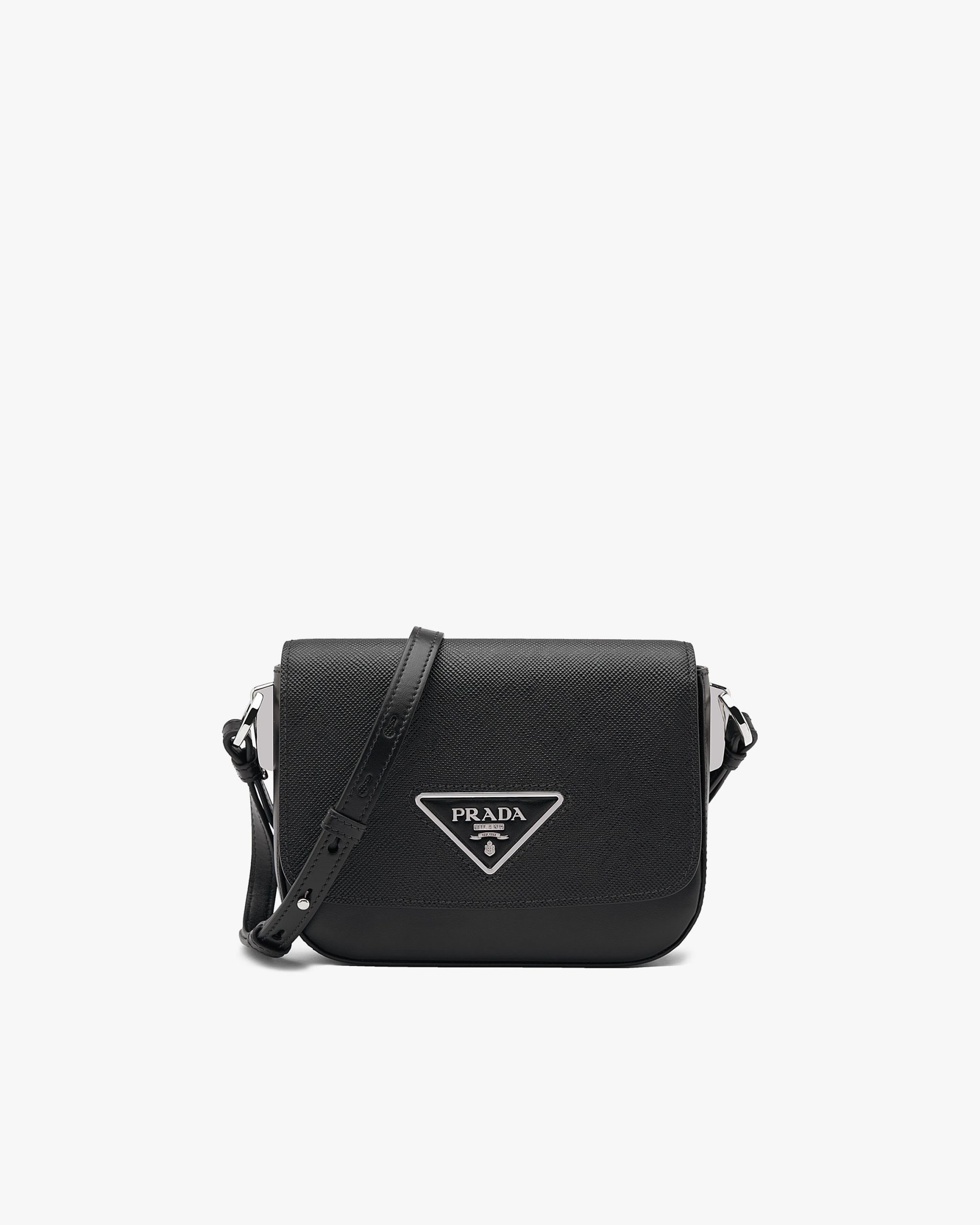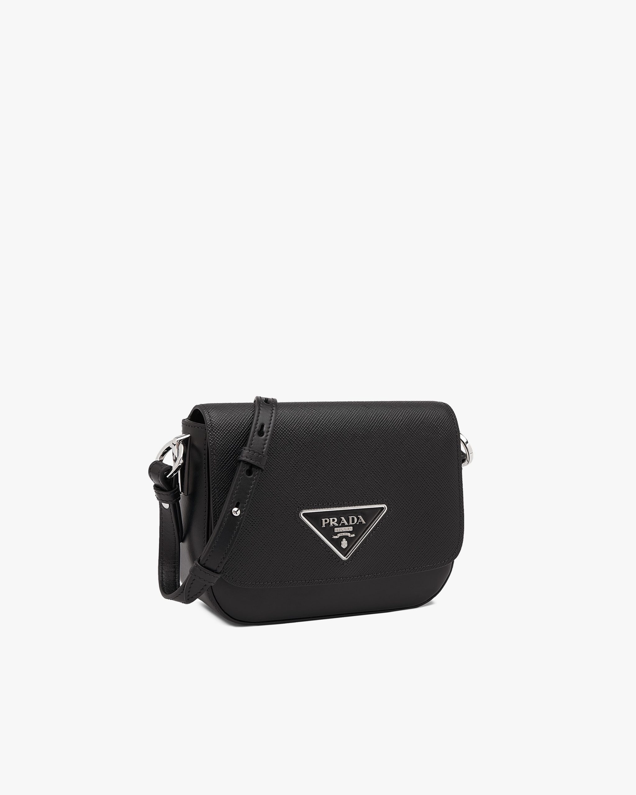 The minimalist design of this shoulder bag in Saffiano leather, a signature material of the brand, is enhanced with sophisticated details such as the triangle logo on the flap.