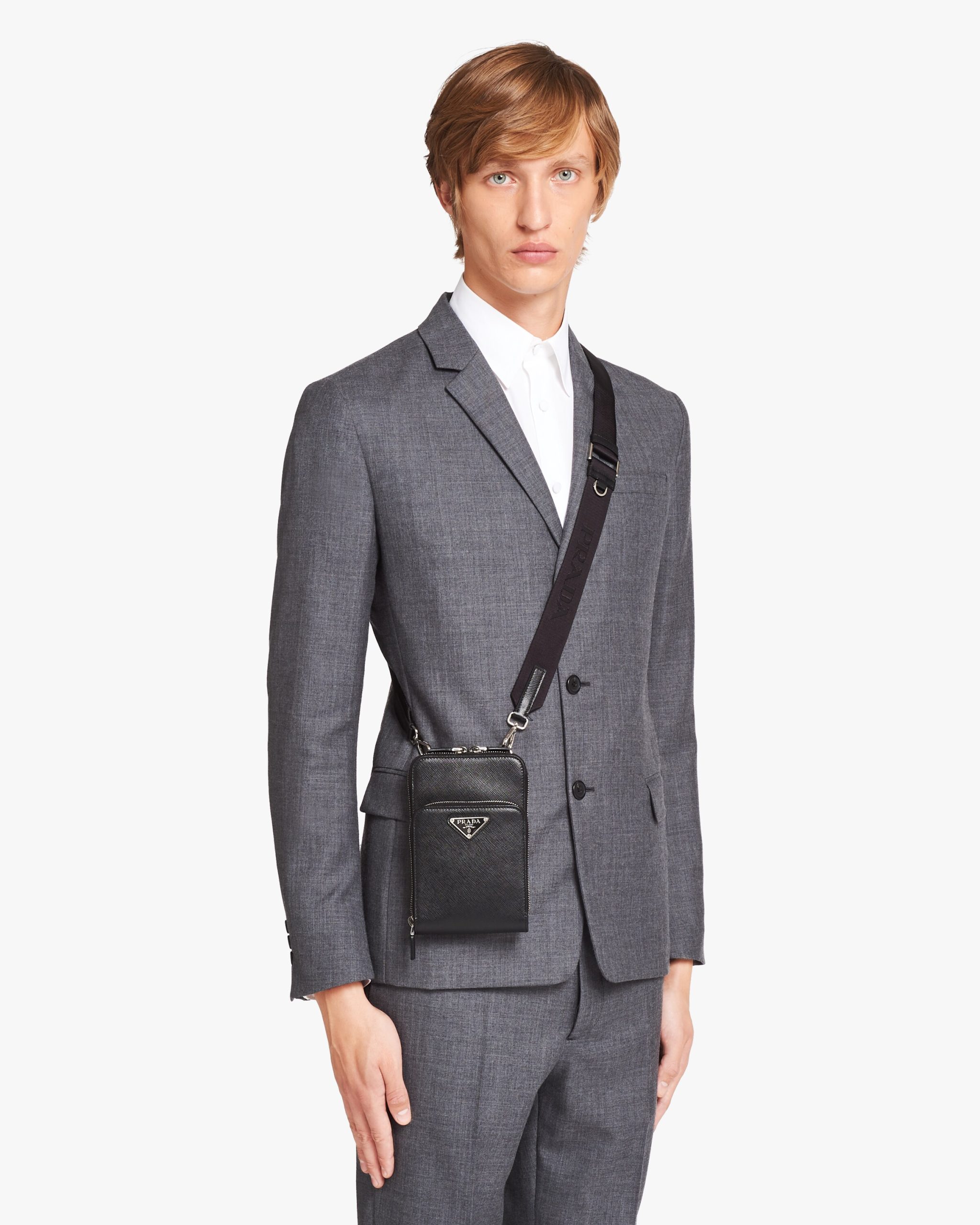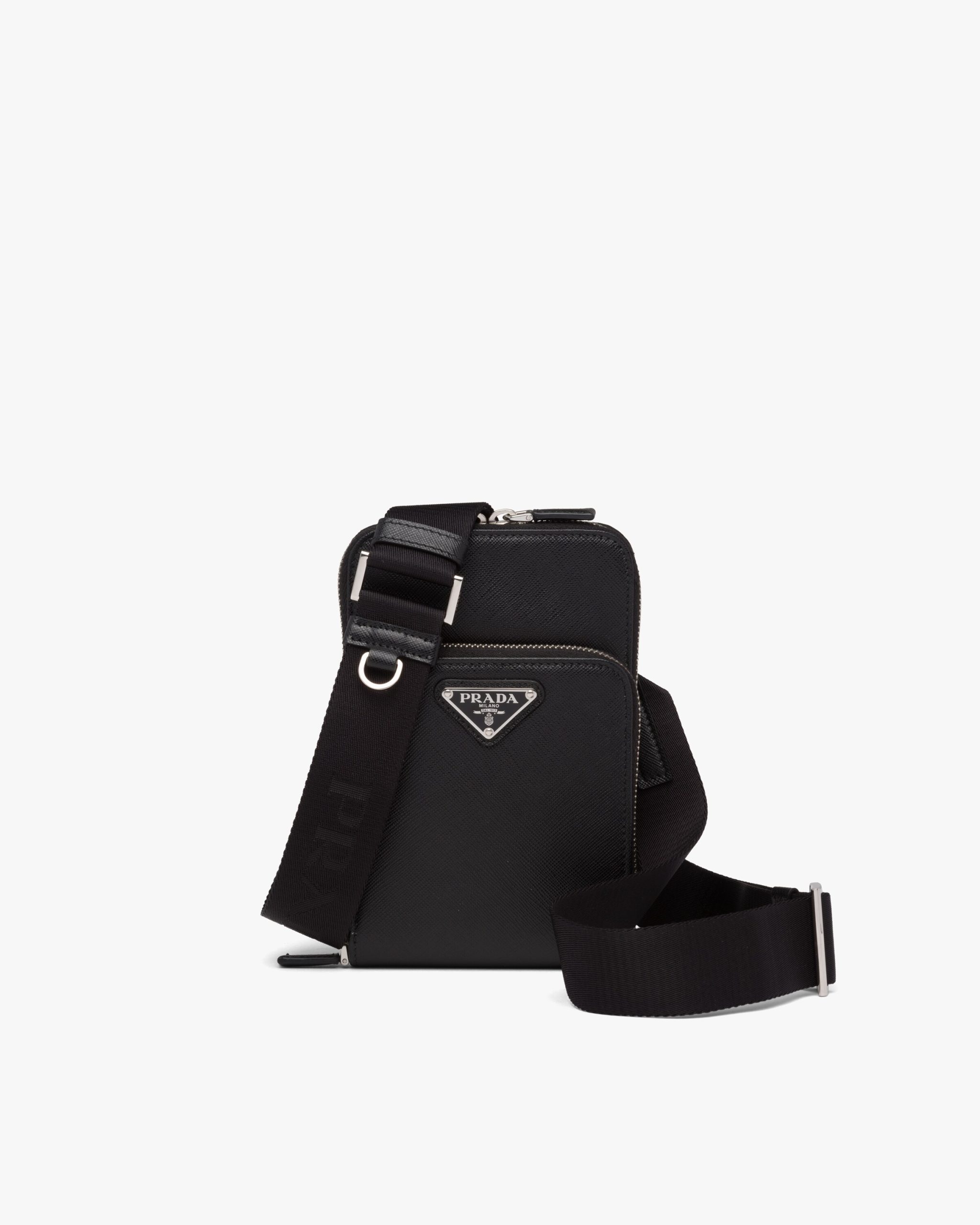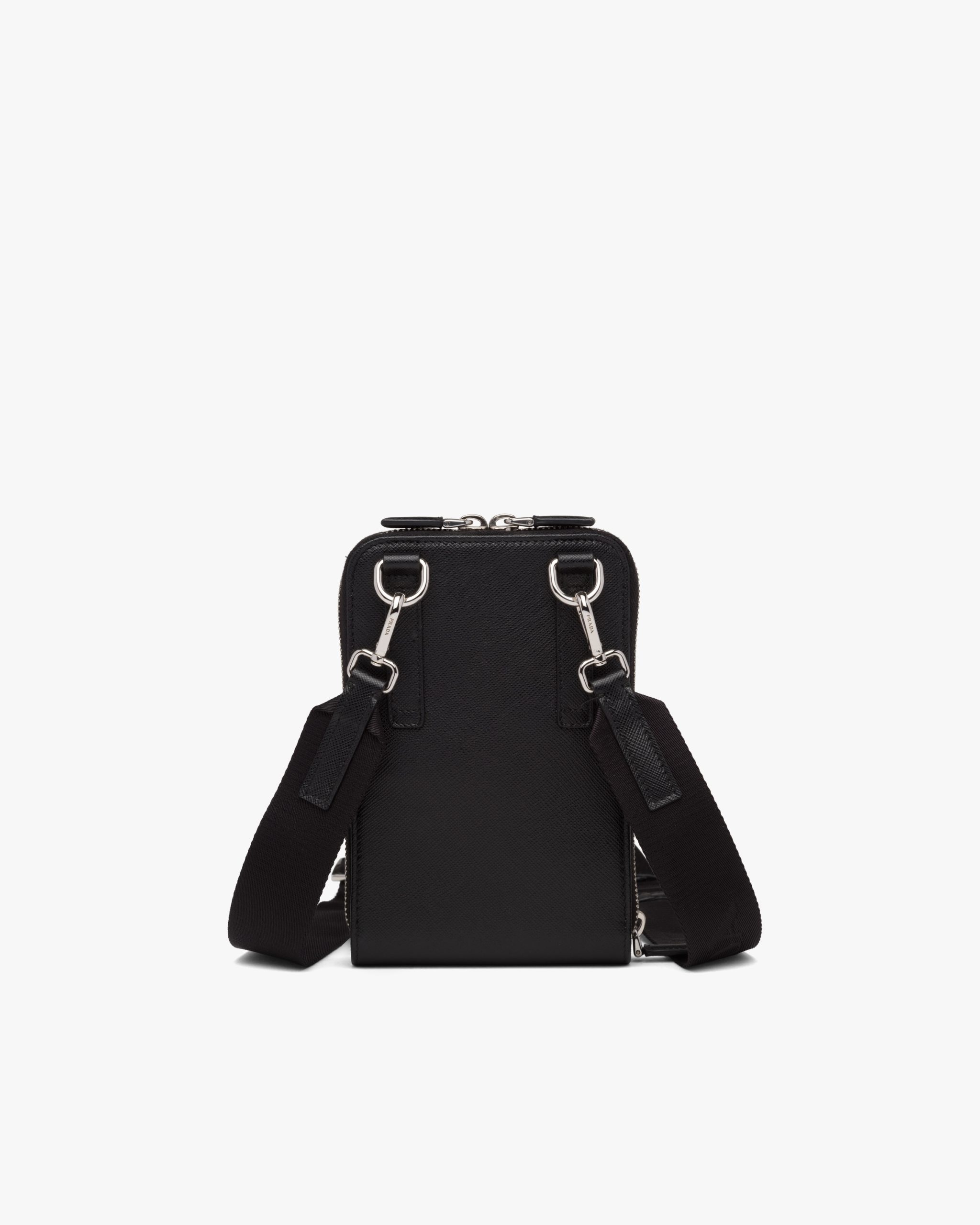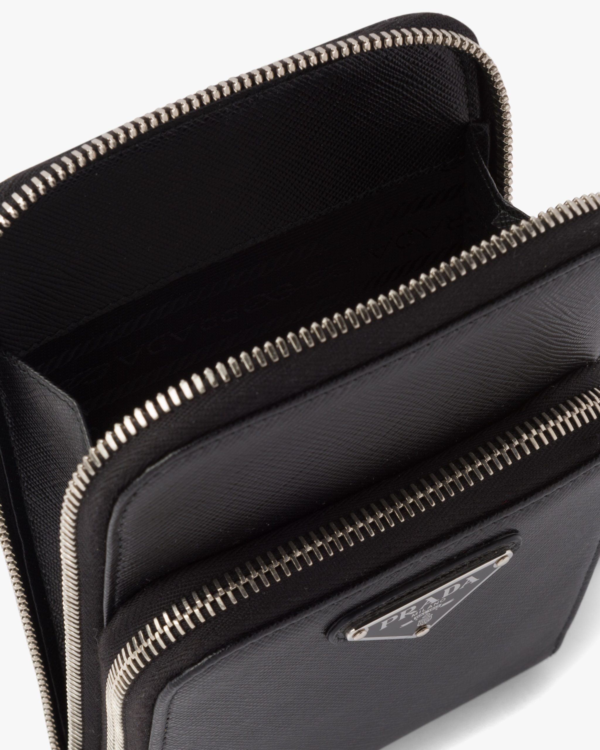 Complete with a detachable shoulder strap, this smartphone case is made of Saffiano, an iconic Prada material: calf leather of the highest quality defined by the crosshatch texture and waxed finish. The accessory has three card slots and a zipper closure.