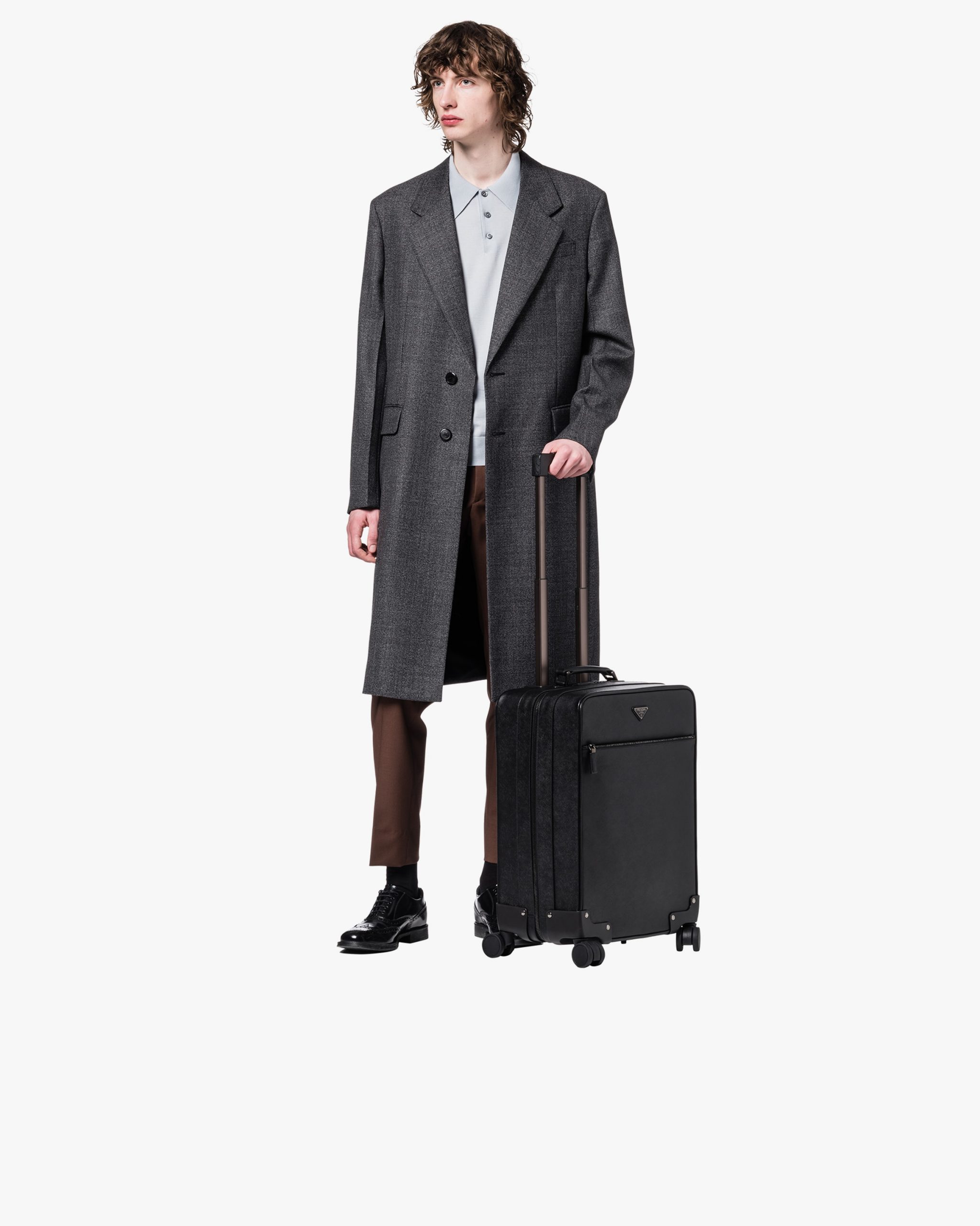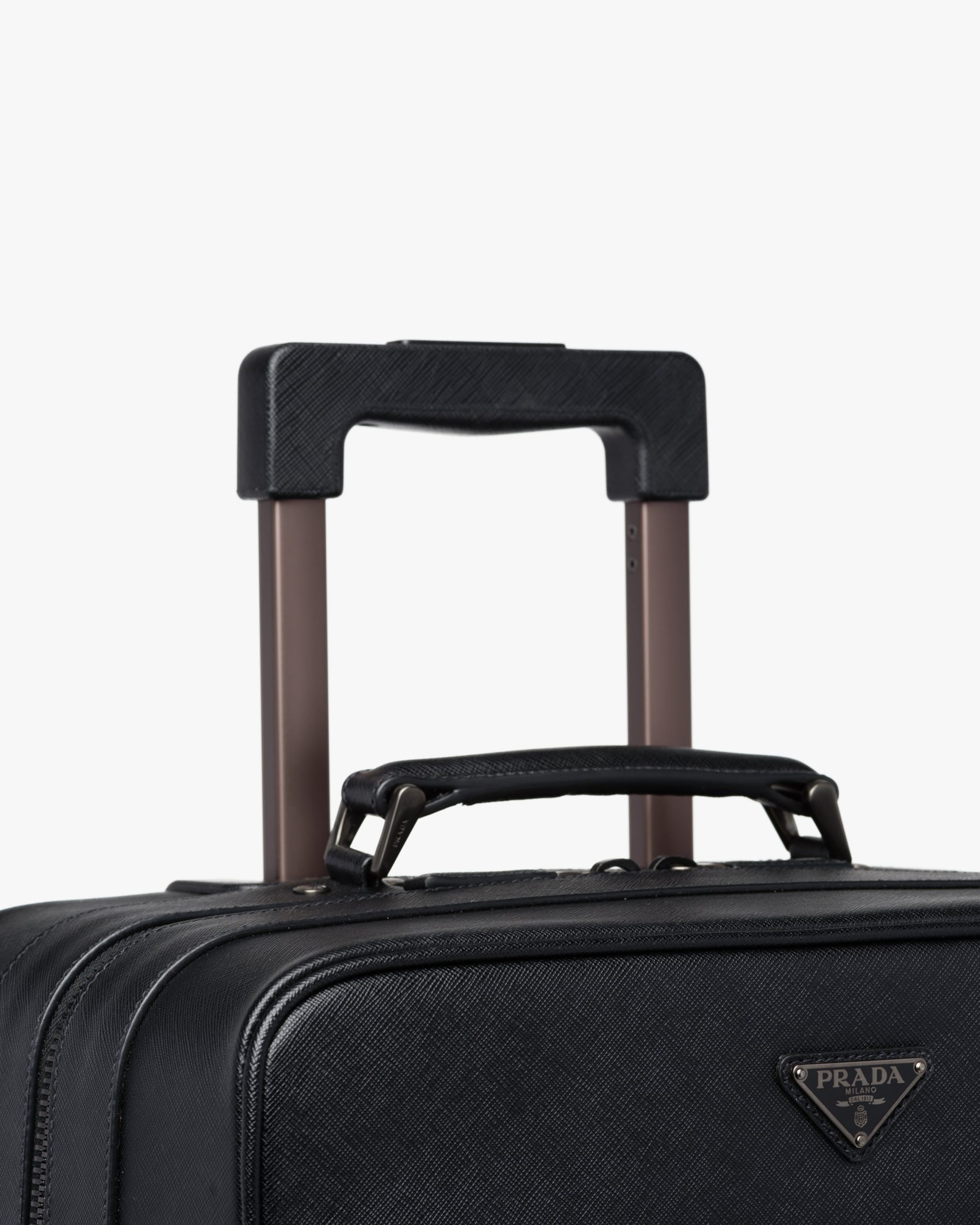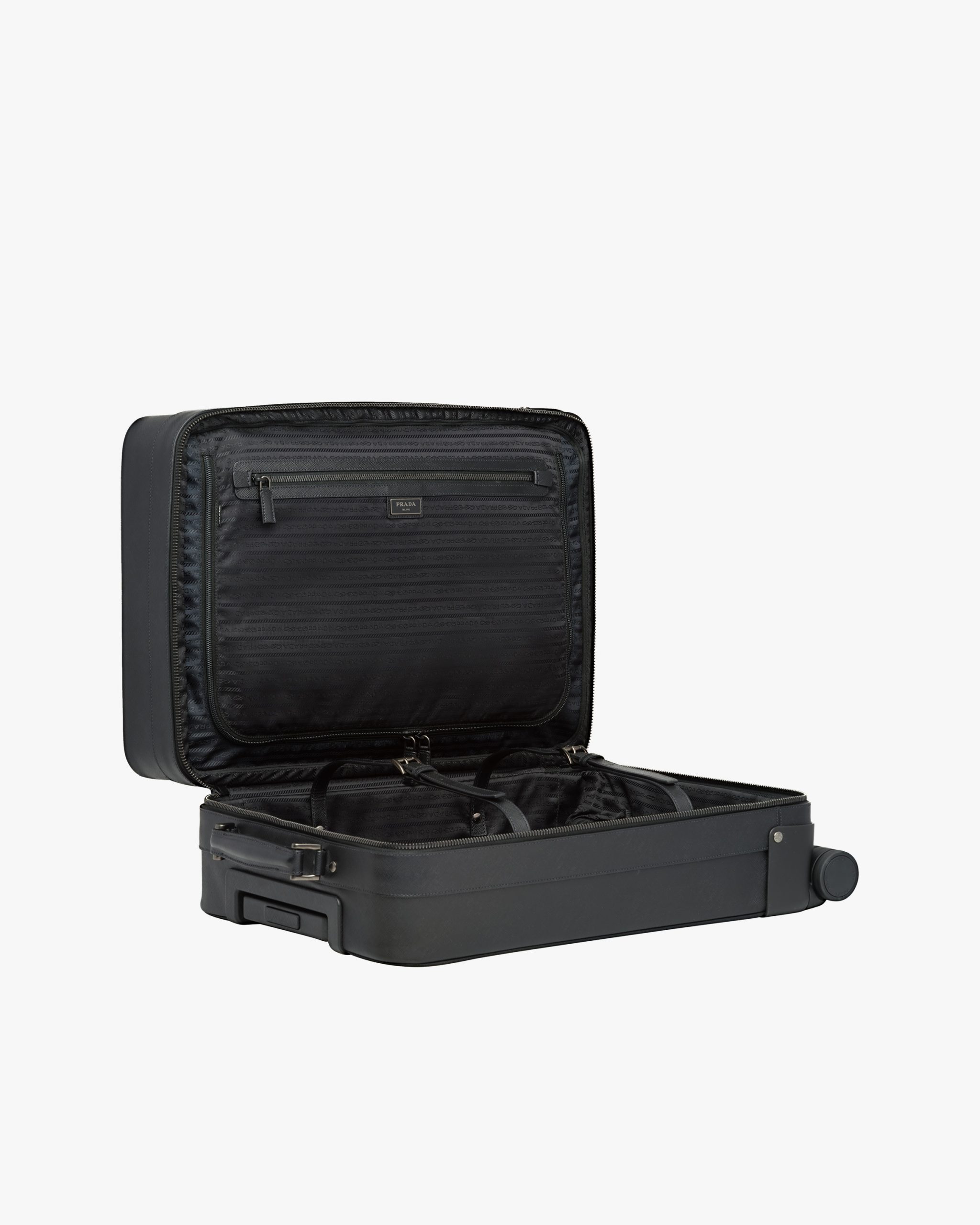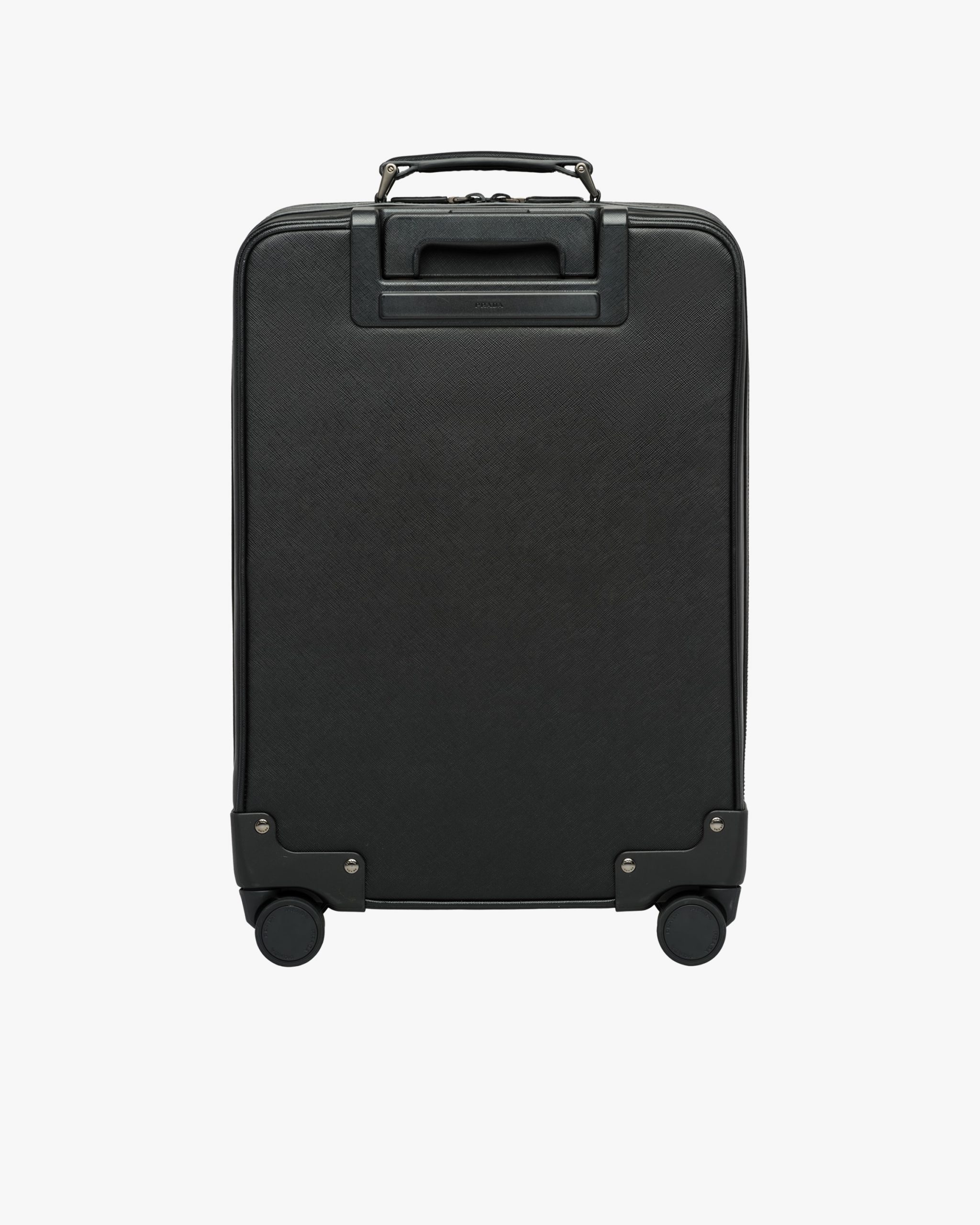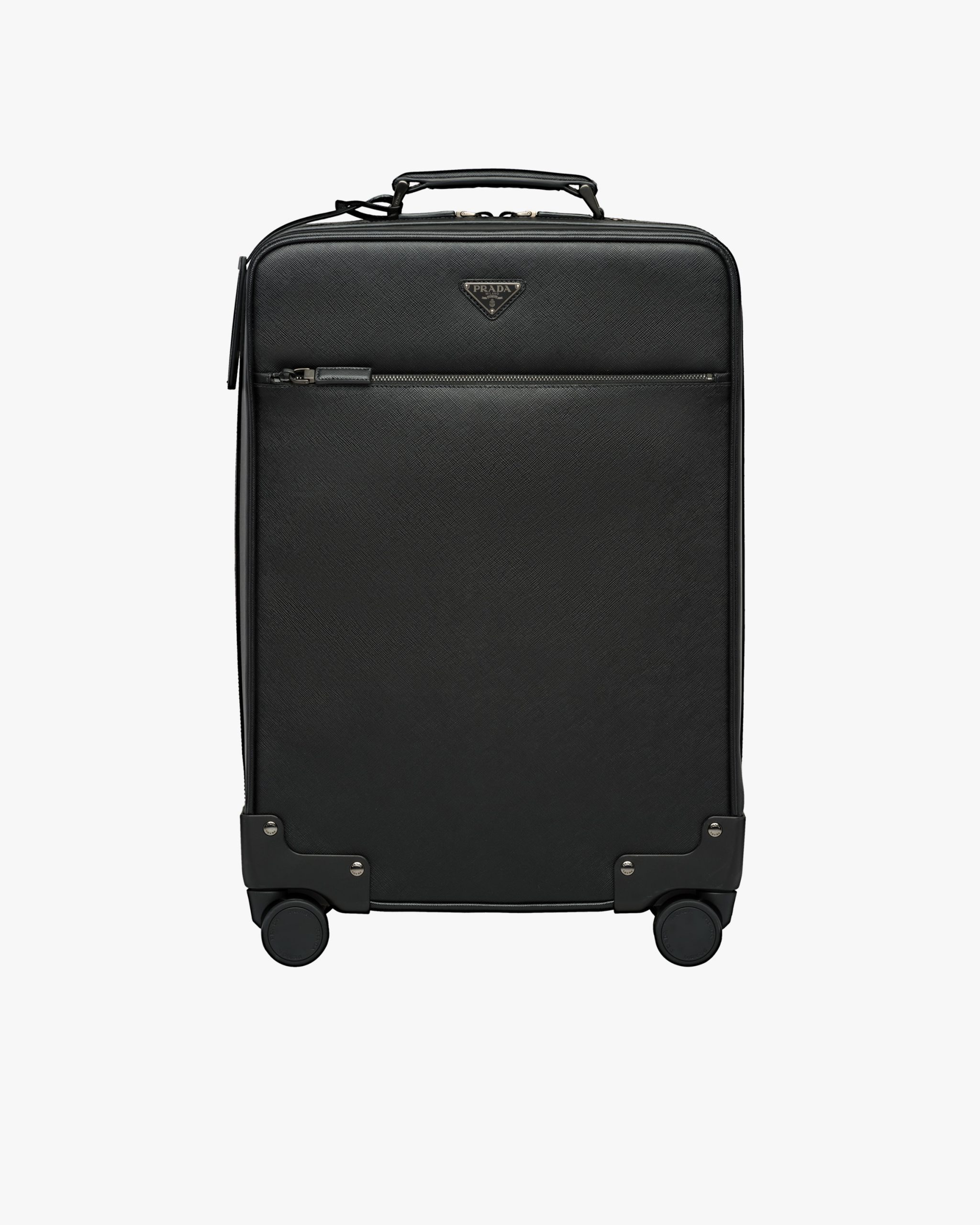 Refined cabin size four-wheel carry-on in Saffiano leather with outside pocket and detachable name tag. The bag is provided with Bluetooth technology that lets you track the bag within a 40-meter range.