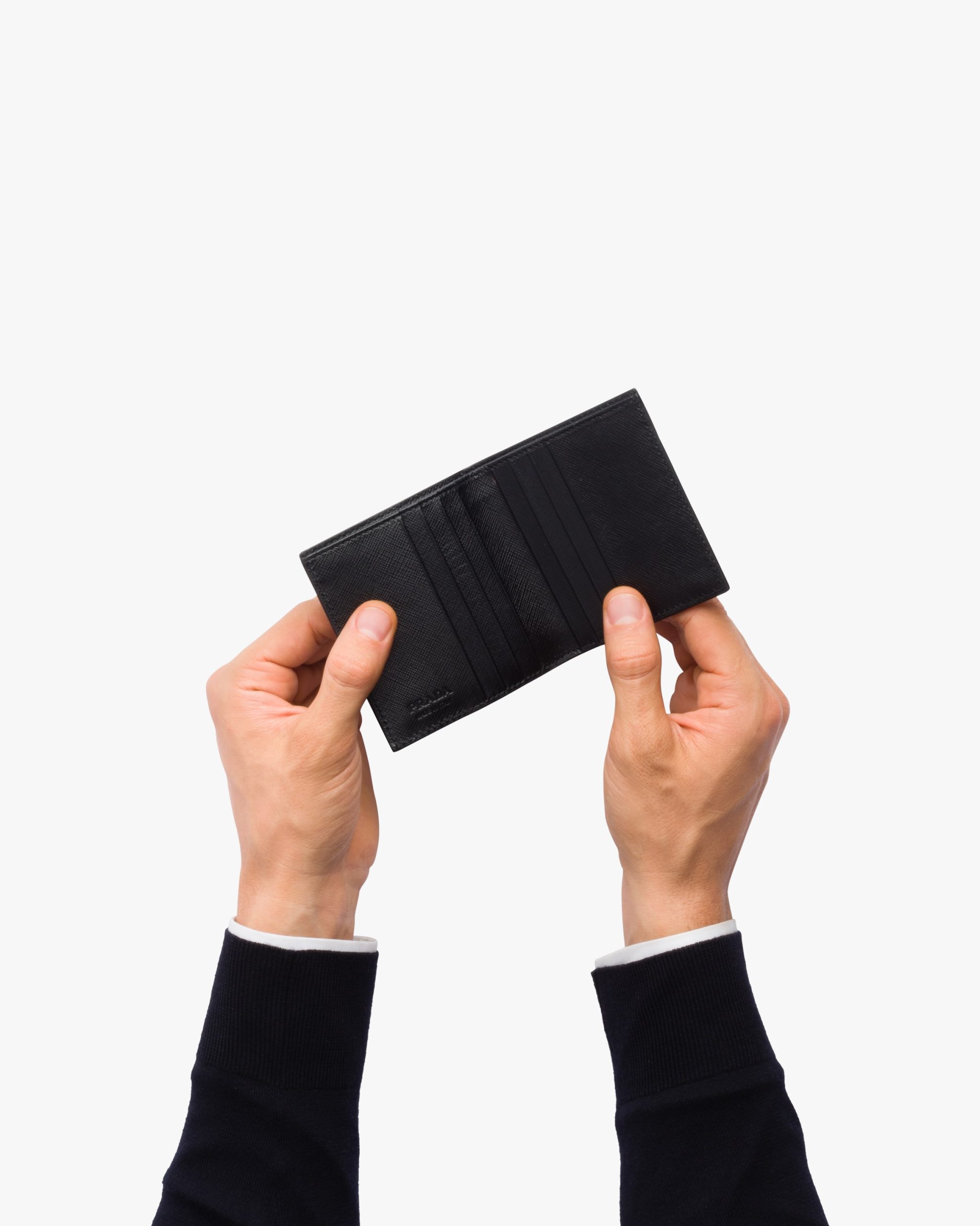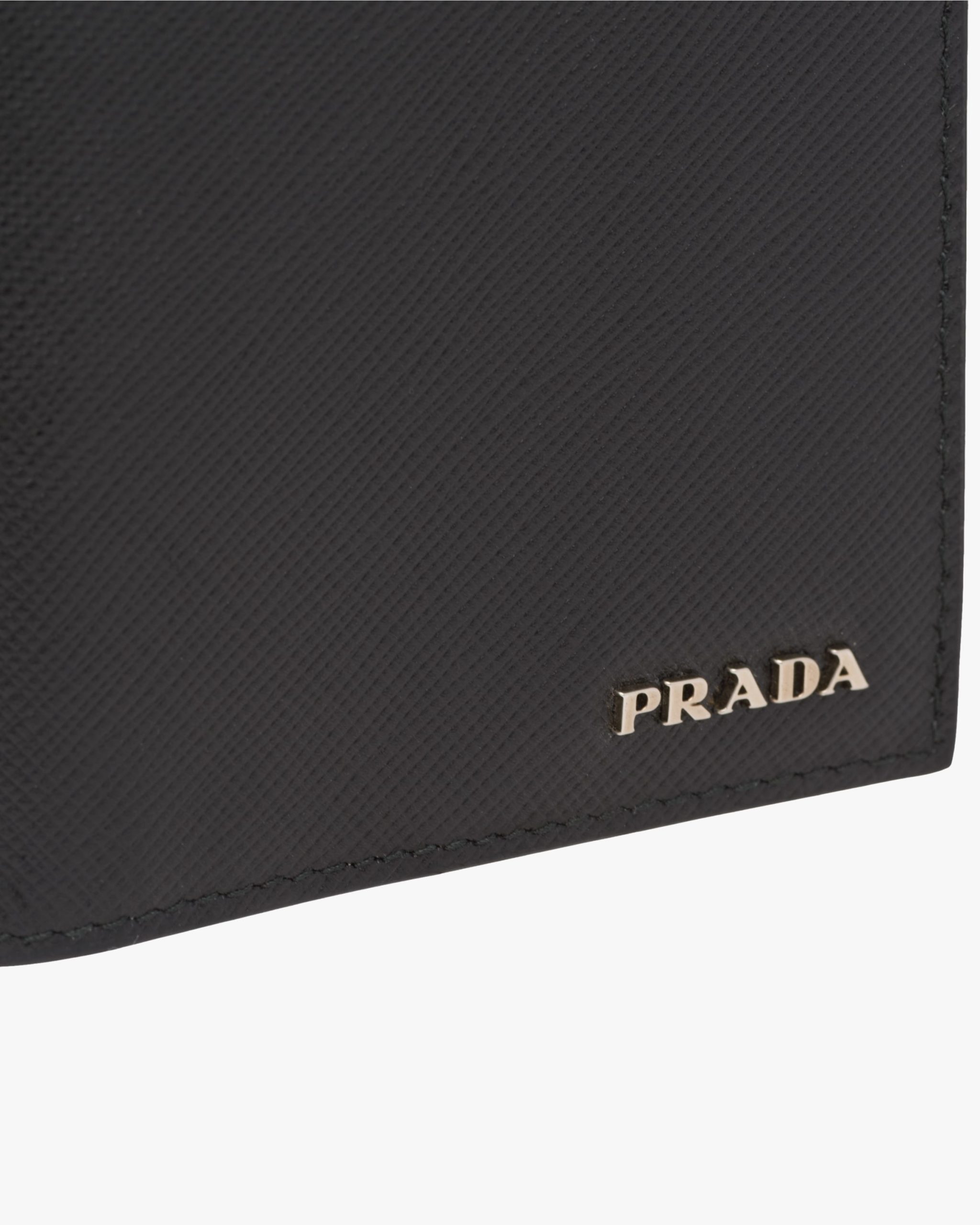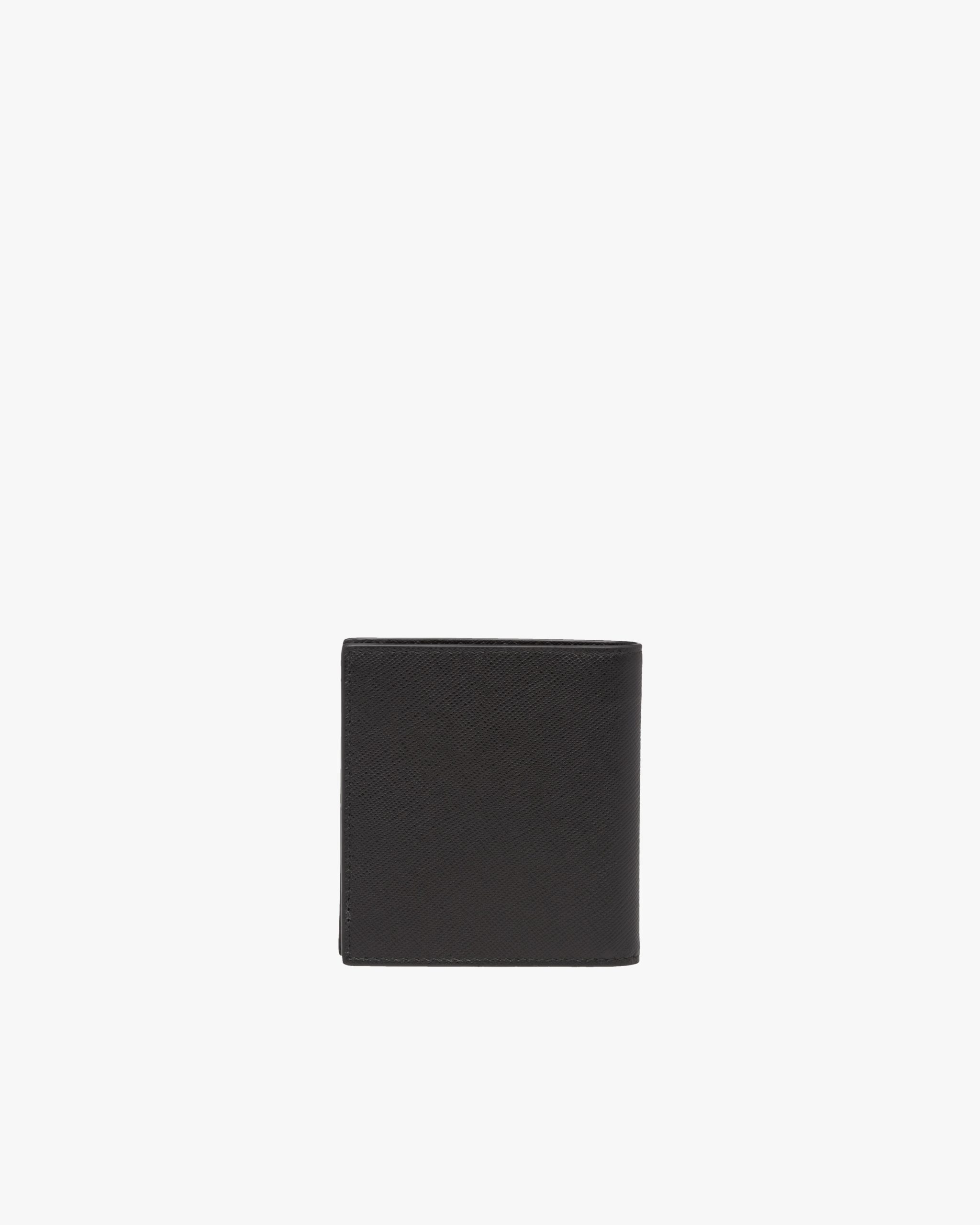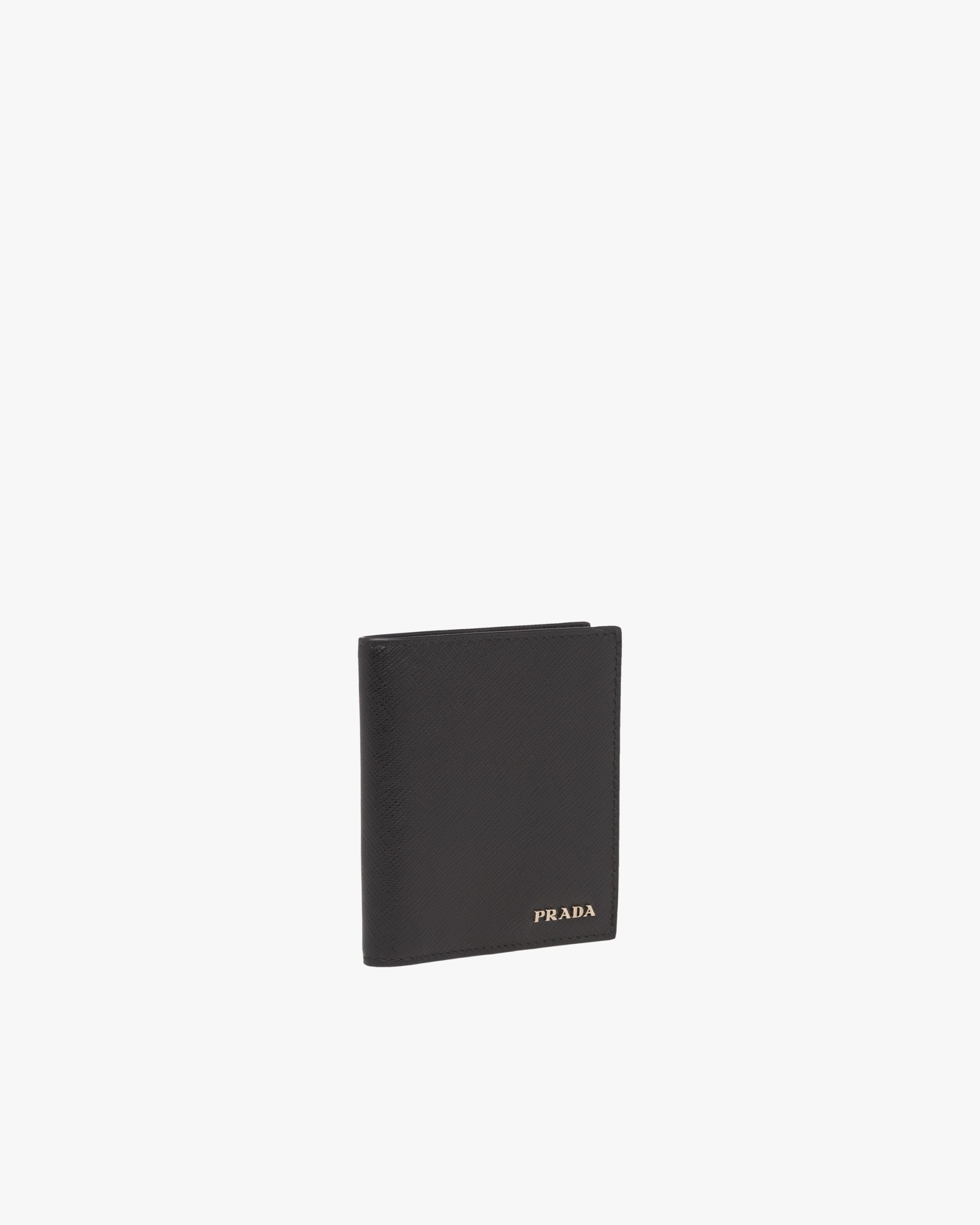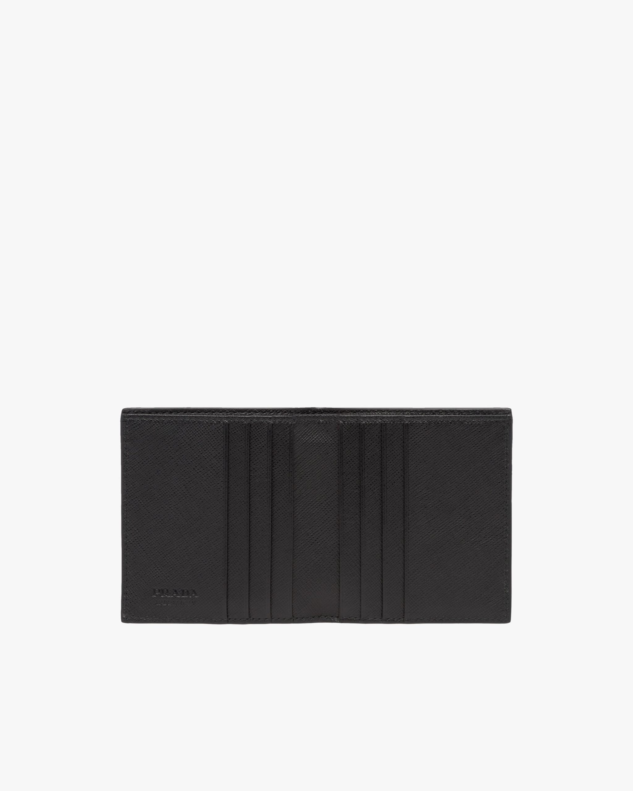 Saffiano leather wallet with metal lettering logo, lined with leather in a contrasting color and featuring a bill compartment, six credit card slots, and two document pockets.
