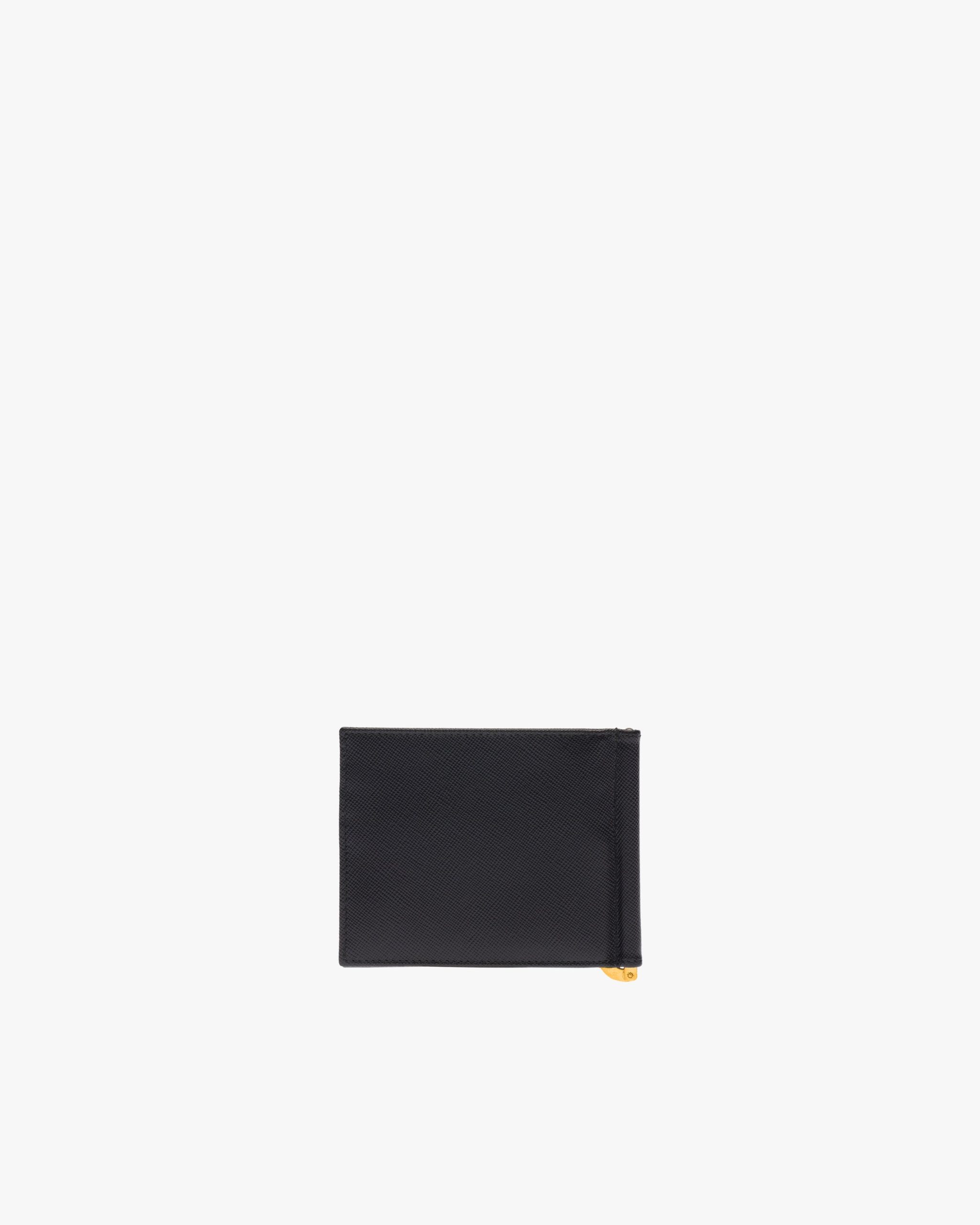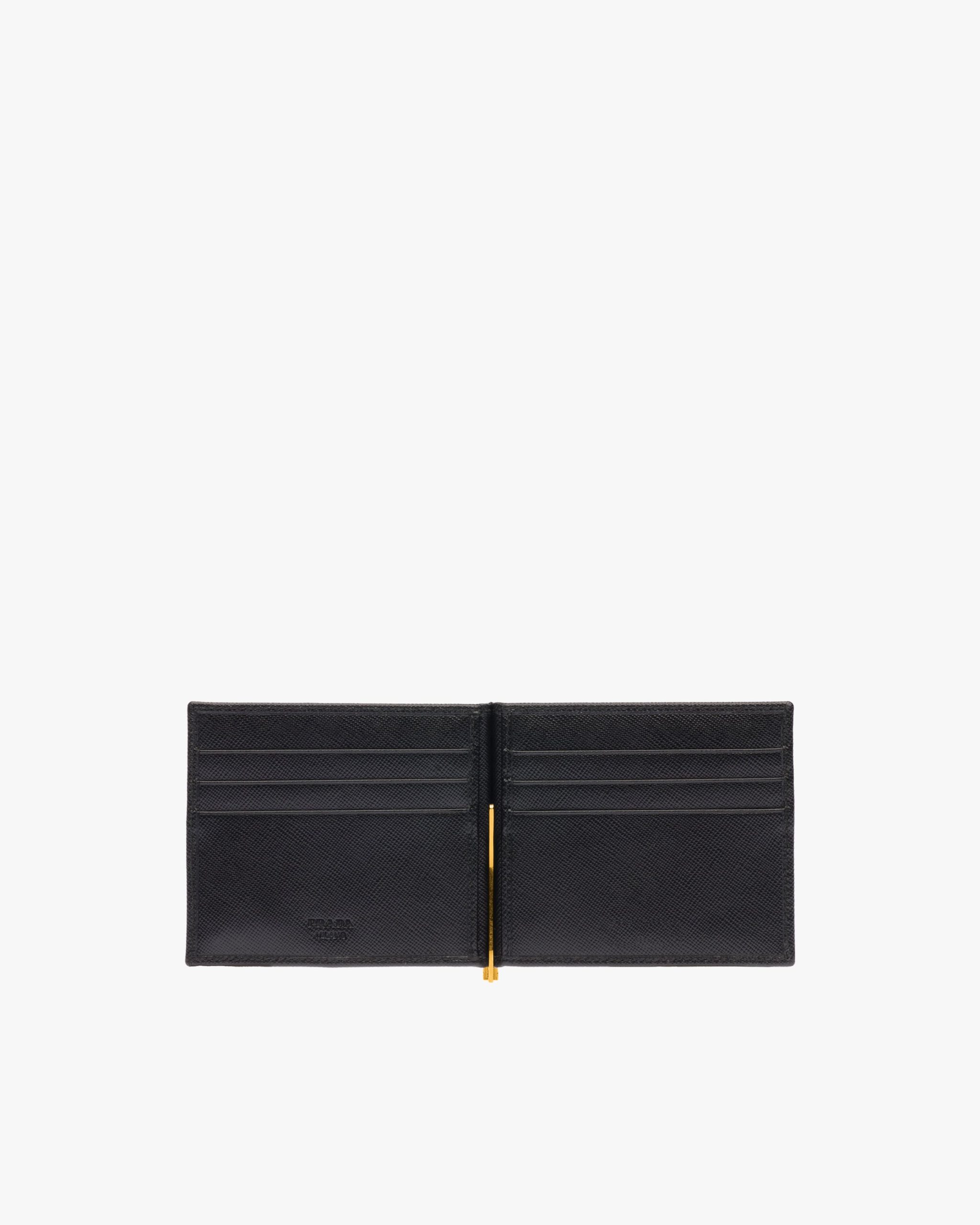 This Saffiano leather wallet is defined by its metal details, pairing a handy interior metal money clip with a stylish metal Prada logo on the front. It opens to a fabric lining and six credit card slots.