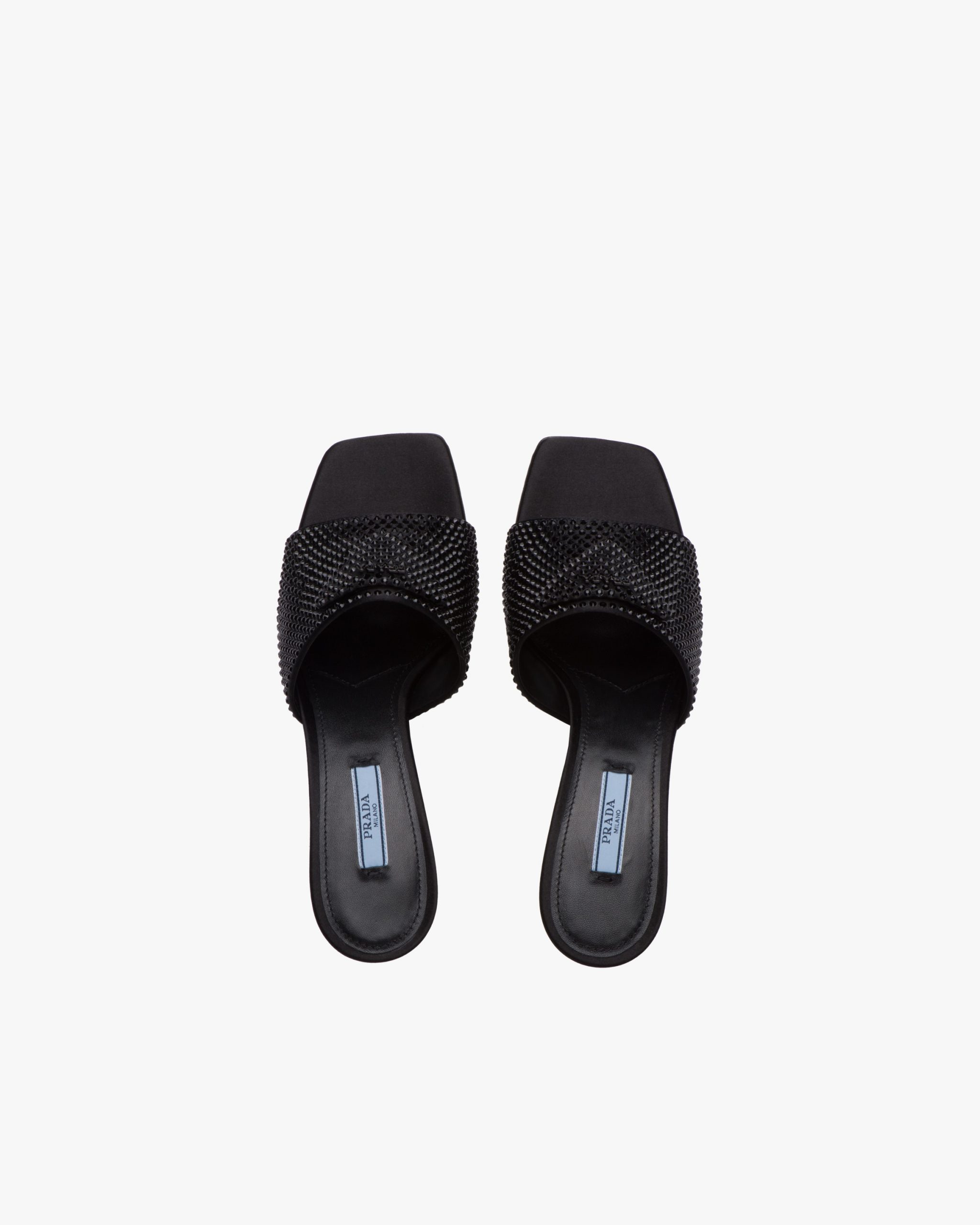 Faceted crystals create plays of light and iridescent reflections on a luxurious version of mid-heel slides. New variations of the brand’s iconic triangle logo turn it into a slightly padded leather detail.