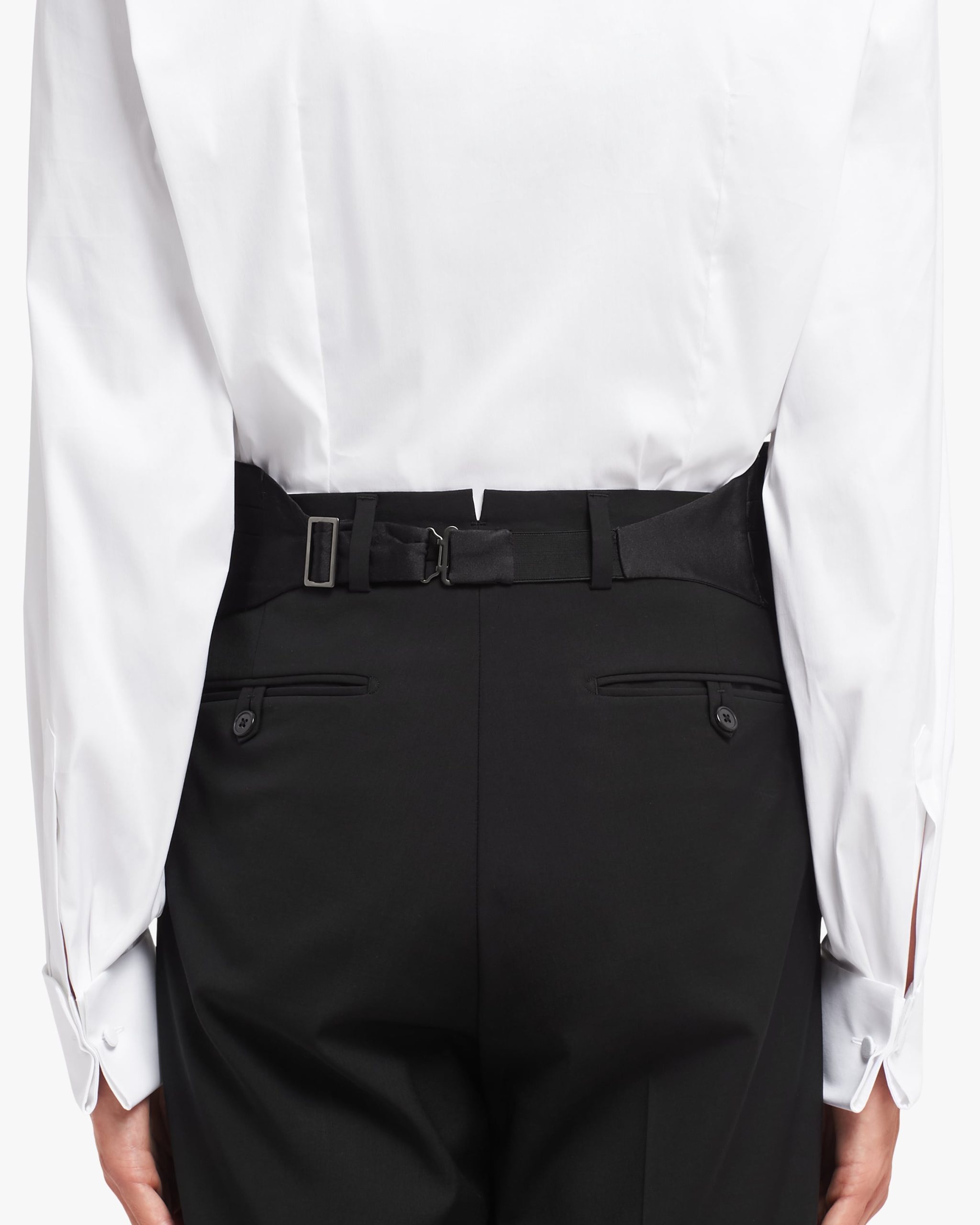 The classic satin tuxedo cummerbund has an adjustable tab closure with hooks.