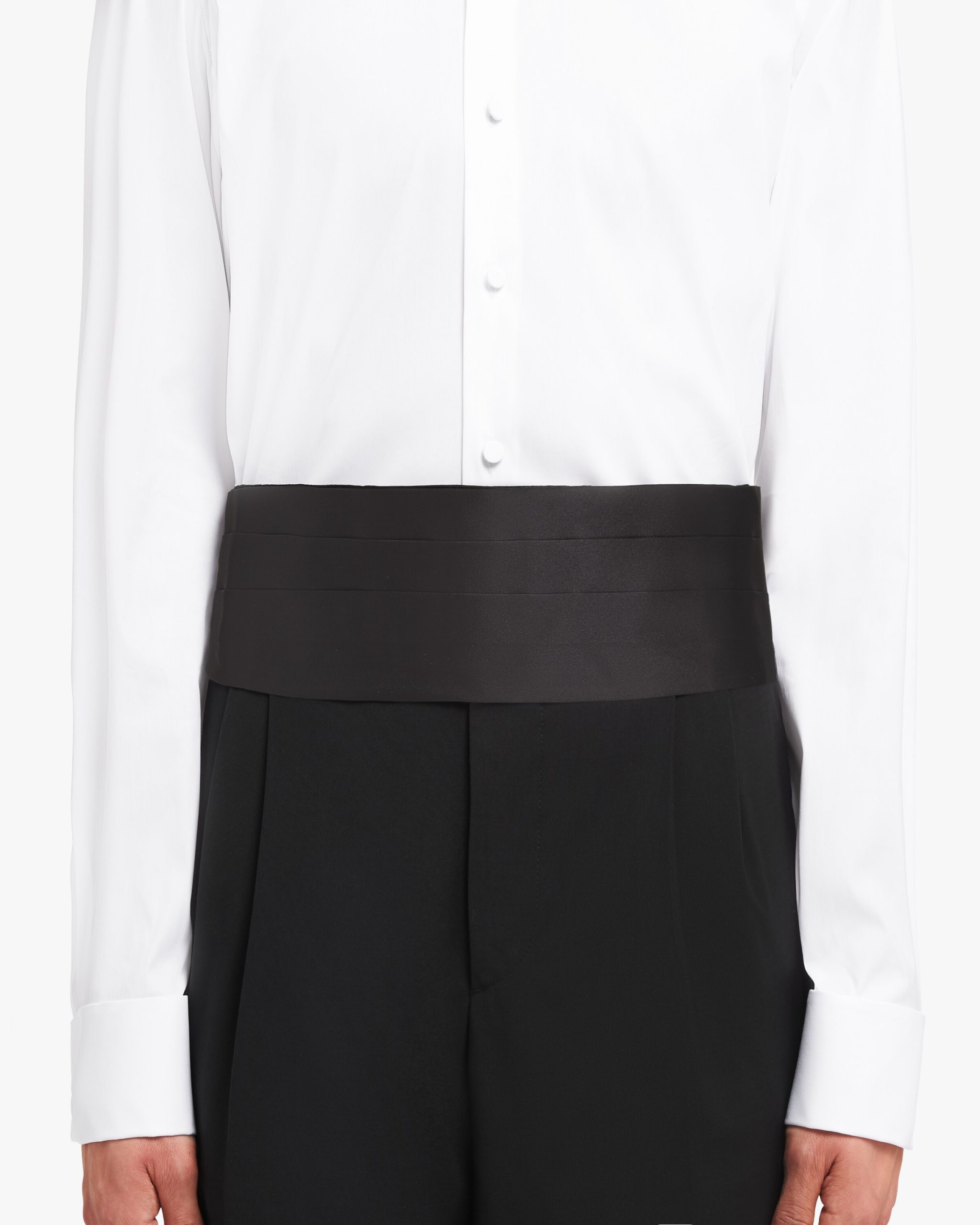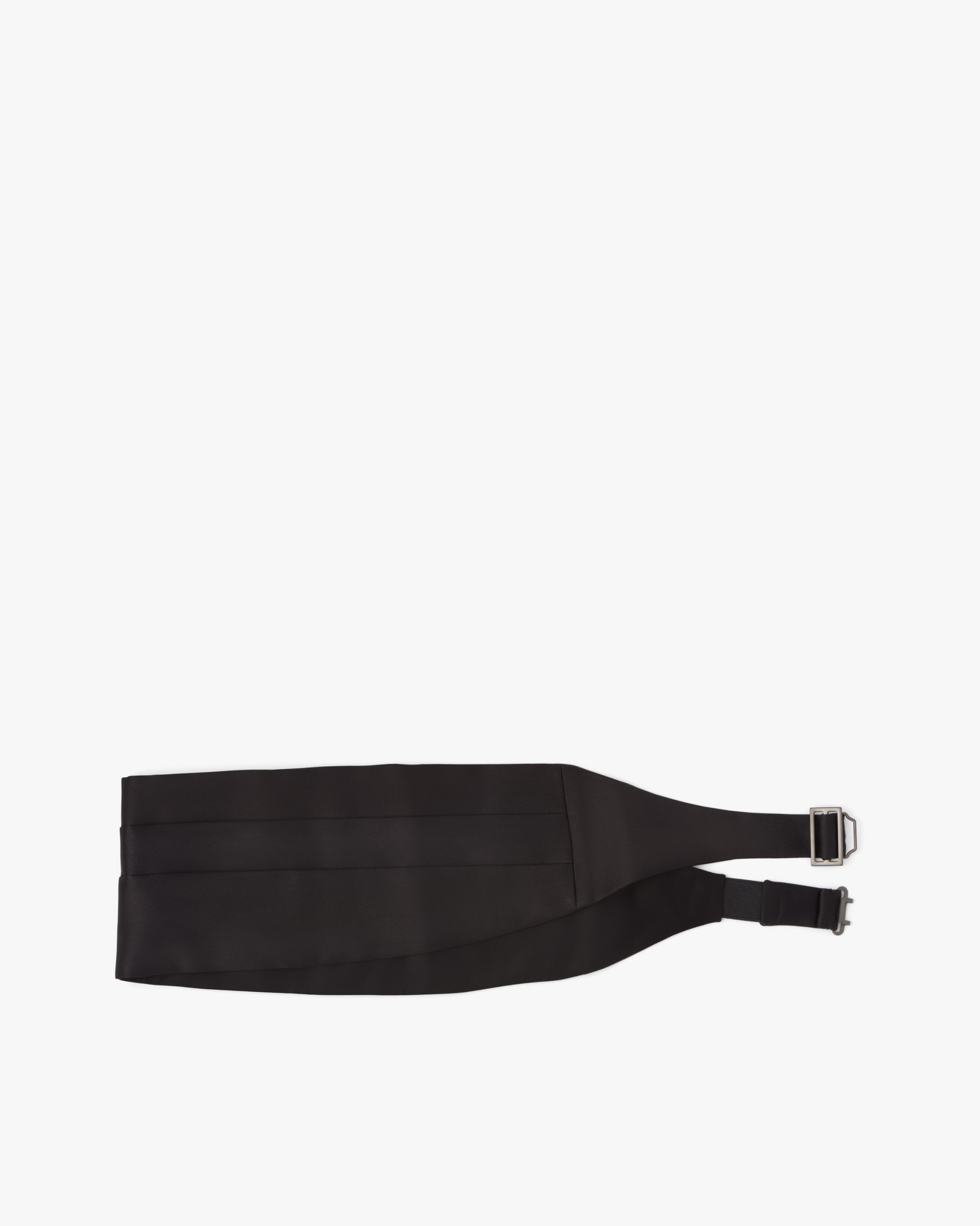 The classic satin tuxedo cummerbund has an adjustable tab closure with hooks.