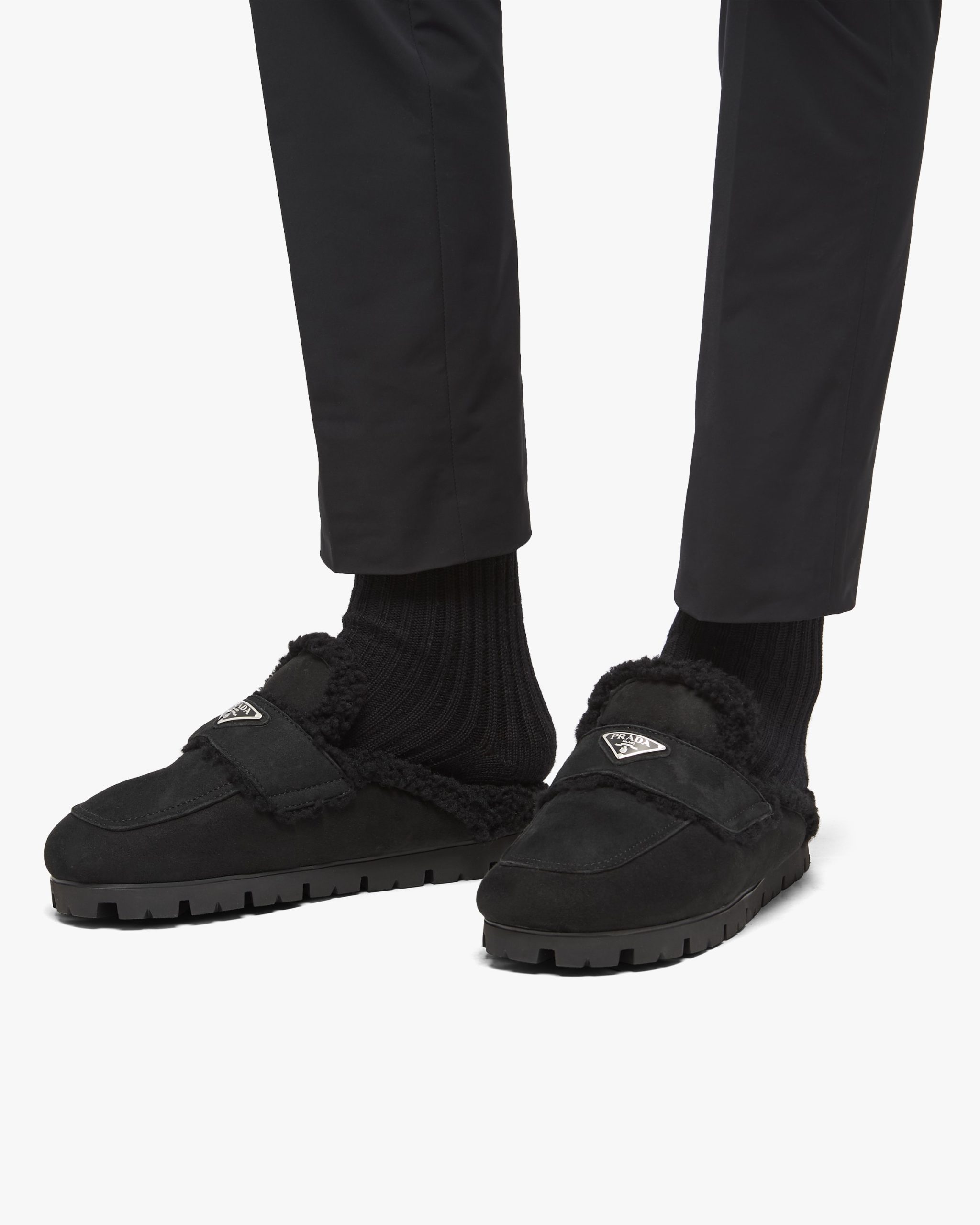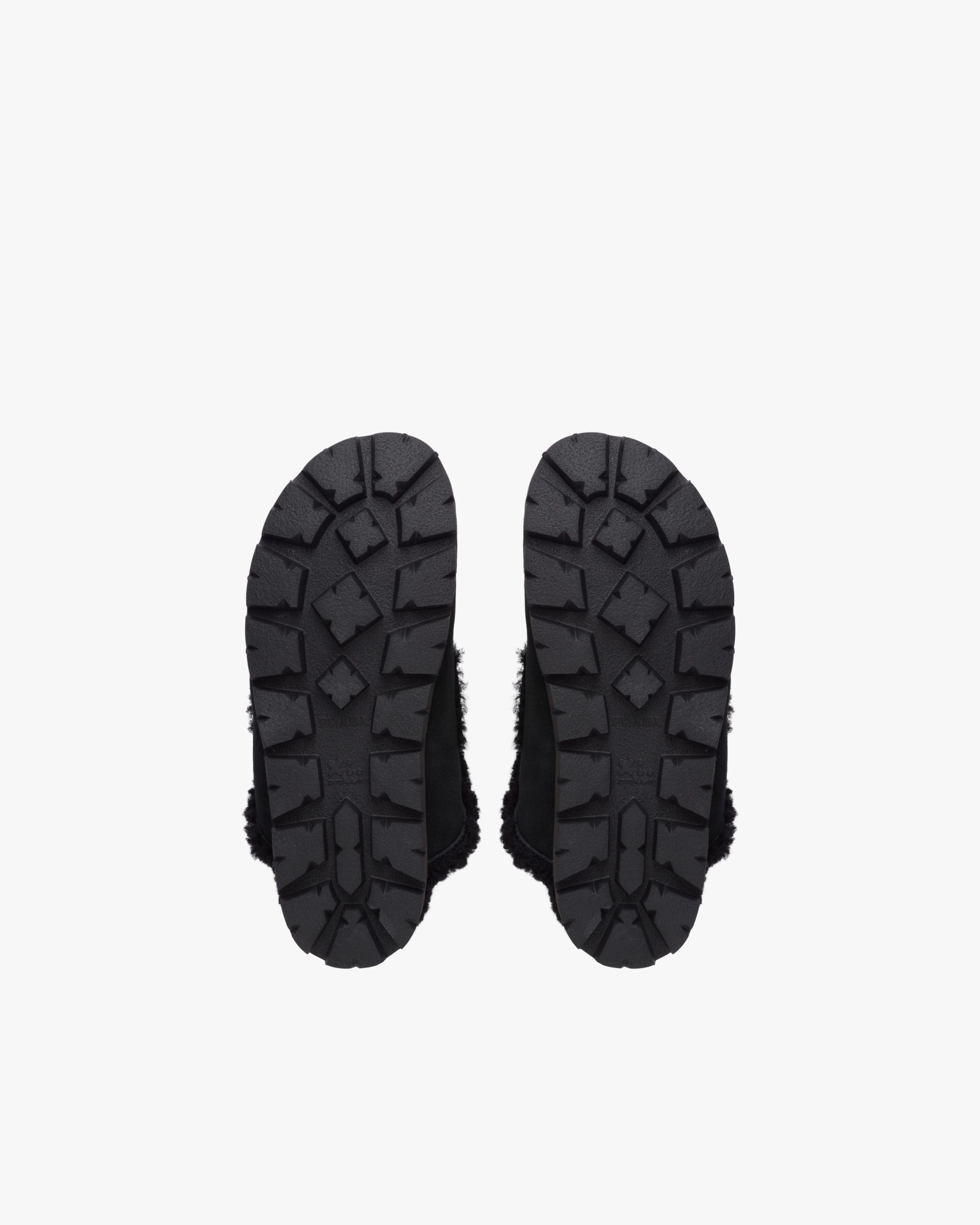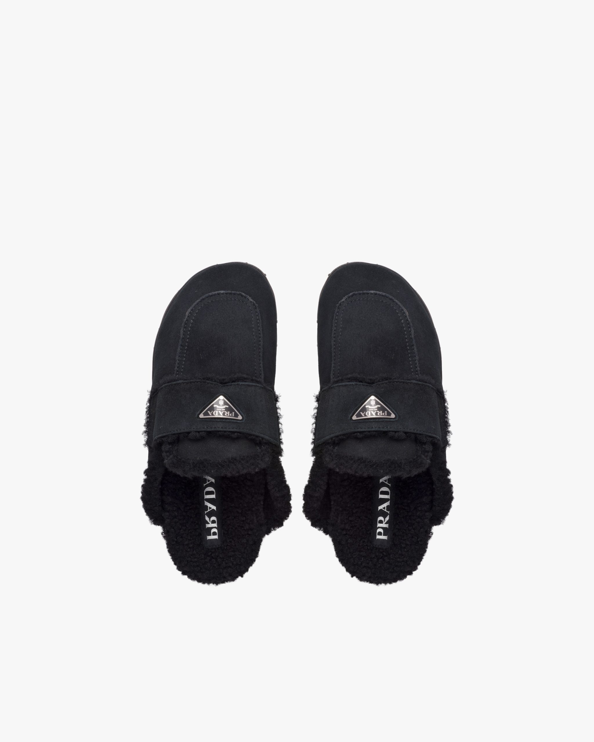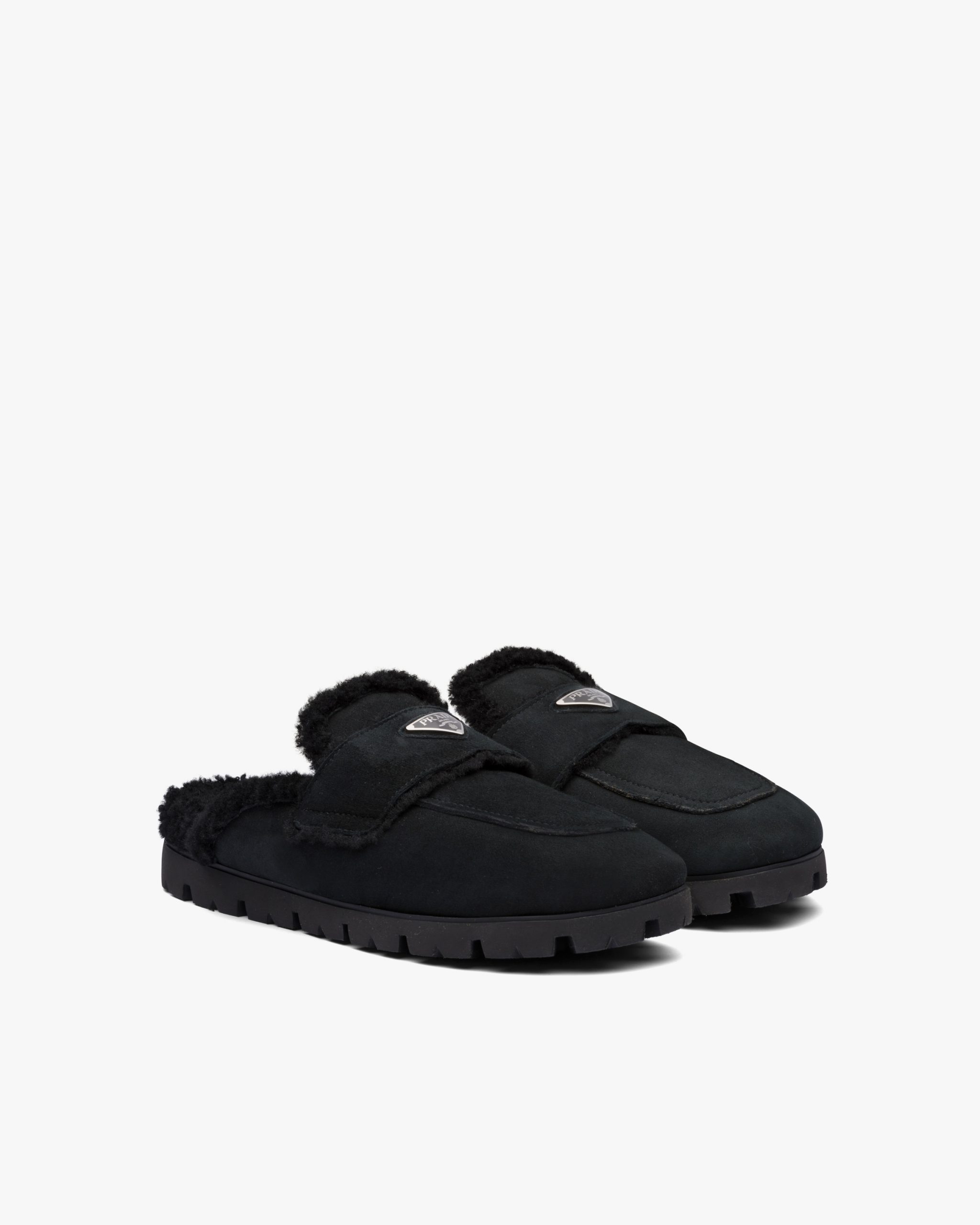 These shearling sabots embody an aesthetic and stylistic duality, combining contemporary urban design with typical alpine materials. The iconic enameled metal triangle logo decorates the product.