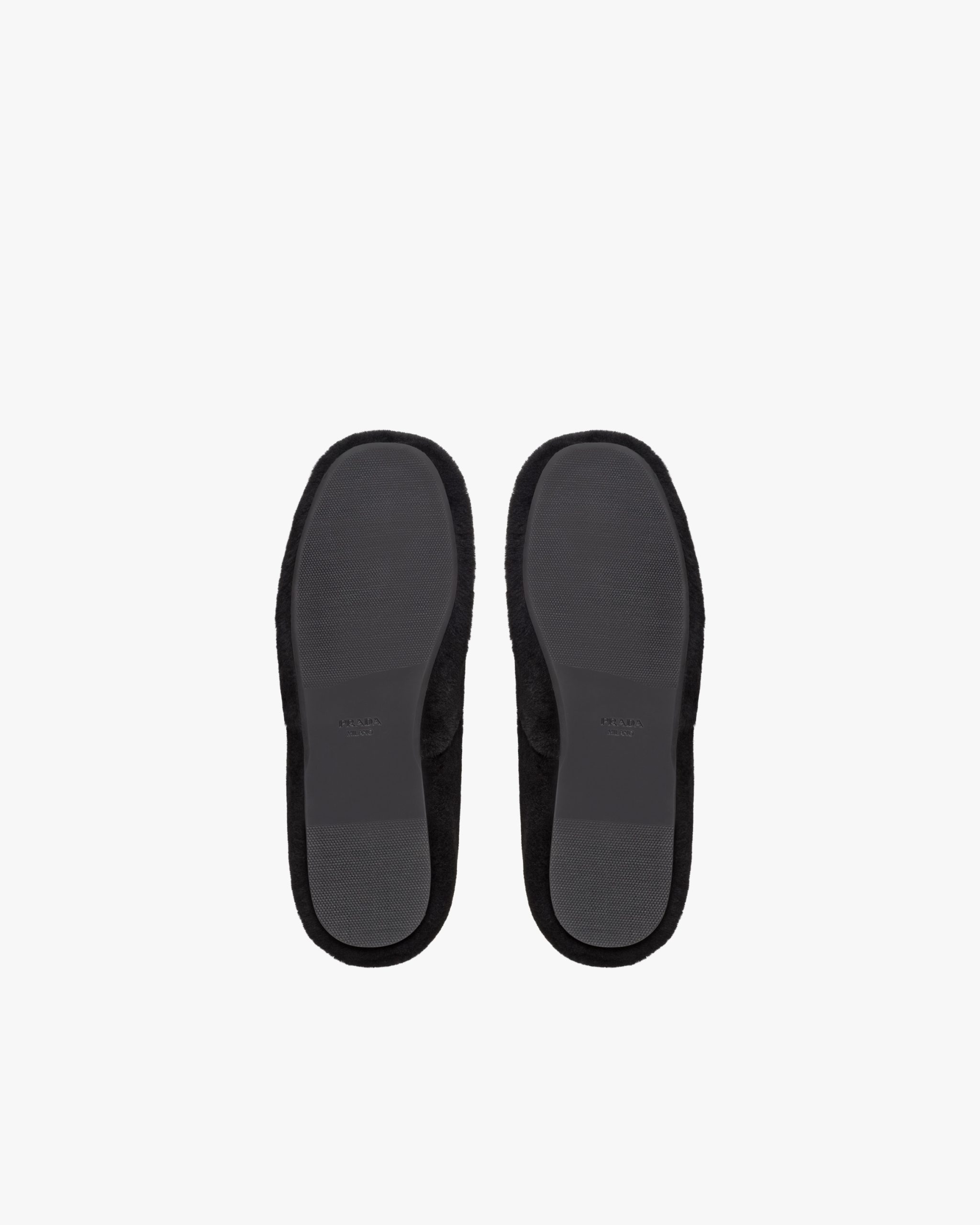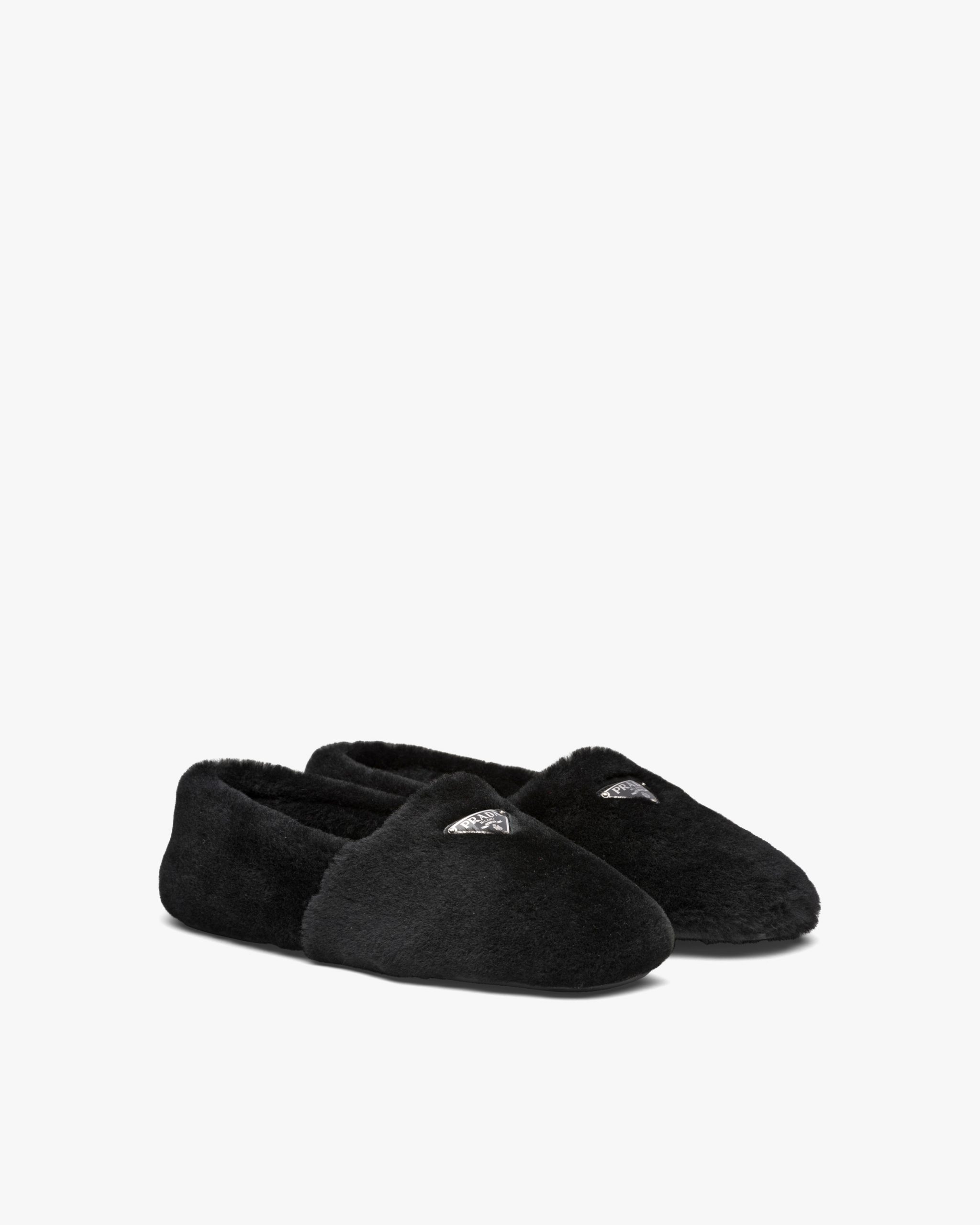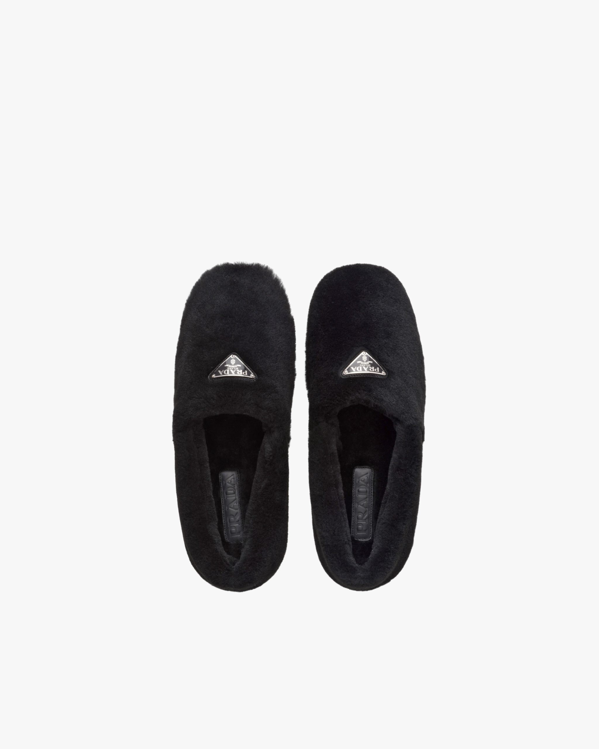Freedom of movement, comfort and coziness are key concepts in the design of these shearling sabots. The enameled triangle logo accentuates the sophisticated allure of these shoes.