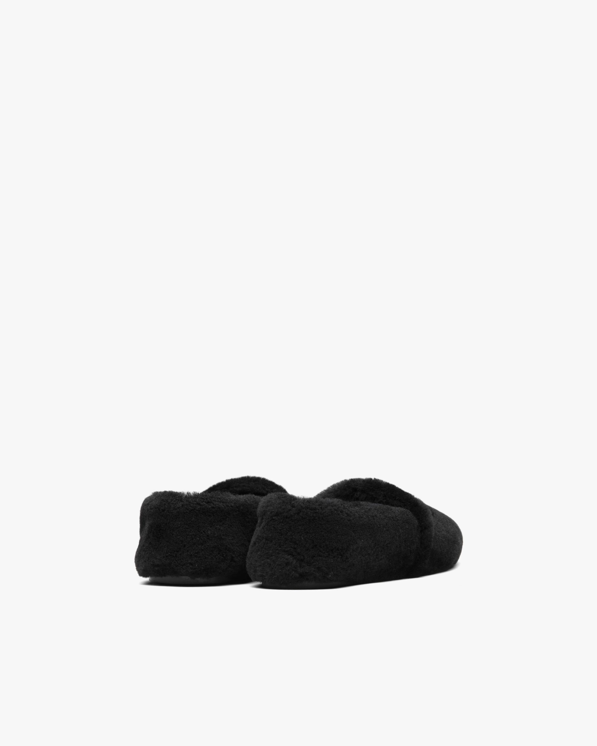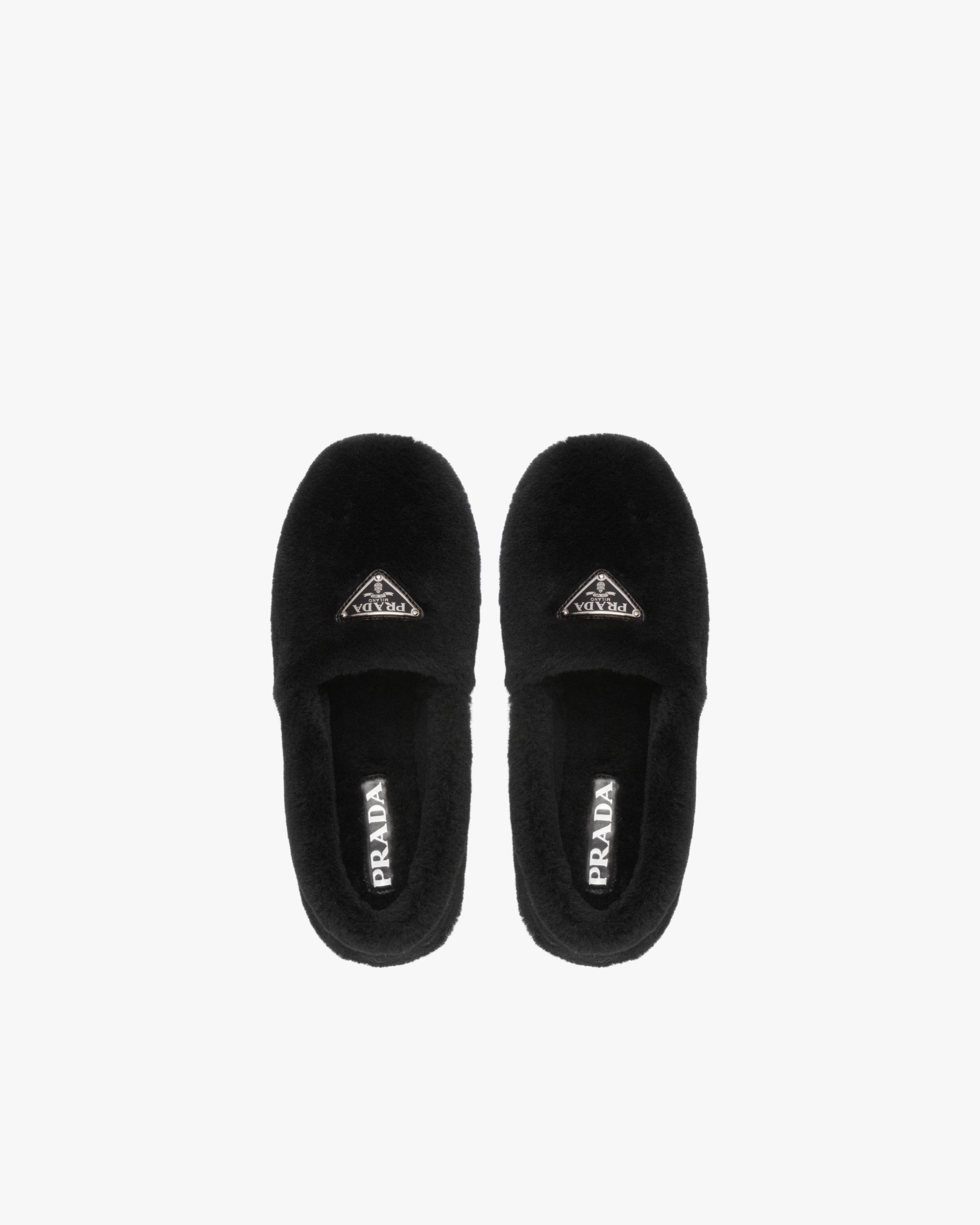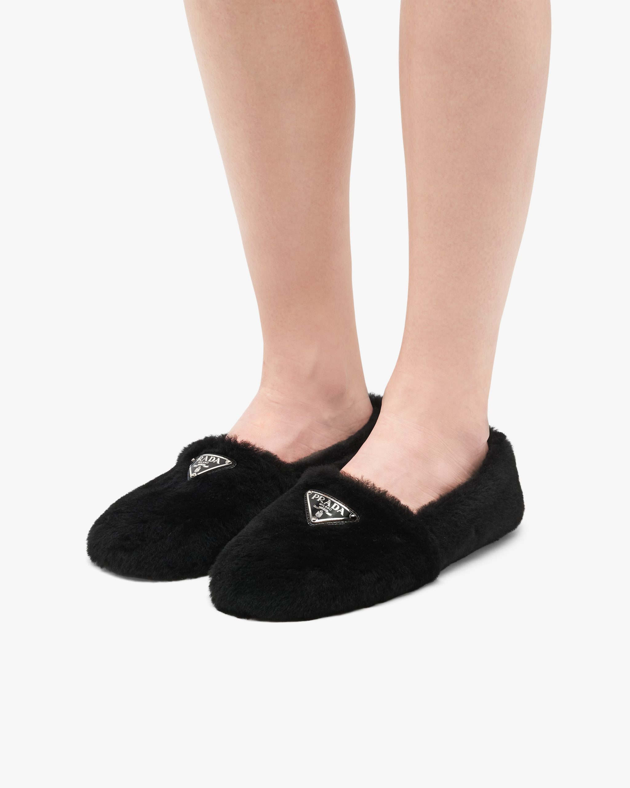 Freedom of movement, comfort and coziness are key concepts in the design of these shearling slippers. The enameled triangle logo accentuates the sophisticated allure of the footwear.