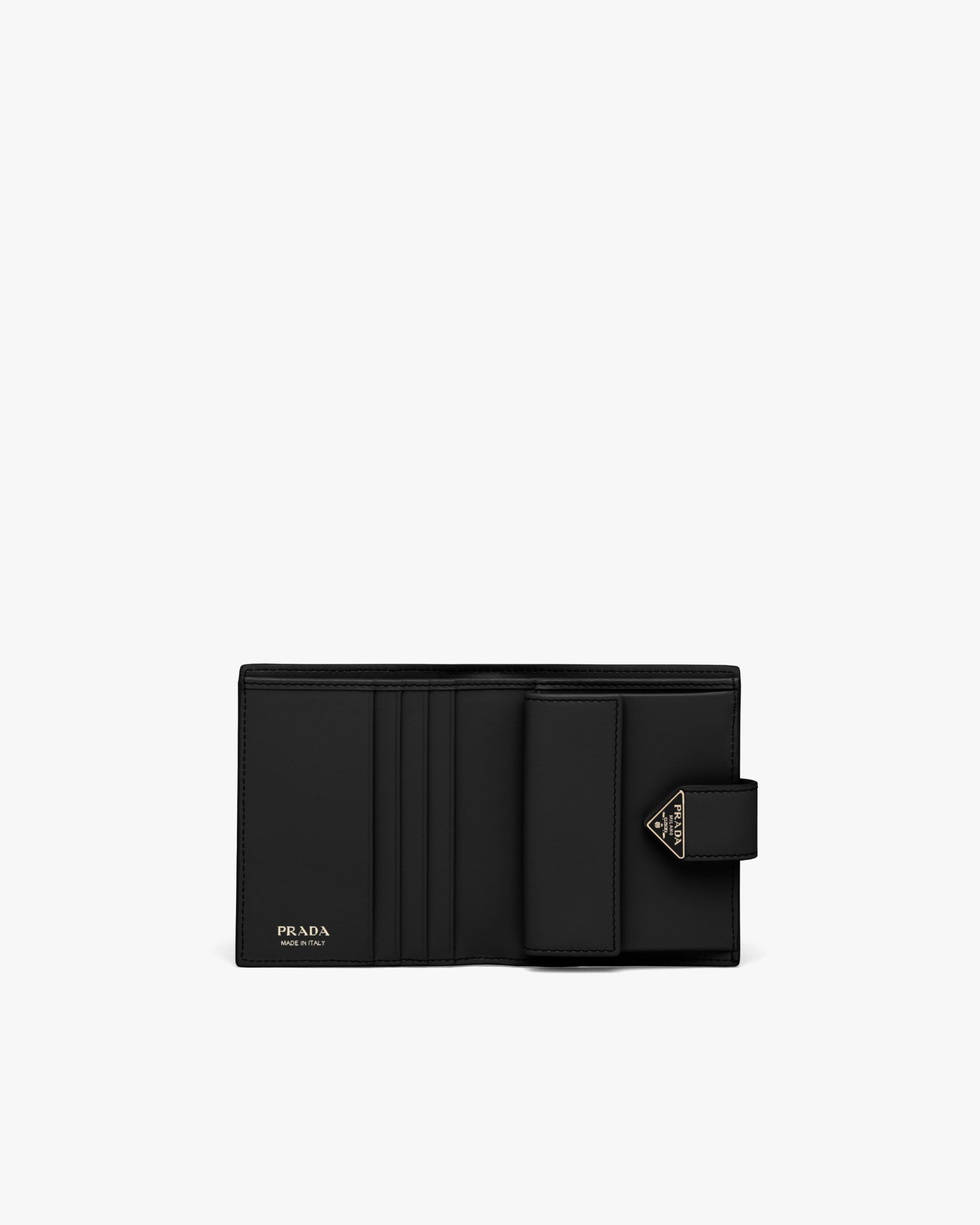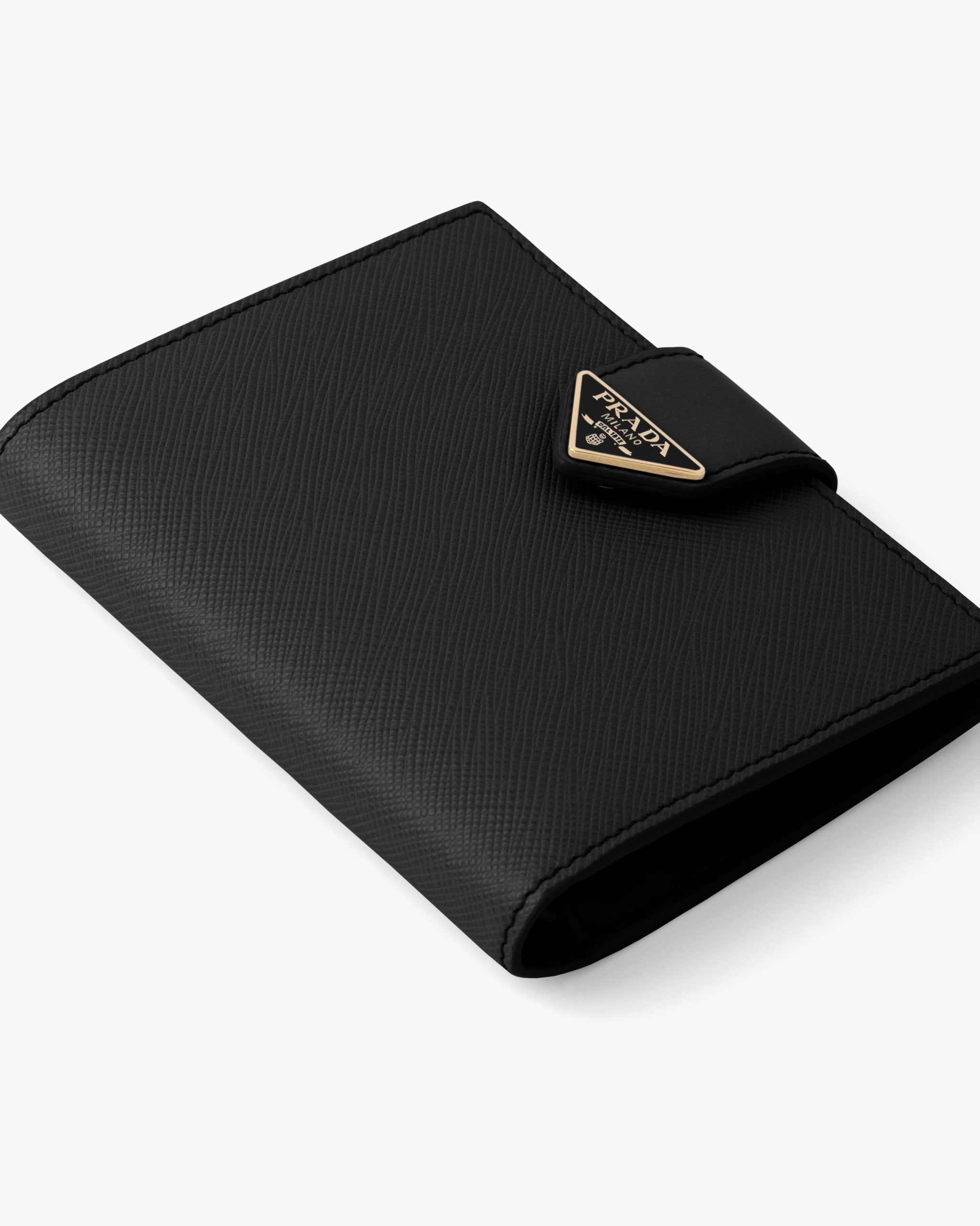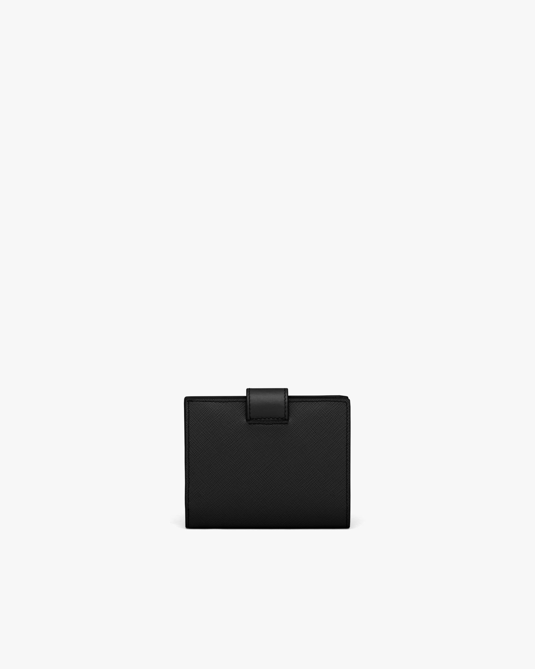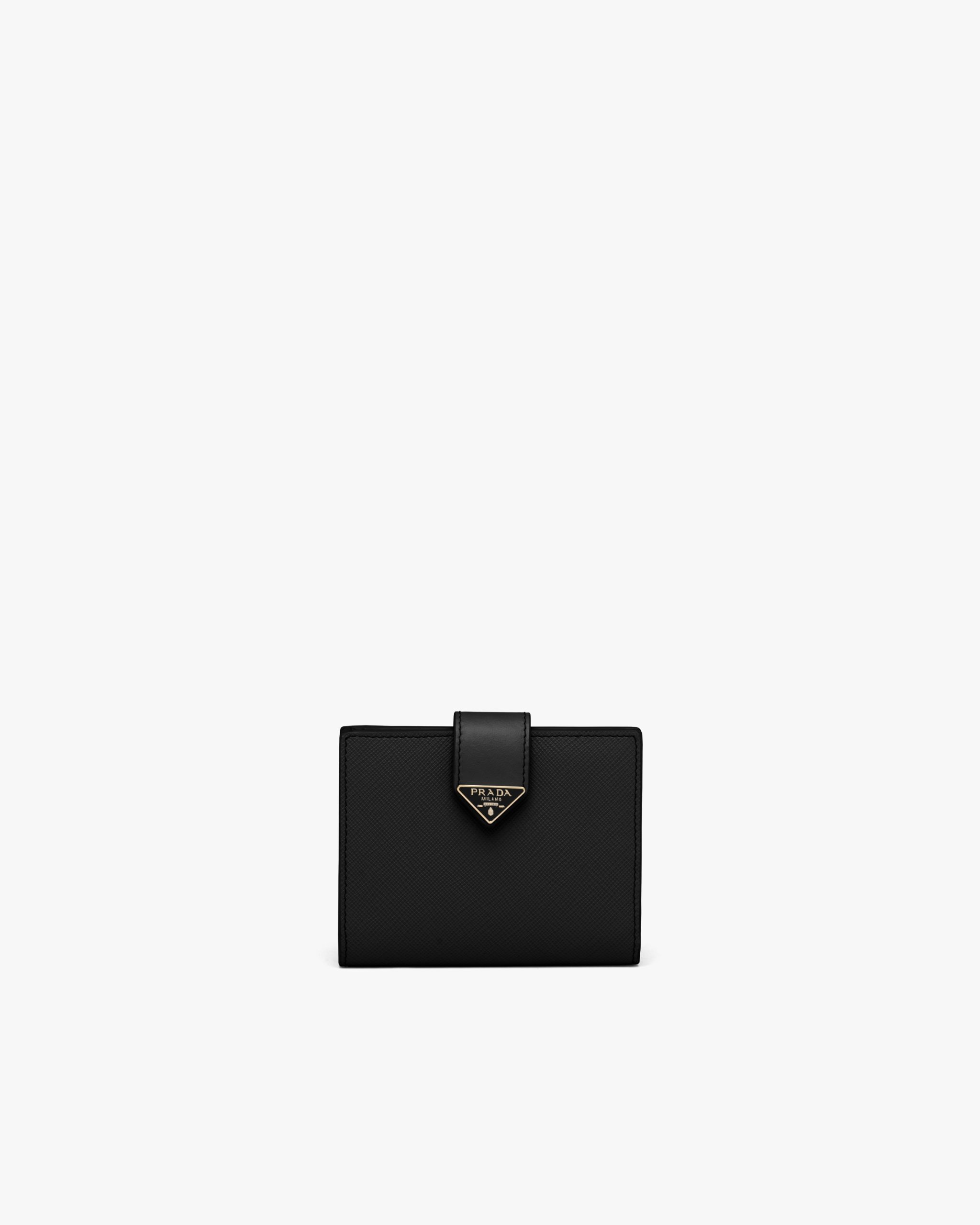 This small wallet with sleek elegance comes in a combination of smooth and Saffiano leather, an iconic Prada material with a crosshatch texture. Characterized by its minimal design and equipped with several compartments and pockets, the accessory is accented with the iconic enameled triangle logo of the brand embellishing the closure.