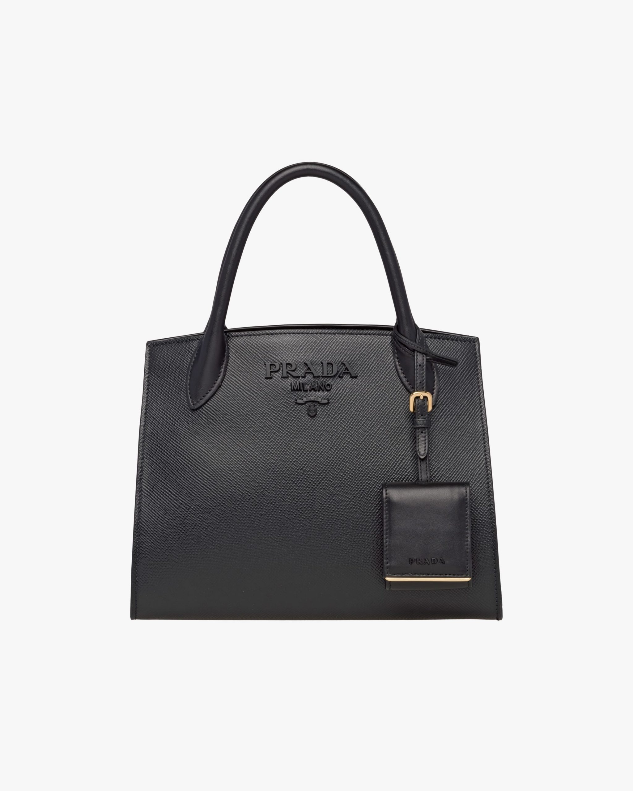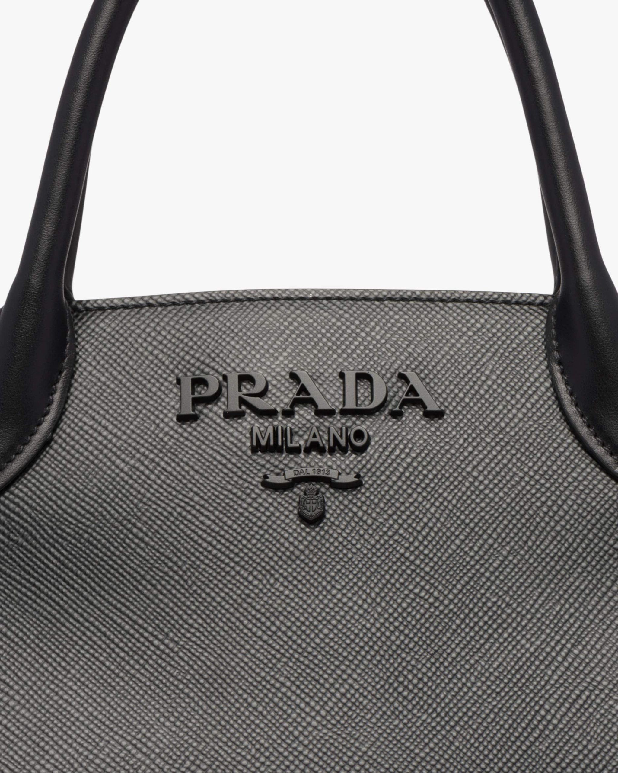 The refined front of the bag is completely monochrome. Made of fine Saffiano leather, it is characterized by the distinctive tone-on-tone effect of the metal lettering logo.