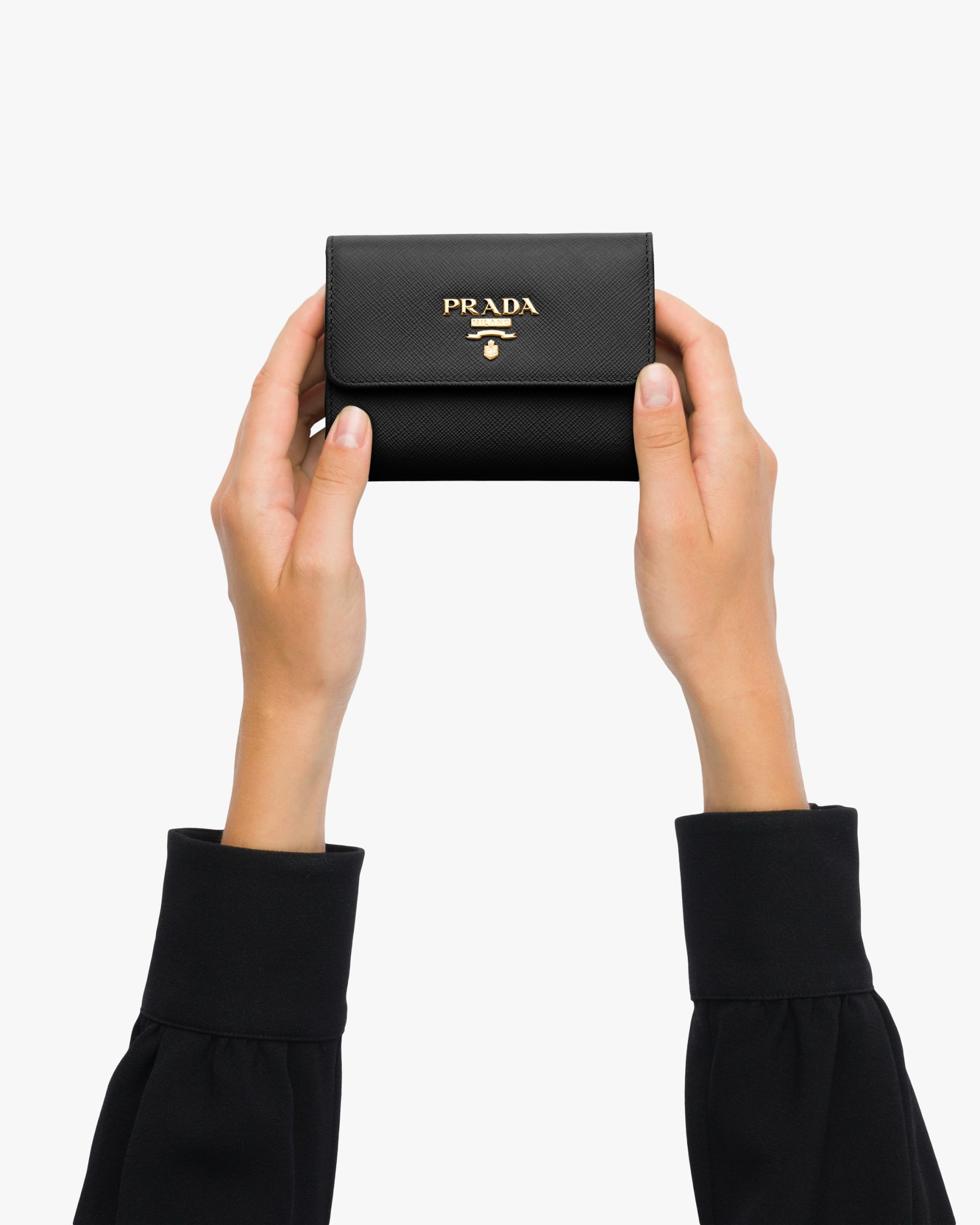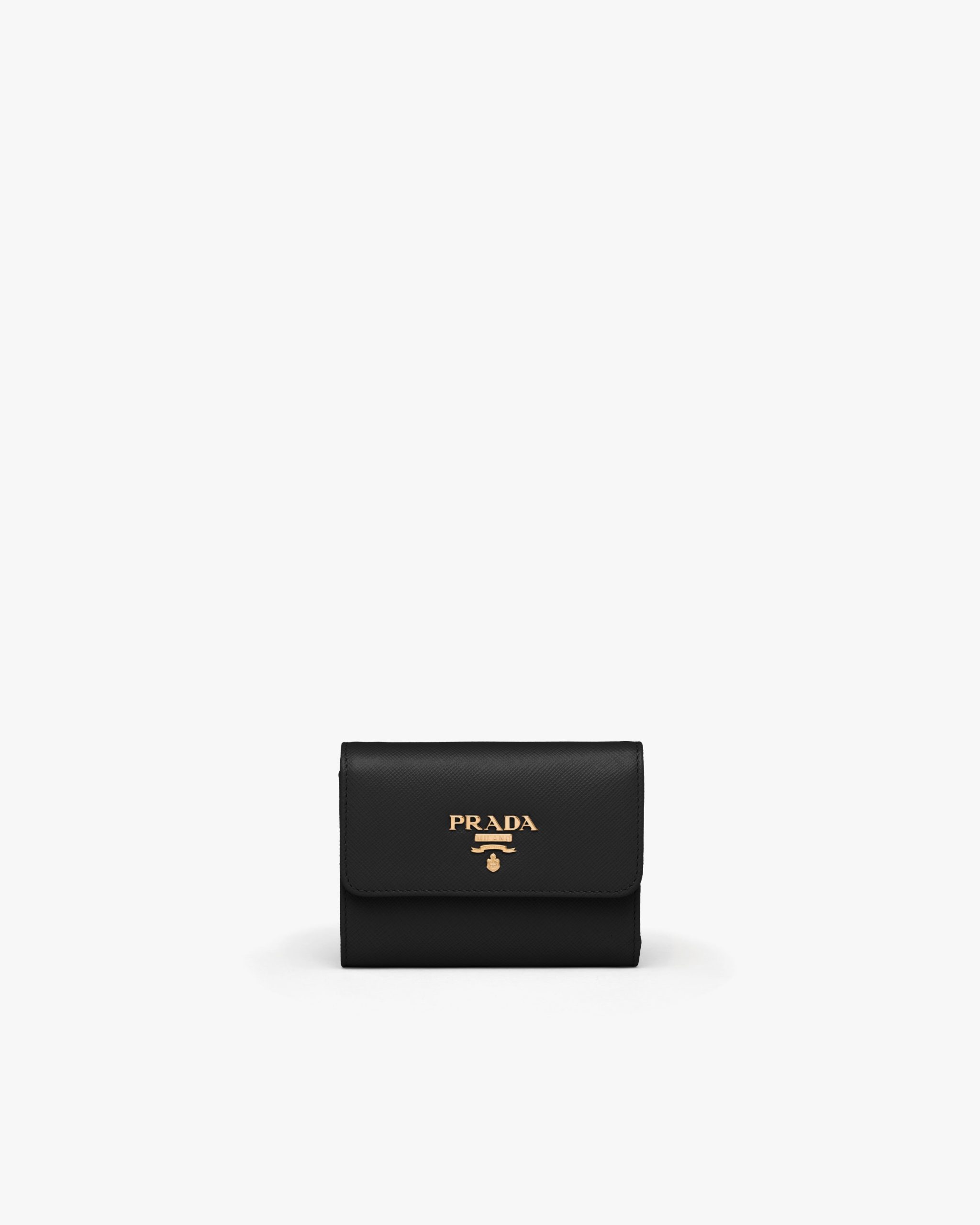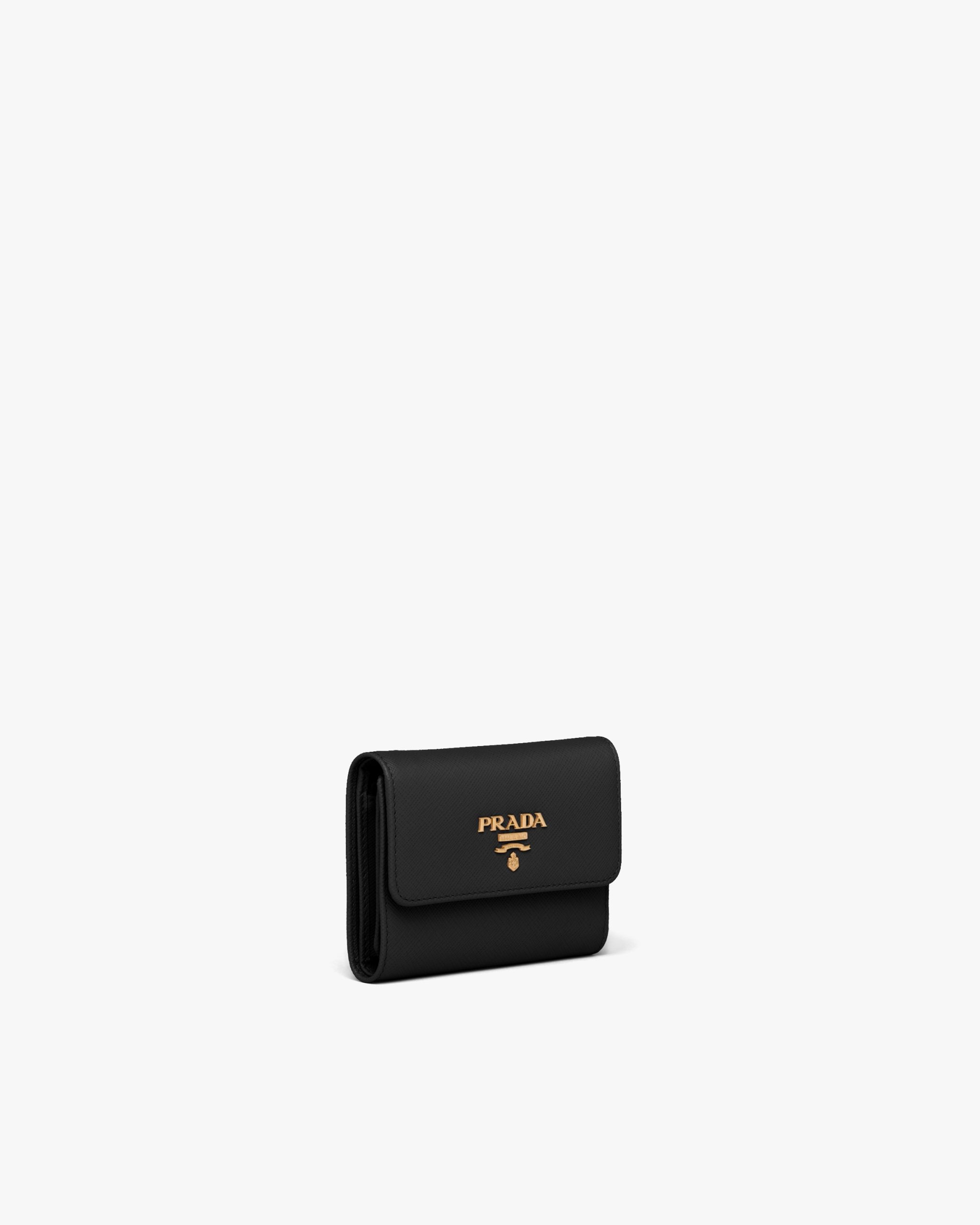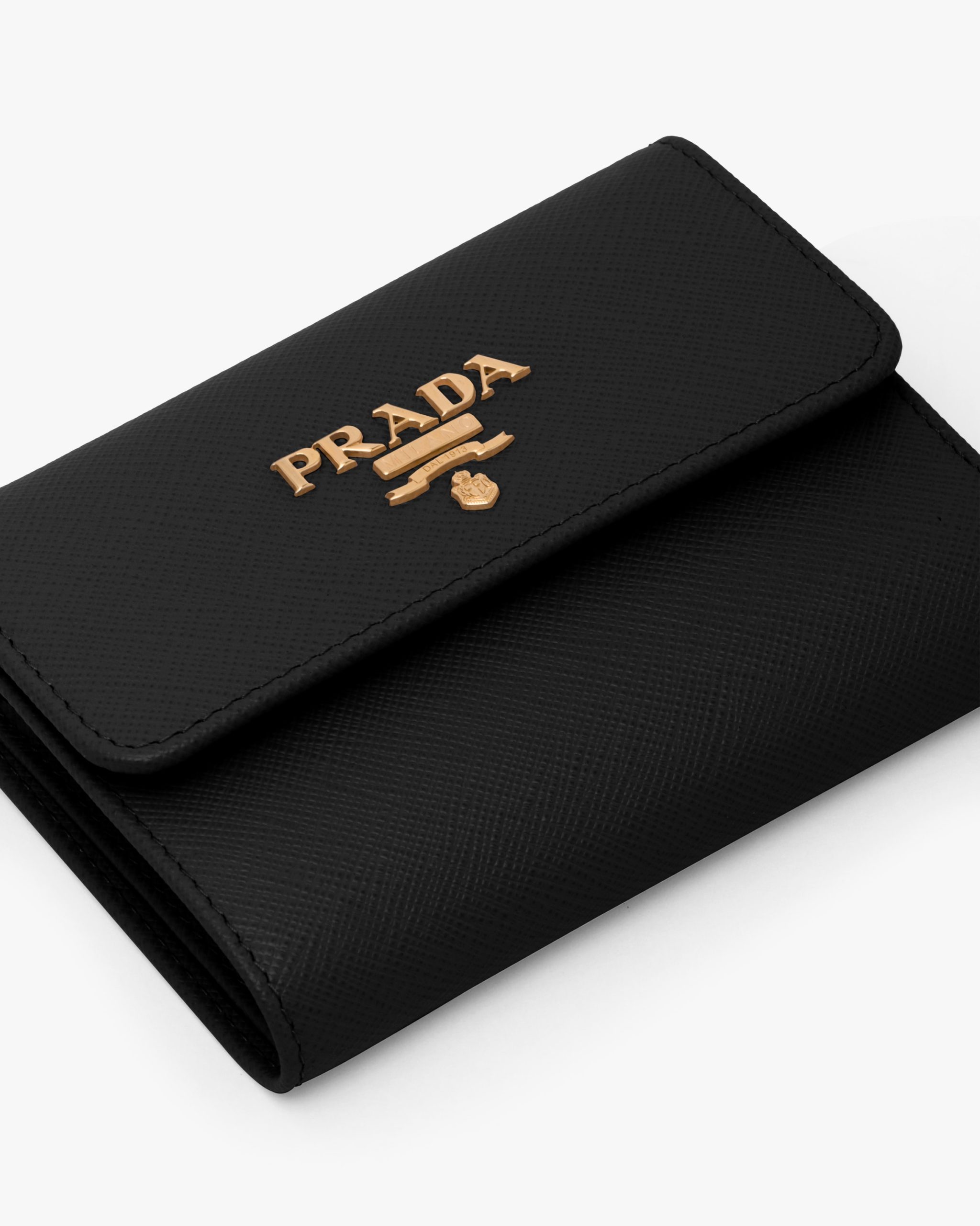 This Saffiano leather wallet with the metal logo on the front flap has a compact, modern design.