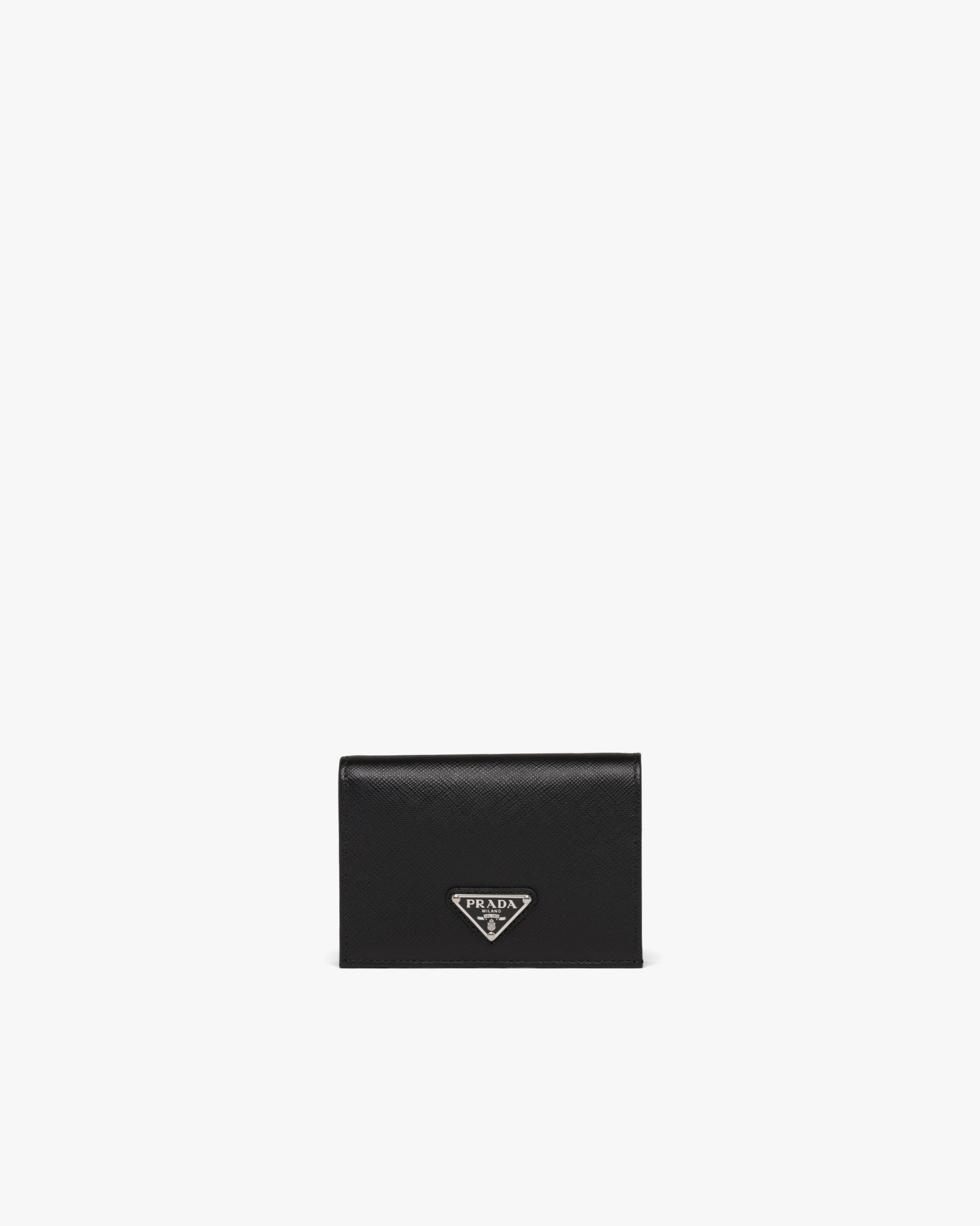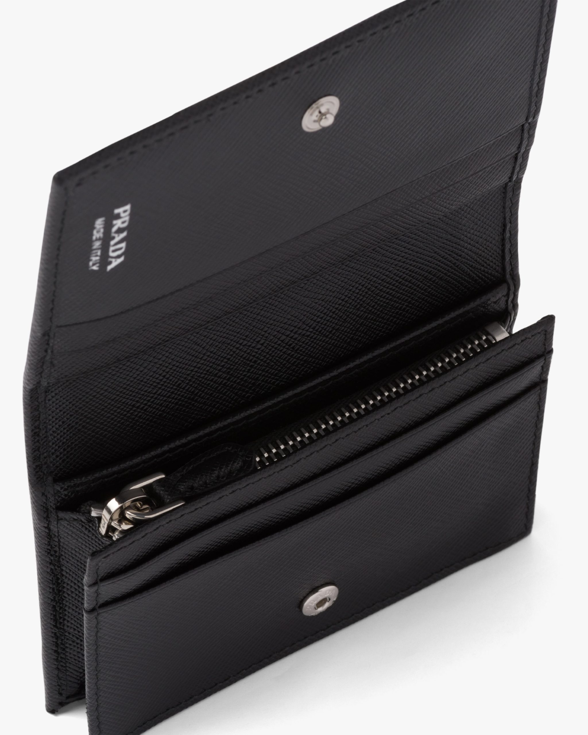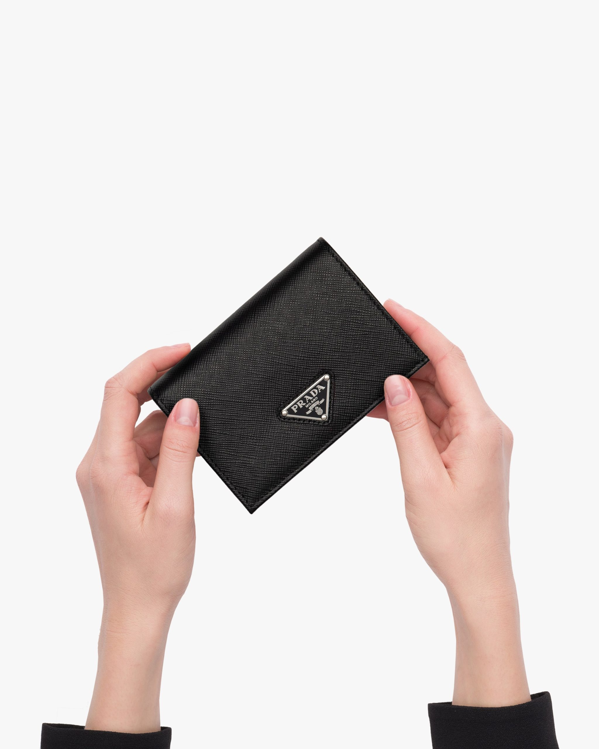 This Saffiano leather wallet with enameled metal triangle logo expresses sleek elegance. The accessory with clean lines has a zipper coin compartment, bill compartment, and five card slots.