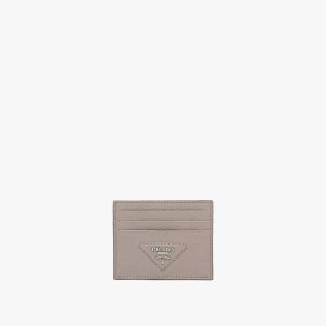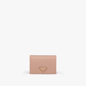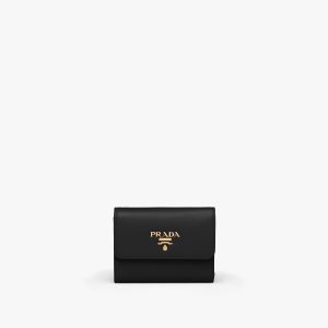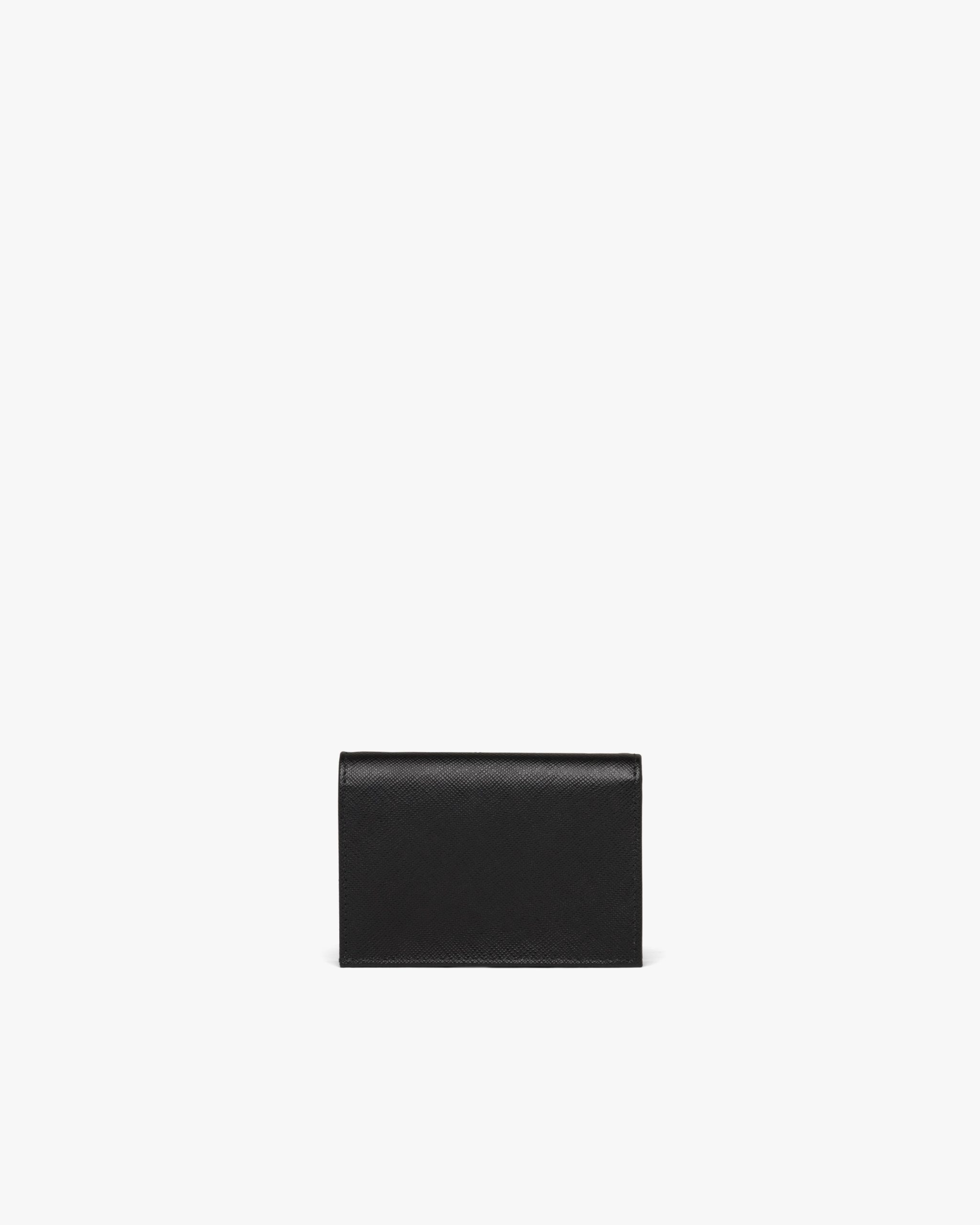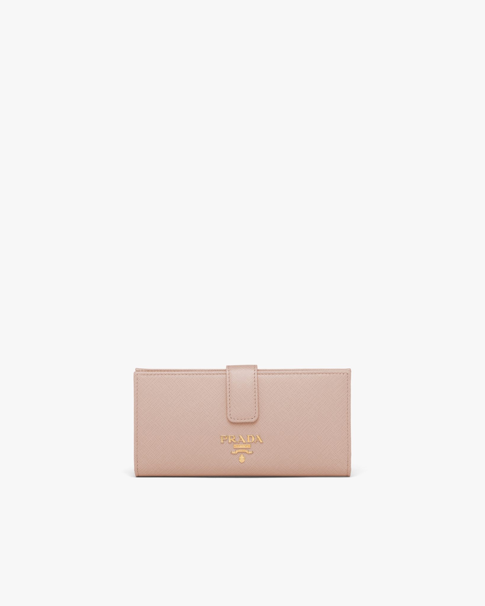 This Saffiano leather wallet with enameled metal triangle logo expresses sleek elegance. The accessory with clean lines has a zipper coin compartment, bill compartment, and five card slots.