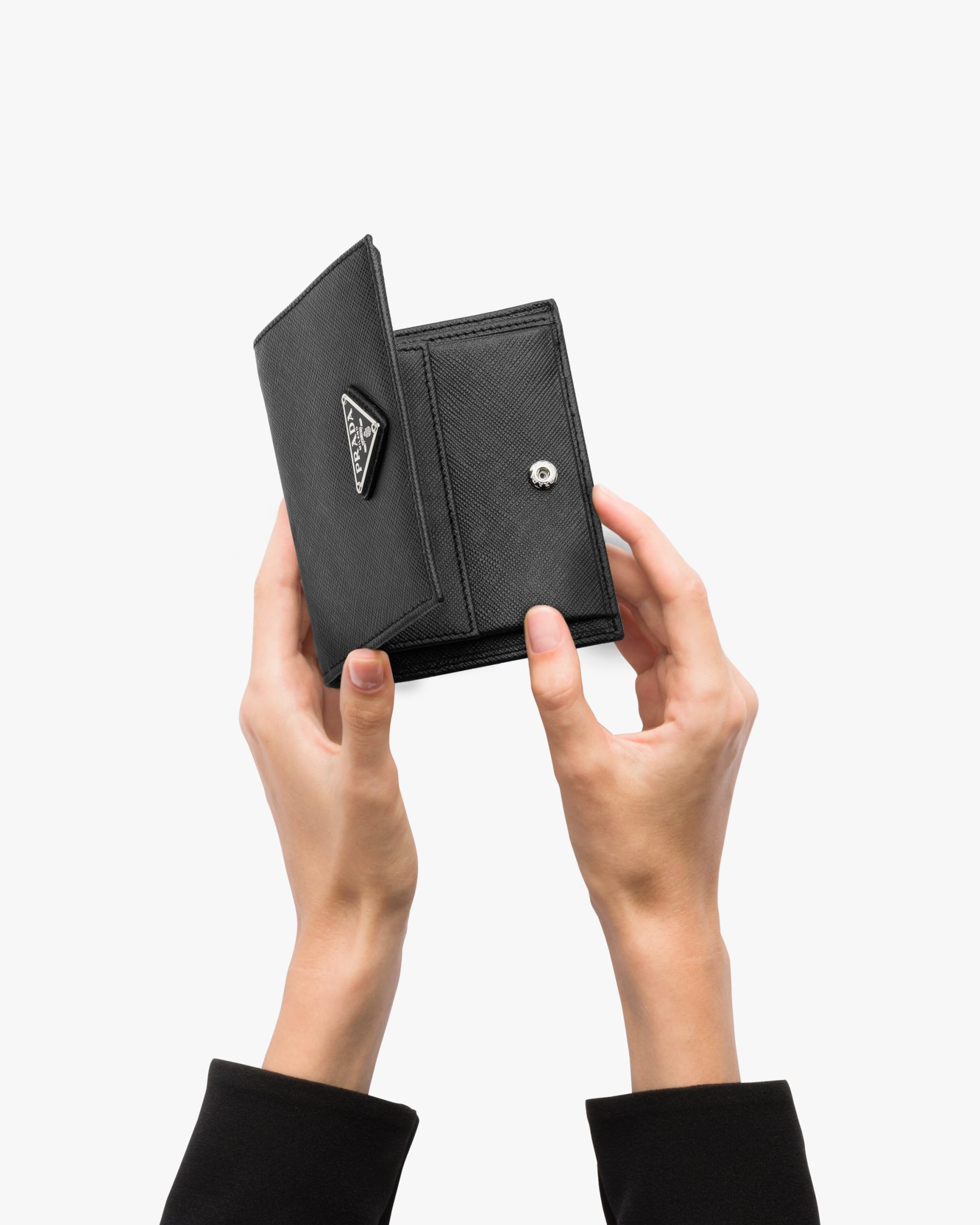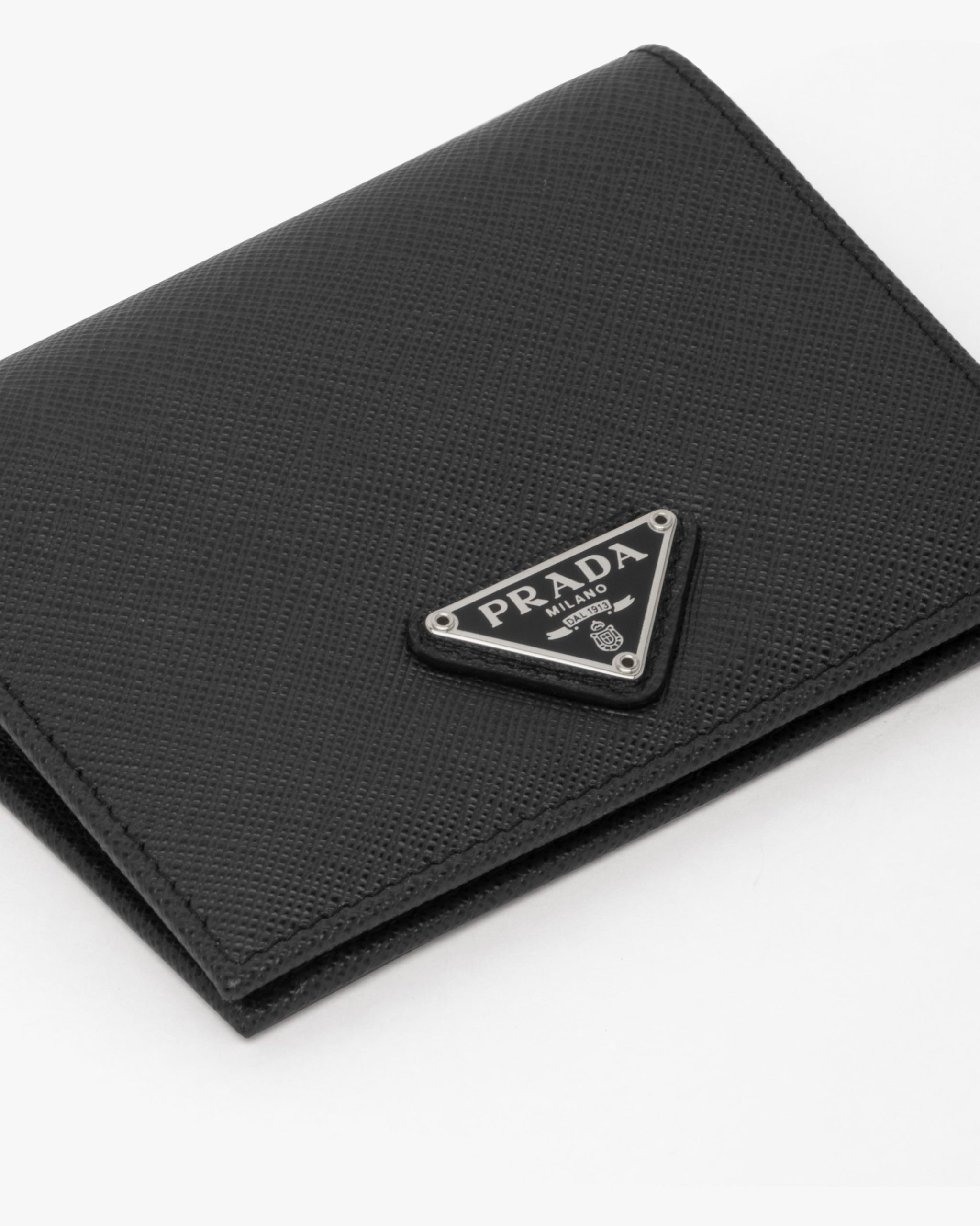 This luxurious Saffiano leather wallet is sheer elegance in a compact form. The accessory has several document pockets, credit card slots and bill compartment. Metal logo.