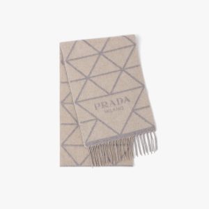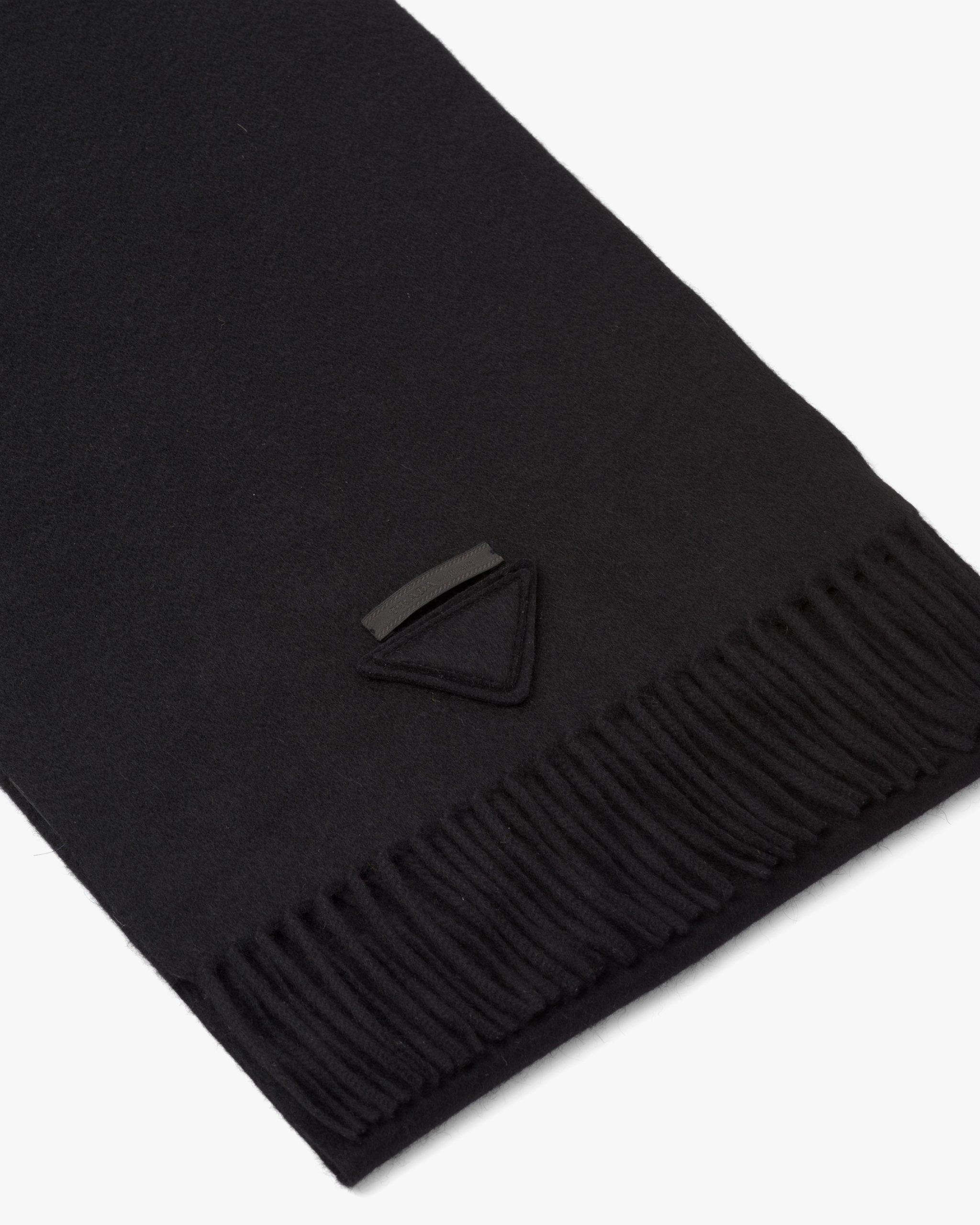 A delicate detail, the iconic triangle logo of Prada turns into a fabric appliqu? and decorates this soft cashmere scarf decorated with fringed edges.