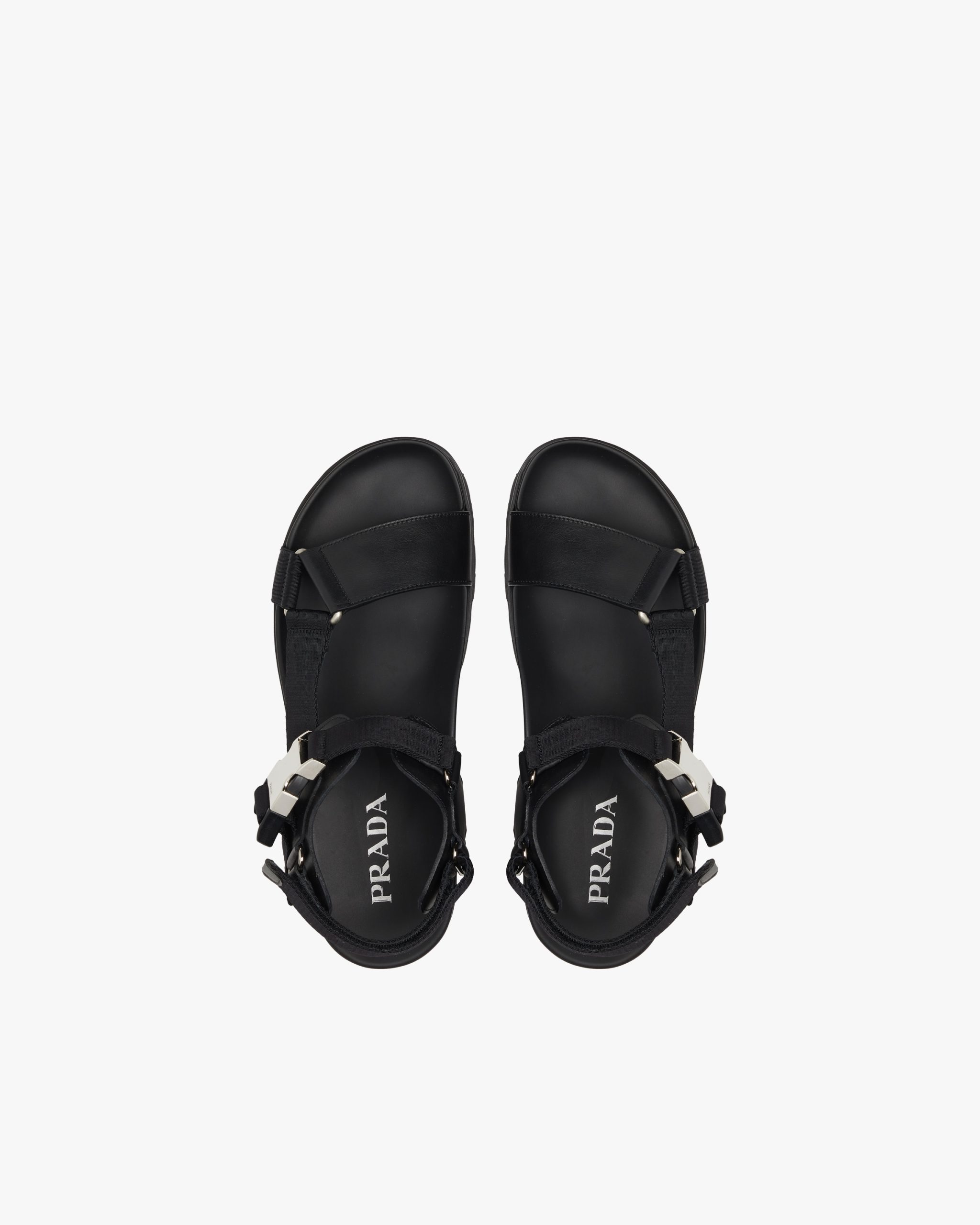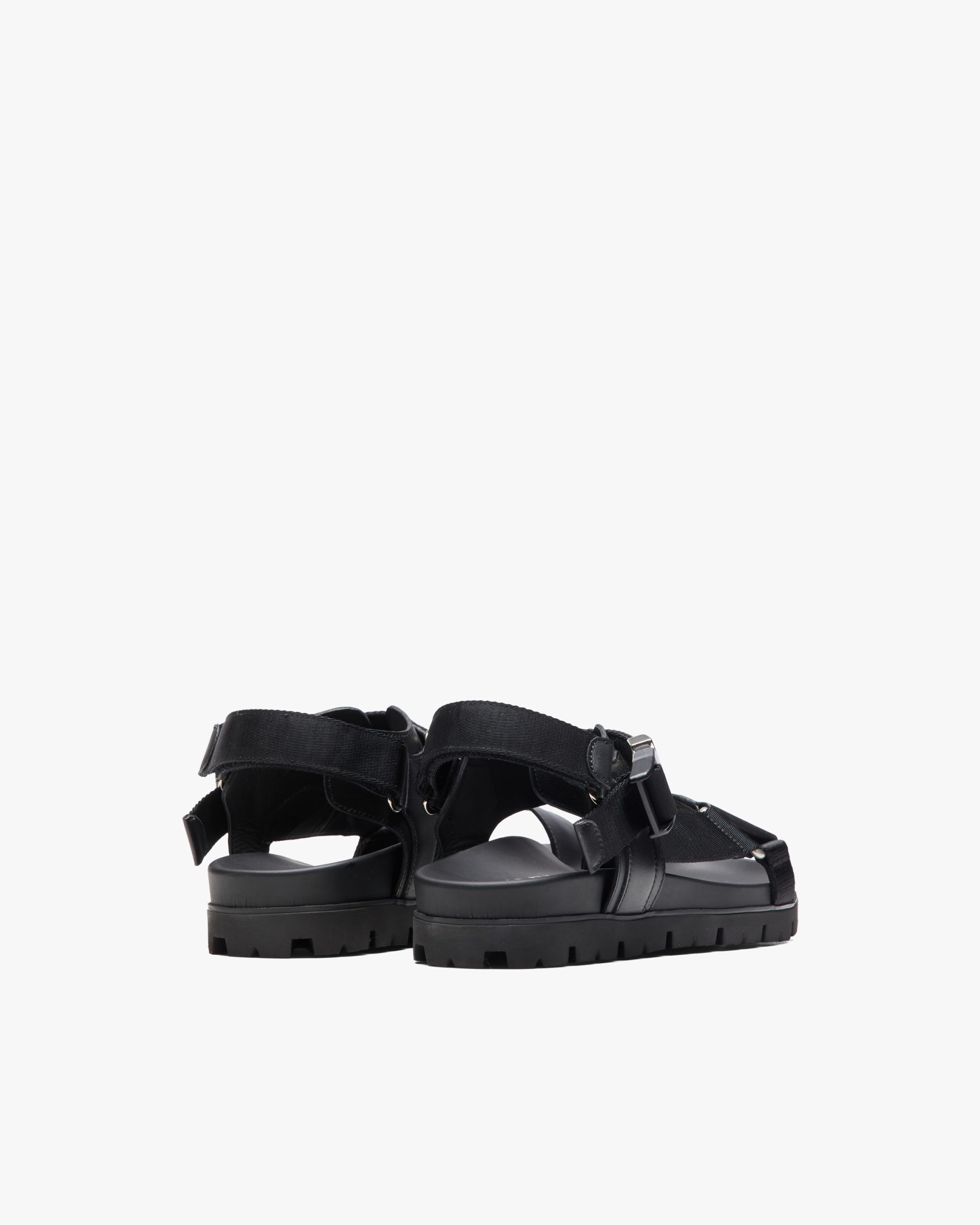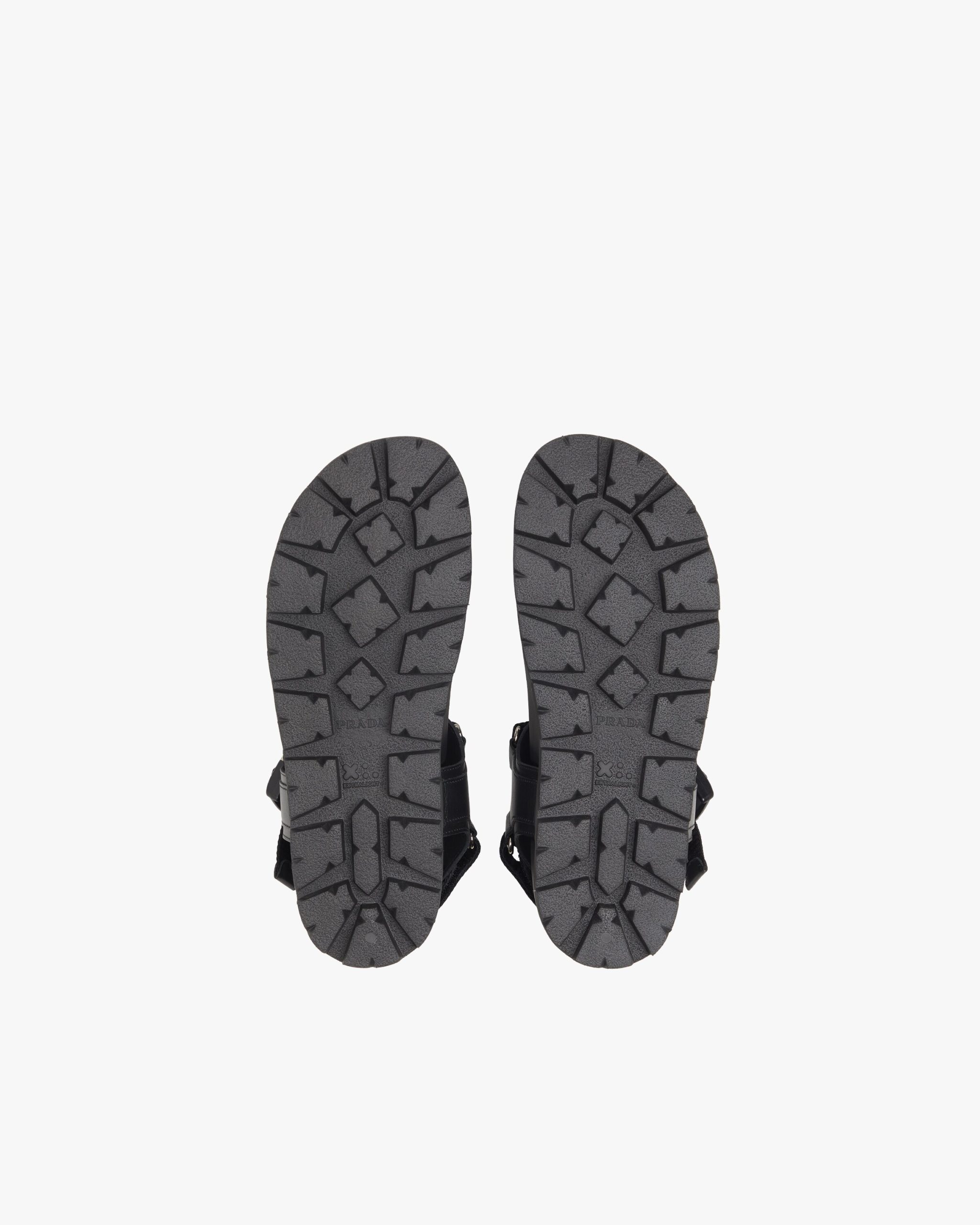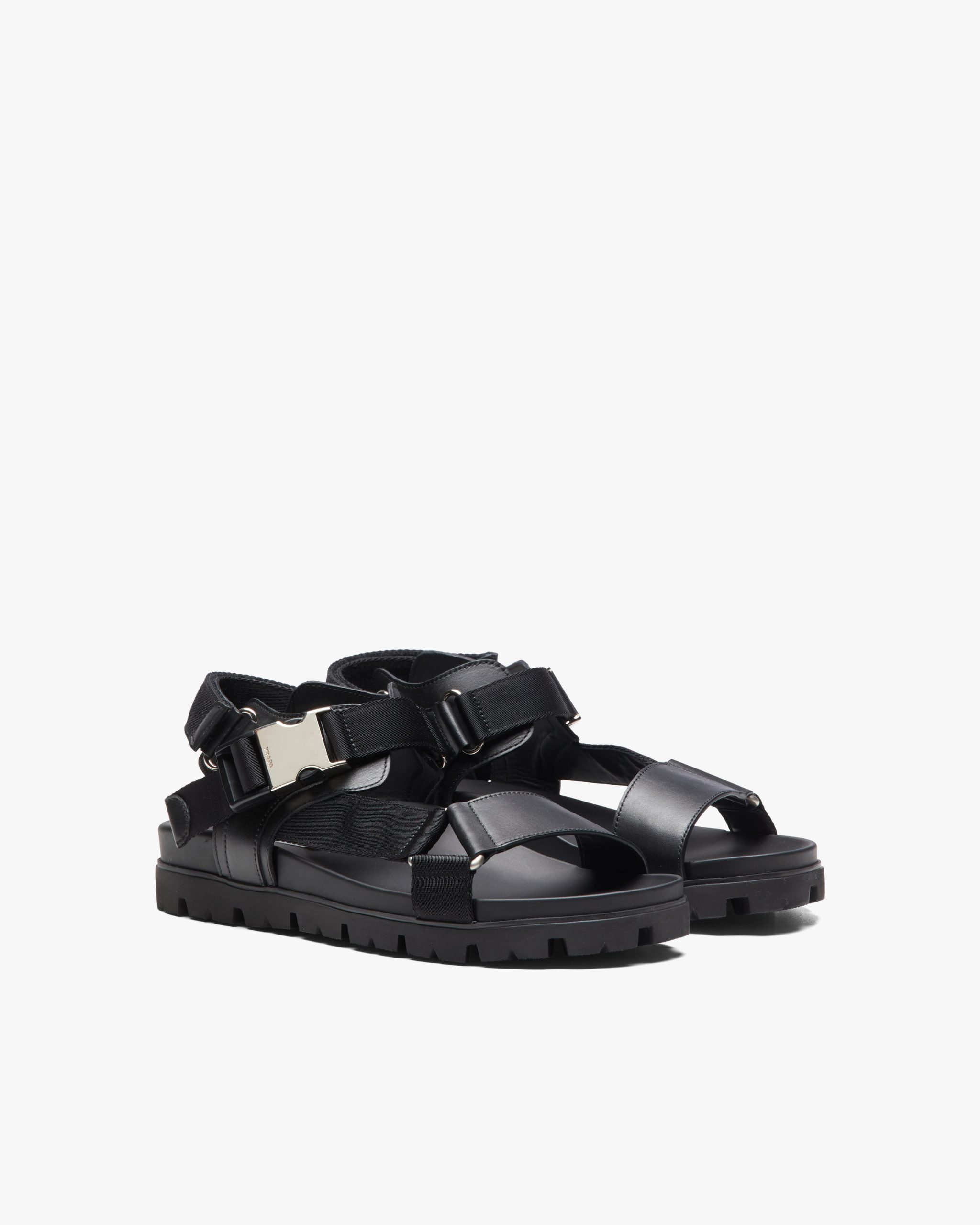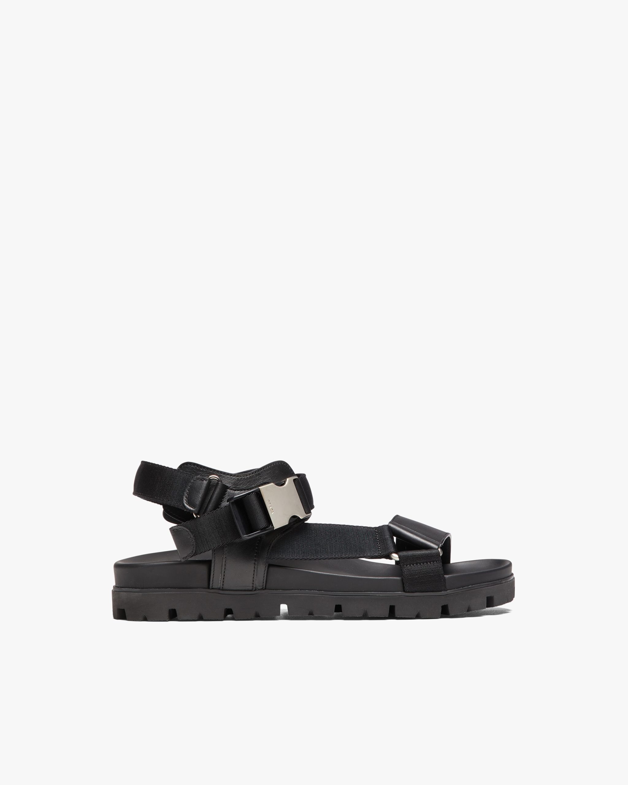 These leather and nylon tape sandals with modern elegance are characterized by the metal side-release buckle engraved with the Prada logo. The rubber lug sole contrasts with the minimalist, urban allure of the upper.