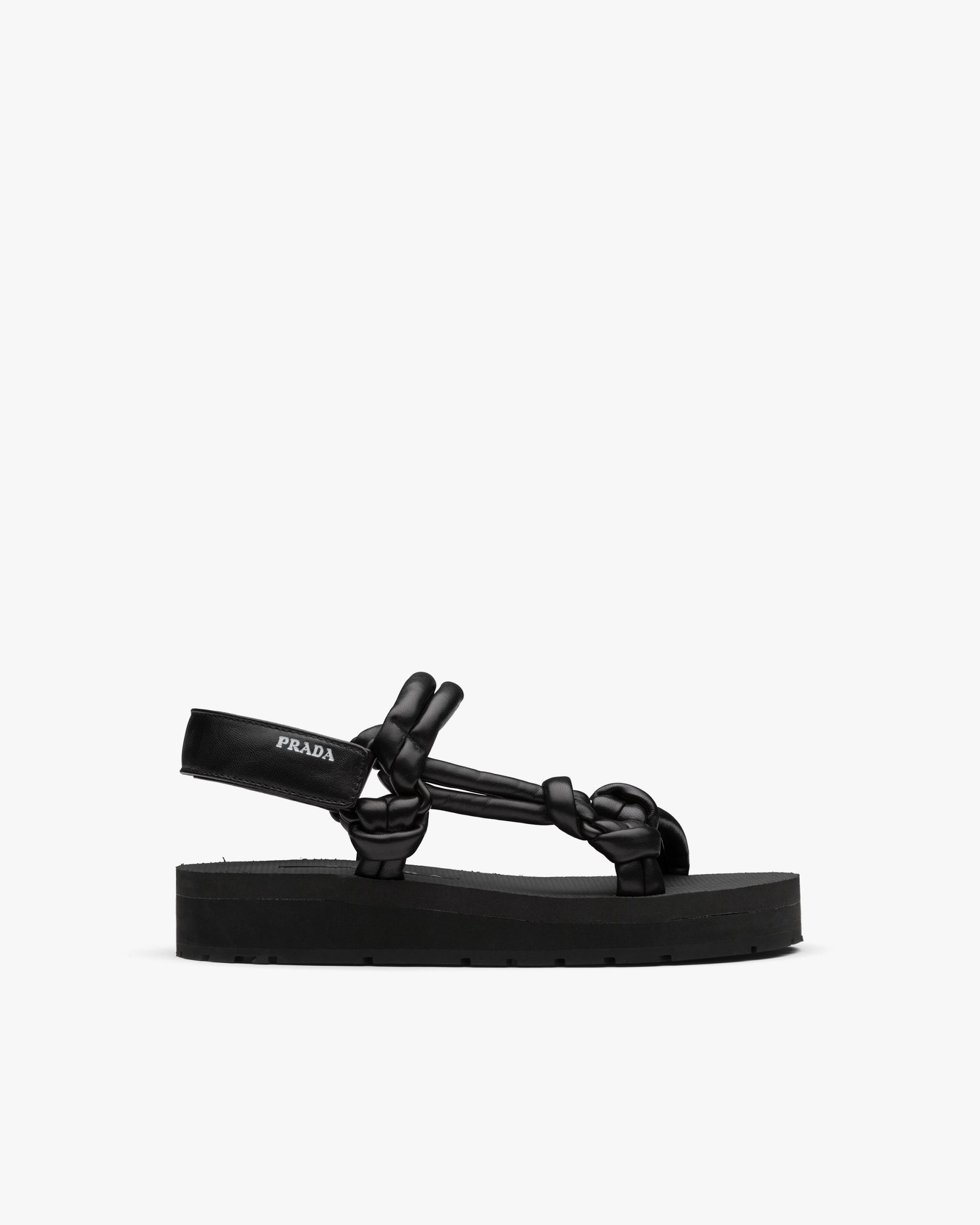 The hybrid concept, which is part of Prada’s genetic code, is translated in a design that blends different influences and contrasting materials to create interesting and unique combinations. Craftsmanship and a contemporary soul meet in this sporty sandal that combines tubular straps in soft nappa leather with hand-made knots and a light rubber flatform sole.
