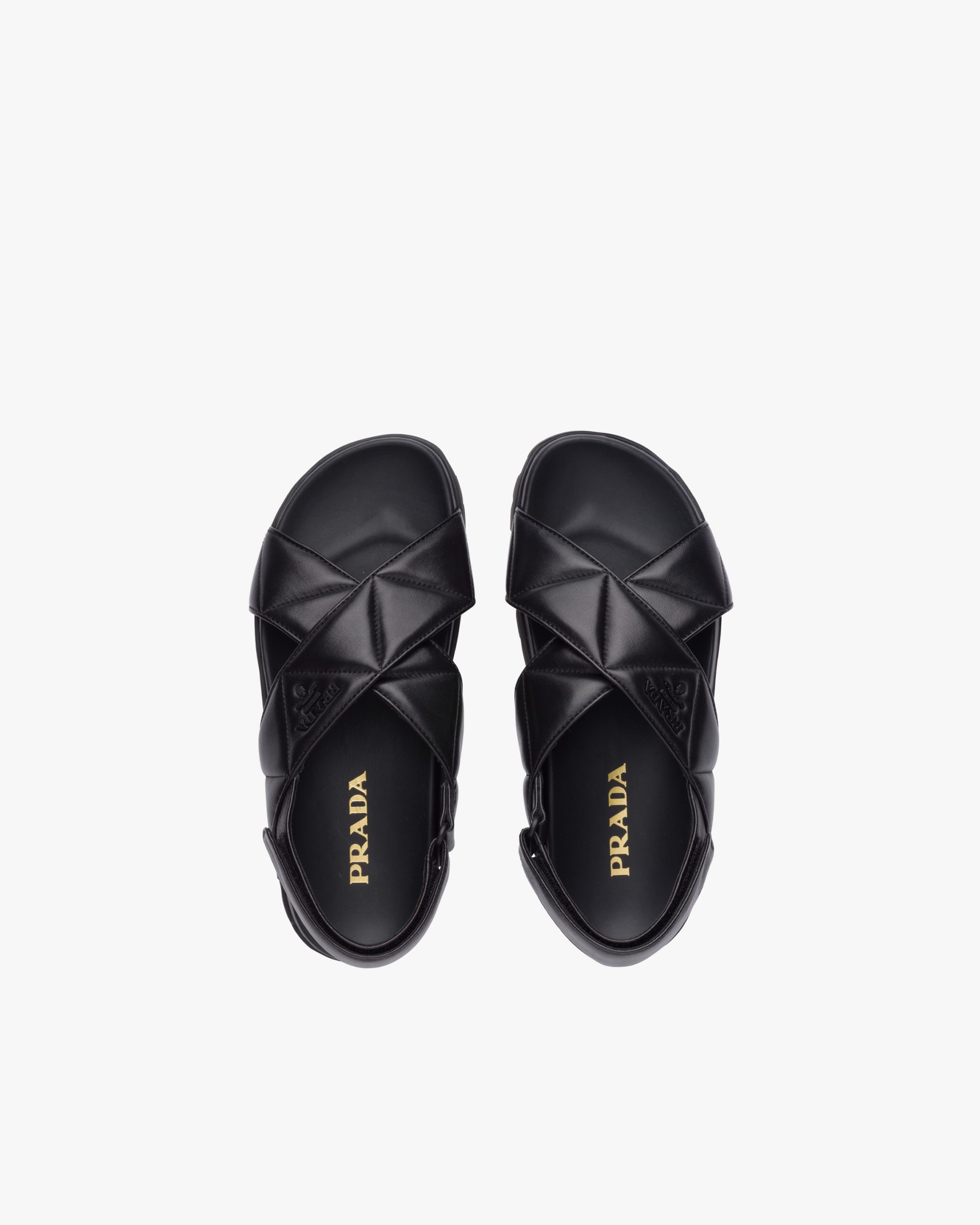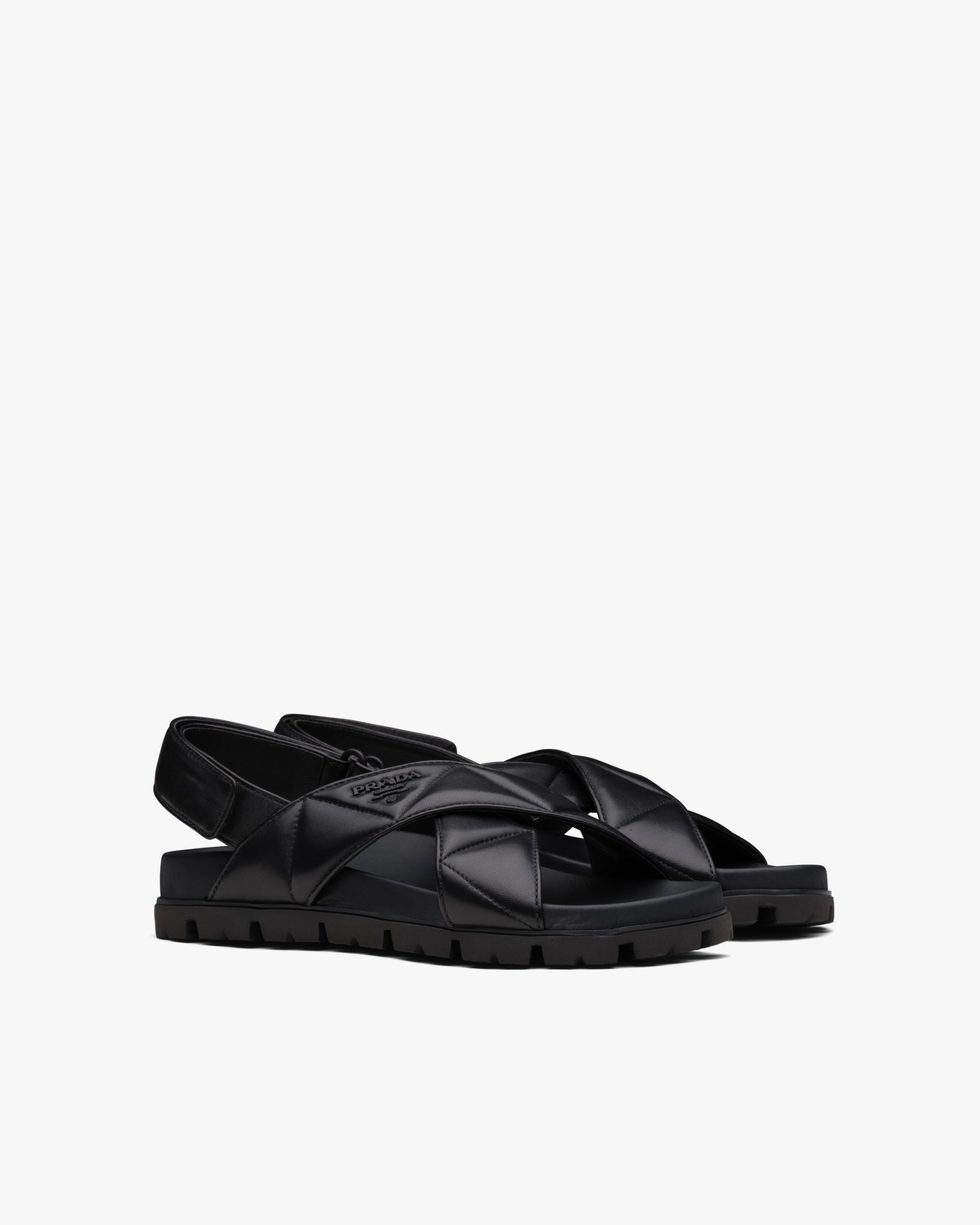 These soft nappa leather sandals have a sporty rubber sole. The quilted motif echoes the iconic Prada triangle logo ad is decorated with the lettering logo.